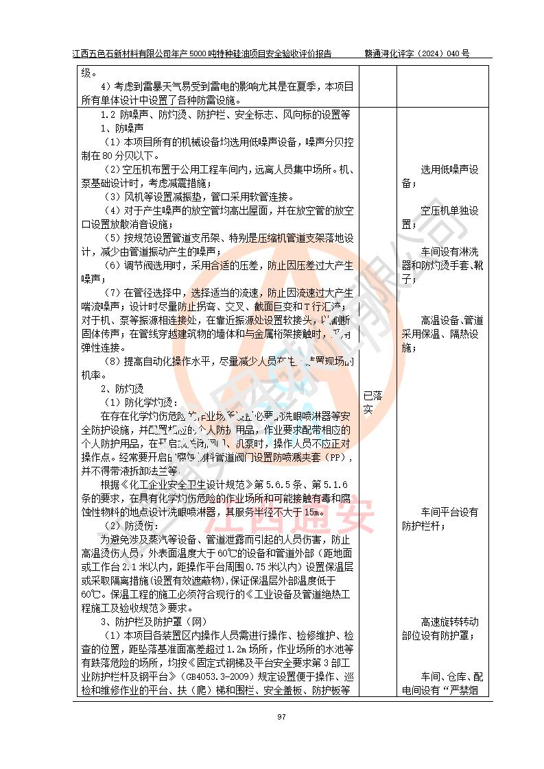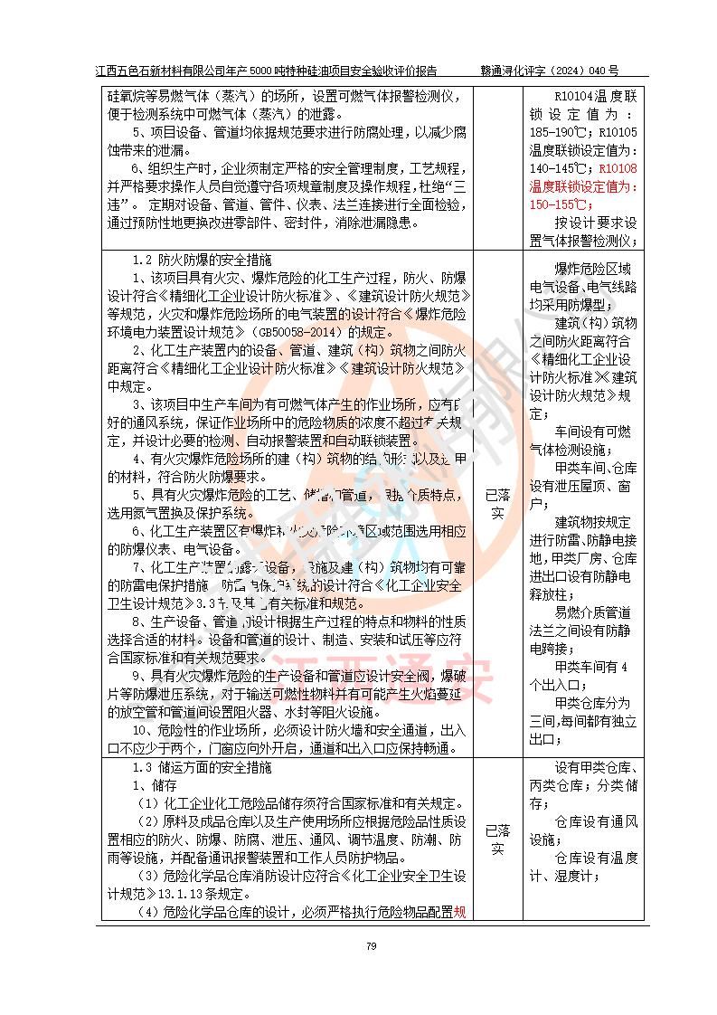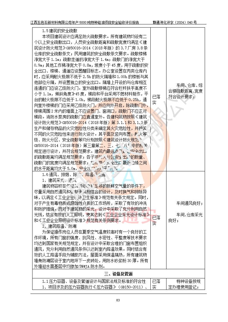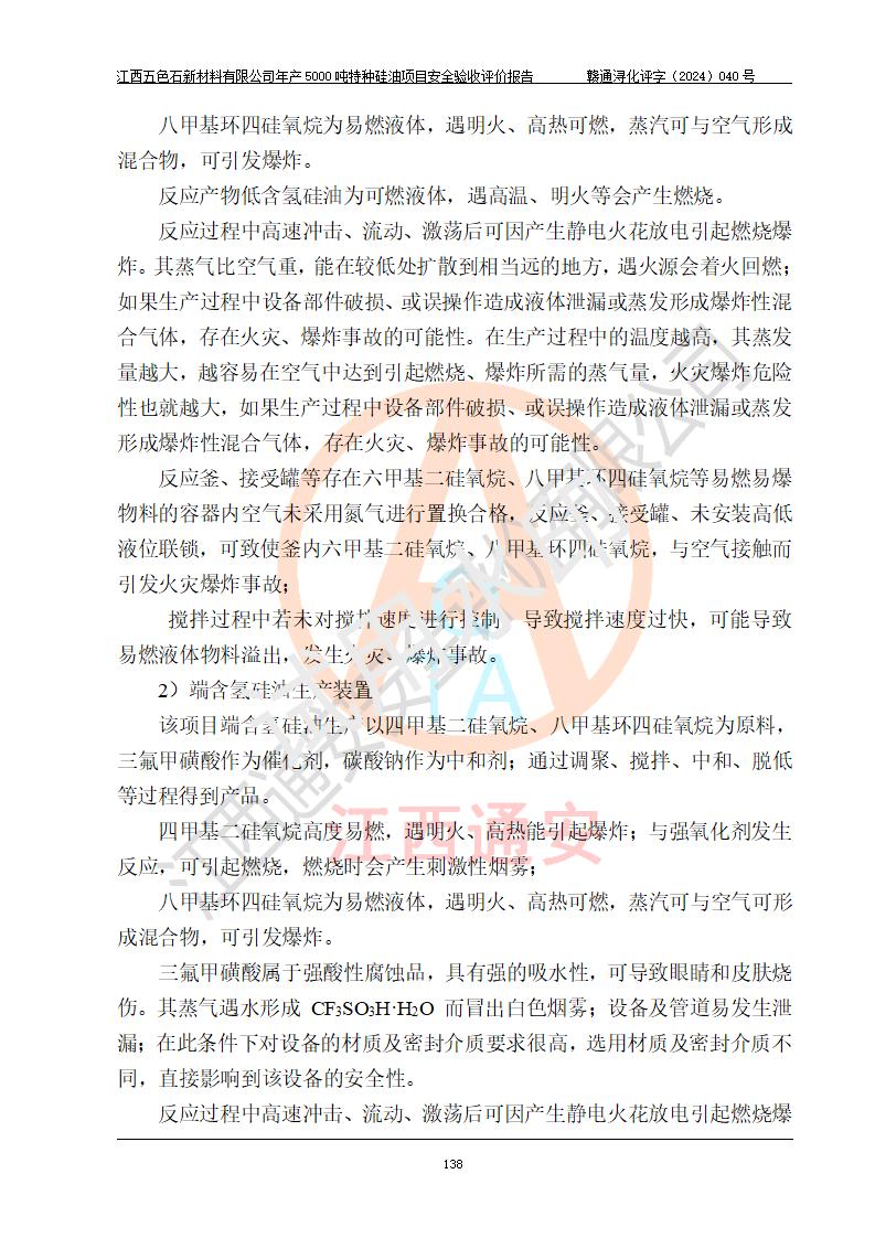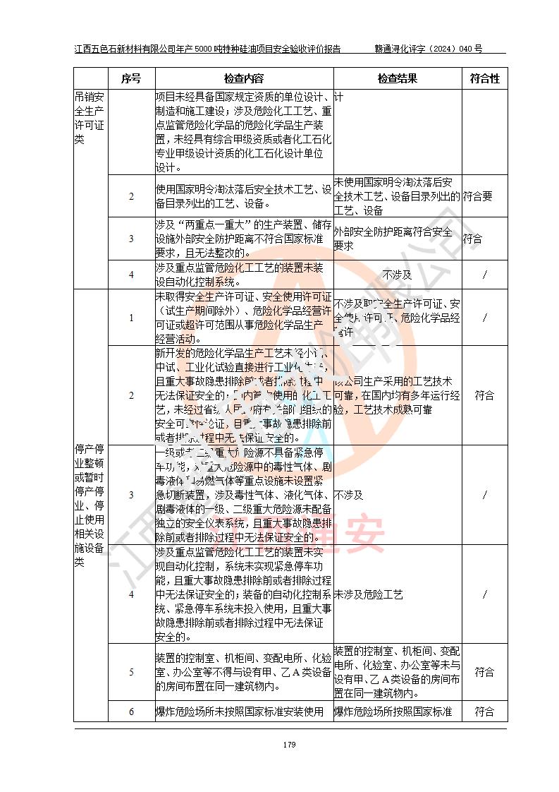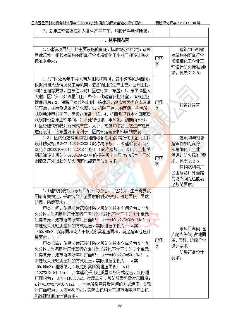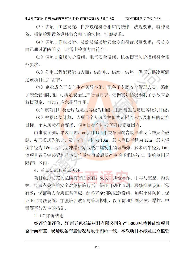 評(píng)價(jià)結(jié)論 | 江西五色石新材料有限公司年產(chǎn)5000噸特種硅油項(xiàng)目總平面布置、現(xiàn)場(chǎng)設(shè)備布置情況與設(shè)計(jì)圖紙一致,本次項(xiàng)目不涉及重點(diǎn)監(jiān)管的危險(xiǎn)化學(xué)品、危險(xiǎn)工藝、重大危險(xiǎn)源,按設(shè)計(jì)要求,設(shè)置有DCS系統(tǒng)、GDS系統(tǒng),符合《江西省應(yīng)急管理廳關(guān)于印發(fā)(試行)的通知 》、關(guān)于印發(fā)《九江市化工企業(yè)自動(dòng)化提升實(shí)施方案》的安全要求,符合《危險(xiǎn)化學(xué)品生產(chǎn)建設(shè)項(xiàng)目安全風(fēng)險(xiǎn)防控指南(試行)》規(guī)定竣工驗(yàn)收的安全條件;企業(yè)主要負(fù)責(zé)人、安全管理部門負(fù)責(zé)人均為化學(xué)、化工相關(guān)專業(yè),且有3年以上化工行業(yè)從業(yè)經(jīng)歷,企業(yè)主要負(fù)責(zé)人及安全管理人員已取得危險(xiǎn)化學(xué)品企業(yè)主要負(fù)責(zé)人及安全管理人員考核合格證。項(xiàng)目選擇的工藝過程及設(shè)備設(shè)施的安全可靠性能達(dá)到 **法規(guī)、標(biāo)準(zhǔn)規(guī)定要求。 項(xiàng)目運(yùn)行后存在的主要危險(xiǎn)、有害因素有:火災(zāi)、其他爆炸、容器爆炸、中毒與窒息等;存在的主要有害因素有高溫、化學(xué)物質(zhì)危害等;針對(duì)存在的危險(xiǎn)、有害因素,企業(yè)采取了**的安全技術(shù)措施及安全管理措施,符合**有關(guān)法規(guī)、標(biāo)準(zhǔn)、規(guī)范要求;項(xiàng)目風(fēng)險(xiǎn)可控,其安全生產(chǎn)條件和安全管理 方面具備竣工安全驗(yàn)收的條件。 | ||||