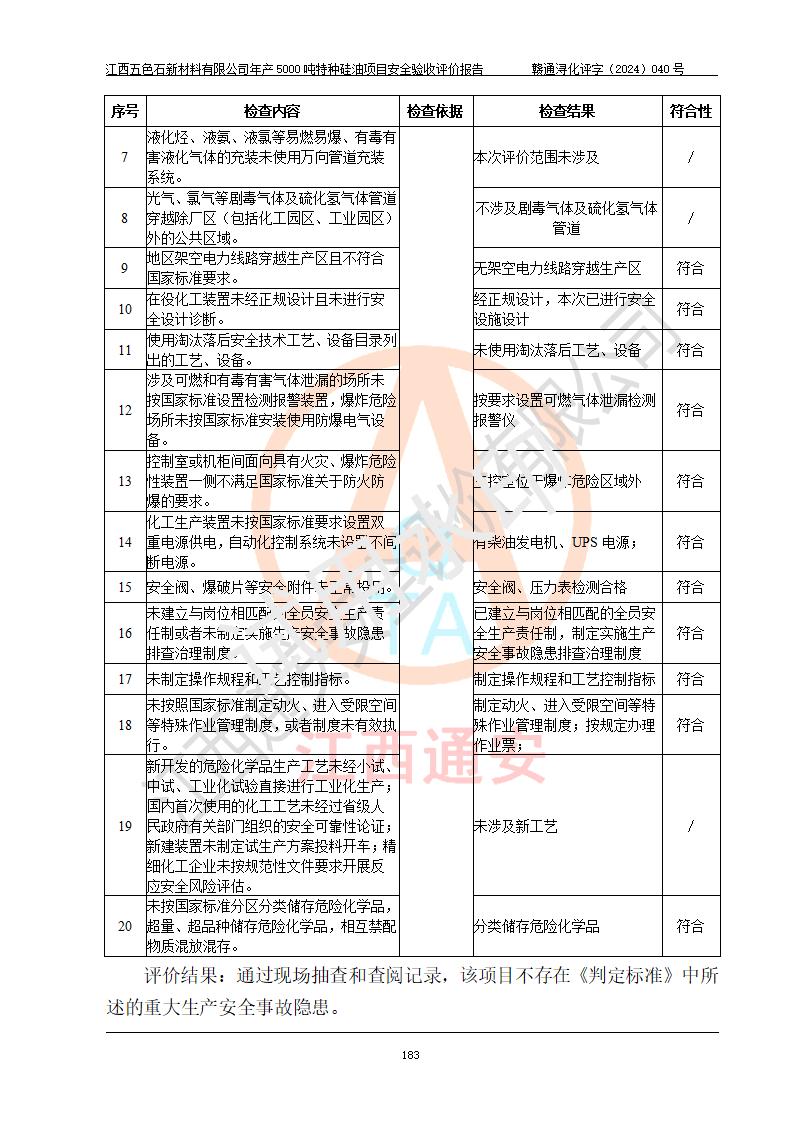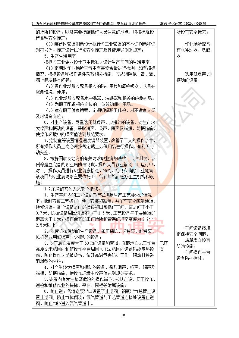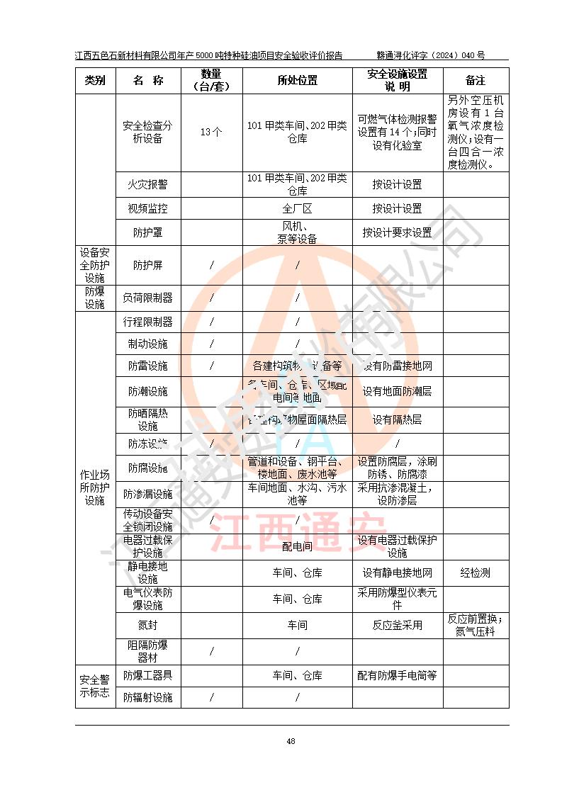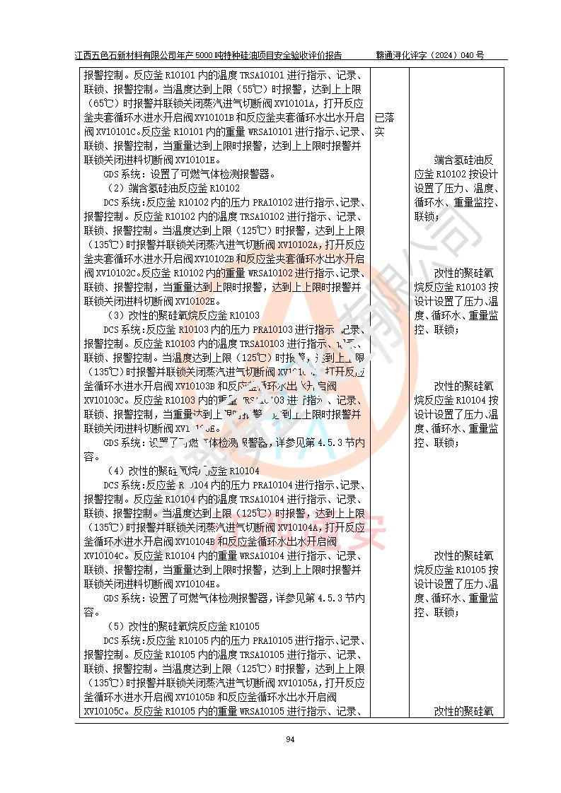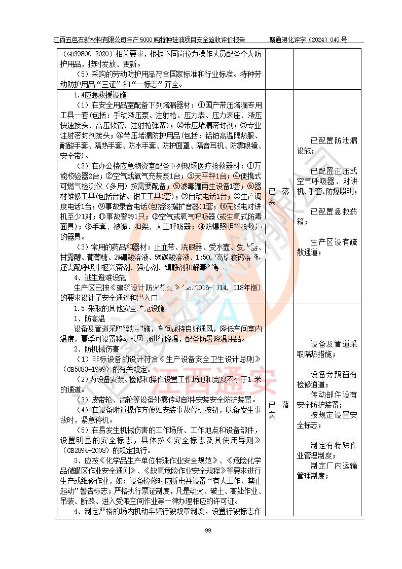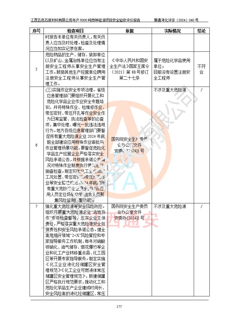 評(píng)價(jià)結(jié)論 | 江西五色石新材料有限公司年產(chǎn)5000噸特種硅油項(xiàng)目總平面布置、現(xiàn)場(chǎng)設(shè)備布置情況與設(shè)計(jì)圖紙一致,本次項(xiàng)目不涉及重點(diǎn)監(jiān)管的危險(xiǎn)化學(xué)品、危險(xiǎn)工藝、重大危險(xiǎn)源,按設(shè)計(jì)要求,設(shè)置有DCS系統(tǒng)、GDS系統(tǒng),符合《江西省應(yīng)急管理廳關(guān)于印發(fā)(試行)的通知 》、關(guān)于印發(fā)《九江市化工企業(yè)自動(dòng)化提升實(shí)施方案》的安全要求,符合《危險(xiǎn)化學(xué)品生產(chǎn)建設(shè)項(xiàng)目安全風(fēng)險(xiǎn)防控指南(試行)》規(guī)定竣工驗(yàn)收的安全條件;企業(yè)主要負(fù)責(zé)人、安全管理部門負(fù)責(zé)人均為化學(xué)、化工相關(guān)專業(yè),且有3年以上化工行業(yè)從業(yè)經(jīng)歷,企業(yè)主要負(fù)責(zé)人及安全管理人員已取得危險(xiǎn)化學(xué)品企業(yè)主要負(fù)責(zé)人及安全管理人員考核合格證。項(xiàng)目選擇的工藝過程及設(shè)備設(shè)施的安全可靠性能達(dá)到 **法規(guī)、標(biāo)準(zhǔn)規(guī)定要求。 項(xiàng)目運(yùn)行后存在的主要危險(xiǎn)、有害因素有:火災(zāi)、其他爆炸、容器爆炸、中毒與窒息等;存在的主要有害因素有高溫、化學(xué)物質(zhì)危害等;針對(duì)存在的危險(xiǎn)、有害因素,企業(yè)采取了**的安全技術(shù)措施及安全管理措施,符合**有關(guān)法規(guī)、標(biāo)準(zhǔn)、規(guī)范要求;項(xiàng)目風(fēng)險(xiǎn)可控,其安全生產(chǎn)條件和安全管理 方面具備竣工安全驗(yàn)收的條件。 | ||||