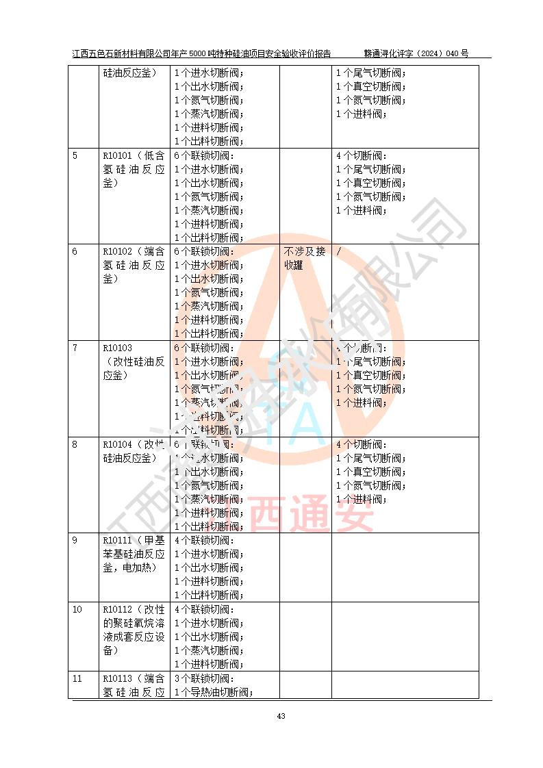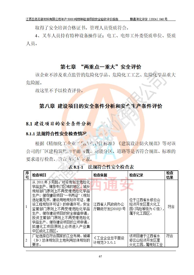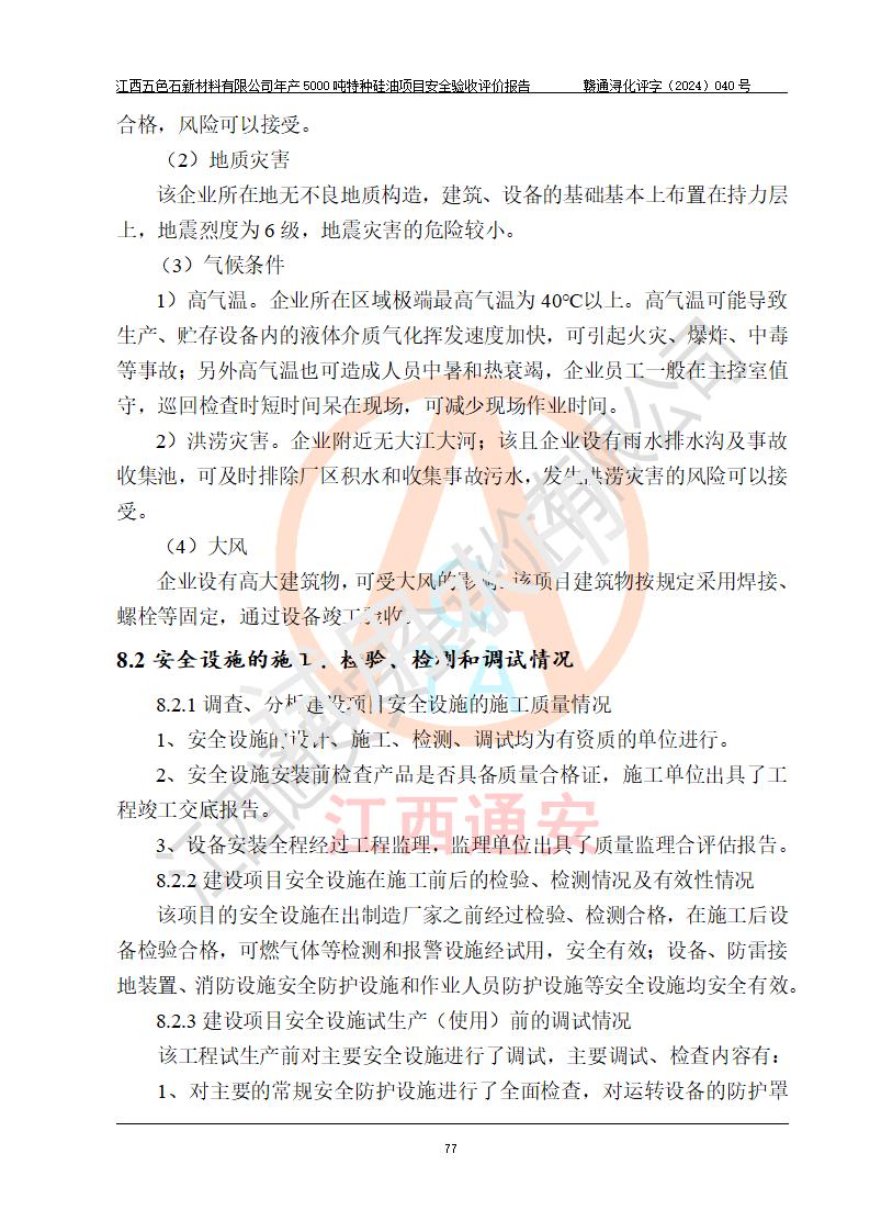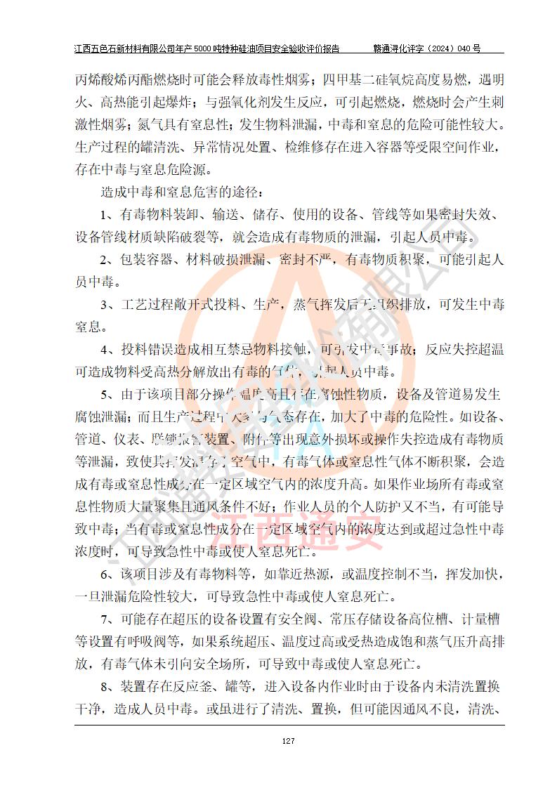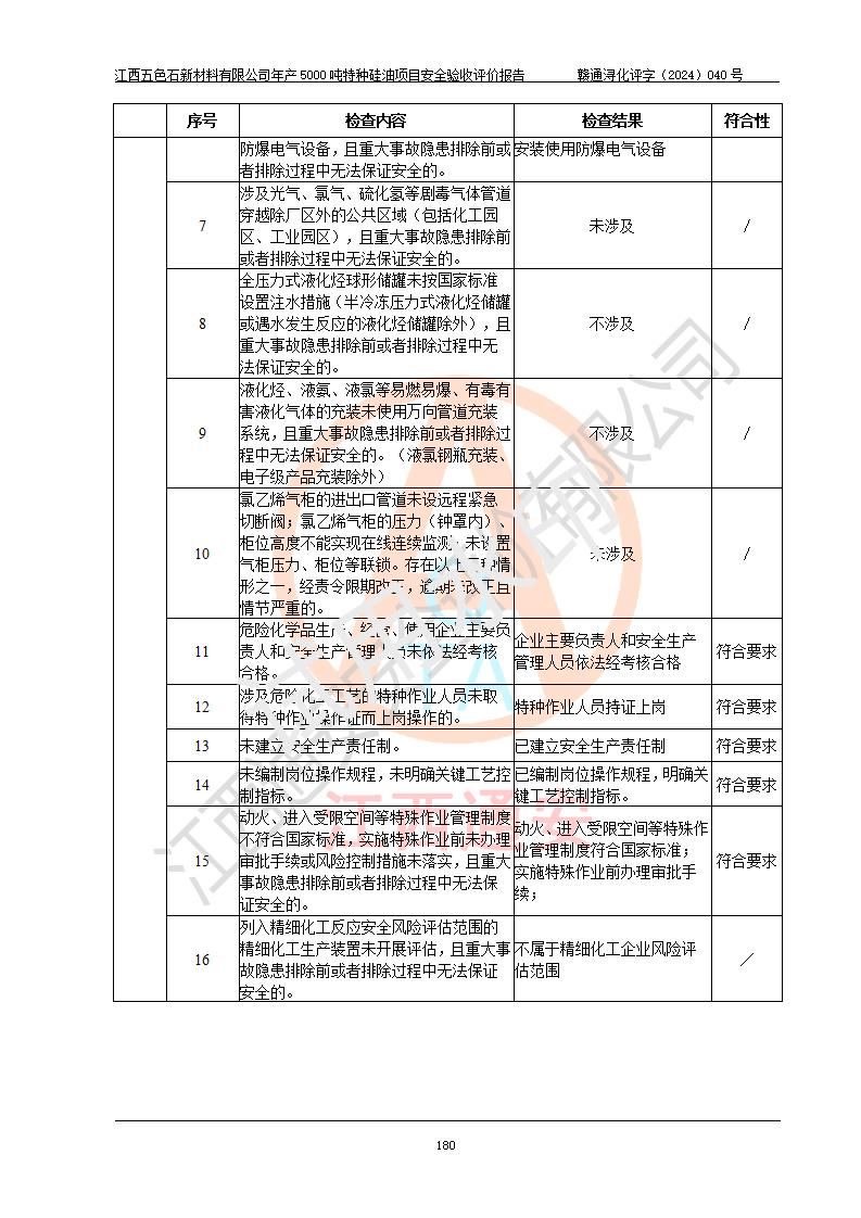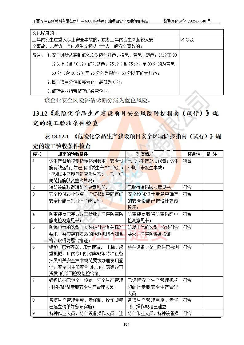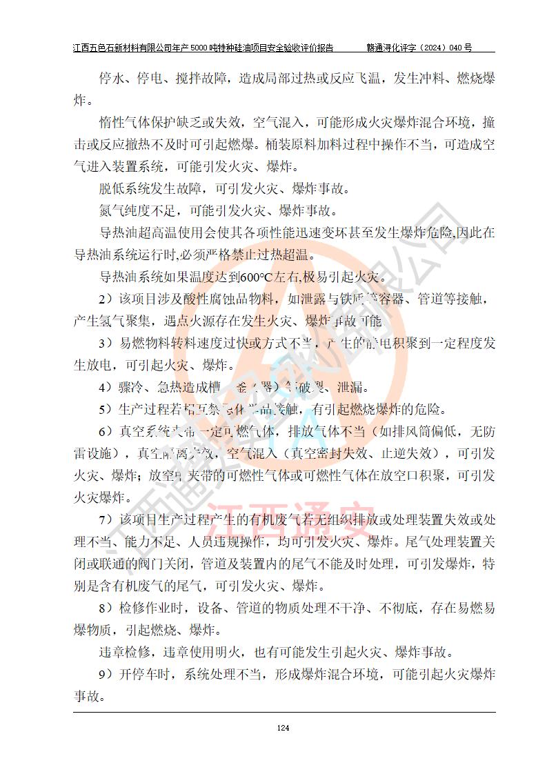 評(píng)價(jià)結(jié)論 | 江西五色石新材料有限公司年產(chǎn)5000噸特種硅油項(xiàng)目總平面布置、現(xiàn)場(chǎng)設(shè)備布置情況與設(shè)計(jì)圖紙一致,本次項(xiàng)目不涉及重點(diǎn)監(jiān)管的危險(xiǎn)化學(xué)品、危險(xiǎn)工藝、重大危險(xiǎn)源,按設(shè)計(jì)要求,設(shè)置有DCS系統(tǒng)、GDS系統(tǒng),符合《江西省應(yīng)急管理廳關(guān)于印發(fā)(試行)的通知 》、關(guān)于印發(fā)《九江市化工企業(yè)自動(dòng)化提升實(shí)施方案》的安全要求,符合《危險(xiǎn)化學(xué)品生產(chǎn)建設(shè)項(xiàng)目安全風(fēng)險(xiǎn)防控指南(試行)》規(guī)定竣工驗(yàn)收的安全條件;企業(yè)主要負(fù)責(zé)人、安全管理部門負(fù)責(zé)人均為化學(xué)、化工相關(guān)專業(yè),且有3年以上化工行業(yè)從業(yè)經(jīng)歷,企業(yè)主要負(fù)責(zé)人及安全管理人員已取得危險(xiǎn)化學(xué)品企業(yè)主要負(fù)責(zé)人及安全管理人員考核合格證。項(xiàng)目選擇的工藝過程及設(shè)備設(shè)施的安全可靠性能達(dá)到 **法規(guī)、標(biāo)準(zhǔn)規(guī)定要求。 項(xiàng)目運(yùn)行后存在的主要危險(xiǎn)、有害因素有:火災(zāi)、其他爆炸、容器爆炸、中毒與窒息等;存在的主要有害因素有高溫、化學(xué)物質(zhì)危害等;針對(duì)存在的危險(xiǎn)、有害因素,企業(yè)采取了**的安全技術(shù)措施及安全管理措施,符合**有關(guān)法規(guī)、標(biāo)準(zhǔn)、規(guī)范要求;項(xiàng)目風(fēng)險(xiǎn)可控,其安全生產(chǎn)條件和安全管理 方面具備竣工安全驗(yàn)收的條件。 | ||||