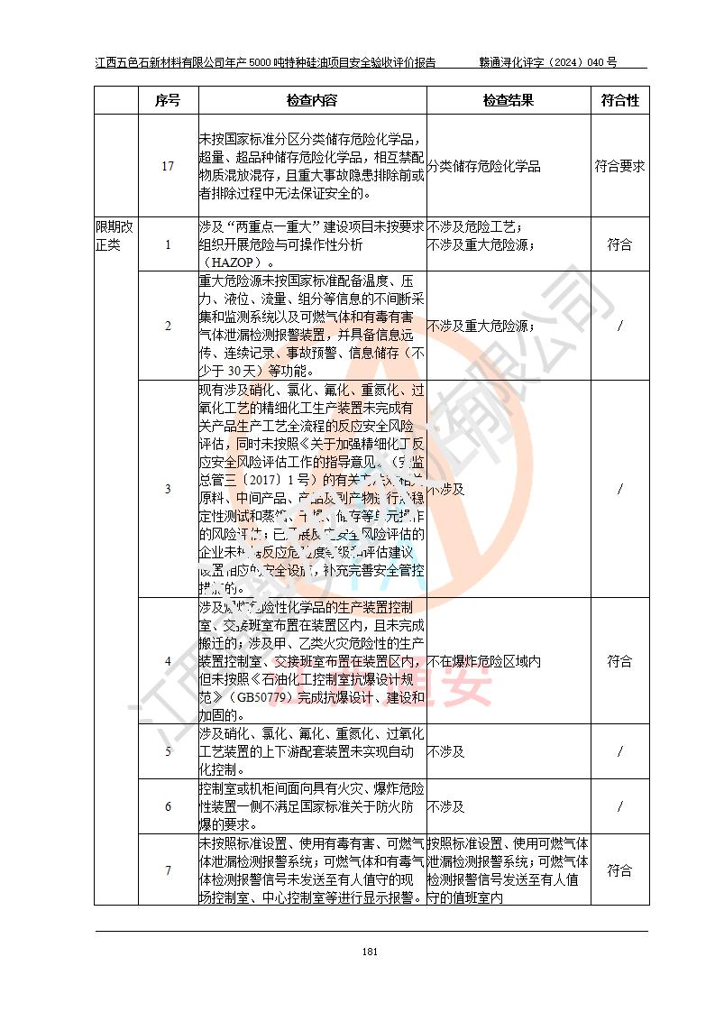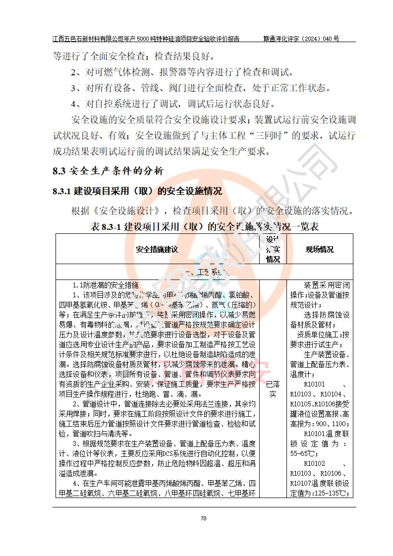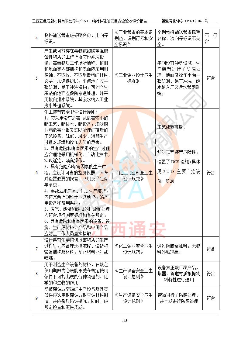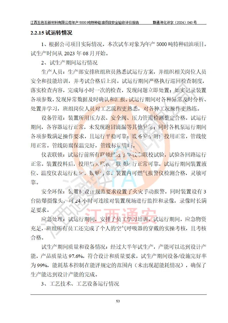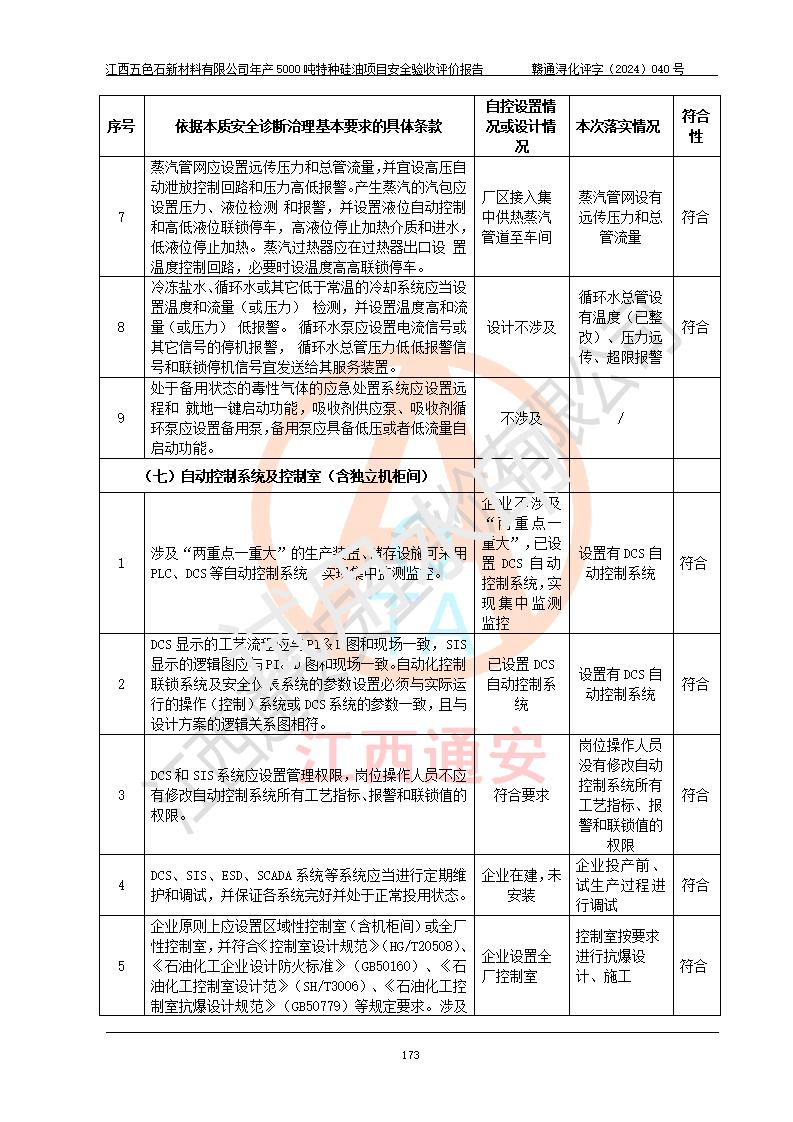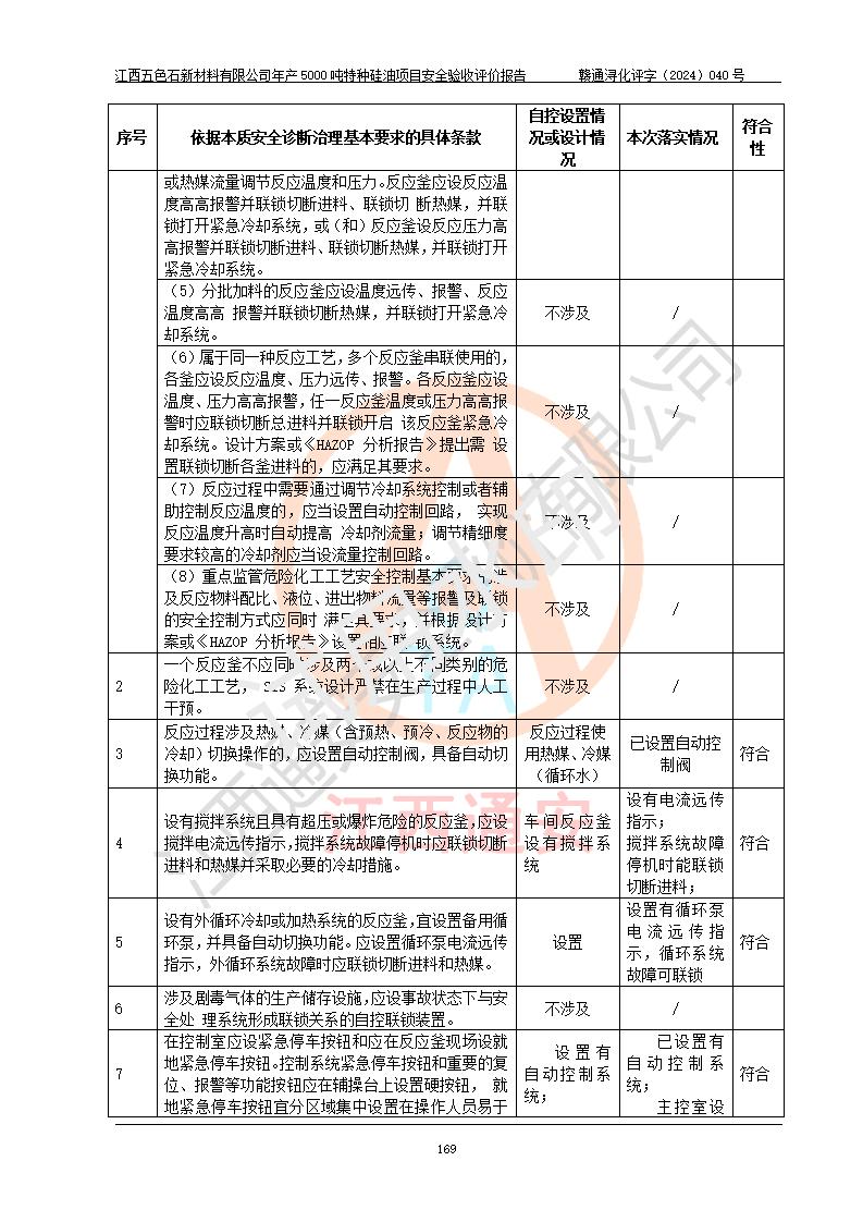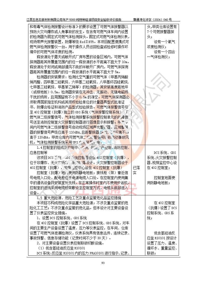 評(píng)價(jià)結(jié)論 | 江西五色石新材料有限公司年產(chǎn)5000噸特種硅油項(xiàng)目總平面布置、現(xiàn)場(chǎng)設(shè)備布置情況與設(shè)計(jì)圖紙一致,本次項(xiàng)目不涉及重點(diǎn)監(jiān)管的危險(xiǎn)化學(xué)品、危險(xiǎn)工藝、重大危險(xiǎn)源,按設(shè)計(jì)要求,設(shè)置有DCS系統(tǒng)、GDS系統(tǒng),符合《江西省應(yīng)急管理廳關(guān)于印發(fā)(試行)的通知 》、關(guān)于印發(fā)《九江市化工企業(yè)自動(dòng)化提升實(shí)施方案》的安全要求,符合《危險(xiǎn)化學(xué)品生產(chǎn)建設(shè)項(xiàng)目安全風(fēng)險(xiǎn)防控指南(試行)》規(guī)定竣工驗(yàn)收的安全條件;企業(yè)主要負(fù)責(zé)人、安全管理部門負(fù)責(zé)人均為化學(xué)、化工相關(guān)專業(yè),且有3年以上化工行業(yè)從業(yè)經(jīng)歷,企業(yè)主要負(fù)責(zé)人及安全管理人員已取得危險(xiǎn)化學(xué)品企業(yè)主要負(fù)責(zé)人及安全管理人員考核合格證。項(xiàng)目選擇的工藝過程及設(shè)備設(shè)施的安全可靠性能達(dá)到 **法規(guī)、標(biāo)準(zhǔn)規(guī)定要求。 項(xiàng)目運(yùn)行后存在的主要危險(xiǎn)、有害因素有:火災(zāi)、其他爆炸、容器爆炸、中毒與窒息等;存在的主要有害因素有高溫、化學(xué)物質(zhì)危害等;針對(duì)存在的危險(xiǎn)、有害因素,企業(yè)采取了**的安全技術(shù)措施及安全管理措施,符合**有關(guān)法規(guī)、標(biāo)準(zhǔn)、規(guī)范要求;項(xiàng)目風(fēng)險(xiǎn)可控,其安全生產(chǎn)條件和安全管理 方面具備竣工安全驗(yàn)收的條件。 | ||||