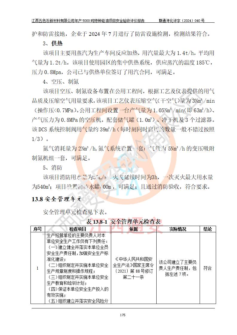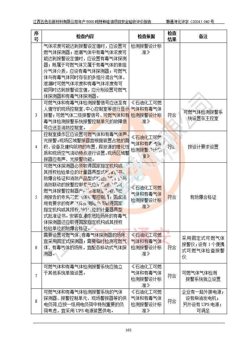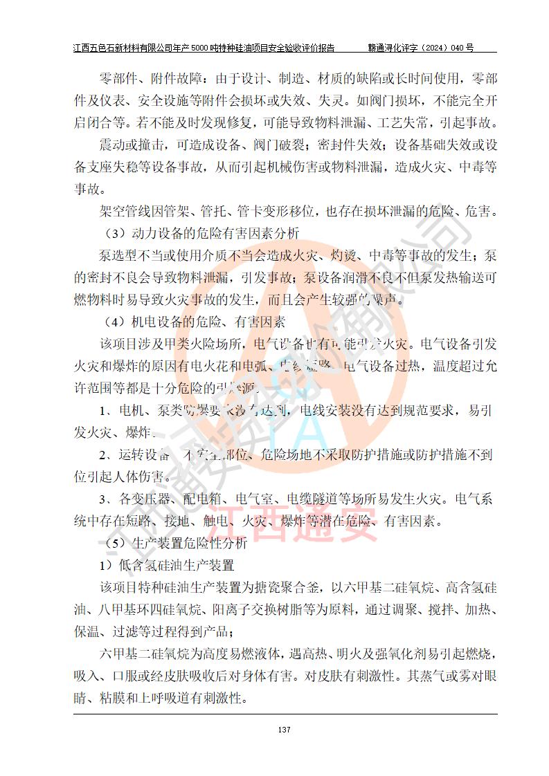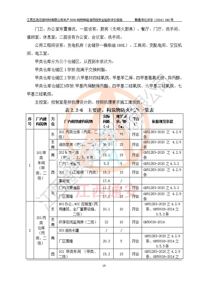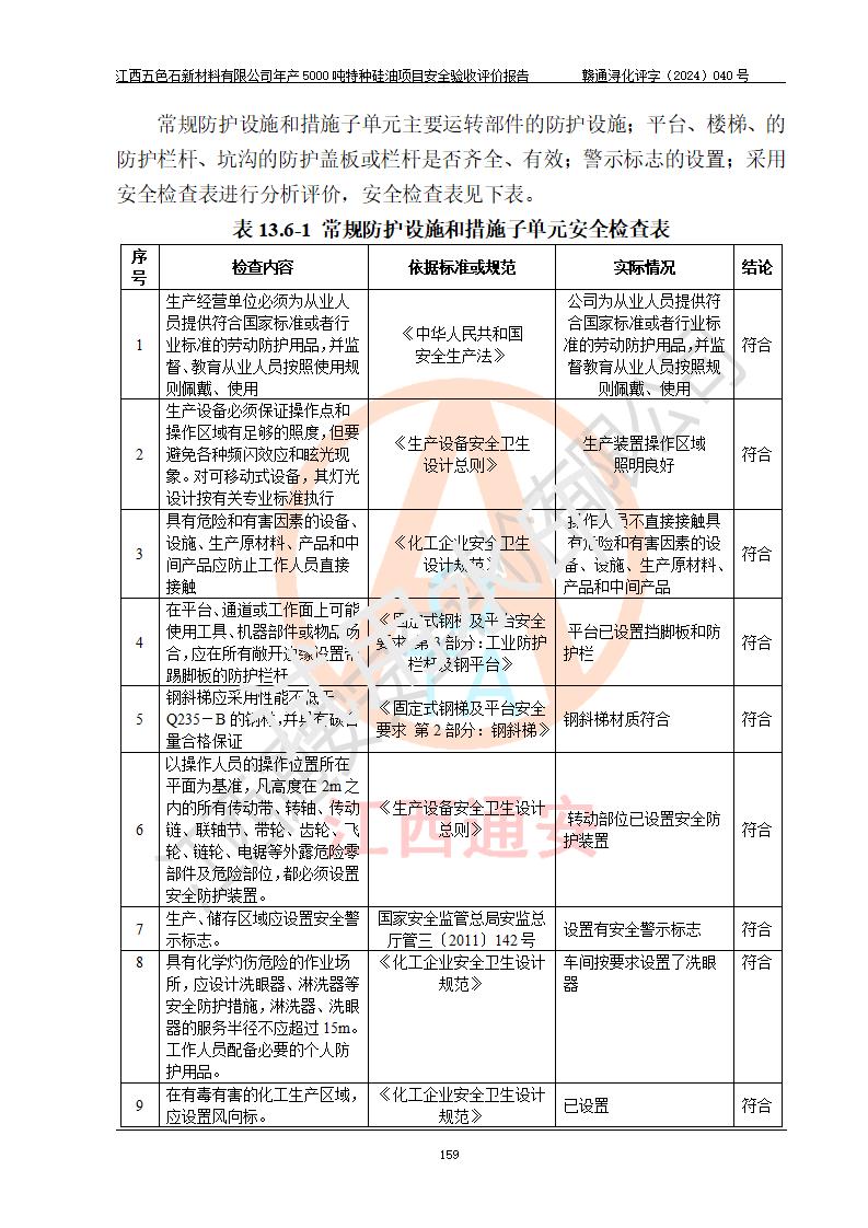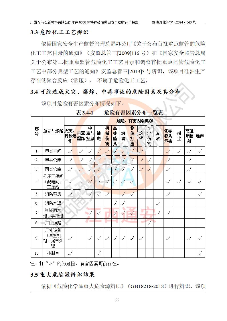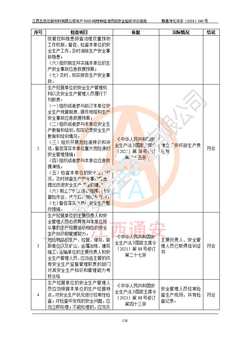 評(píng)價(jià)結(jié)論 | 江西五色石新材料有限公司年產(chǎn)5000噸特種硅油項(xiàng)目總平面布置、現(xiàn)場(chǎng)設(shè)備布置情況與設(shè)計(jì)圖紙一致,本次項(xiàng)目不涉及重點(diǎn)監(jiān)管的危險(xiǎn)化學(xué)品、危險(xiǎn)工藝、重大危險(xiǎn)源,按設(shè)計(jì)要求,設(shè)置有DCS系統(tǒng)、GDS系統(tǒng),符合《江西省應(yīng)急管理廳關(guān)于印發(fā)(試行)的通知 》、關(guān)于印發(fā)《九江市化工企業(yè)自動(dòng)化提升實(shí)施方案》的安全要求,符合《危險(xiǎn)化學(xué)品生產(chǎn)建設(shè)項(xiàng)目安全風(fēng)險(xiǎn)防控指南(試行)》規(guī)定竣工驗(yàn)收的安全條件;企業(yè)主要負(fù)責(zé)人、安全管理部門負(fù)責(zé)人均為化學(xué)、化工相關(guān)專業(yè),且有3年以上化工行業(yè)從業(yè)經(jīng)歷,企業(yè)主要負(fù)責(zé)人及安全管理人員已取得危險(xiǎn)化學(xué)品企業(yè)主要負(fù)責(zé)人及安全管理人員考核合格證。項(xiàng)目選擇的工藝過程及設(shè)備設(shè)施的安全可靠性能達(dá)到 **法規(guī)、標(biāo)準(zhǔn)規(guī)定要求。 項(xiàng)目運(yùn)行后存在的主要危險(xiǎn)、有害因素有:火災(zāi)、其他爆炸、容器爆炸、中毒與窒息等;存在的主要有害因素有高溫、化學(xué)物質(zhì)危害等;針對(duì)存在的危險(xiǎn)、有害因素,企業(yè)采取了**的安全技術(shù)措施及安全管理措施,符合**有關(guān)法規(guī)、標(biāo)準(zhǔn)、規(guī)范要求;項(xiàng)目風(fēng)險(xiǎn)可控,其安全生產(chǎn)條件和安全管理 方面具備竣工安全驗(yàn)收的條件。 | ||||