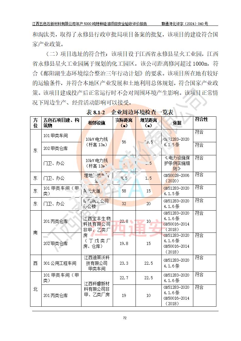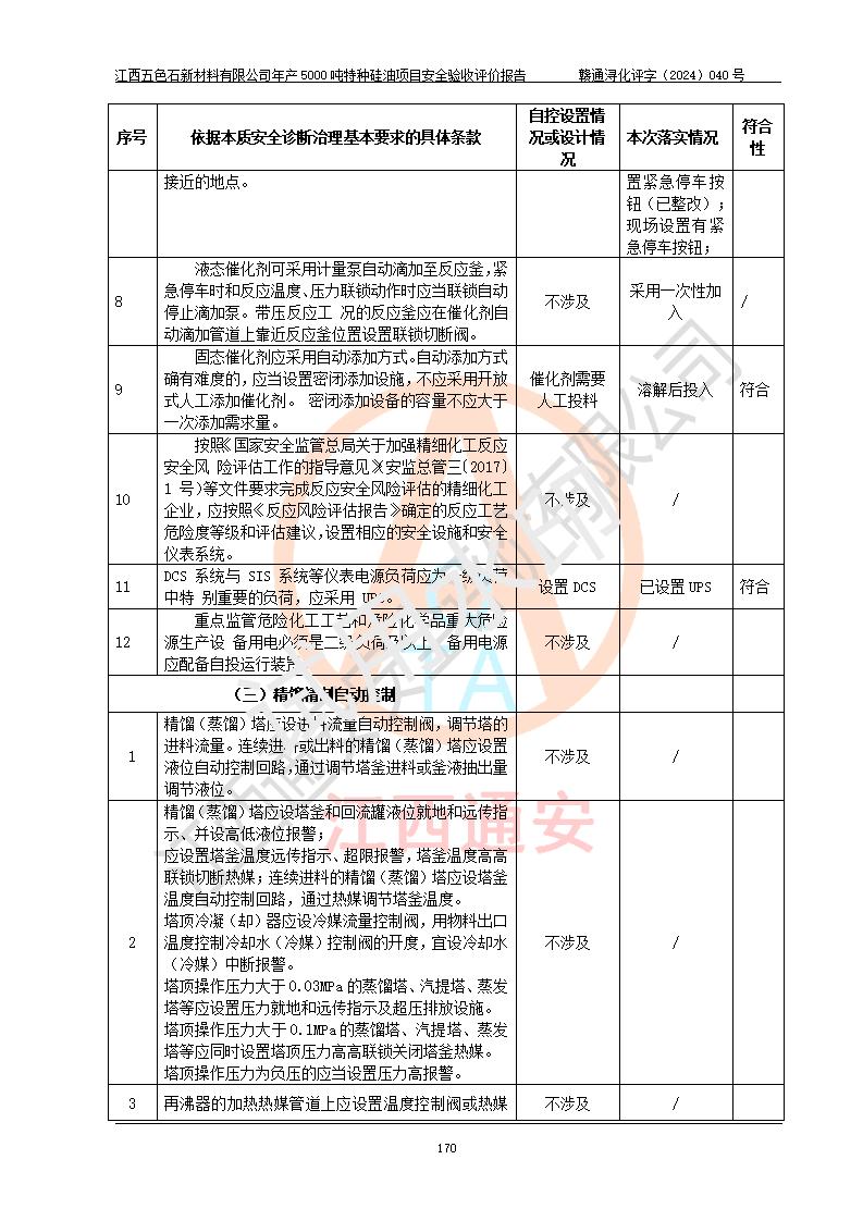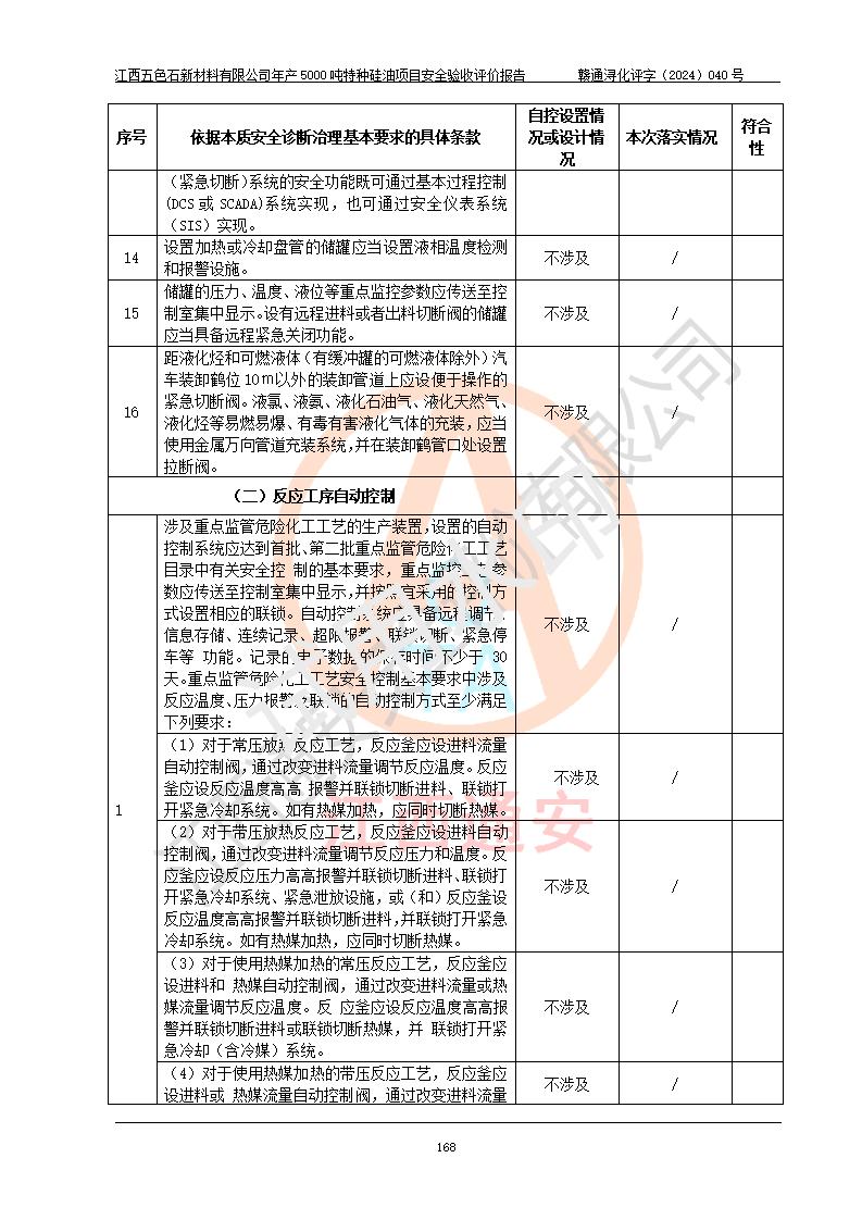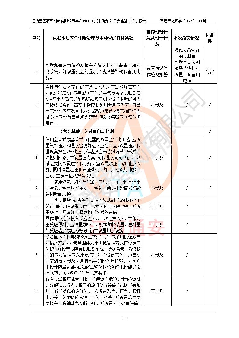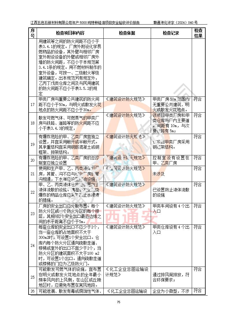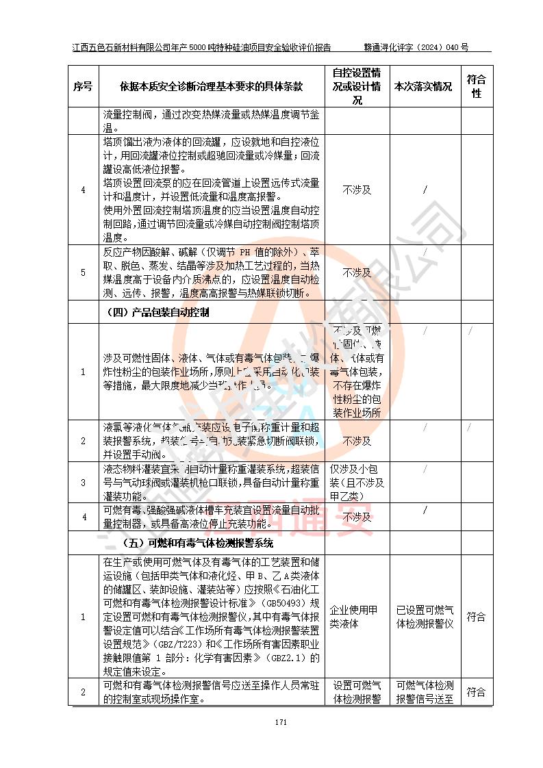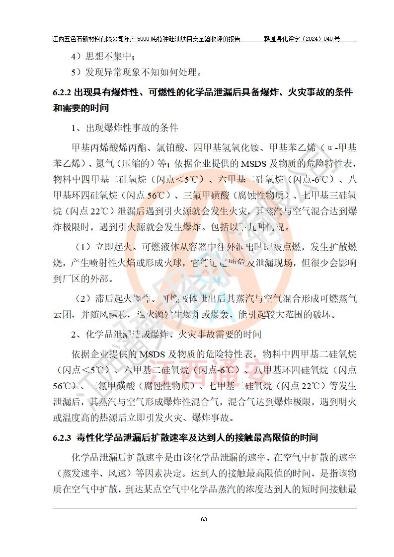 評(píng)價(jià)結(jié)論 | 江西五色石新材料有限公司年產(chǎn)5000噸特種硅油項(xiàng)目總平面布置、現(xiàn)場(chǎng)設(shè)備布置情況與設(shè)計(jì)圖紙一致,本次項(xiàng)目不涉及重點(diǎn)監(jiān)管的危險(xiǎn)化學(xué)品、危險(xiǎn)工藝、重大危險(xiǎn)源,按設(shè)計(jì)要求,設(shè)置有DCS系統(tǒng)、GDS系統(tǒng),符合《江西省應(yīng)急管理廳關(guān)于印發(fā)(試行)的通知 》、關(guān)于印發(fā)《九江市化工企業(yè)自動(dòng)化提升實(shí)施方案》的安全要求,符合《危險(xiǎn)化學(xué)品生產(chǎn)建設(shè)項(xiàng)目安全風(fēng)險(xiǎn)防控指南(試行)》規(guī)定竣工驗(yàn)收的安全條件;企業(yè)主要負(fù)責(zé)人、安全管理部門負(fù)責(zé)人均為化學(xué)、化工相關(guān)專業(yè),且有3年以上化工行業(yè)從業(yè)經(jīng)歷,企業(yè)主要負(fù)責(zé)人及安全管理人員已取得危險(xiǎn)化學(xué)品企業(yè)主要負(fù)責(zé)人及安全管理人員考核合格證。項(xiàng)目選擇的工藝過程及設(shè)備設(shè)施的安全可靠性能達(dá)到 **法規(guī)、標(biāo)準(zhǔn)規(guī)定要求。 項(xiàng)目運(yùn)行后存在的主要危險(xiǎn)、有害因素有:火災(zāi)、其他爆炸、容器爆炸、中毒與窒息等;存在的主要有害因素有高溫、化學(xué)物質(zhì)危害等;針對(duì)存在的危險(xiǎn)、有害因素,企業(yè)采取了**的安全技術(shù)措施及安全管理措施,符合**有關(guān)法規(guī)、標(biāo)準(zhǔn)、規(guī)范要求;項(xiàng)目風(fēng)險(xiǎn)可控,其安全生產(chǎn)條件和安全管理 方面具備竣工安全驗(yàn)收的條件。 | ||||