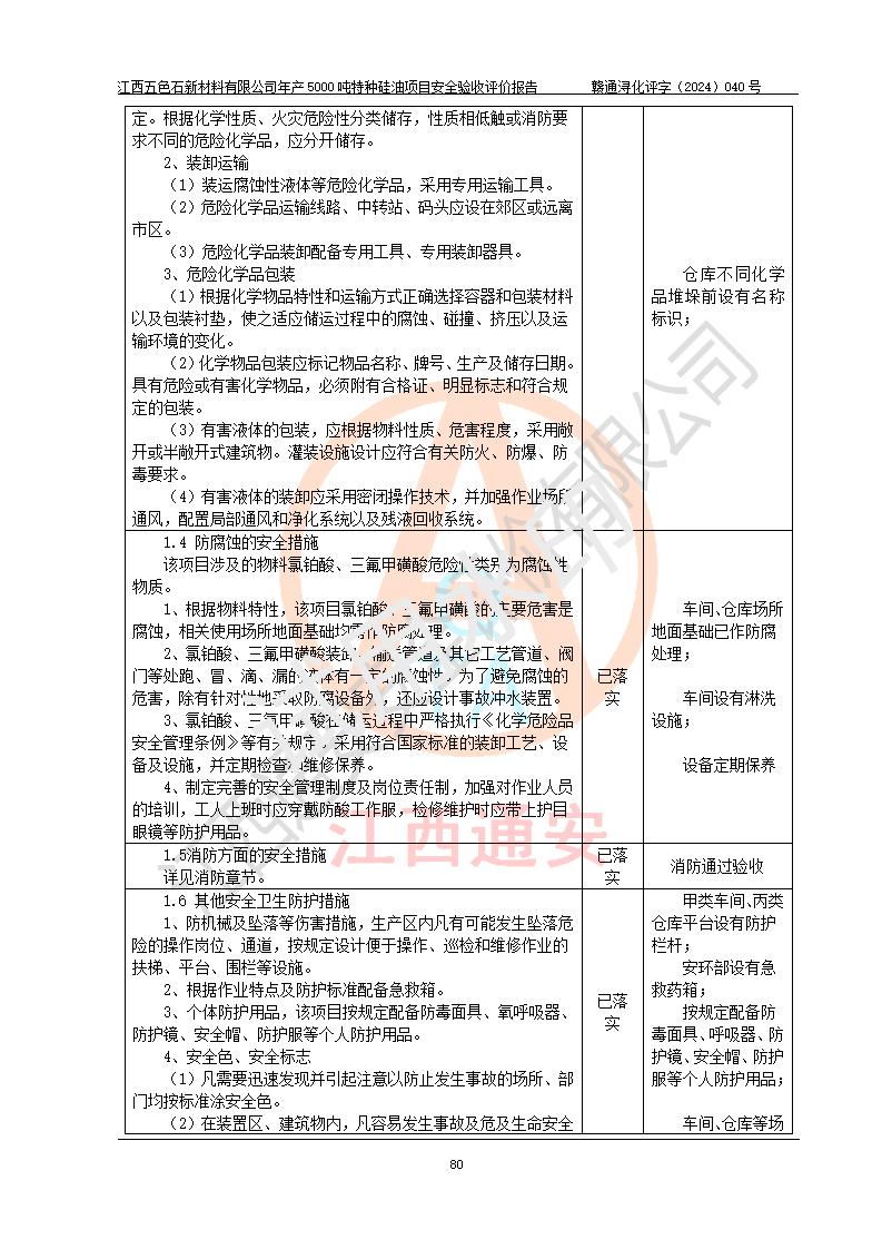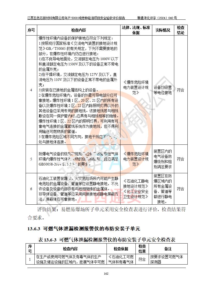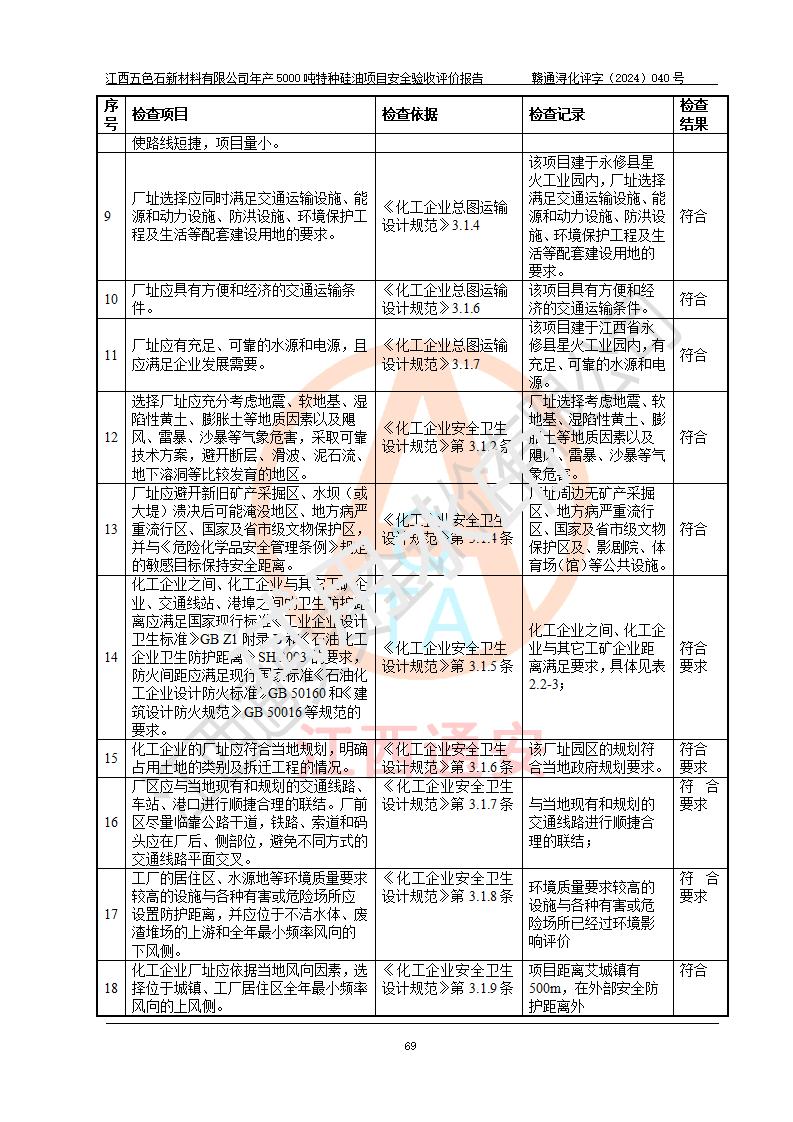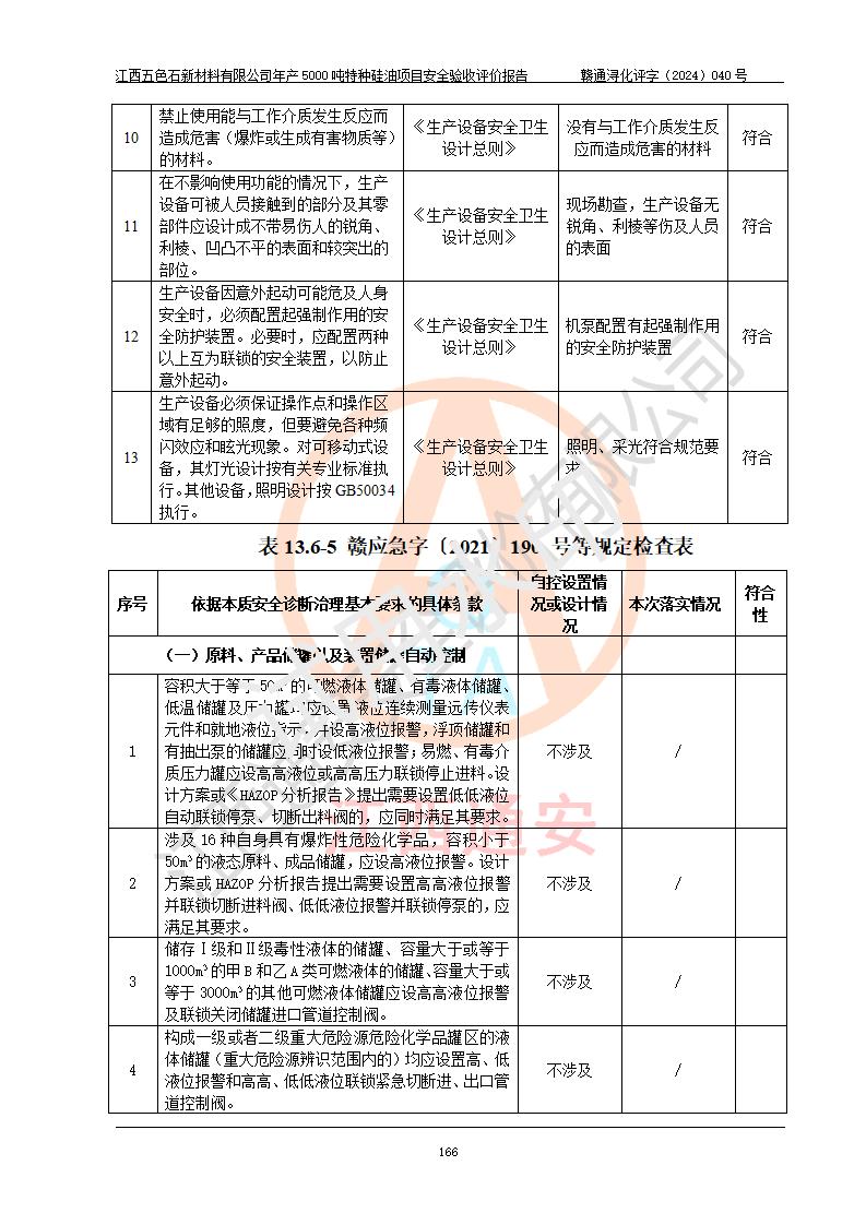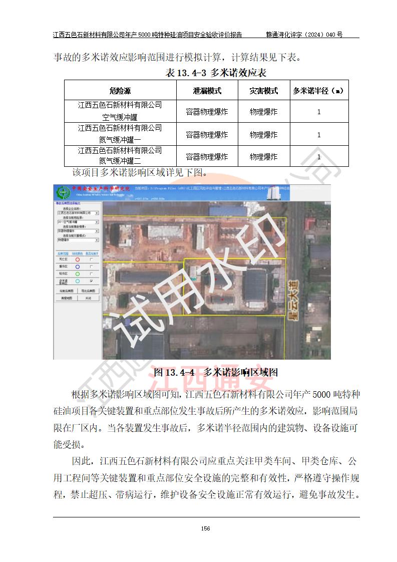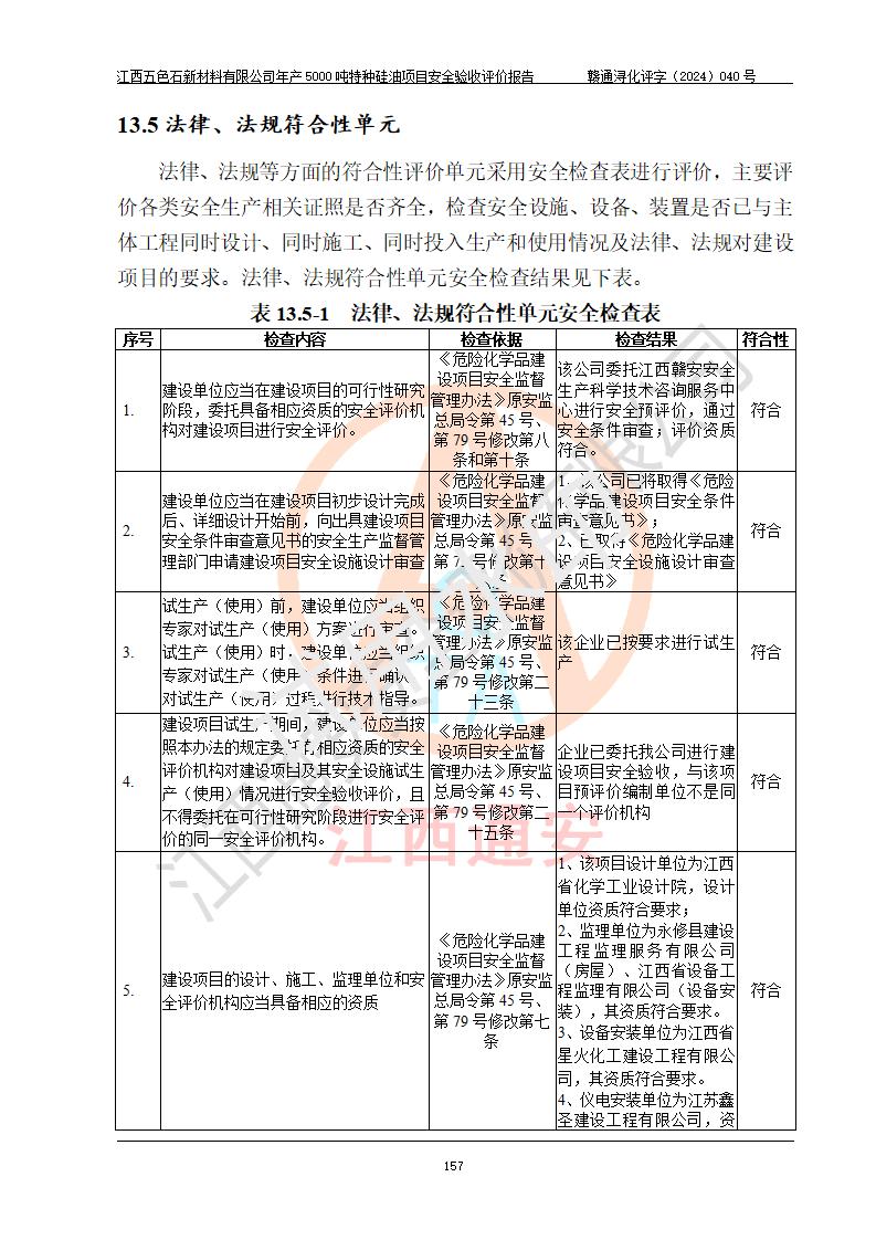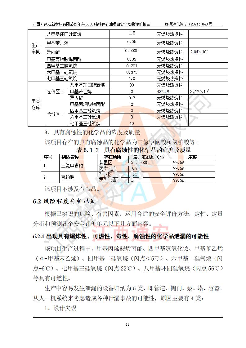 評(píng)價(jià)結(jié)論 | 江西五色石新材料有限公司年產(chǎn)5000噸特種硅油項(xiàng)目總平面布置、現(xiàn)場(chǎng)設(shè)備布置情況與設(shè)計(jì)圖紙一致,本次項(xiàng)目不涉及重點(diǎn)監(jiān)管的危險(xiǎn)化學(xué)品、危險(xiǎn)工藝、重大危險(xiǎn)源,按設(shè)計(jì)要求,設(shè)置有DCS系統(tǒng)、GDS系統(tǒng),符合《江西省應(yīng)急管理廳關(guān)于印發(fā)(試行)的通知 》、關(guān)于印發(fā)《九江市化工企業(yè)自動(dòng)化提升實(shí)施方案》的安全要求,符合《危險(xiǎn)化學(xué)品生產(chǎn)建設(shè)項(xiàng)目安全風(fēng)險(xiǎn)防控指南(試行)》規(guī)定竣工驗(yàn)收的安全條件;企業(yè)主要負(fù)責(zé)人、安全管理部門負(fù)責(zé)人均為化學(xué)、化工相關(guān)專業(yè),且有3年以上化工行業(yè)從業(yè)經(jīng)歷,企業(yè)主要負(fù)責(zé)人及安全管理人員已取得危險(xiǎn)化學(xué)品企業(yè)主要負(fù)責(zé)人及安全管理人員考核合格證。項(xiàng)目選擇的工藝過程及設(shè)備設(shè)施的安全可靠性能達(dá)到 **法規(guī)、標(biāo)準(zhǔn)規(guī)定要求。 項(xiàng)目運(yùn)行后存在的主要危險(xiǎn)、有害因素有:火災(zāi)、其他爆炸、容器爆炸、中毒與窒息等;存在的主要有害因素有高溫、化學(xué)物質(zhì)危害等;針對(duì)存在的危險(xiǎn)、有害因素,企業(yè)采取了**的安全技術(shù)措施及安全管理措施,符合**有關(guān)法規(guī)、標(biāo)準(zhǔn)、規(guī)范要求;項(xiàng)目風(fēng)險(xiǎn)可控,其安全生產(chǎn)條件和安全管理 方面具備竣工安全驗(yàn)收的條件。 | ||||
