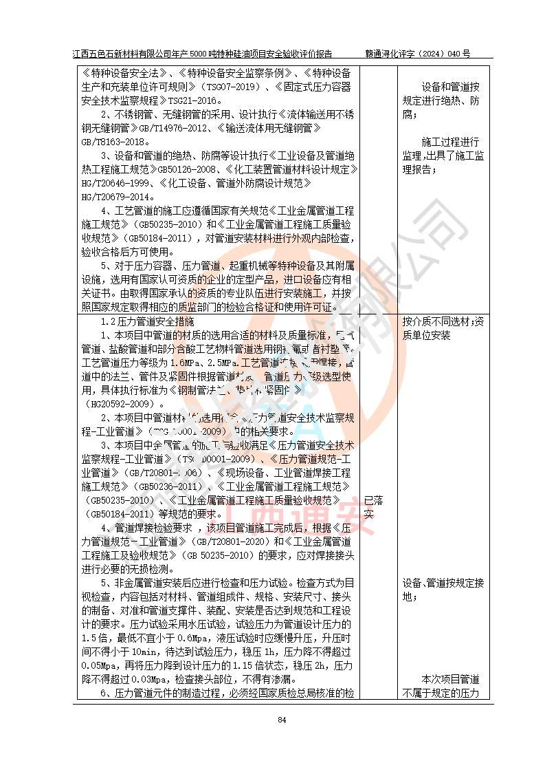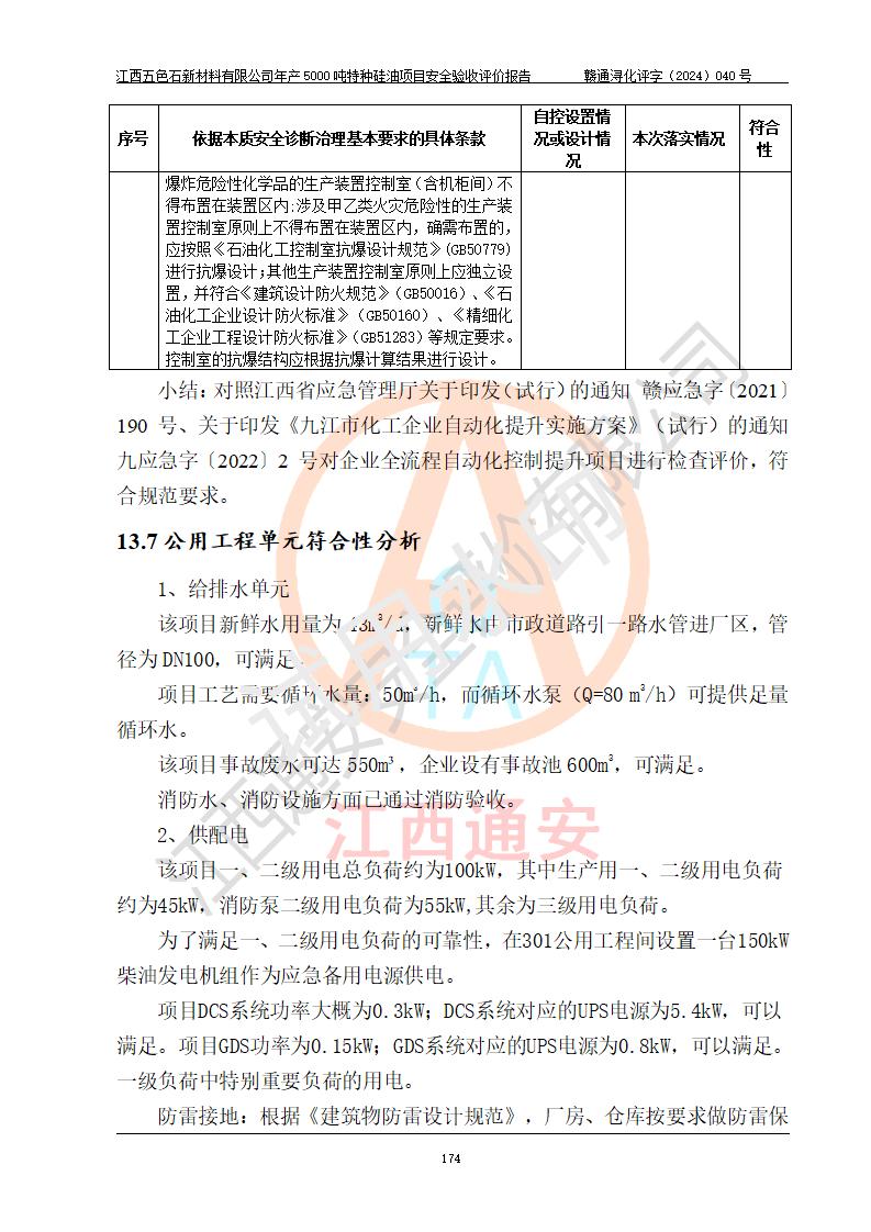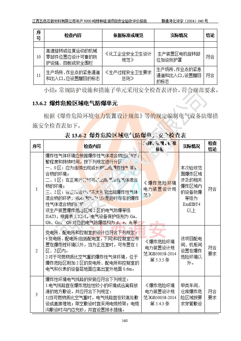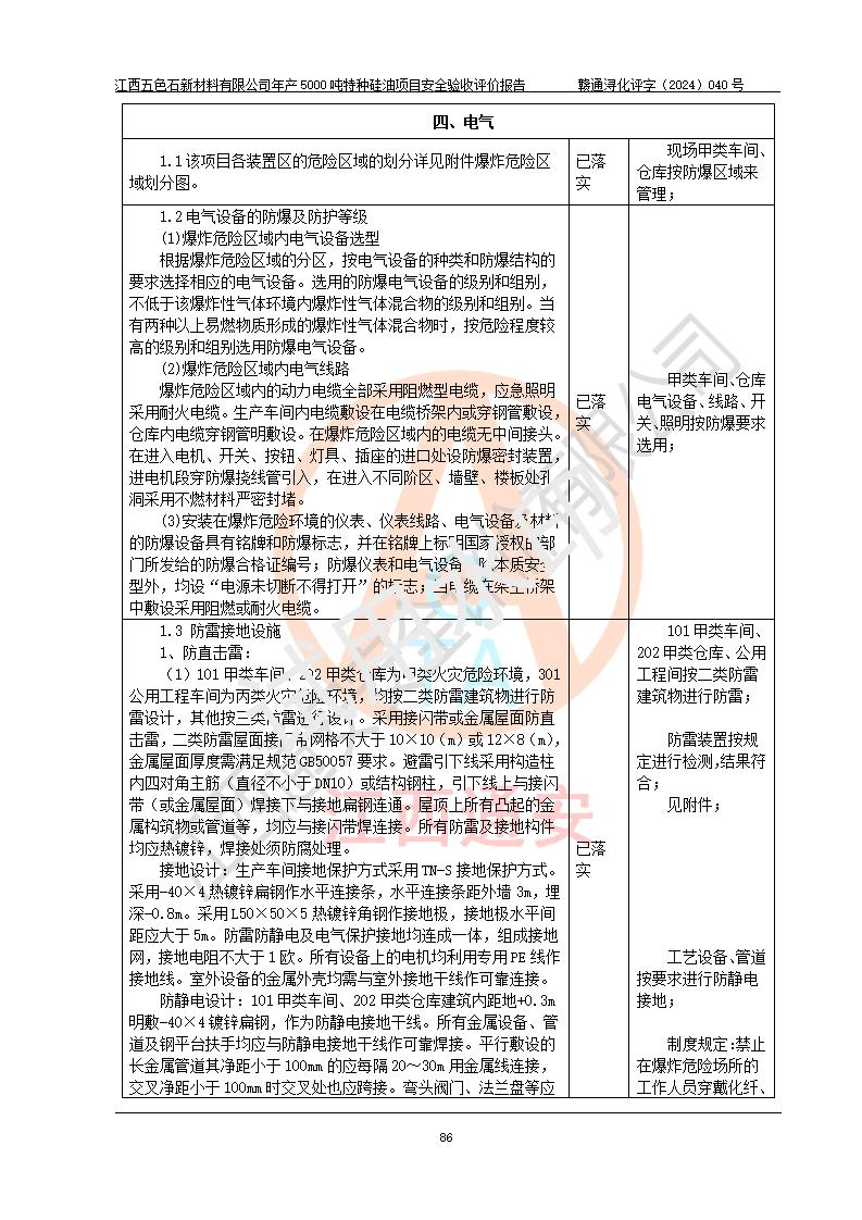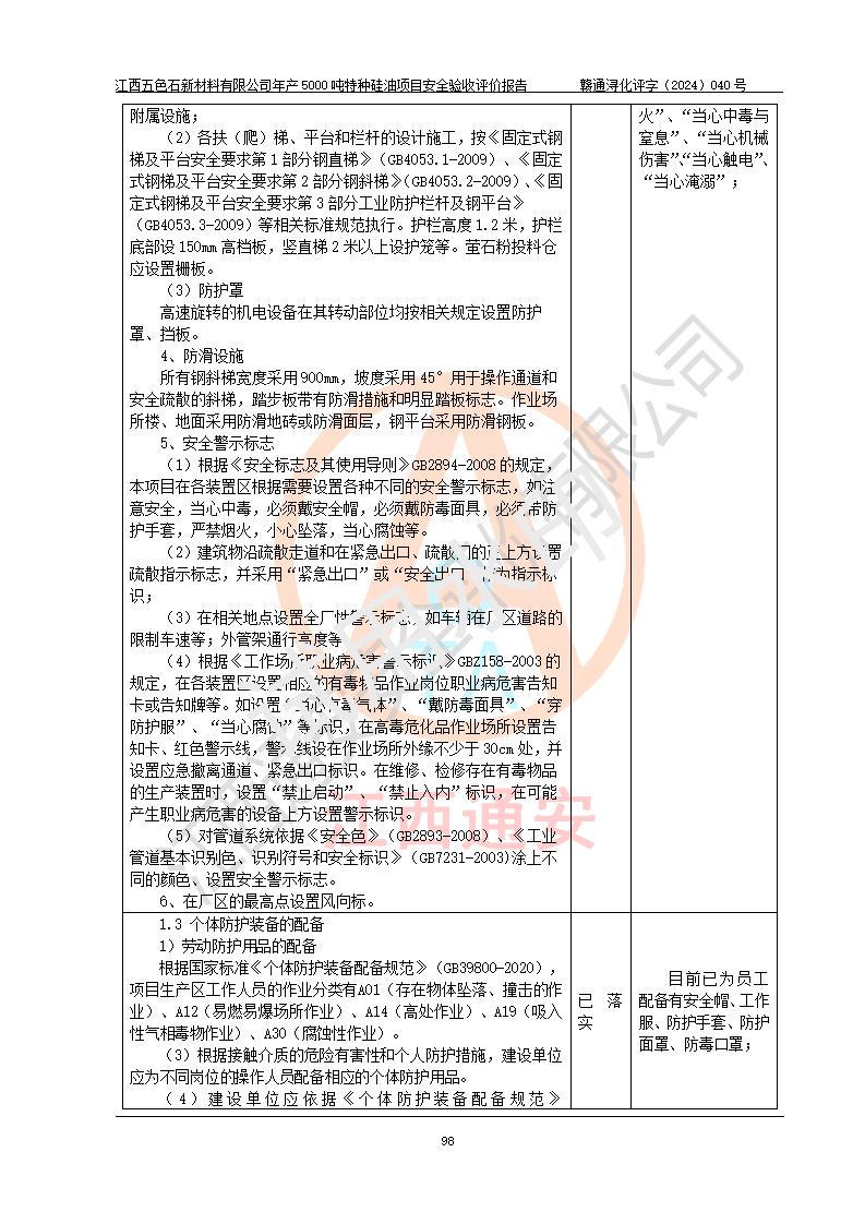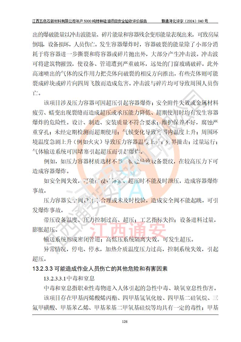 評(píng)價(jià)結(jié)論 | 江西五色石新材料有限公司年產(chǎn)5000噸特種硅油項(xiàng)目總平面布置、現(xiàn)場(chǎng)設(shè)備布置情況與設(shè)計(jì)圖紙一致,本次項(xiàng)目不涉及重點(diǎn)監(jiān)管的危險(xiǎn)化學(xué)品、危險(xiǎn)工藝、重大危險(xiǎn)源,按設(shè)計(jì)要求,設(shè)置有DCS系統(tǒng)、GDS系統(tǒng),符合《江西省應(yīng)急管理廳關(guān)于印發(fā)(試行)的通知 》、關(guān)于印發(fā)《九江市化工企業(yè)自動(dòng)化提升實(shí)施方案》的安全要求,符合《危險(xiǎn)化學(xué)品生產(chǎn)建設(shè)項(xiàng)目安全風(fēng)險(xiǎn)防控指南(試行)》規(guī)定竣工驗(yàn)收的安全條件;企業(yè)主要負(fù)責(zé)人、安全管理部門負(fù)責(zé)人均為化學(xué)、化工相關(guān)專業(yè),且有3年以上化工行業(yè)從業(yè)經(jīng)歷,企業(yè)主要負(fù)責(zé)人及安全管理人員已取得危險(xiǎn)化學(xué)品企業(yè)主要負(fù)責(zé)人及安全管理人員考核合格證。項(xiàng)目選擇的工藝過程及設(shè)備設(shè)施的安全可靠性能達(dá)到 **法規(guī)、標(biāo)準(zhǔn)規(guī)定要求。 項(xiàng)目運(yùn)行后存在的主要危險(xiǎn)、有害因素有:火災(zāi)、其他爆炸、容器爆炸、中毒與窒息等;存在的主要有害因素有高溫、化學(xué)物質(zhì)危害等;針對(duì)存在的危險(xiǎn)、有害因素,企業(yè)采取了**的安全技術(shù)措施及安全管理措施,符合**有關(guān)法規(guī)、標(biāo)準(zhǔn)、規(guī)范要求;項(xiàng)目風(fēng)險(xiǎn)可控,其安全生產(chǎn)條件和安全管理 方面具備竣工安全驗(yàn)收的條件。 | ||||