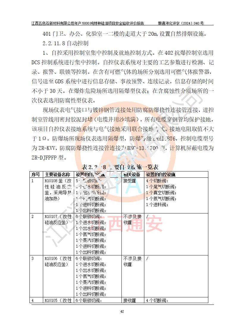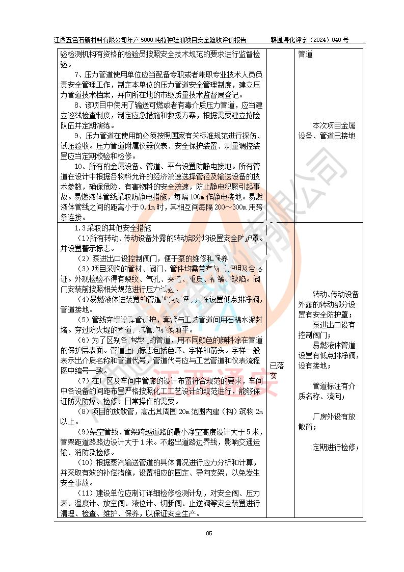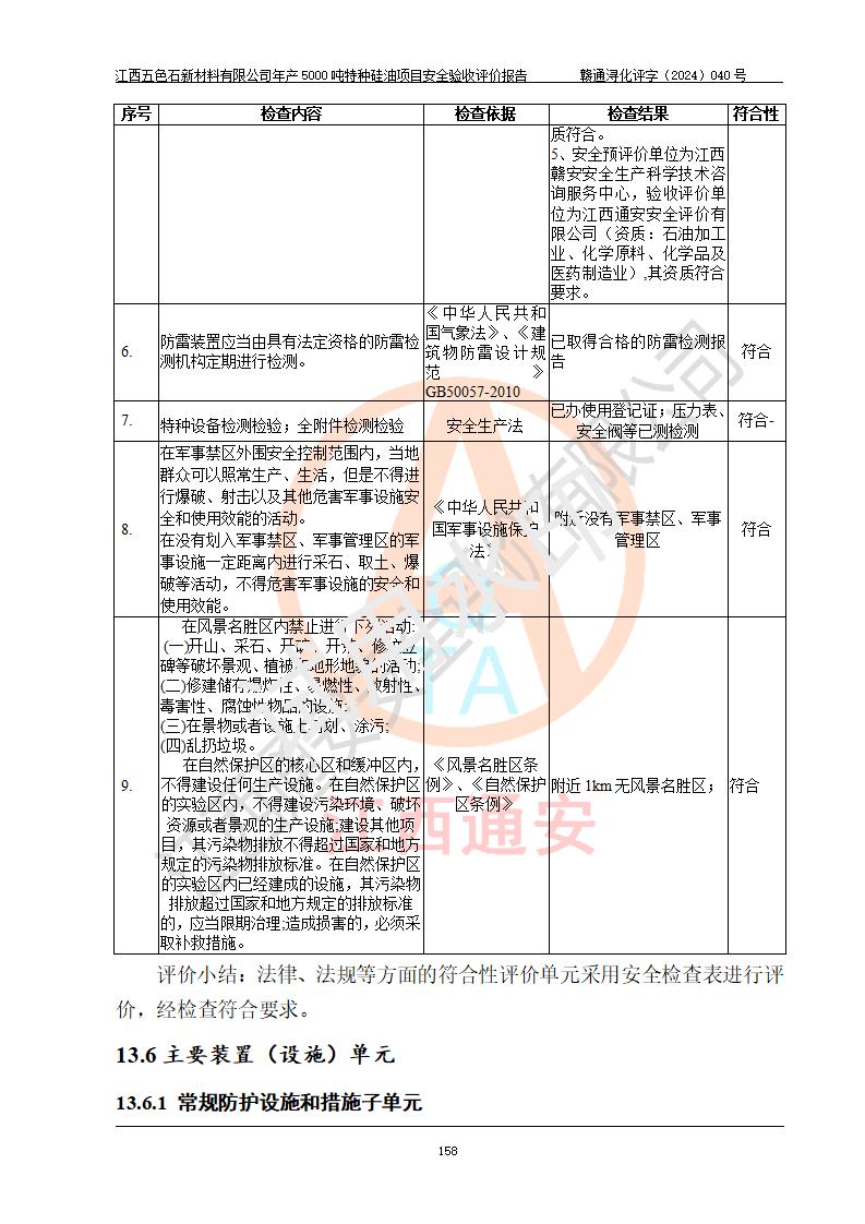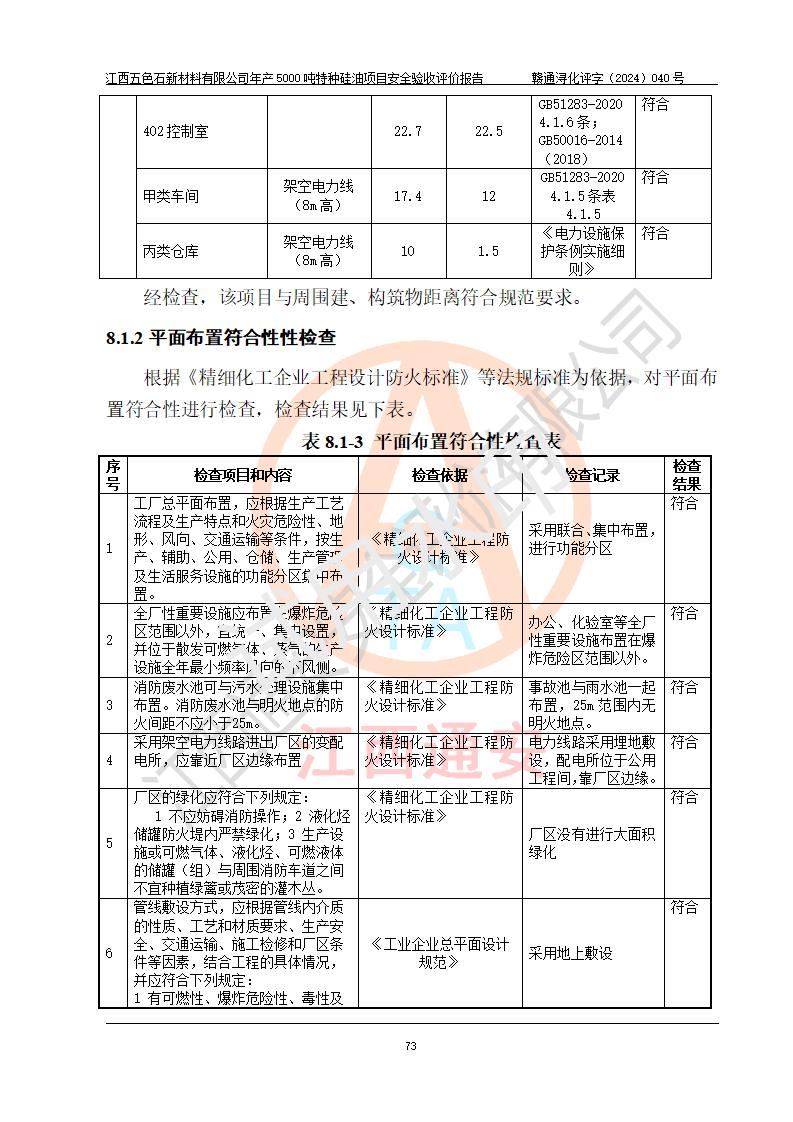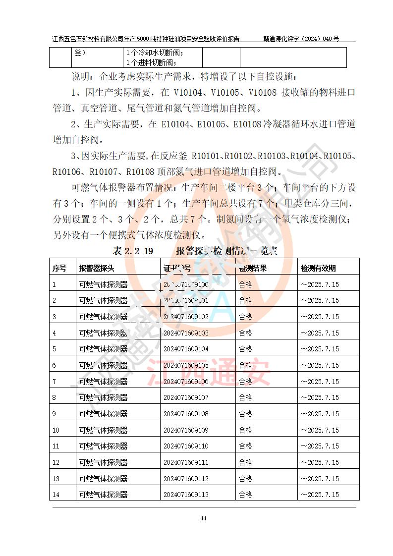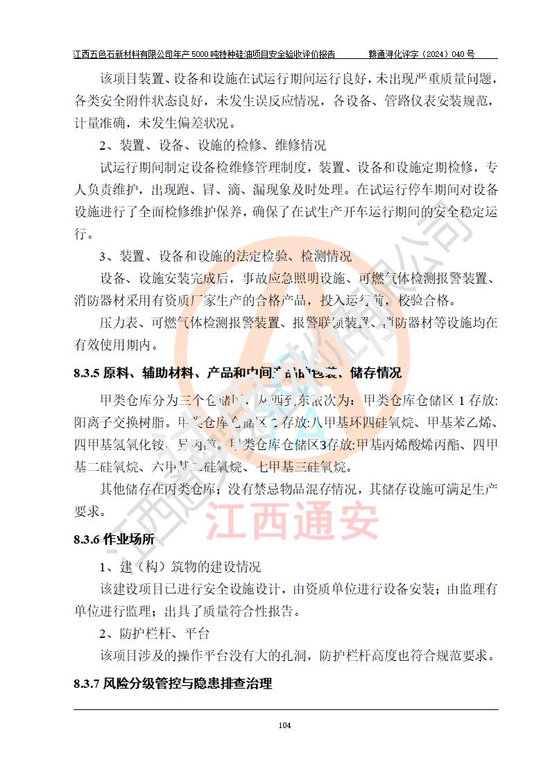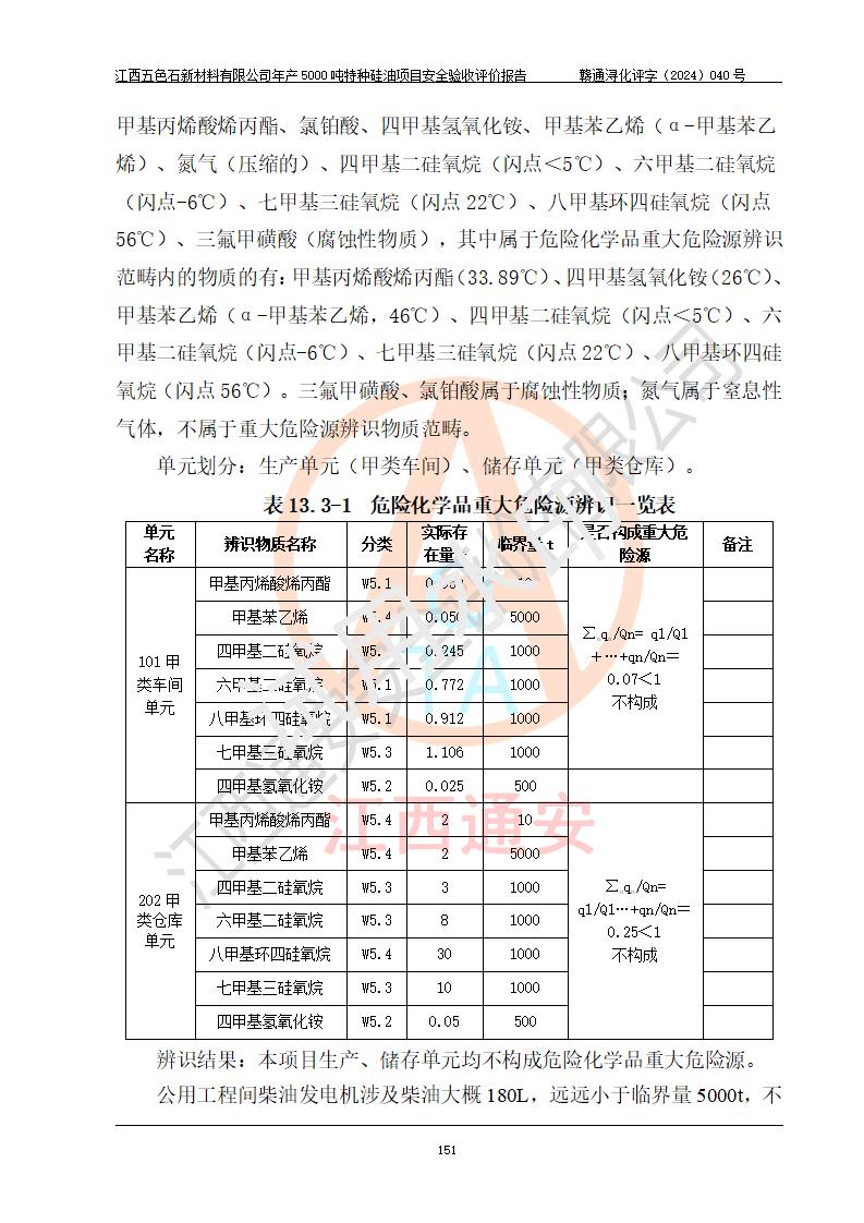 評(píng)價(jià)結(jié)論 | 江西五色石新材料有限公司年產(chǎn)5000噸特種硅油項(xiàng)目總平面布置、現(xiàn)場(chǎng)設(shè)備布置情況與設(shè)計(jì)圖紙一致,本次項(xiàng)目不涉及重點(diǎn)監(jiān)管的危險(xiǎn)化學(xué)品、危險(xiǎn)工藝、重大危險(xiǎn)源,按設(shè)計(jì)要求,設(shè)置有DCS系統(tǒng)、GDS系統(tǒng),符合《江西省應(yīng)急管理廳關(guān)于印發(fā)(試行)的通知 》、關(guān)于印發(fā)《九江市化工企業(yè)自動(dòng)化提升實(shí)施方案》的安全要求,符合《危險(xiǎn)化學(xué)品生產(chǎn)建設(shè)項(xiàng)目安全風(fēng)險(xiǎn)防控指南(試行)》規(guī)定竣工驗(yàn)收的安全條件;企業(yè)主要負(fù)責(zé)人、安全管理部門負(fù)責(zé)人均為化學(xué)、化工相關(guān)專業(yè),且有3年以上化工行業(yè)從業(yè)經(jīng)歷,企業(yè)主要負(fù)責(zé)人及安全管理人員已取得危險(xiǎn)化學(xué)品企業(yè)主要負(fù)責(zé)人及安全管理人員考核合格證。項(xiàng)目選擇的工藝過程及設(shè)備設(shè)施的安全可靠性能達(dá)到 **法規(guī)、標(biāo)準(zhǔn)規(guī)定要求。 項(xiàng)目運(yùn)行后存在的主要危險(xiǎn)、有害因素有:火災(zāi)、其他爆炸、容器爆炸、中毒與窒息等;存在的主要有害因素有高溫、化學(xué)物質(zhì)危害等;針對(duì)存在的危險(xiǎn)、有害因素,企業(yè)采取了**的安全技術(shù)措施及安全管理措施,符合**有關(guān)法規(guī)、標(biāo)準(zhǔn)、規(guī)范要求;項(xiàng)目風(fēng)險(xiǎn)可控,其安全生產(chǎn)條件和安全管理 方面具備竣工安全驗(yàn)收的條件。 | ||||