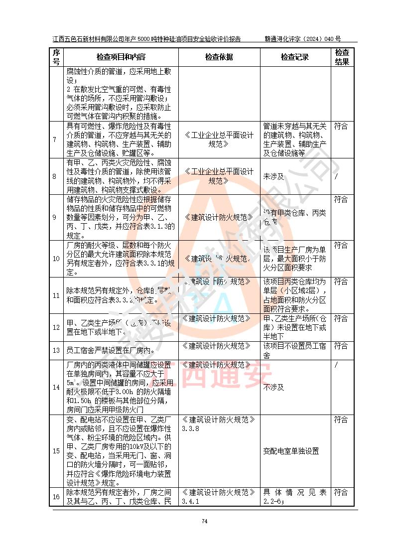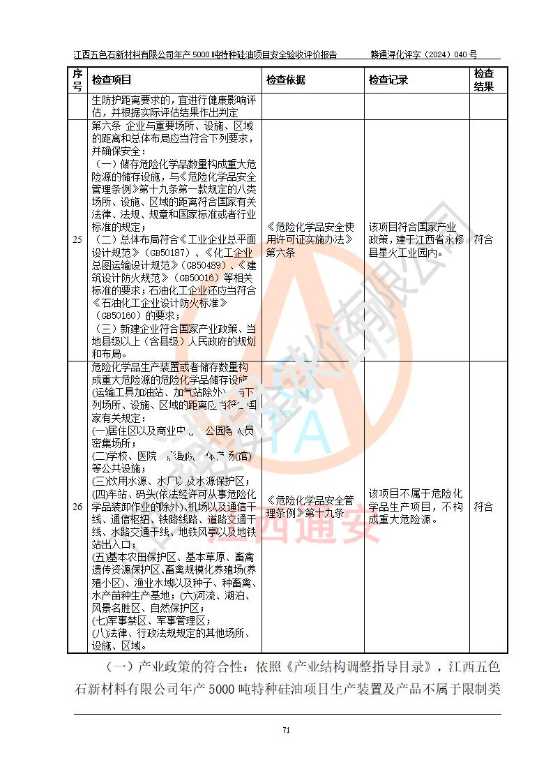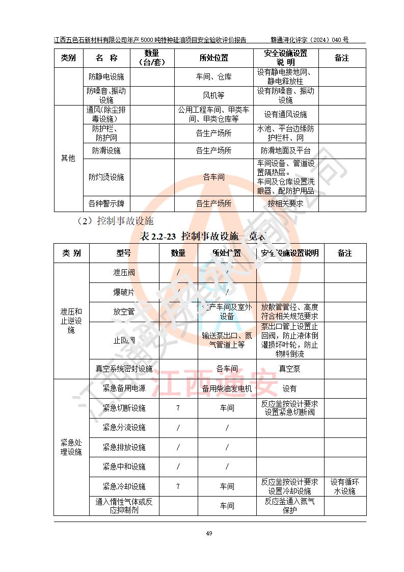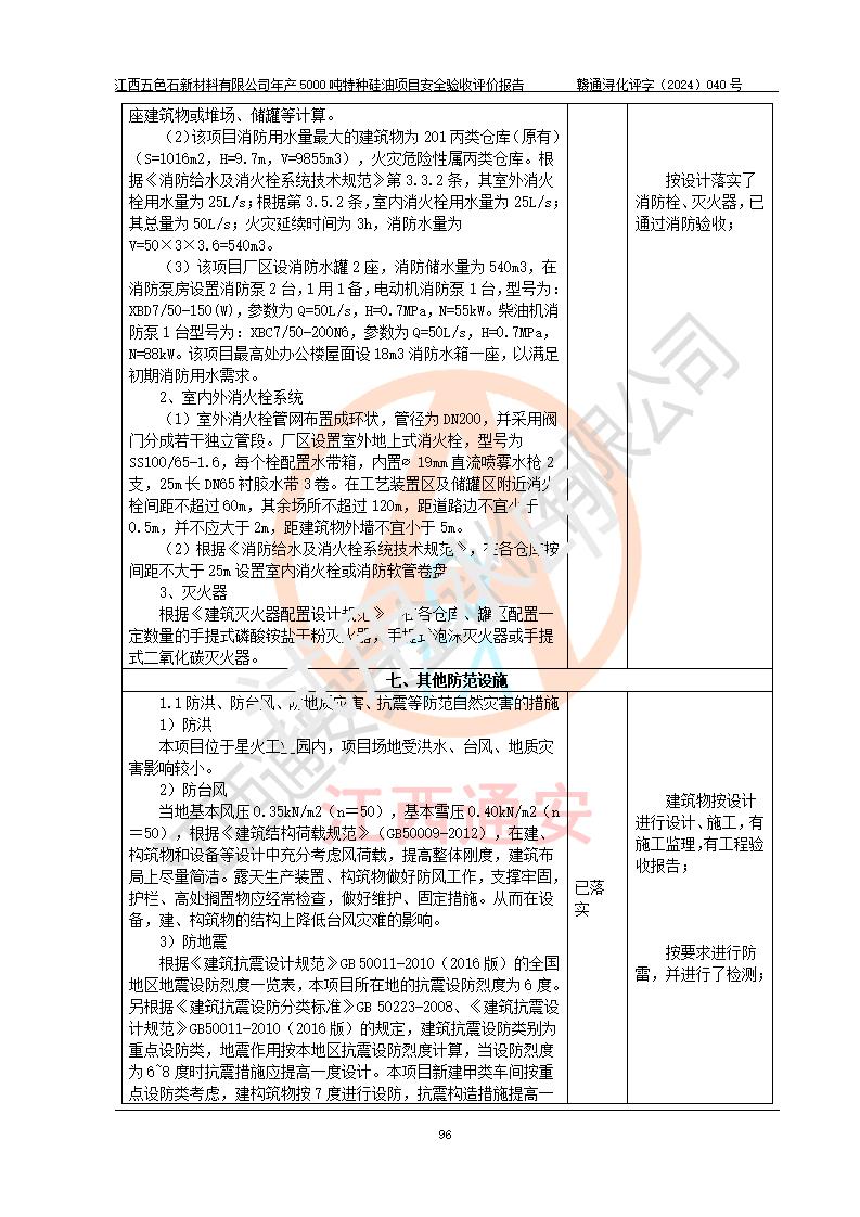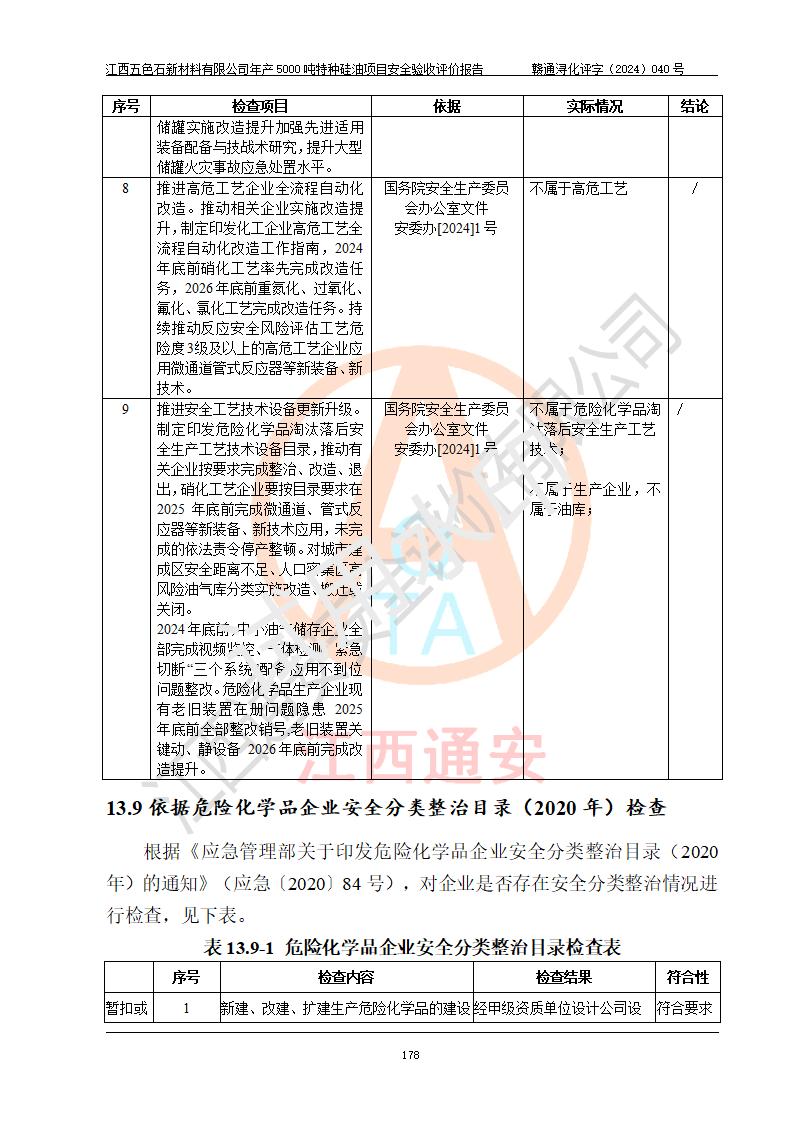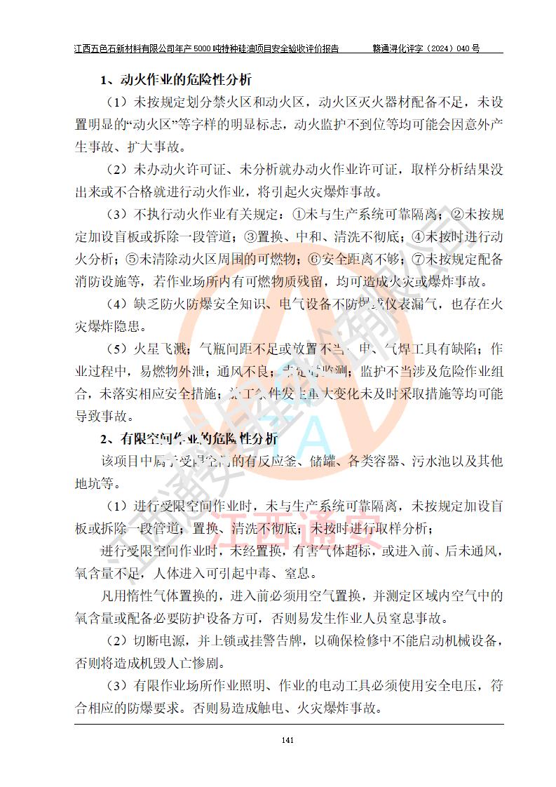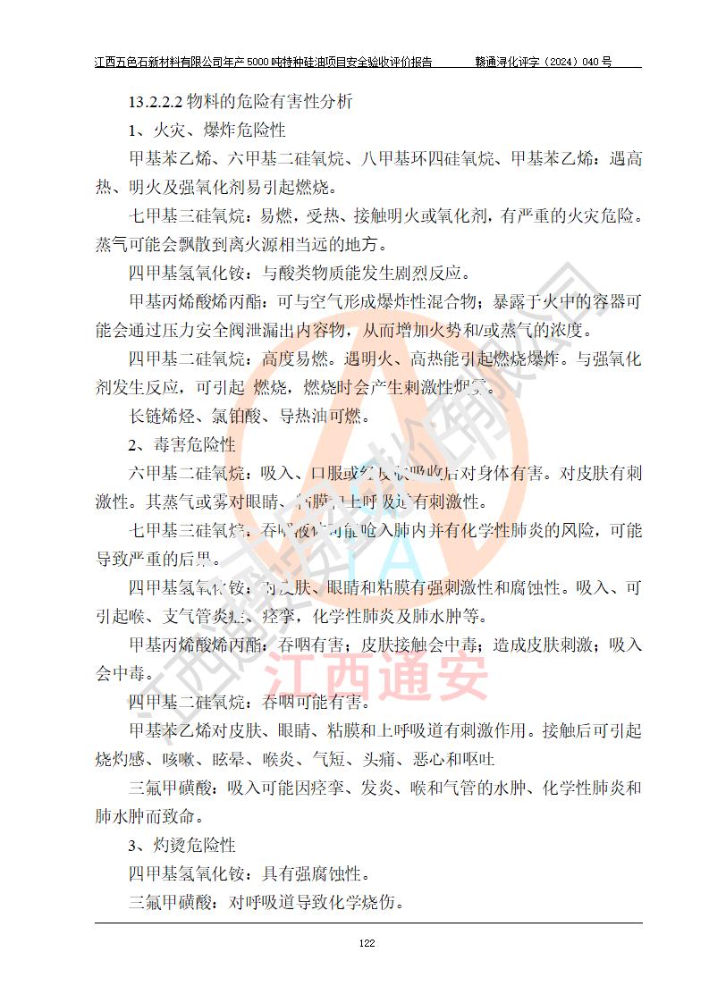 評(píng)價(jià)結(jié)論 | 江西五色石新材料有限公司年產(chǎn)5000噸特種硅油項(xiàng)目總平面布置、現(xiàn)場(chǎng)設(shè)備布置情況與設(shè)計(jì)圖紙一致,本次項(xiàng)目不涉及重點(diǎn)監(jiān)管的危險(xiǎn)化學(xué)品、危險(xiǎn)工藝、重大危險(xiǎn)源,按設(shè)計(jì)要求,設(shè)置有DCS系統(tǒng)、GDS系統(tǒng),符合《江西省應(yīng)急管理廳關(guān)于印發(fā)(試行)的通知 》、關(guān)于印發(fā)《九江市化工企業(yè)自動(dòng)化提升實(shí)施方案》的安全要求,符合《危險(xiǎn)化學(xué)品生產(chǎn)建設(shè)項(xiàng)目安全風(fēng)險(xiǎn)防控指南(試行)》規(guī)定竣工驗(yàn)收的安全條件;企業(yè)主要負(fù)責(zé)人、安全管理部門負(fù)責(zé)人均為化學(xué)、化工相關(guān)專業(yè),且有3年以上化工行業(yè)從業(yè)經(jīng)歷,企業(yè)主要負(fù)責(zé)人及安全管理人員已取得危險(xiǎn)化學(xué)品企業(yè)主要負(fù)責(zé)人及安全管理人員考核合格證。項(xiàng)目選擇的工藝過程及設(shè)備設(shè)施的安全可靠性能達(dá)到 **法規(guī)、標(biāo)準(zhǔn)規(guī)定要求。 項(xiàng)目運(yùn)行后存在的主要危險(xiǎn)、有害因素有:火災(zāi)、其他爆炸、容器爆炸、中毒與窒息等;存在的主要有害因素有高溫、化學(xué)物質(zhì)危害等;針對(duì)存在的危險(xiǎn)、有害因素,企業(yè)采取了**的安全技術(shù)措施及安全管理措施,符合**有關(guān)法規(guī)、標(biāo)準(zhǔn)、規(guī)范要求;項(xiàng)目風(fēng)險(xiǎn)可控,其安全生產(chǎn)條件和安全管理 方面具備竣工安全驗(yàn)收的條件。 | ||||