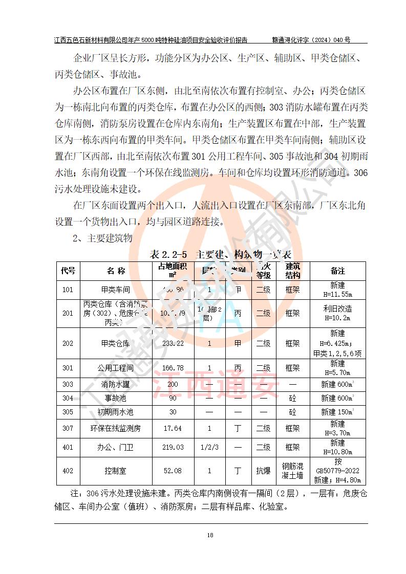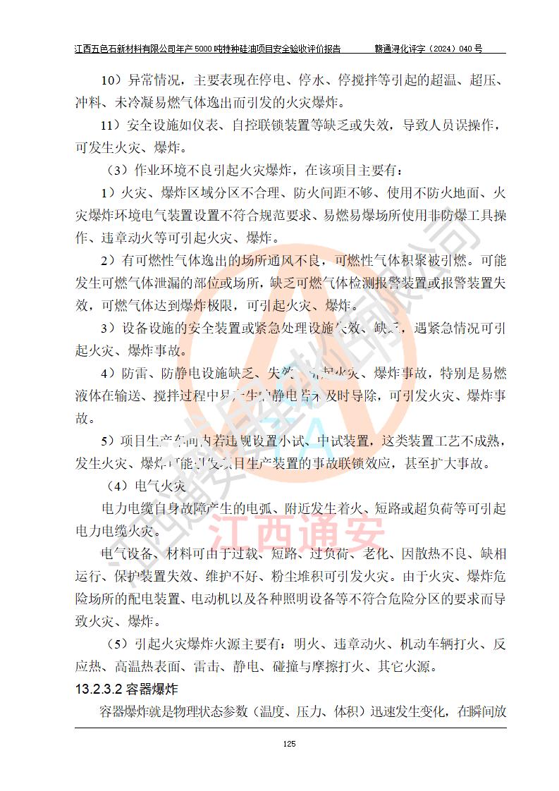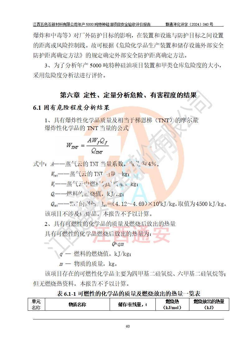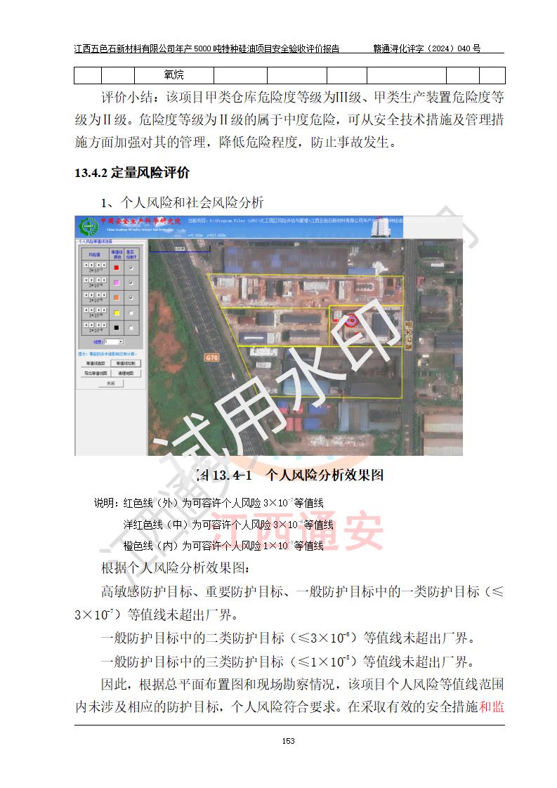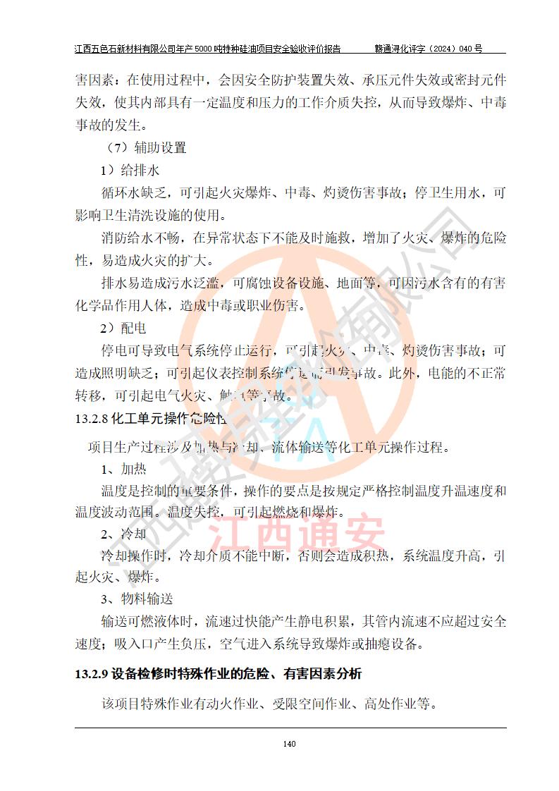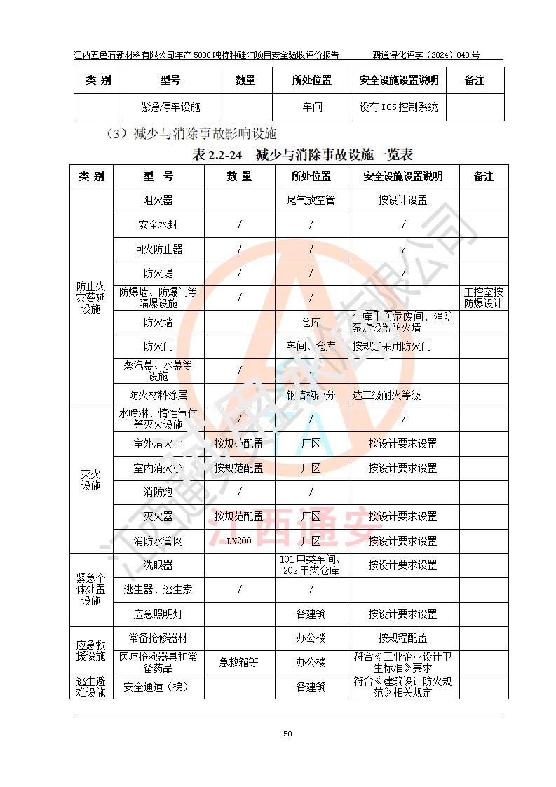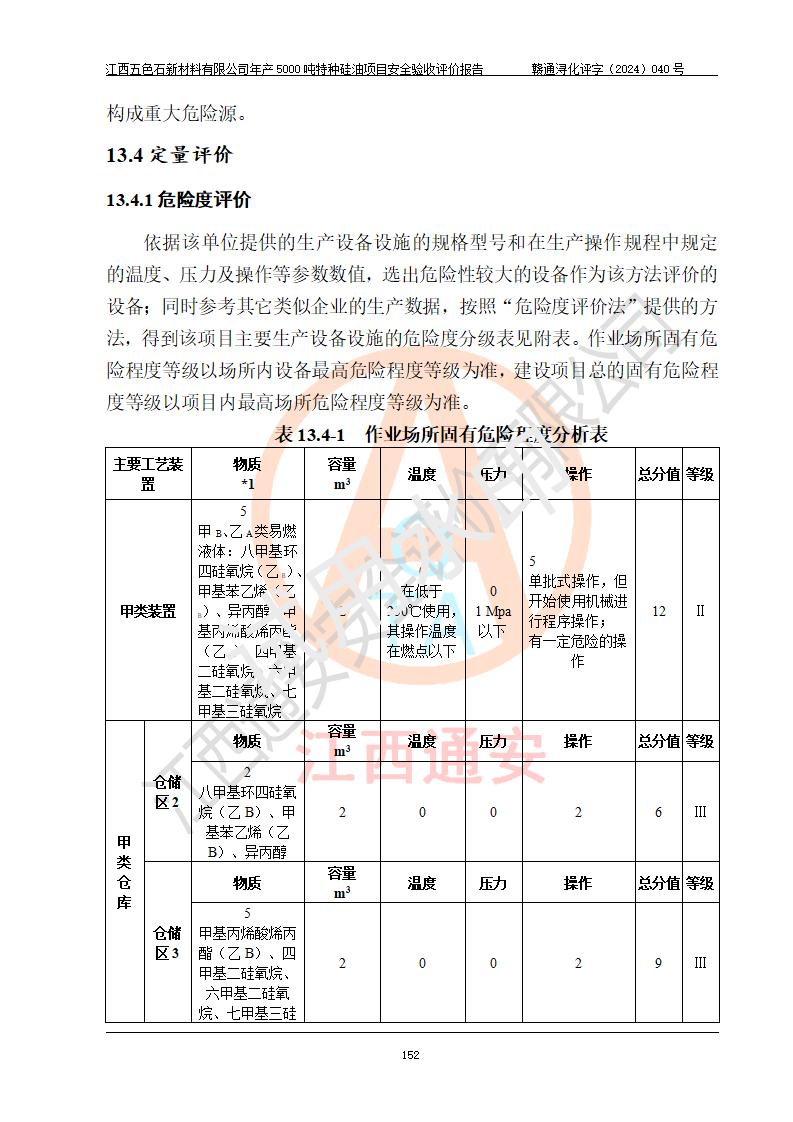 評(píng)價(jià)結(jié)論 | 江西五色石新材料有限公司年產(chǎn)5000噸特種硅油項(xiàng)目總平面布置、現(xiàn)場(chǎng)設(shè)備布置情況與設(shè)計(jì)圖紙一致,本次項(xiàng)目不涉及重點(diǎn)監(jiān)管的危險(xiǎn)化學(xué)品、危險(xiǎn)工藝、重大危險(xiǎn)源,按設(shè)計(jì)要求,設(shè)置有DCS系統(tǒng)、GDS系統(tǒng),符合《江西省應(yīng)急管理廳關(guān)于印發(fā)(試行)的通知 》、關(guān)于印發(fā)《九江市化工企業(yè)自動(dòng)化提升實(shí)施方案》的安全要求,符合《危險(xiǎn)化學(xué)品生產(chǎn)建設(shè)項(xiàng)目安全風(fēng)險(xiǎn)防控指南(試行)》規(guī)定竣工驗(yàn)收的安全條件;企業(yè)主要負(fù)責(zé)人、安全管理部門負(fù)責(zé)人均為化學(xué)、化工相關(guān)專業(yè),且有3年以上化工行業(yè)從業(yè)經(jīng)歷,企業(yè)主要負(fù)責(zé)人及安全管理人員已取得危險(xiǎn)化學(xué)品企業(yè)主要負(fù)責(zé)人及安全管理人員考核合格證。項(xiàng)目選擇的工藝過程及設(shè)備設(shè)施的安全可靠性能達(dá)到 **法規(guī)、標(biāo)準(zhǔn)規(guī)定要求。 項(xiàng)目運(yùn)行后存在的主要危險(xiǎn)、有害因素有:火災(zāi)、其他爆炸、容器爆炸、中毒與窒息等;存在的主要有害因素有高溫、化學(xué)物質(zhì)危害等;針對(duì)存在的危險(xiǎn)、有害因素,企業(yè)采取了**的安全技術(shù)措施及安全管理措施,符合**有關(guān)法規(guī)、標(biāo)準(zhǔn)、規(guī)范要求;項(xiàng)目風(fēng)險(xiǎn)可控,其安全生產(chǎn)條件和安全管理 方面具備竣工安全驗(yàn)收的條件。 | ||||