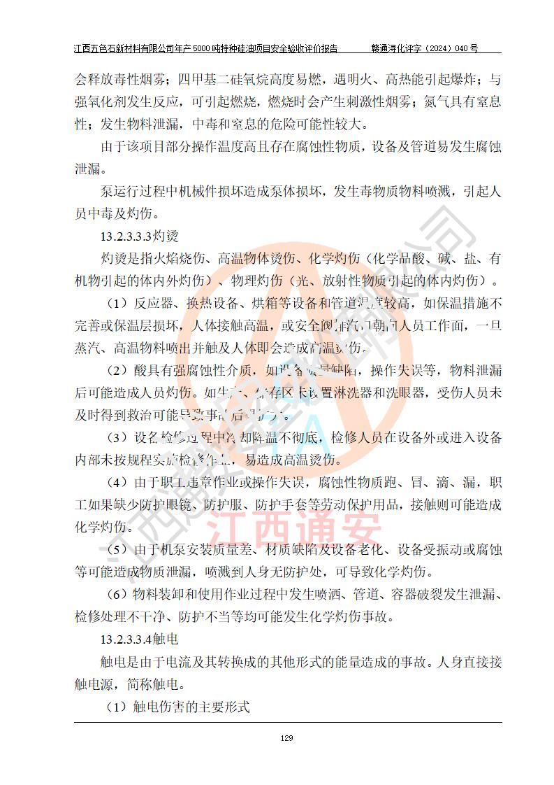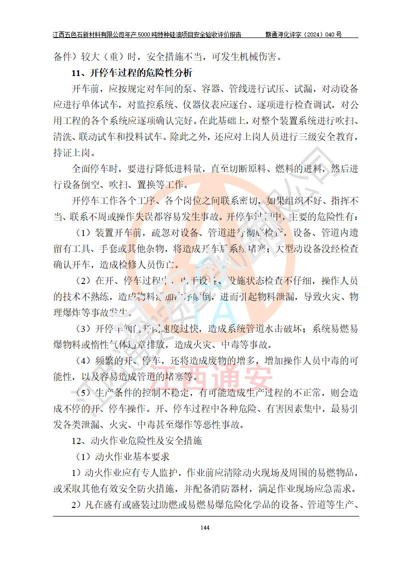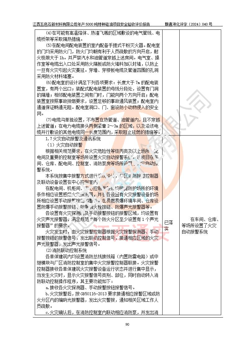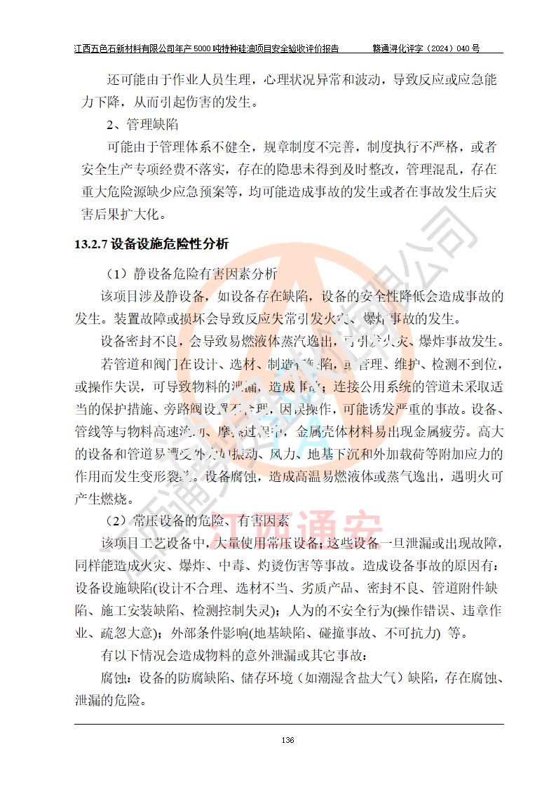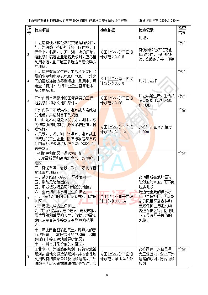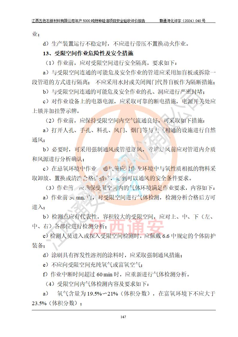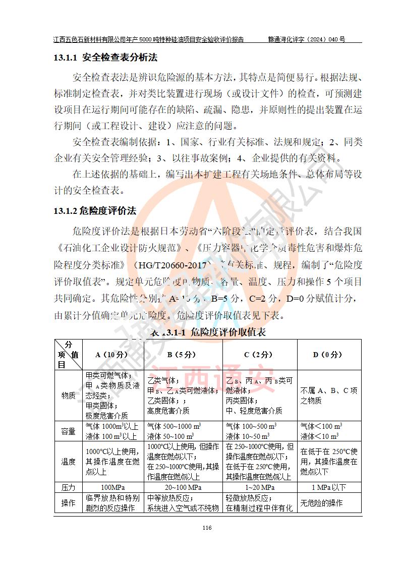 評(píng)價(jià)結(jié)論 | 江西五色石新材料有限公司年產(chǎn)5000噸特種硅油項(xiàng)目總平面布置、現(xiàn)場(chǎng)設(shè)備布置情況與設(shè)計(jì)圖紙一致,本次項(xiàng)目不涉及重點(diǎn)監(jiān)管的危險(xiǎn)化學(xué)品、危險(xiǎn)工藝、重大危險(xiǎn)源,按設(shè)計(jì)要求,設(shè)置有DCS系統(tǒng)、GDS系統(tǒng),符合《江西省應(yīng)急管理廳關(guān)于印發(fā)(試行)的通知 》、關(guān)于印發(fā)《九江市化工企業(yè)自動(dòng)化提升實(shí)施方案》的安全要求,符合《危險(xiǎn)化學(xué)品生產(chǎn)建設(shè)項(xiàng)目安全風(fēng)險(xiǎn)防控指南(試行)》規(guī)定竣工驗(yàn)收的安全條件;企業(yè)主要負(fù)責(zé)人、安全管理部門負(fù)責(zé)人均為化學(xué)、化工相關(guān)專業(yè),且有3年以上化工行業(yè)從業(yè)經(jīng)歷,企業(yè)主要負(fù)責(zé)人及安全管理人員已取得危險(xiǎn)化學(xué)品企業(yè)主要負(fù)責(zé)人及安全管理人員考核合格證。項(xiàng)目選擇的工藝過程及設(shè)備設(shè)施的安全可靠性能達(dá)到 **法規(guī)、標(biāo)準(zhǔn)規(guī)定要求。 項(xiàng)目運(yùn)行后存在的主要危險(xiǎn)、有害因素有:火災(zāi)、其他爆炸、容器爆炸、中毒與窒息等;存在的主要有害因素有高溫、化學(xué)物質(zhì)危害等;針對(duì)存在的危險(xiǎn)、有害因素,企業(yè)采取了**的安全技術(shù)措施及安全管理措施,符合**有關(guān)法規(guī)、標(biāo)準(zhǔn)、規(guī)范要求;項(xiàng)目風(fēng)險(xiǎn)可控,其安全生產(chǎn)條件和安全管理 方面具備竣工安全驗(yàn)收的條件。 | ||||