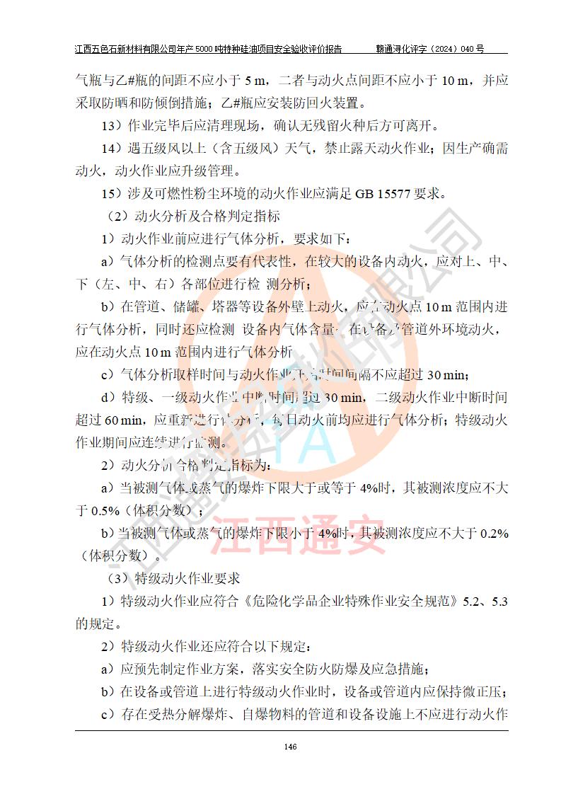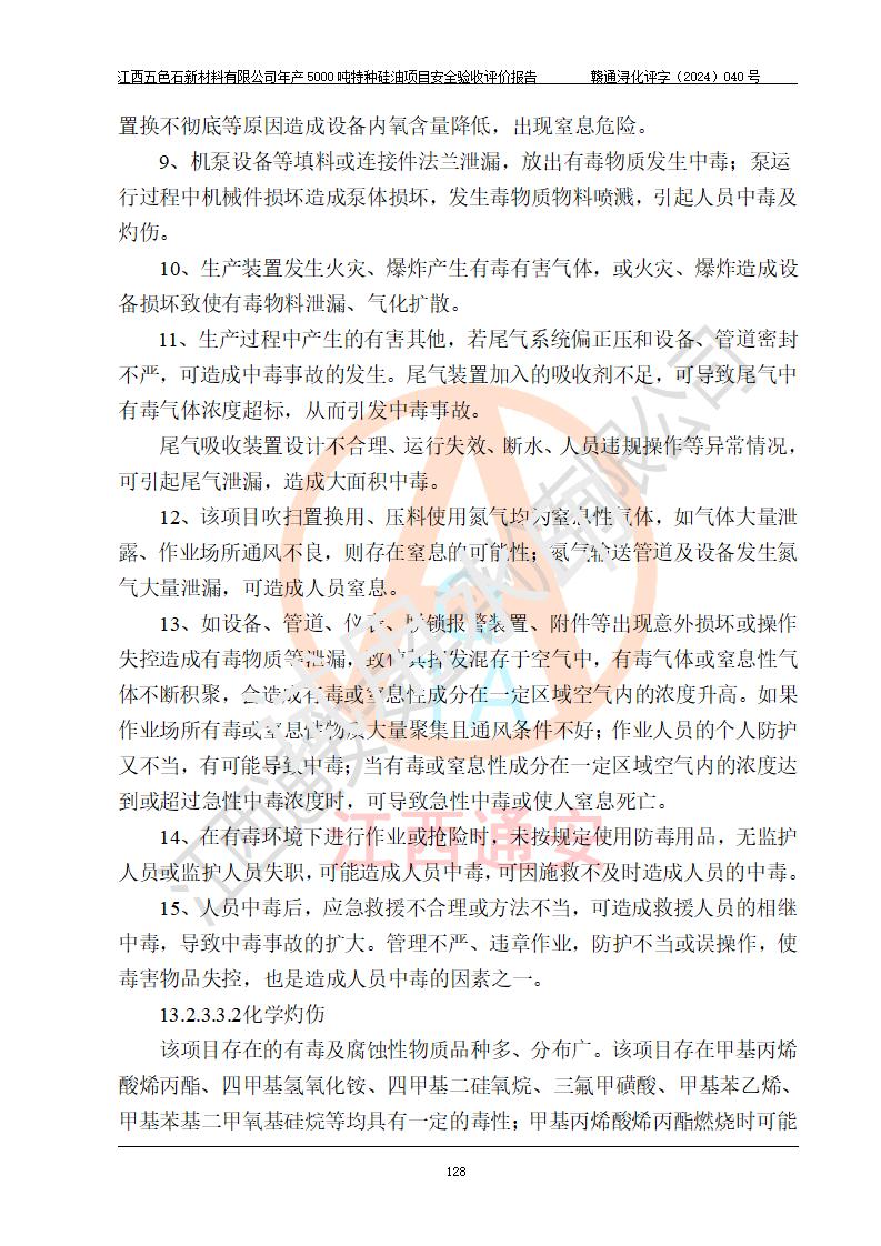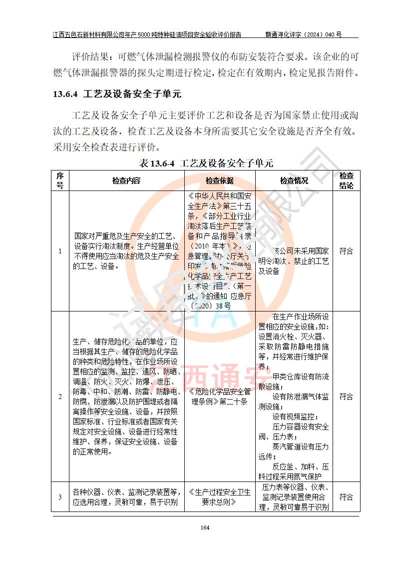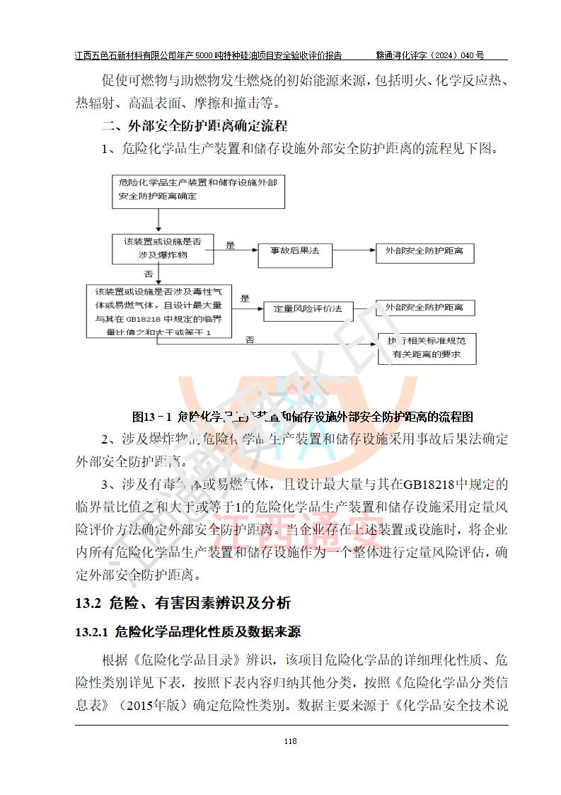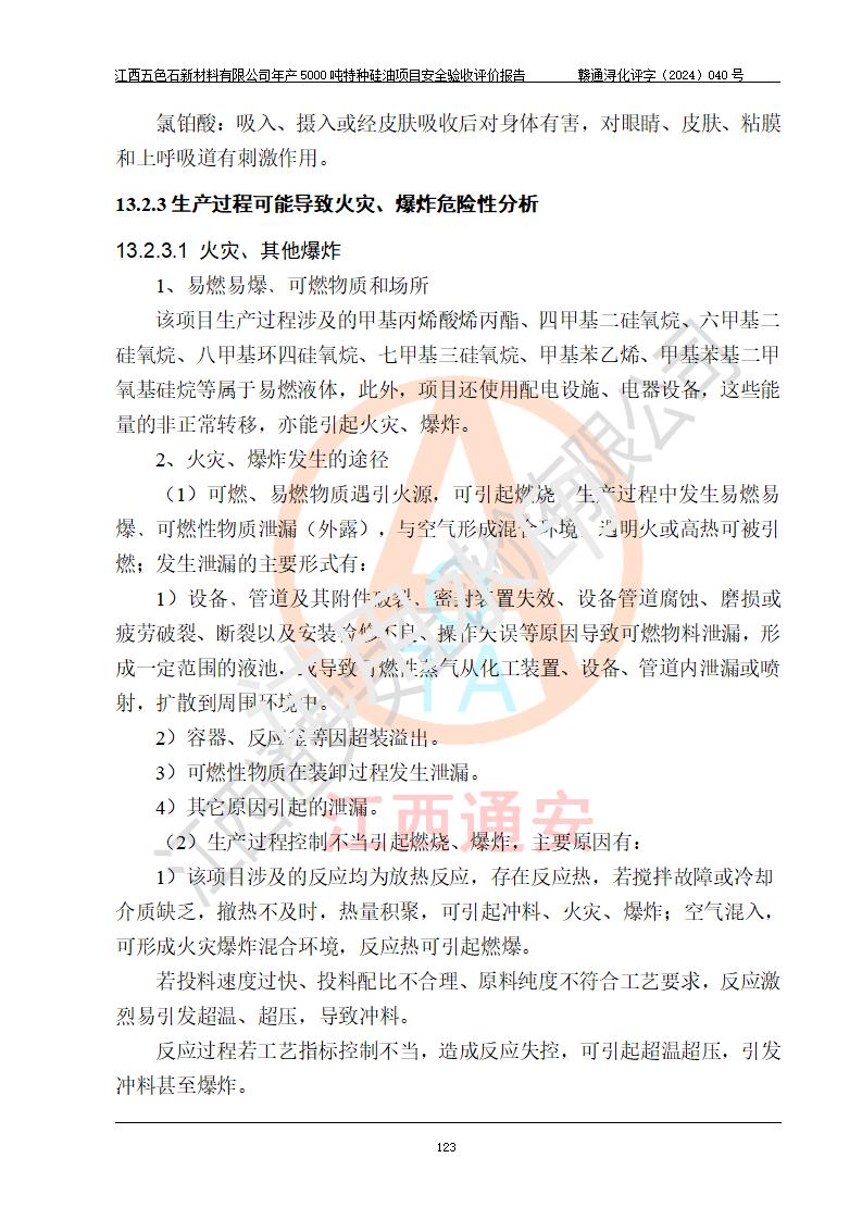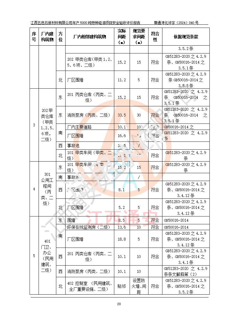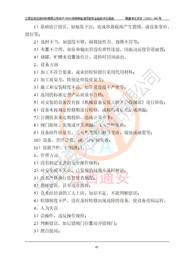 評(píng)價(jià)結(jié)論 | 江西五色石新材料有限公司年產(chǎn)5000噸特種硅油項(xiàng)目總平面布置、現(xiàn)場(chǎng)設(shè)備布置情況與設(shè)計(jì)圖紙一致,本次項(xiàng)目不涉及重點(diǎn)監(jiān)管的危險(xiǎn)化學(xué)品、危險(xiǎn)工藝、重大危險(xiǎn)源,按設(shè)計(jì)要求,設(shè)置有DCS系統(tǒng)、GDS系統(tǒng),符合《江西省應(yīng)急管理廳關(guān)于印發(fā)(試行)的通知 》、關(guān)于印發(fā)《九江市化工企業(yè)自動(dòng)化提升實(shí)施方案》的安全要求,符合《危險(xiǎn)化學(xué)品生產(chǎn)建設(shè)項(xiàng)目安全風(fēng)險(xiǎn)防控指南(試行)》規(guī)定竣工驗(yàn)收的安全條件;企業(yè)主要負(fù)責(zé)人、安全管理部門負(fù)責(zé)人均為化學(xué)、化工相關(guān)專業(yè),且有3年以上化工行業(yè)從業(yè)經(jīng)歷,企業(yè)主要負(fù)責(zé)人及安全管理人員已取得危險(xiǎn)化學(xué)品企業(yè)主要負(fù)責(zé)人及安全管理人員考核合格證。項(xiàng)目選擇的工藝過程及設(shè)備設(shè)施的安全可靠性能達(dá)到 **法規(guī)、標(biāo)準(zhǔn)規(guī)定要求。 項(xiàng)目運(yùn)行后存在的主要危險(xiǎn)、有害因素有:火災(zāi)、其他爆炸、容器爆炸、中毒與窒息等;存在的主要有害因素有高溫、化學(xué)物質(zhì)危害等;針對(duì)存在的危險(xiǎn)、有害因素,企業(yè)采取了**的安全技術(shù)措施及安全管理措施,符合**有關(guān)法規(guī)、標(biāo)準(zhǔn)、規(guī)范要求;項(xiàng)目風(fēng)險(xiǎn)可控,其安全生產(chǎn)條件和安全管理 方面具備竣工安全驗(yàn)收的條件。 | ||||