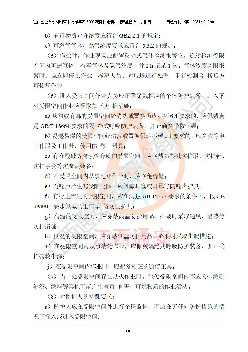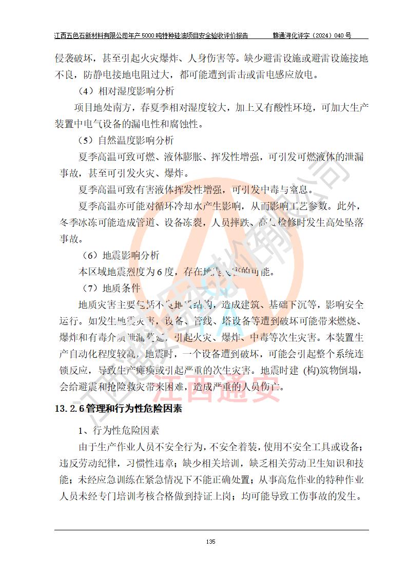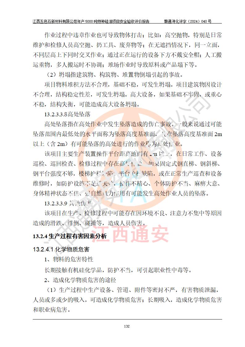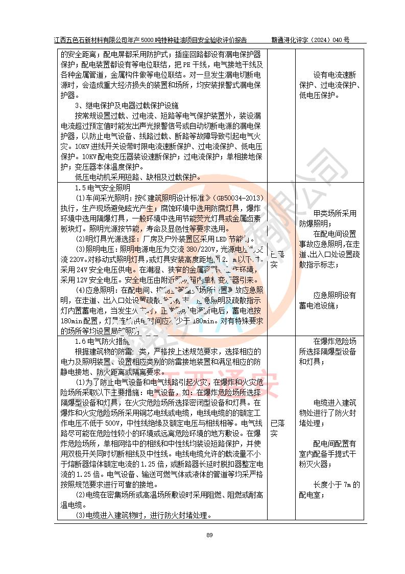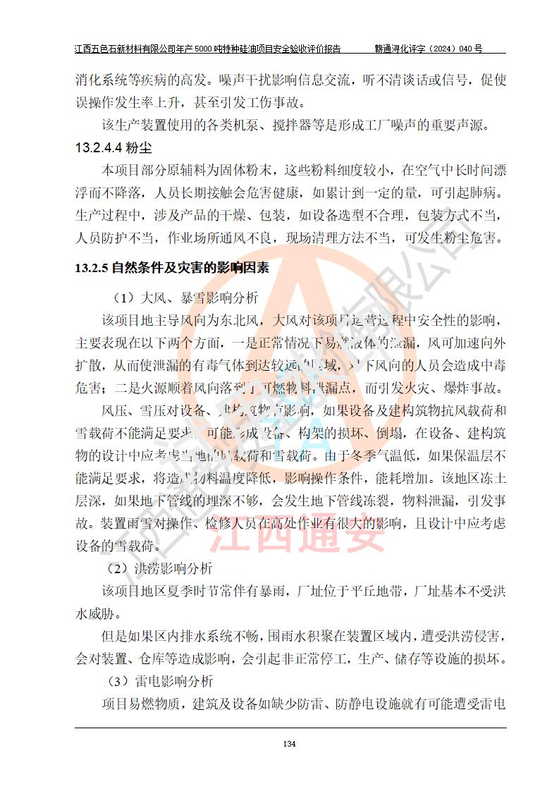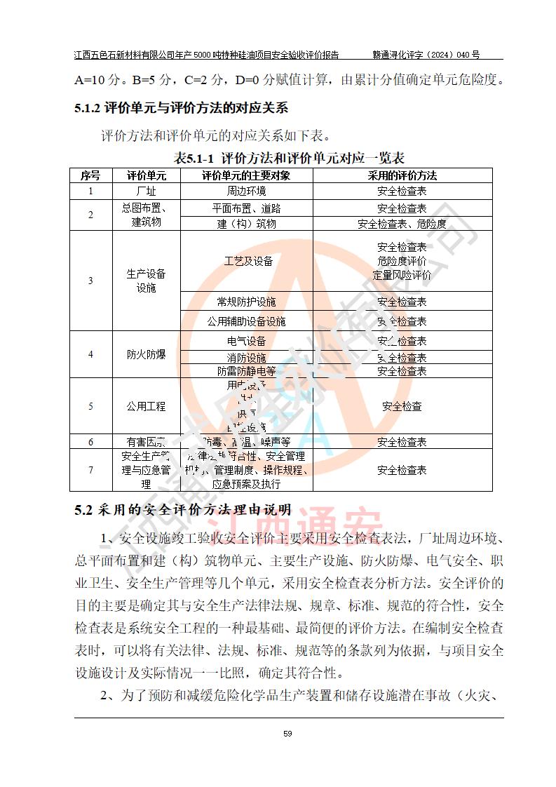 評(píng)價(jià)結(jié)論 | 江西五色石新材料有限公司年產(chǎn)5000噸特種硅油項(xiàng)目總平面布置、現(xiàn)場(chǎng)設(shè)備布置情況與設(shè)計(jì)圖紙一致,本次項(xiàng)目不涉及重點(diǎn)監(jiān)管的危險(xiǎn)化學(xué)品、危險(xiǎn)工藝、重大危險(xiǎn)源,按設(shè)計(jì)要求,設(shè)置有DCS系統(tǒng)、GDS系統(tǒng),符合《江西省應(yīng)急管理廳關(guān)于印發(fā)(試行)的通知 》、關(guān)于印發(fā)《九江市化工企業(yè)自動(dòng)化提升實(shí)施方案》的安全要求,符合《危險(xiǎn)化學(xué)品生產(chǎn)建設(shè)項(xiàng)目安全風(fēng)險(xiǎn)防控指南(試行)》規(guī)定竣工驗(yàn)收的安全條件;企業(yè)主要負(fù)責(zé)人、安全管理部門負(fù)責(zé)人均為化學(xué)、化工相關(guān)專業(yè),且有3年以上化工行業(yè)從業(yè)經(jīng)歷,企業(yè)主要負(fù)責(zé)人及安全管理人員已取得危險(xiǎn)化學(xué)品企業(yè)主要負(fù)責(zé)人及安全管理人員考核合格證。項(xiàng)目選擇的工藝過程及設(shè)備設(shè)施的安全可靠性能達(dá)到 **法規(guī)、標(biāo)準(zhǔn)規(guī)定要求。 項(xiàng)目運(yùn)行后存在的主要危險(xiǎn)、有害因素有:火災(zāi)、其他爆炸、容器爆炸、中毒與窒息等;存在的主要有害因素有高溫、化學(xué)物質(zhì)危害等;針對(duì)存在的危險(xiǎn)、有害因素,企業(yè)采取了**的安全技術(shù)措施及安全管理措施,符合**有關(guān)法規(guī)、標(biāo)準(zhǔn)、規(guī)范要求;項(xiàng)目風(fēng)險(xiǎn)可控,其安全生產(chǎn)條件和安全管理 方面具備竣工安全驗(yàn)收的條件。 | ||||