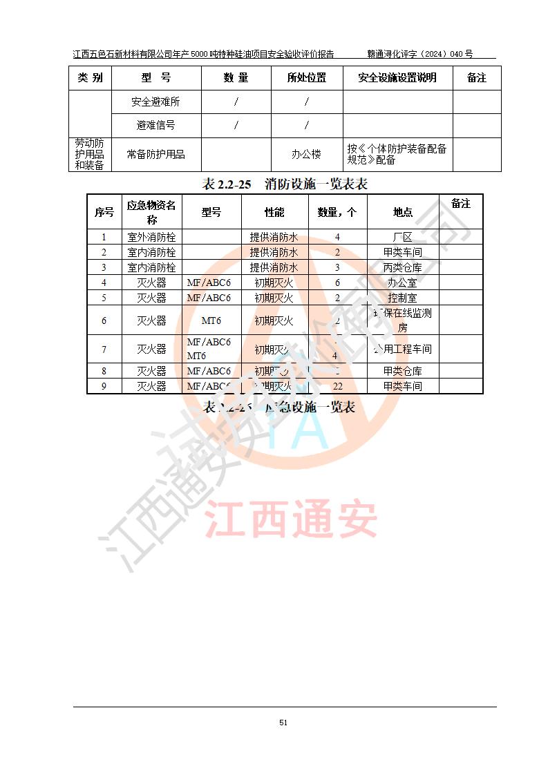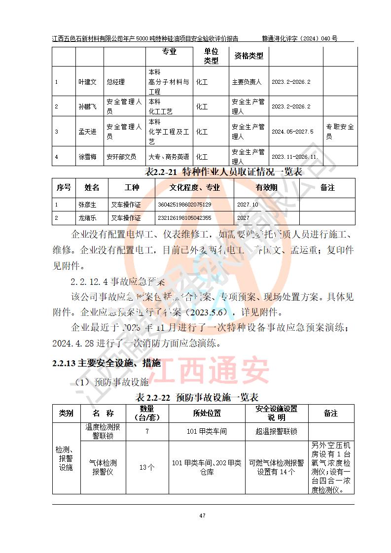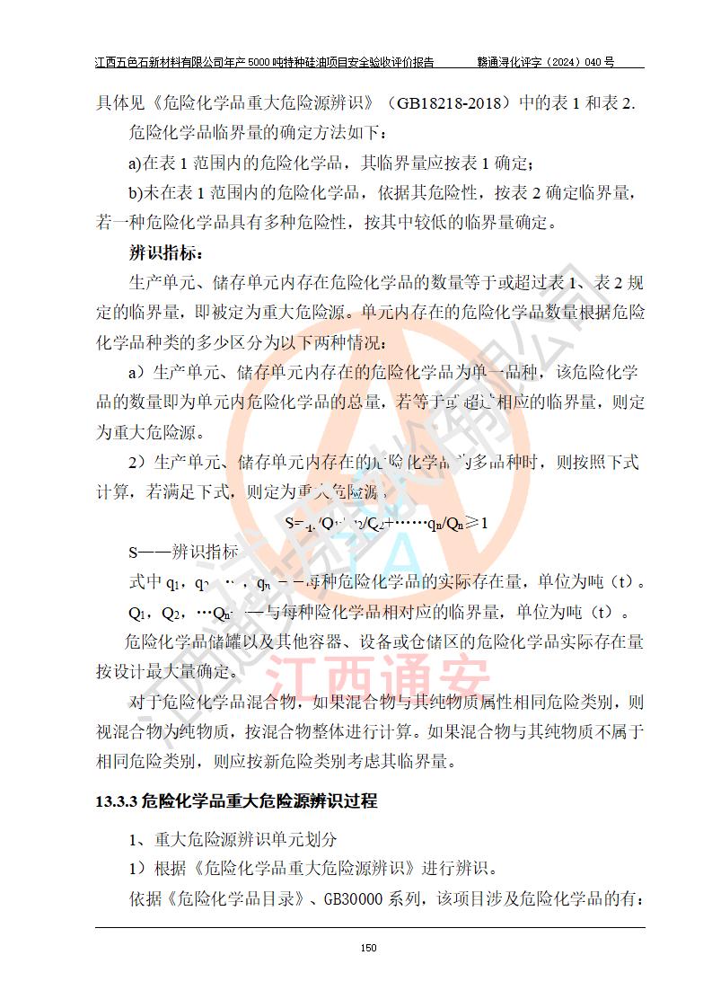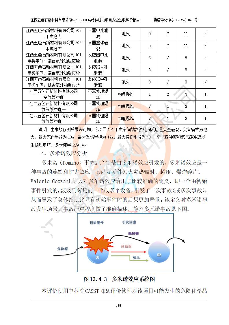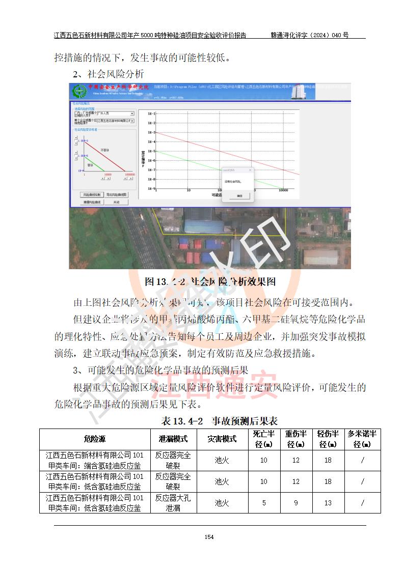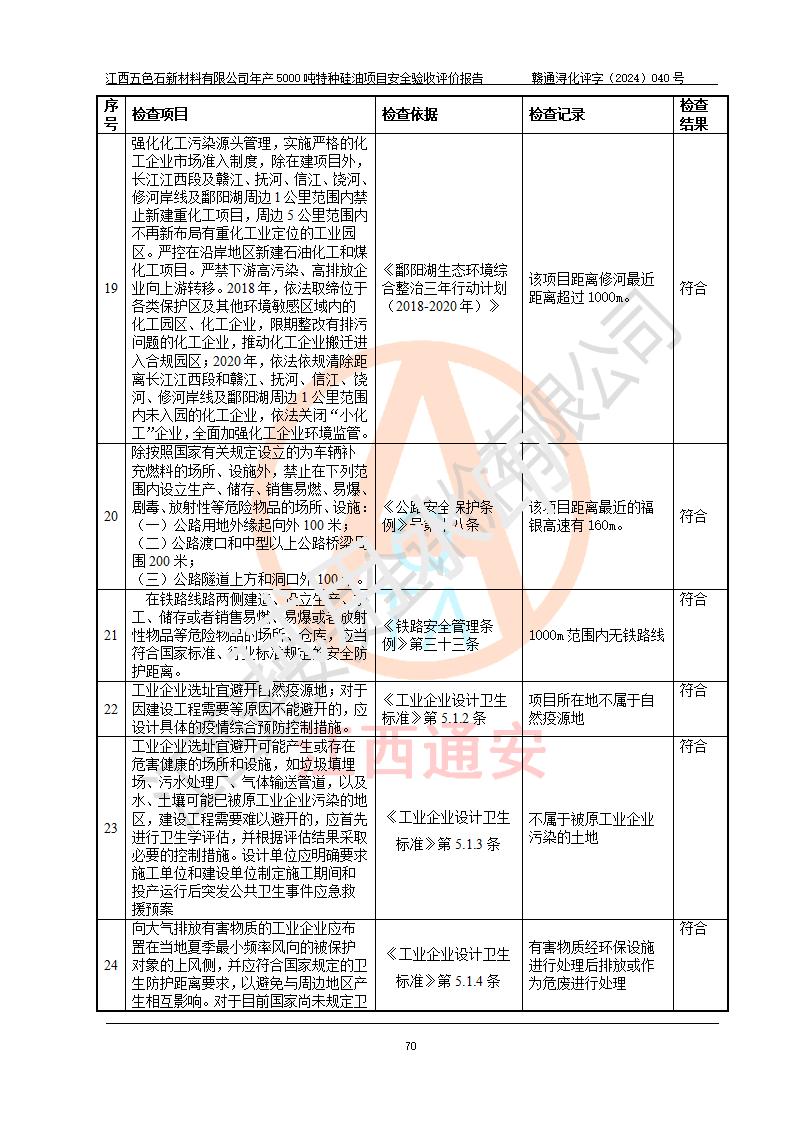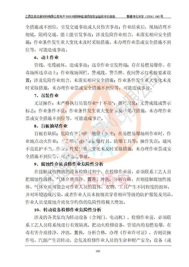 評(píng)價(jià)結(jié)論 | 江西五色石新材料有限公司年產(chǎn)5000噸特種硅油項(xiàng)目總平面布置、現(xiàn)場(chǎng)設(shè)備布置情況與設(shè)計(jì)圖紙一致,本次項(xiàng)目不涉及重點(diǎn)監(jiān)管的危險(xiǎn)化學(xué)品、危險(xiǎn)工藝、重大危險(xiǎn)源,按設(shè)計(jì)要求,設(shè)置有DCS系統(tǒng)、GDS系統(tǒng),符合《江西省應(yīng)急管理廳關(guān)于印發(fā)(試行)的通知 》、關(guān)于印發(fā)《九江市化工企業(yè)自動(dòng)化提升實(shí)施方案》的安全要求,符合《危險(xiǎn)化學(xué)品生產(chǎn)建設(shè)項(xiàng)目安全風(fēng)險(xiǎn)防控指南(試行)》規(guī)定竣工驗(yàn)收的安全條件;企業(yè)主要負(fù)責(zé)人、安全管理部門負(fù)責(zé)人均為化學(xué)、化工相關(guān)專業(yè),且有3年以上化工行業(yè)從業(yè)經(jīng)歷,企業(yè)主要負(fù)責(zé)人及安全管理人員已取得危險(xiǎn)化學(xué)品企業(yè)主要負(fù)責(zé)人及安全管理人員考核合格證。項(xiàng)目選擇的工藝過程及設(shè)備設(shè)施的安全可靠性能達(dá)到 **法規(guī)、標(biāo)準(zhǔn)規(guī)定要求。 項(xiàng)目運(yùn)行后存在的主要危險(xiǎn)、有害因素有:火災(zāi)、其他爆炸、容器爆炸、中毒與窒息等;存在的主要有害因素有高溫、化學(xué)物質(zhì)危害等;針對(duì)存在的危險(xiǎn)、有害因素,企業(yè)采取了**的安全技術(shù)措施及安全管理措施,符合**有關(guān)法規(guī)、標(biāo)準(zhǔn)、規(guī)范要求;項(xiàng)目風(fēng)險(xiǎn)可控,其安全生產(chǎn)條件和安全管理 方面具備竣工安全驗(yàn)收的條件。 | ||||