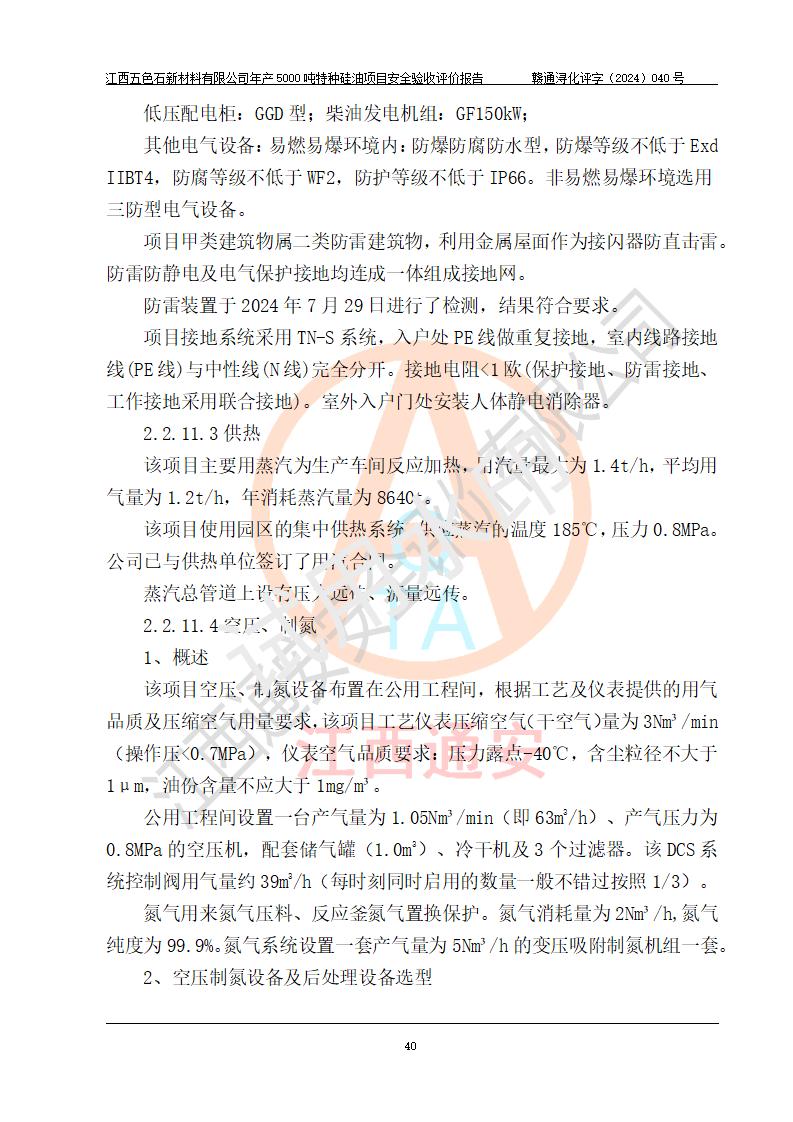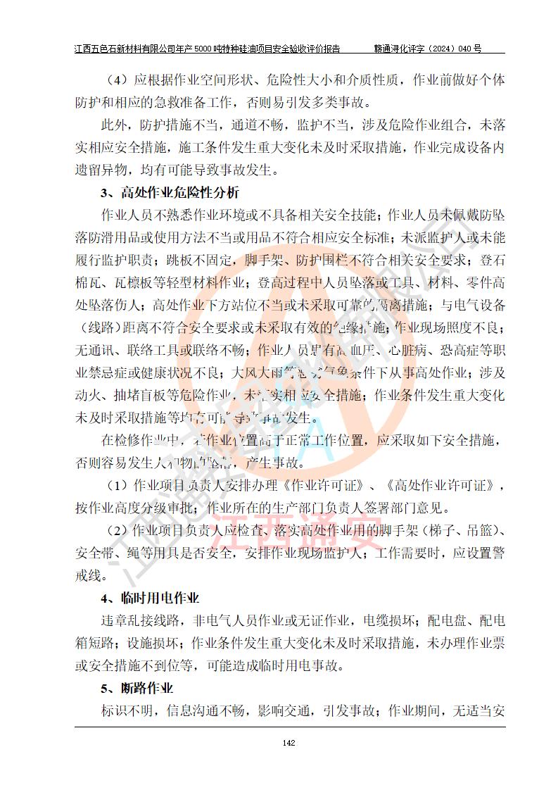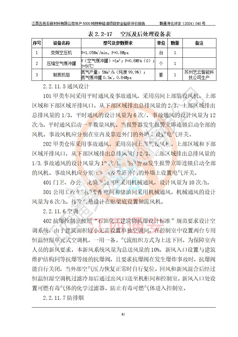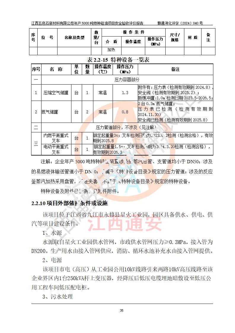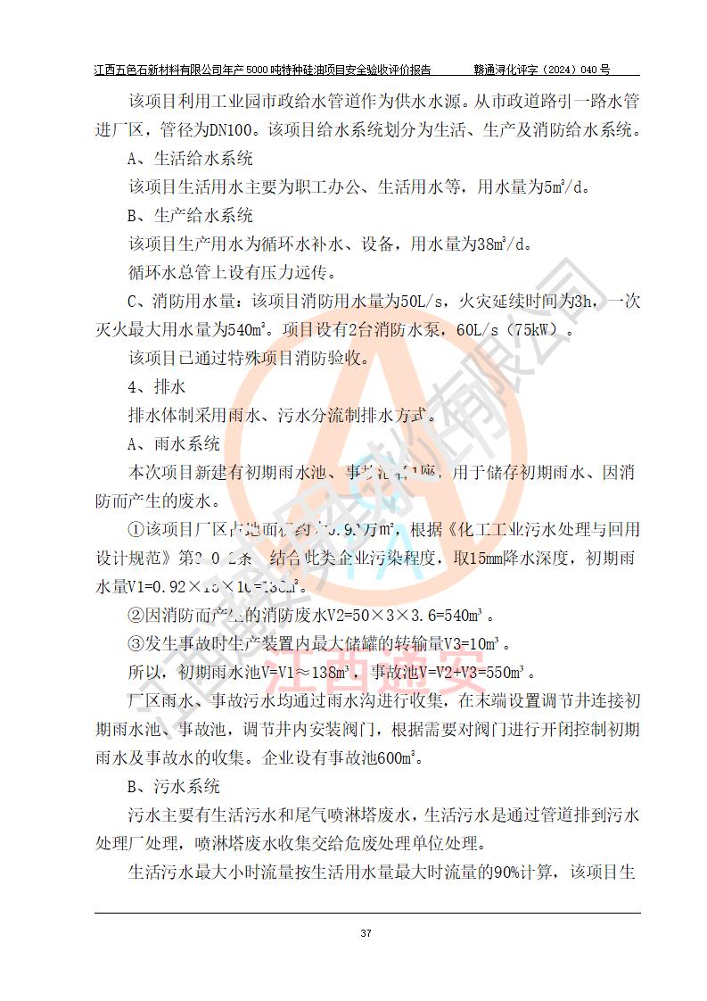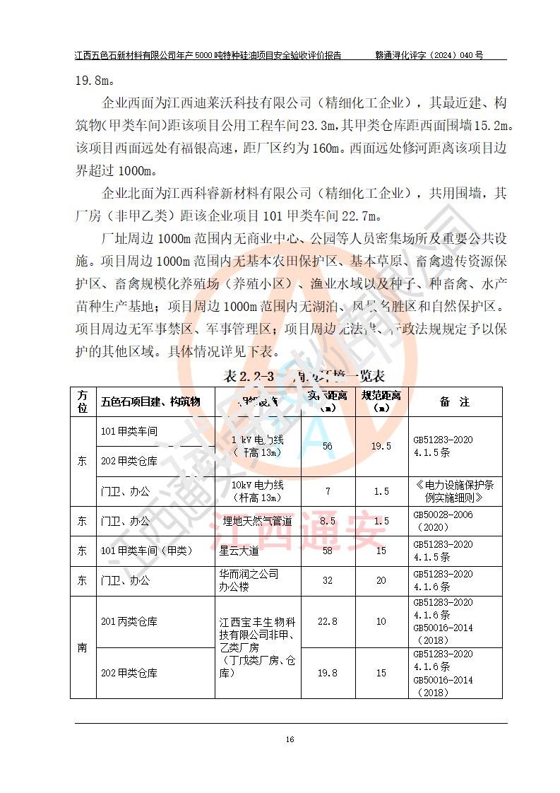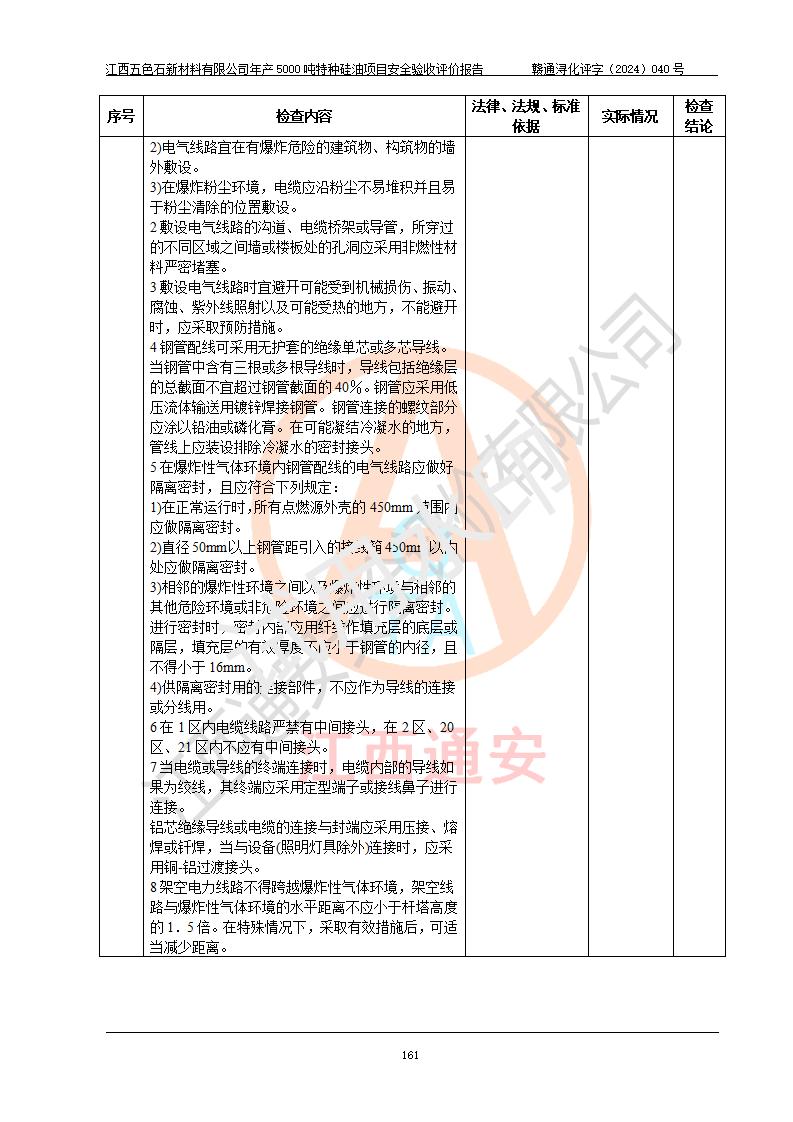 評(píng)價(jià)結(jié)論 | 江西五色石新材料有限公司年產(chǎn)5000噸特種硅油項(xiàng)目總平面布置、現(xiàn)場(chǎng)設(shè)備布置情況與設(shè)計(jì)圖紙一致,本次項(xiàng)目不涉及重點(diǎn)監(jiān)管的危險(xiǎn)化學(xué)品、危險(xiǎn)工藝、重大危險(xiǎn)源,按設(shè)計(jì)要求,設(shè)置有DCS系統(tǒng)、GDS系統(tǒng),符合《江西省應(yīng)急管理廳關(guān)于印發(fā)(試行)的通知 》、關(guān)于印發(fā)《九江市化工企業(yè)自動(dòng)化提升實(shí)施方案》的安全要求,符合《危險(xiǎn)化學(xué)品生產(chǎn)建設(shè)項(xiàng)目安全風(fēng)險(xiǎn)防控指南(試行)》規(guī)定竣工驗(yàn)收的安全條件;企業(yè)主要負(fù)責(zé)人、安全管理部門負(fù)責(zé)人均為化學(xué)、化工相關(guān)專業(yè),且有3年以上化工行業(yè)從業(yè)經(jīng)歷,企業(yè)主要負(fù)責(zé)人及安全管理人員已取得危險(xiǎn)化學(xué)品企業(yè)主要負(fù)責(zé)人及安全管理人員考核合格證。項(xiàng)目選擇的工藝過程及設(shè)備設(shè)施的安全可靠性能達(dá)到 **法規(guī)、標(biāo)準(zhǔn)規(guī)定要求。 項(xiàng)目運(yùn)行后存在的主要危險(xiǎn)、有害因素有:火災(zāi)、其他爆炸、容器爆炸、中毒與窒息等;存在的主要有害因素有高溫、化學(xué)物質(zhì)危害等;針對(duì)存在的危險(xiǎn)、有害因素,企業(yè)采取了**的安全技術(shù)措施及安全管理措施,符合**有關(guān)法規(guī)、標(biāo)準(zhǔn)、規(guī)范要求;項(xiàng)目風(fēng)險(xiǎn)可控,其安全生產(chǎn)條件和安全管理 方面具備竣工安全驗(yàn)收的條件。 | ||||