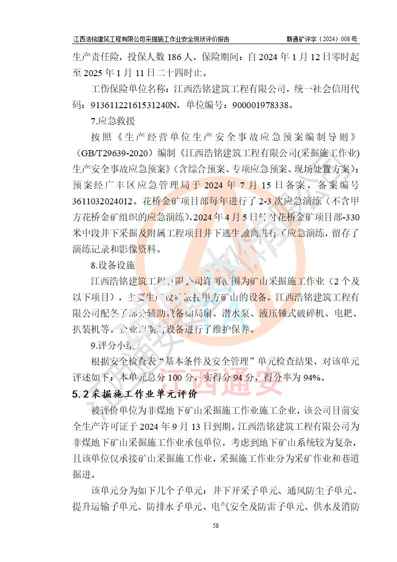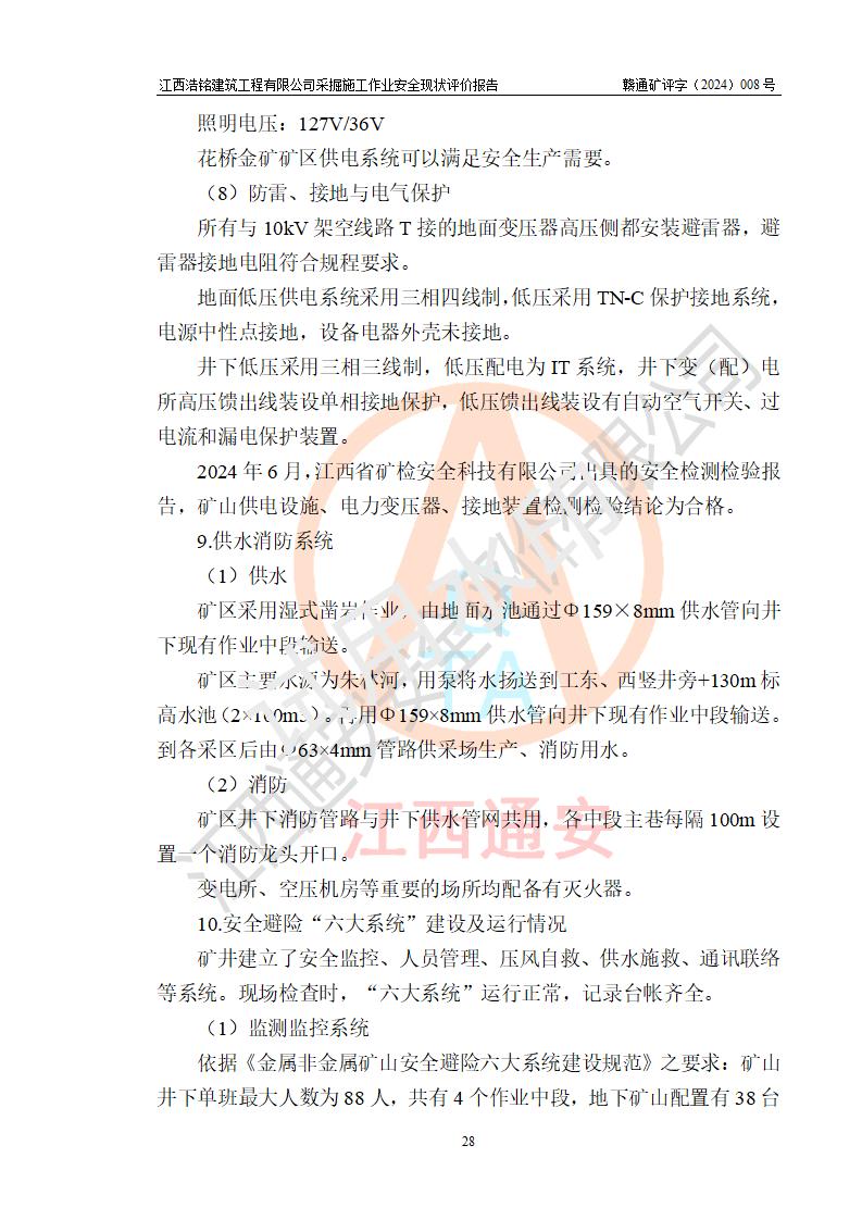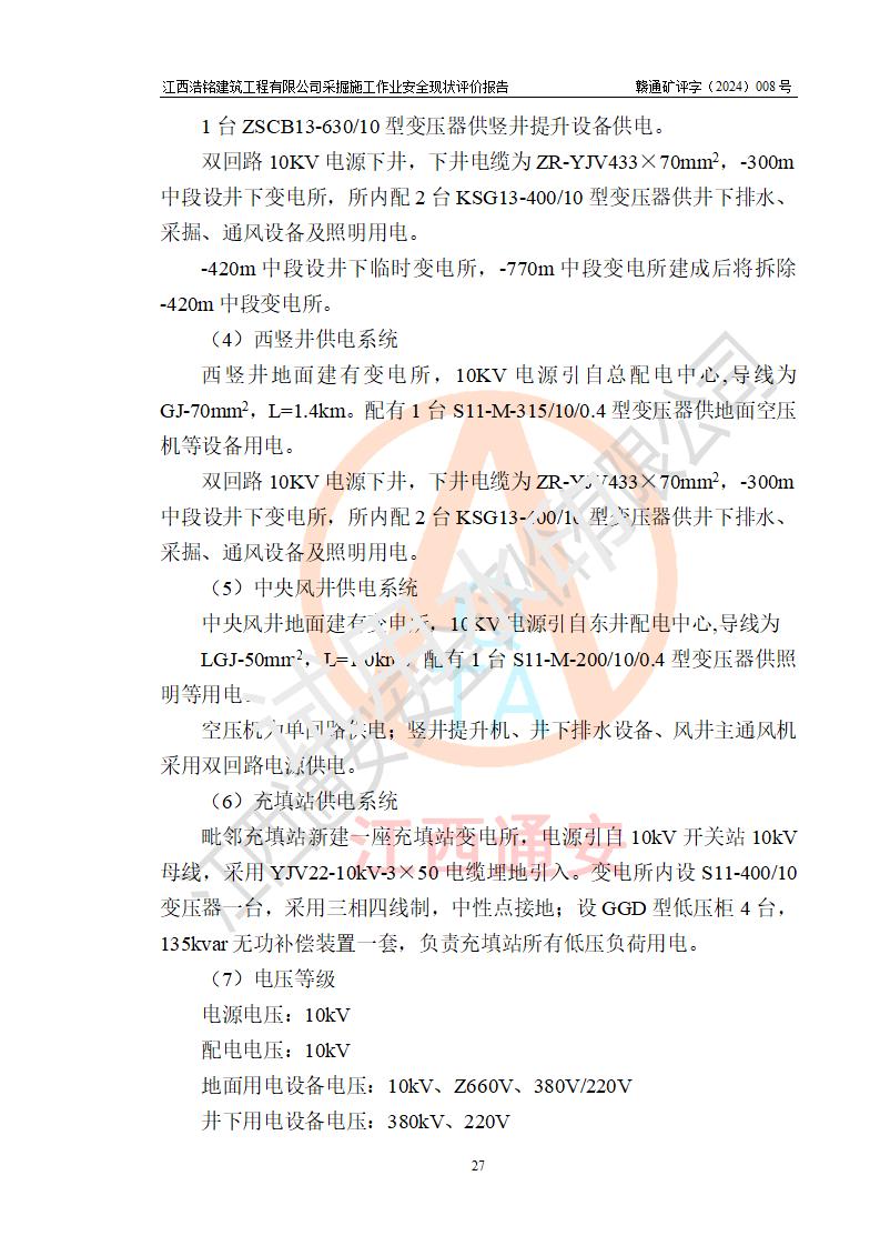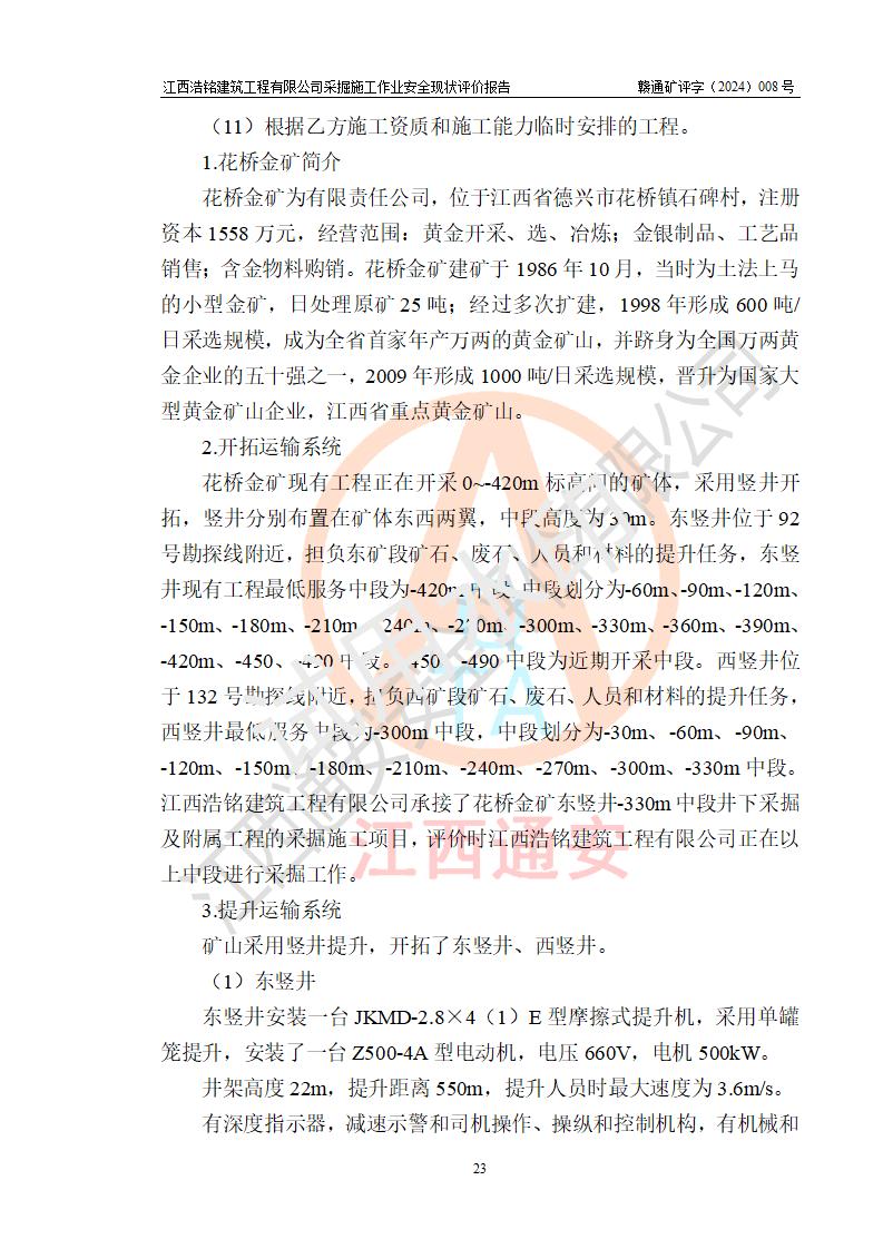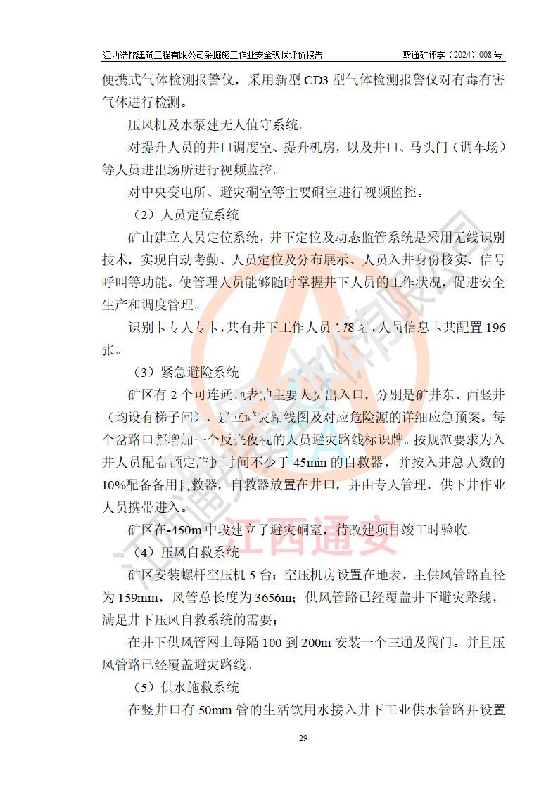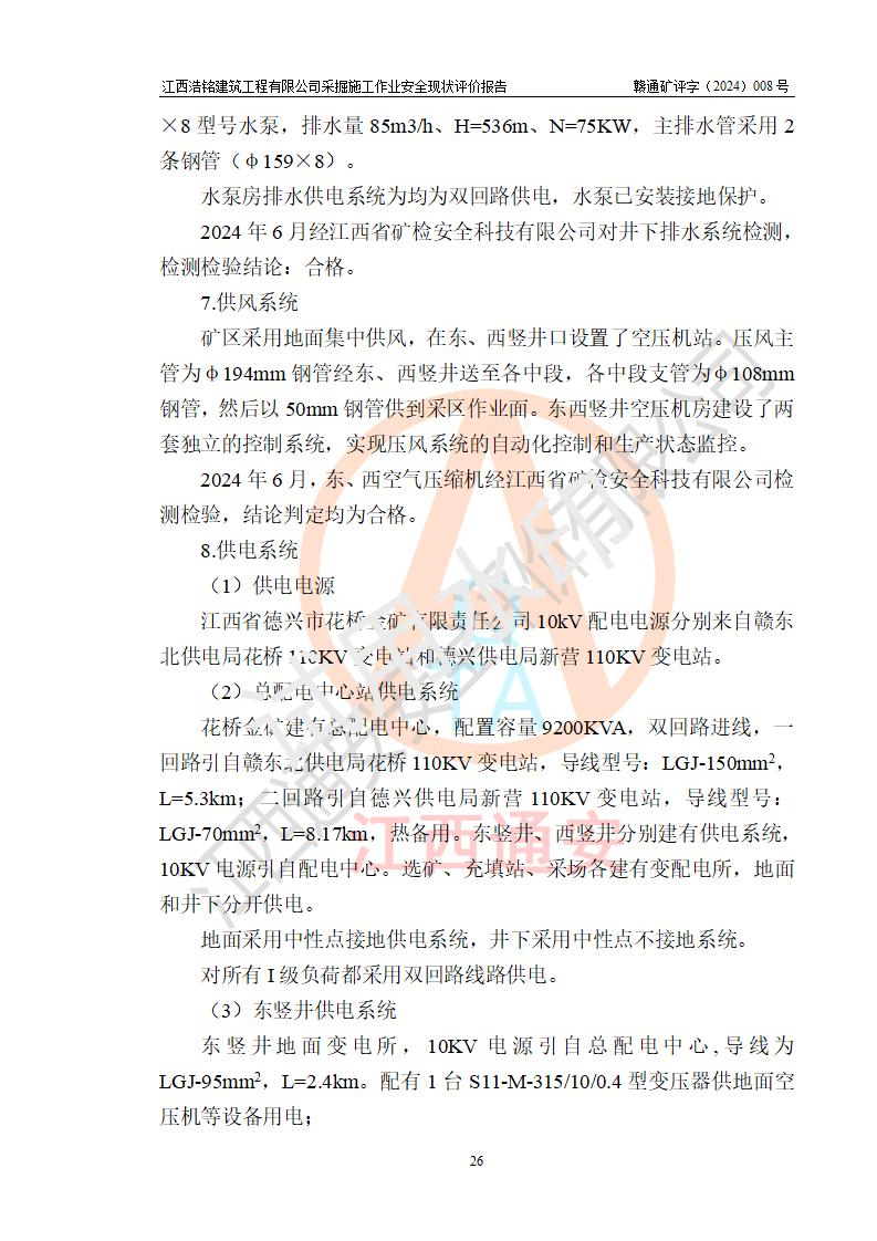 項(xiàng)目簡(jiǎn)介 | 江西浩銘建筑工程有限公司辦理采掘施工作業(yè)安全生產(chǎn)許可證主要針對(duì)金屬非金屬礦山采掘施工作業(yè)(無(wú)爆破),公司依據(jù)有關(guān)規(guī)定與江西省德興市花橋金礦有限責(zé)任公司(以下簡(jiǎn)稱“花橋金礦”)簽訂了采掘施工協(xié)議,目前正在開(kāi)展花橋金礦地下采掘施工項(xiàng)目。 1.花橋金礦簡(jiǎn)介 花橋金礦為有限責(zé)任公司,位于江西省德興市花橋鎮(zhèn)石碑村,注冊(cè)資本1558萬(wàn)元,經(jīng)營(yíng)范圍:黃金開(kāi)采、選、冶煉;金銀制品、工藝品銷售;含金物料購(gòu)銷。花橋金礦建礦于1986年10月,當(dāng)時(shí)為土法上馬的小型金礦,日處理原礦25噸;經(jīng)過(guò)多次擴(kuò)建,1998年形成600噸/日采選規(guī)模,成為**首家年產(chǎn)萬(wàn)兩的黃金礦山,并躋身為**萬(wàn)兩黃金企業(yè)的五十強(qiáng)之一,2009年形成1000噸/日采選規(guī)模,晉升為**大型黃金礦山企業(yè),江西省重點(diǎn)黃金礦山。 2.開(kāi)拓運(yùn)輸系統(tǒng) 花橋金礦現(xiàn)有工程正在開(kāi)采0~-420m標(biāo)高間的礦體,采用豎井開(kāi)拓,豎井分別布置在礦體東西兩翼,中段**為30m。東豎井位于92號(hào)勘探線附近,擔(dān)負(fù)東礦段礦石、廢石、人員和材料的提升任務(wù),東豎井現(xiàn)有工程*低服務(wù)中段為-420m中段,中段劃分為-60m、-90m、-120m、-150m、-180m、-210m、-240m、-270m、-300m、-330m、-360m、-390m、-420m、-450、-490中段。-450、-490中段為近期開(kāi)采中段。西豎井位于132號(hào)勘探線附近,擔(dān)負(fù)西礦段礦石、廢石、人員和材料的提升任務(wù),西豎井*低服務(wù)中段為-300m中段,中段劃分為-30m、-60m、-90m、-120m、-150m、-180m、-210m、-240m、-270m、-300m、-330m中段。江西浩銘建筑工程有限公司承接了花橋金礦東豎井-120m、-240m、-330m中段及西豎井-90m、-180m、-210m中段的采掘施工項(xiàng)目,評(píng)價(jià)時(shí)江西浩銘建筑工程有限公司正在以上中段進(jìn)行采掘工作。 東、西豎井所有中段內(nèi)采用電機(jī)車運(yùn)輸,東、西礦段各中段采出礦石通過(guò)采場(chǎng)溜井下放至0.75m3礦車。礦石和廢石(其中部分廢石充填采空區(qū))在各中段裝礦點(diǎn)裝車后由電機(jī)車牽引至東、西井井底車場(chǎng),再由罐籠提升至地表。東、西豎井提升出礦石采用3t電機(jī)車牽引礦車直接運(yùn)往選廠礦倉(cāng),廢石經(jīng)運(yùn)廢石平硐由人工分別運(yùn)卸至東、西廢石場(chǎng)。 4.通風(fēng)系統(tǒng) 礦井采用中央抽出式,機(jī)械通風(fēng)。 (1)通風(fēng)線路:(新風(fēng))東、西豎井口進(jìn)風(fēng)—各中段主運(yùn)輸巷道—各中段作業(yè)點(diǎn)—(廢風(fēng))各中段回風(fēng)巷道—風(fēng)井—主扇—地表;通風(fēng)困難的采場(chǎng)及掘進(jìn)工作面由局扇輔助通風(fēng)。 (2)通風(fēng)設(shè)施:主扇:FBCDZ型,電機(jī)功率2*160kw。;風(fēng)量:155520-372240m3/h,風(fēng)壓680-3004Pa。 局扇:JK58-1N0.4型:功率:5.5kw,風(fēng)量:2.2~3.5m3/min,風(fēng)壓:1648~1020Pa。 2024年6月經(jīng)江西省礦檢安全科技有限公司檢測(cè)合格。 5.除塵 礦井堅(jiān)持濕式作業(yè),具有較完善的供水系統(tǒng)。 6.防排水系統(tǒng) 礦山防排水由地表防排水和井下排水兩大部份組成。 (1)地表防排水 在地表設(shè)置了排水溝渠排水,防止地表水滲入井下。 (2)井下排水 井下排水系統(tǒng)分東豎井排水系統(tǒng)和西豎井排水系統(tǒng) 1)東豎井采用2級(jí)排水系統(tǒng),在-300m中段、-420m中段分別建有排水系統(tǒng),-420m水倉(cāng)水排至-300m水倉(cāng),-300m水倉(cāng)水排至地面。 -420m中段有2條水倉(cāng),水倉(cāng)總?cè)莘e420m3,泵房配有2臺(tái)125D-25×8型號(hào)水泵,排水量101m3/h、H=200m、N=75KW,主排水管采用2條鋼管(φ159×8)。由于正在進(jìn)行基建的深部開(kāi)拓,井底泵站下移至-770m中段(泵房正在建設(shè)過(guò)程中),-420m中段泵站現(xiàn)在作為臨時(shí)泵站,-770m中段泵站建成后將拆除-420m中段泵站。 -300m中段有2條水倉(cāng),水倉(cāng)總?cè)莘e460m3,泵房配有3臺(tái)D85-67×8型號(hào)水泵,排水量85m3/h、H=536m、N=75Kw,主排水管采用2條鋼管(φ159×8)。 2)西豎井采用**排水,在-300m(*低中段)建有排水系統(tǒng),直排地面。 -300m中段有2條水倉(cāng),水倉(cāng)總?cè)莘e460m3,泵房配有3臺(tái)D85-67×8型號(hào)水泵,排水量85m3/h、H=536m、N=75KW,主排水管采用2條鋼管(φ159×8)。 水泵房排水供電系統(tǒng)為均為雙回路供電,水泵已安裝接地保護(hù)。 2024年6月經(jīng)江西省礦檢安全科技有限公司對(duì)井下排水系統(tǒng)檢測(cè),檢測(cè)檢驗(yàn)結(jié)論:合格。 7.供風(fēng)系統(tǒng) 礦區(qū)采用地面集中供風(fēng),在東、西豎井口設(shè)置了空壓機(jī)站。壓風(fēng)主管為φ194mm鋼管經(jīng)東、西豎井送至各中段,各中段支管為φ108mm鋼管,然后以50mm鋼管供到采區(qū)作業(yè)面。東西豎井空壓機(jī)房建設(shè)了兩套獨(dú)立的控制系統(tǒng),實(shí)現(xiàn)壓風(fēng)系統(tǒng)的自動(dòng)化控制和生產(chǎn)狀態(tài)監(jiān)控。 2024年6月,東、西空氣壓縮機(jī)經(jīng)江西省礦檢安全科技有限公司檢測(cè)檢驗(yàn),結(jié)論判定均為合格。 | |||||