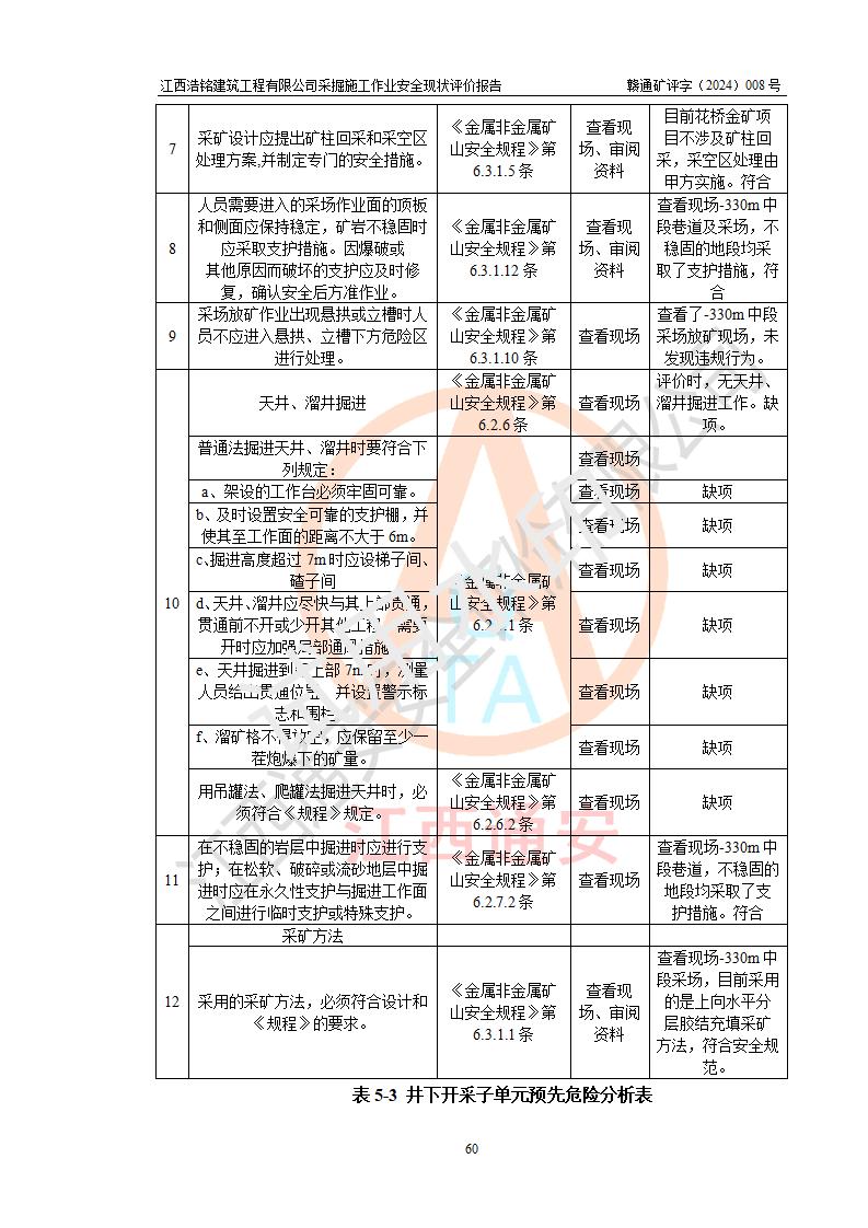 勘察現(xiàn)場(chǎng)發(fā)現(xiàn)的問(wèn)題及安全對(duì)策措施 | 序號(hào)問(wèn)題對(duì)策1-330m中段礦石/廢石溜井增設(shè)安全警示標(biāo)識(shí)。及時(shí)增設(shè)安全警示標(biāo)識(shí)。2-330m中段108進(jìn)路未設(shè)照明,頂板存在部分浮石未及時(shí)清理。增設(shè)應(yīng)急照明與清理浮石。