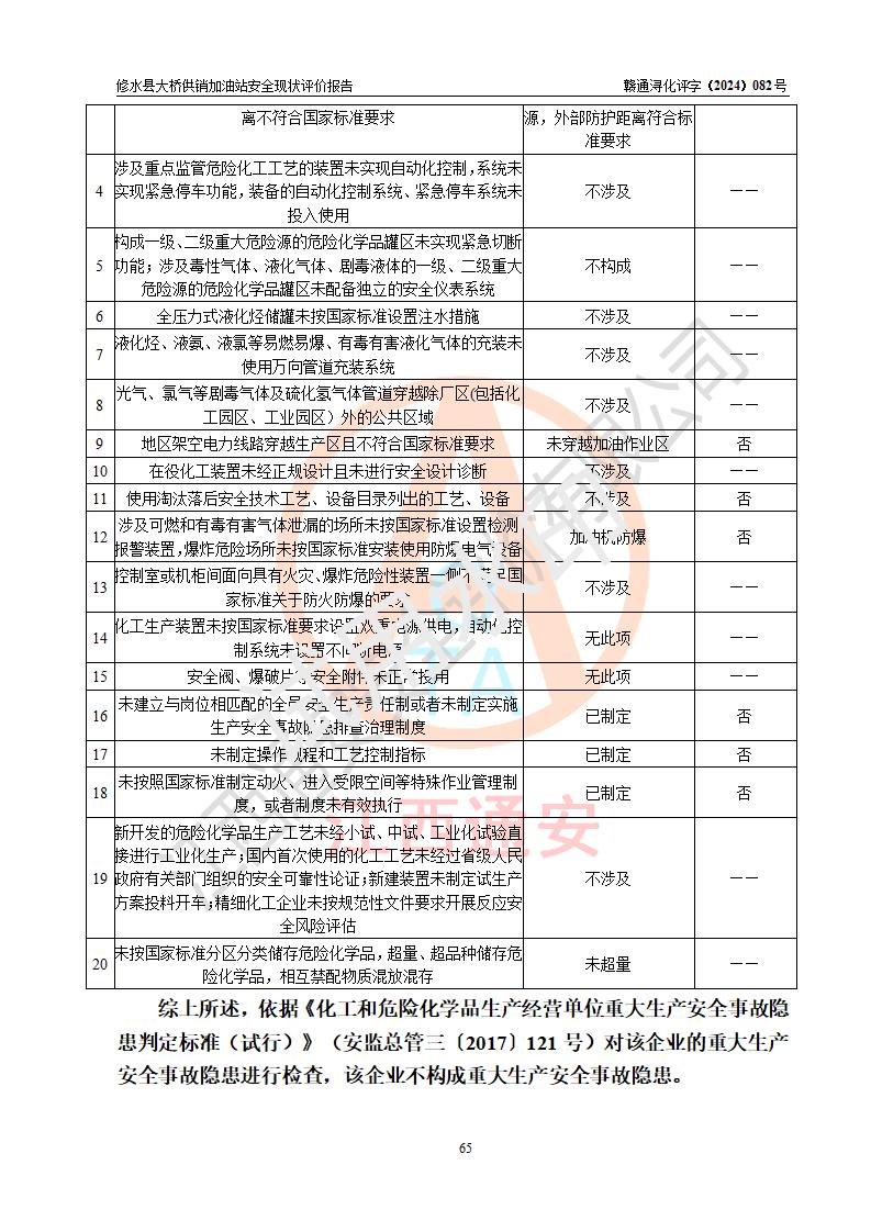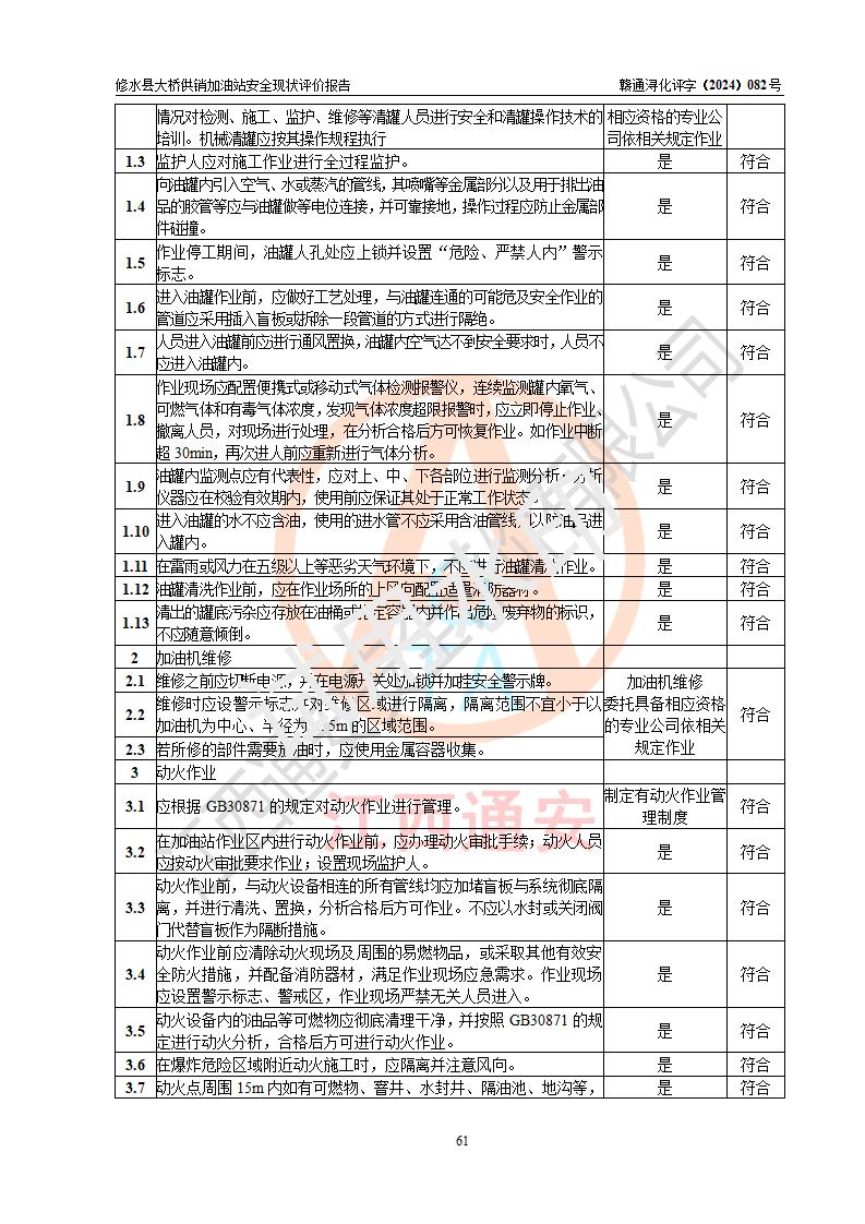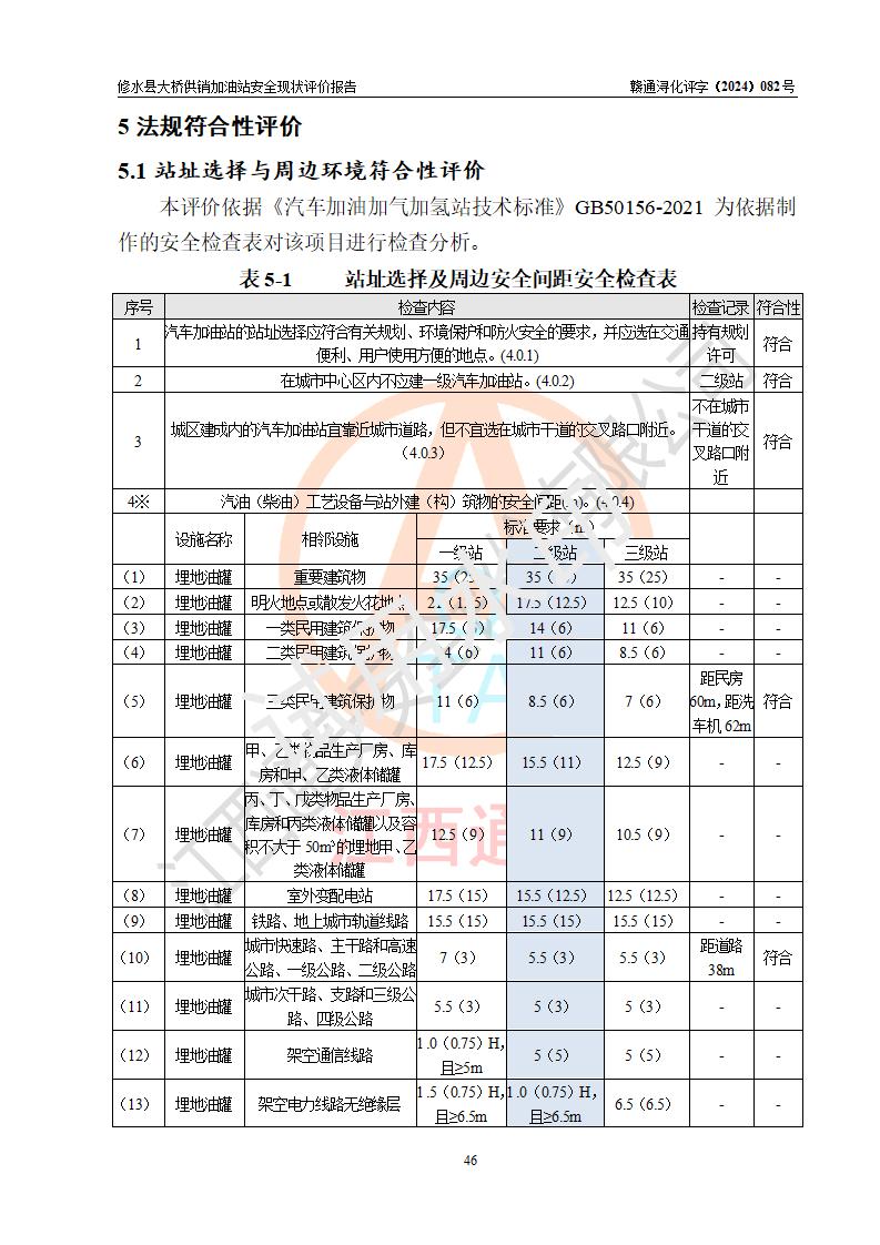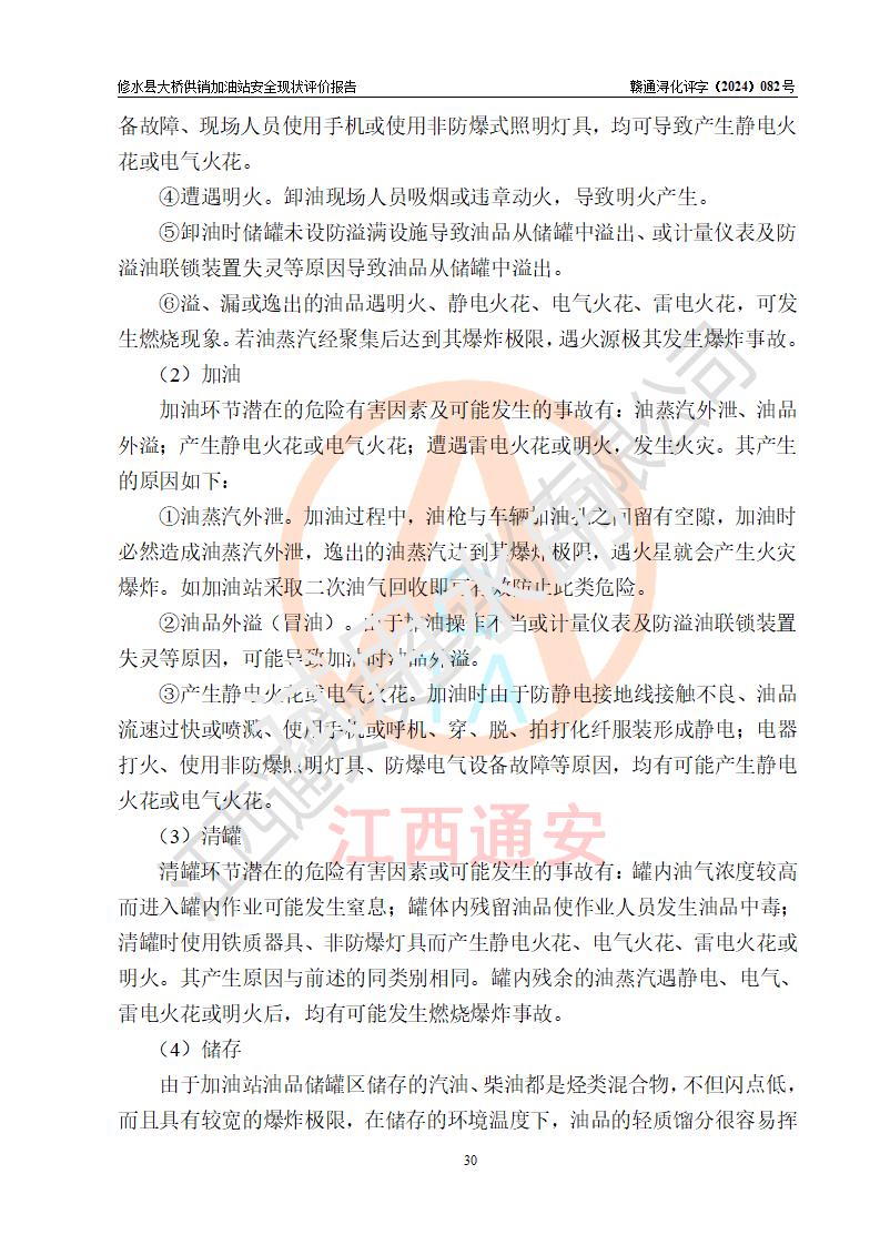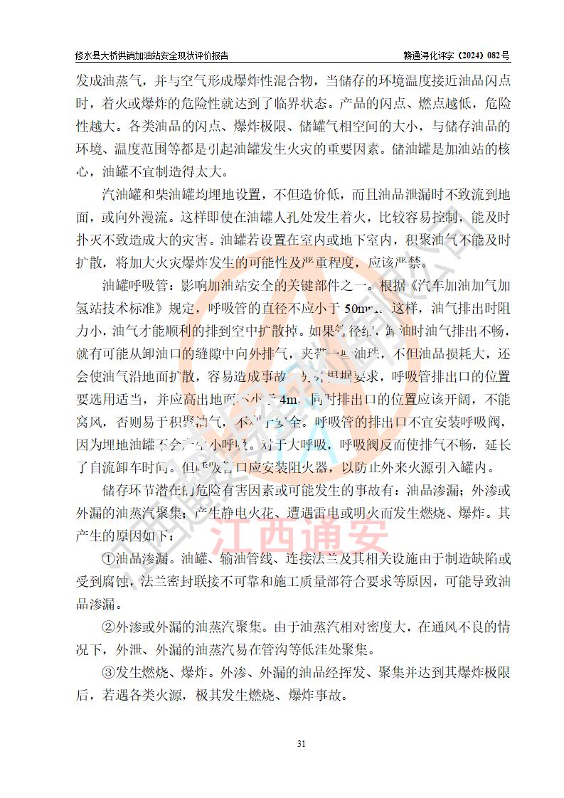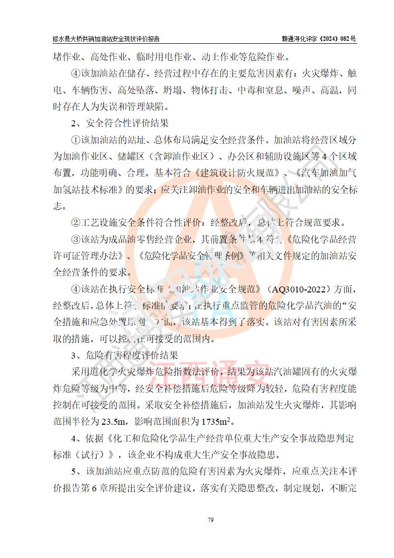 評價(jià)結(jié)論 | 修水縣大橋供銷加油站涉及的安全條件、安全經(jīng)營條件、安全生產(chǎn)管理符合《危險(xiǎn)化學(xué)品經(jīng)營許可證管理辦法》、《汽車加油加氣加氫站技術(shù)標(biāo)準(zhǔn)》等**有關(guān)法規(guī)、標(biāo)準(zhǔn)、規(guī)范要求,能滿足危險(xiǎn)化學(xué)品經(jīng)營安全條件。 | |||