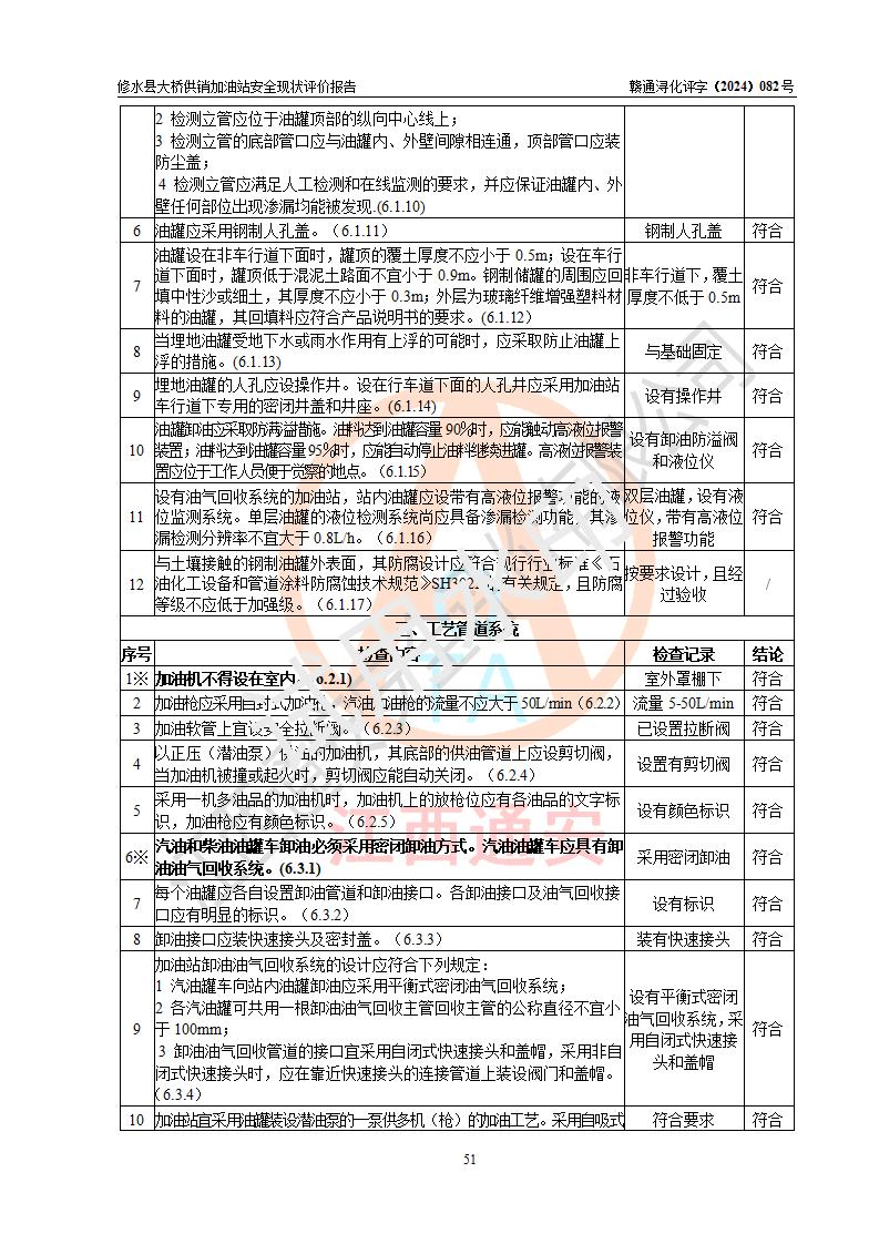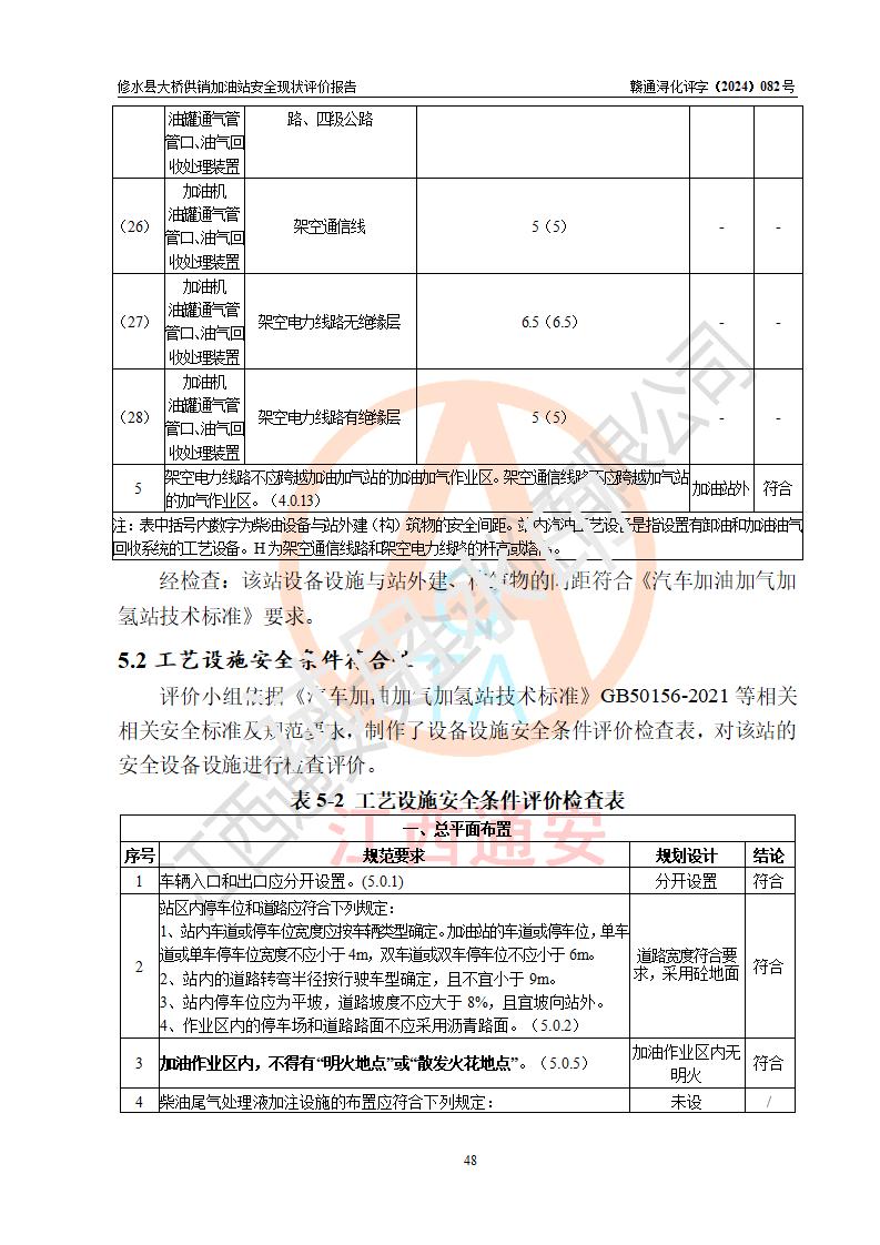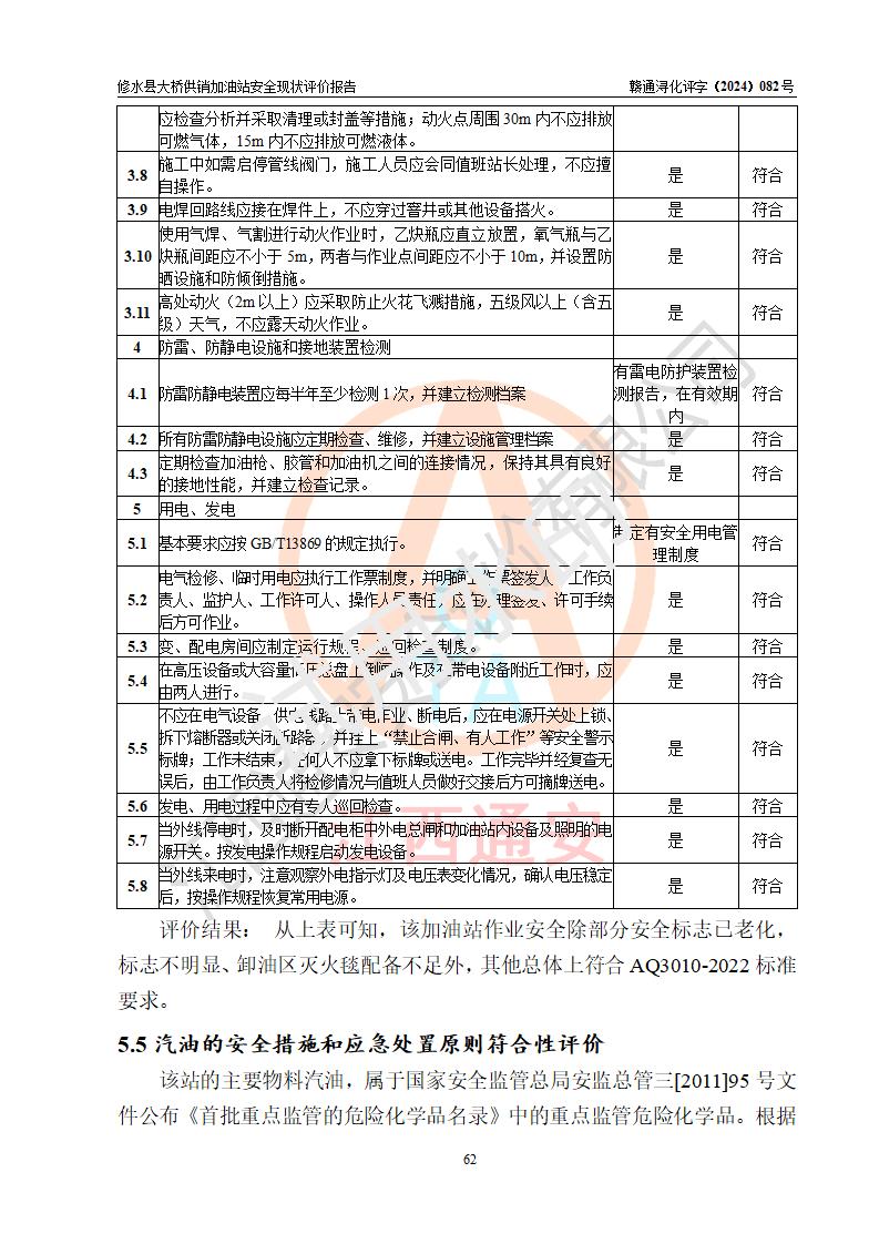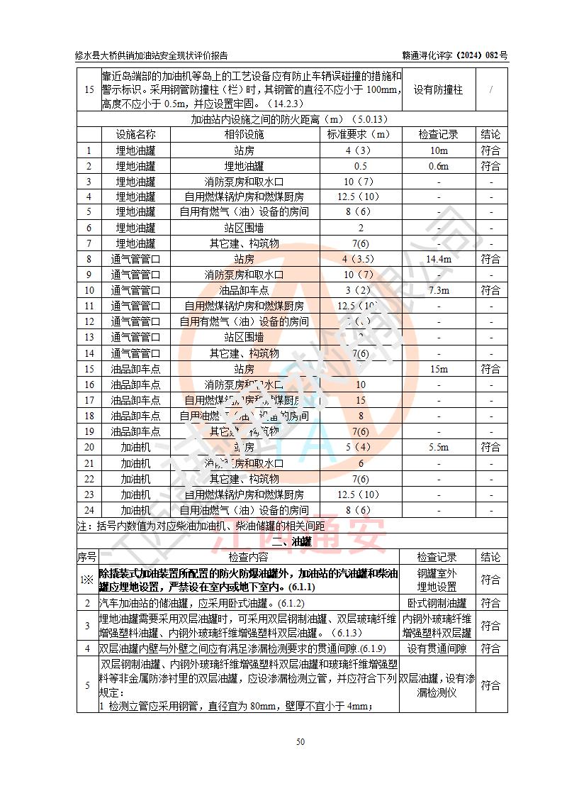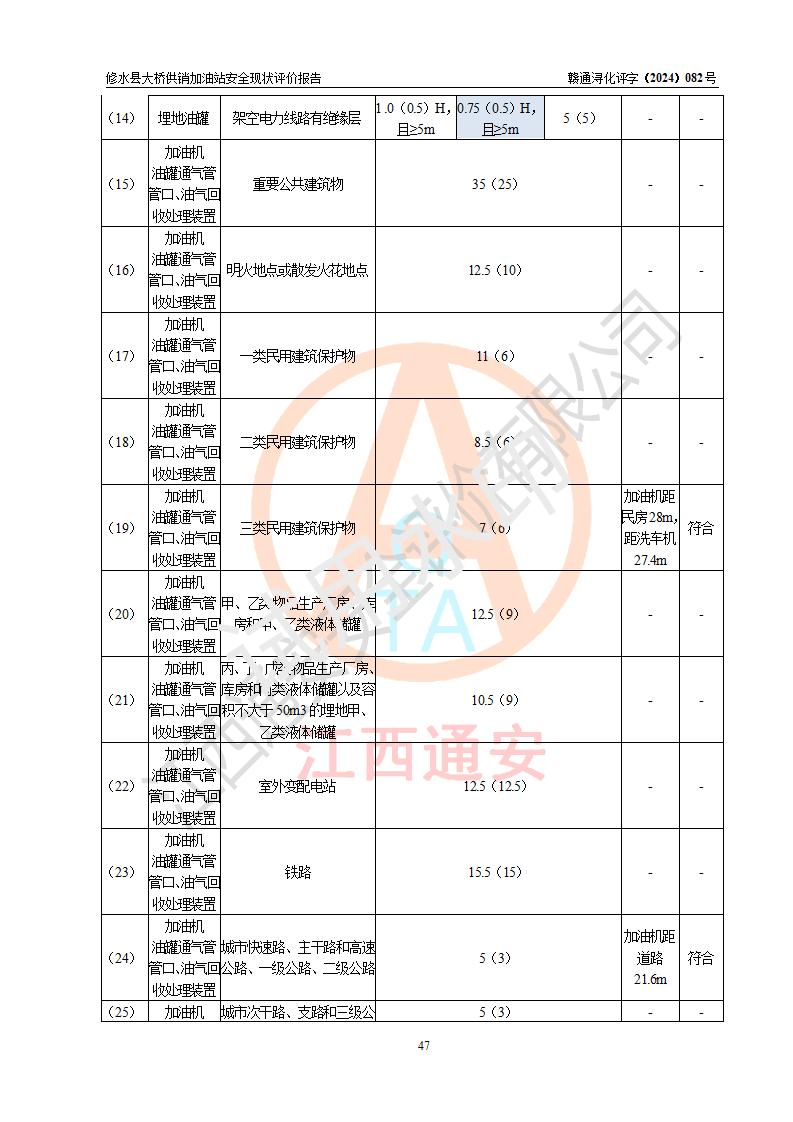 評價(jià)結(jié)論 | 修水縣大橋供銷加油站涉及的安全條件、安全經(jīng)營條件、安全生產(chǎn)管理符合《危險(xiǎn)化學(xué)品經(jīng)營許可證管理辦法》、《汽車加油加氣加氫站技術(shù)標(biāo)準(zhǔn)》等**有關(guān)法規(guī)、標(biāo)準(zhǔn)、規(guī)范要求,能滿足危險(xiǎn)化學(xué)品經(jīng)營安全條件。 | |||