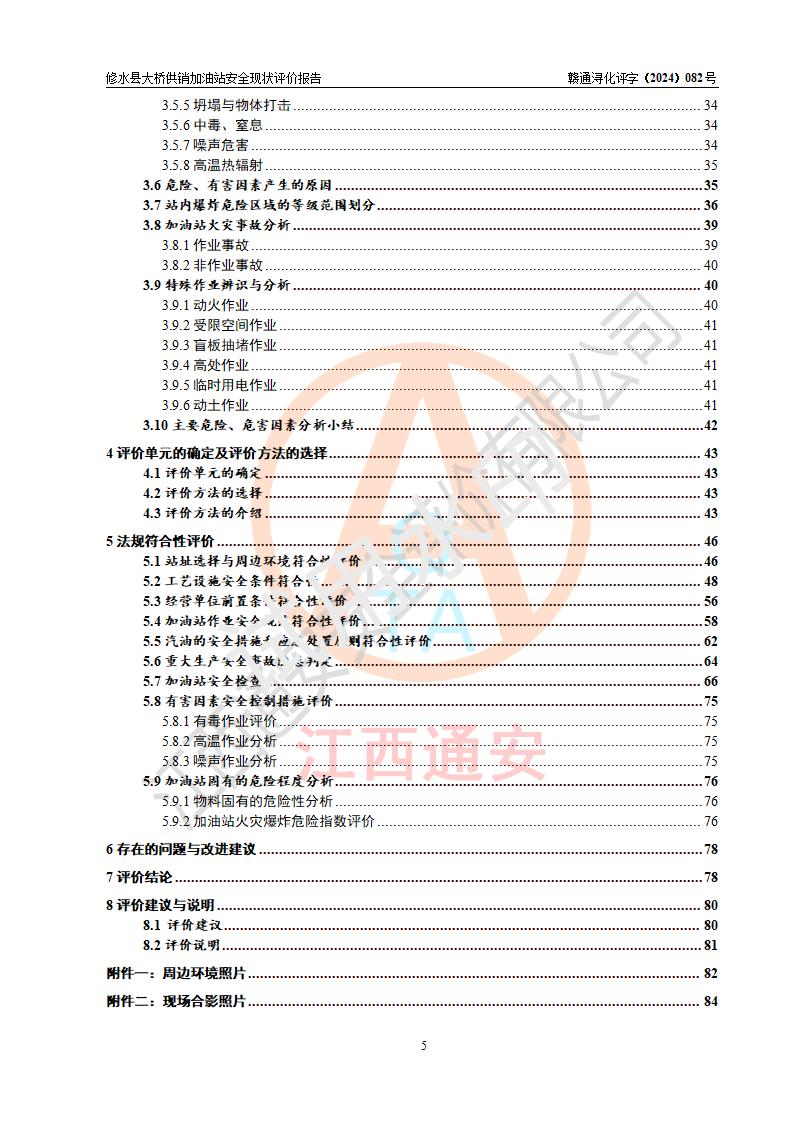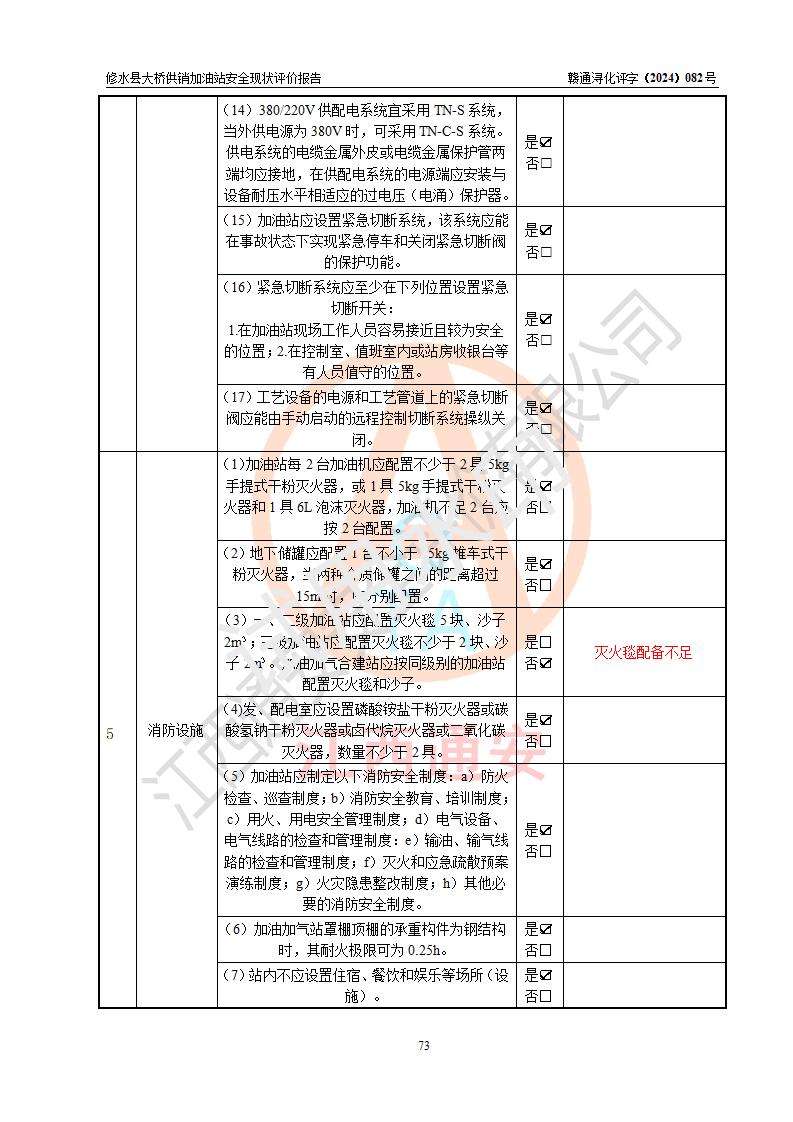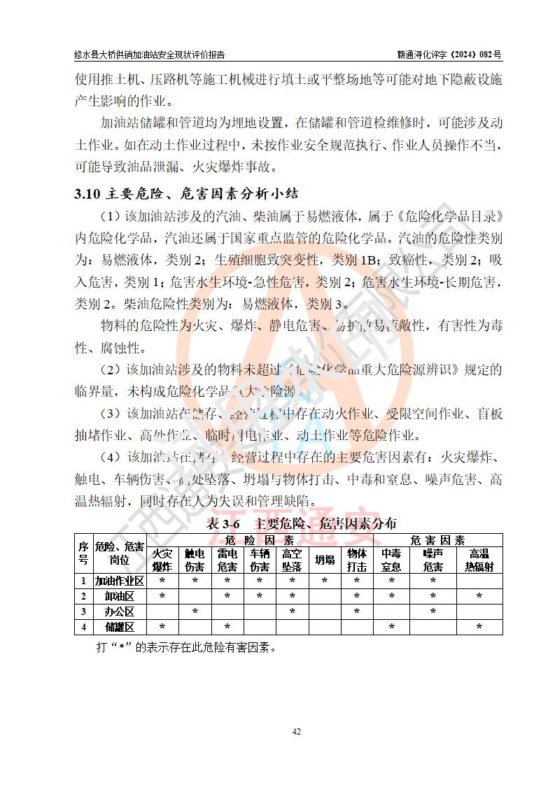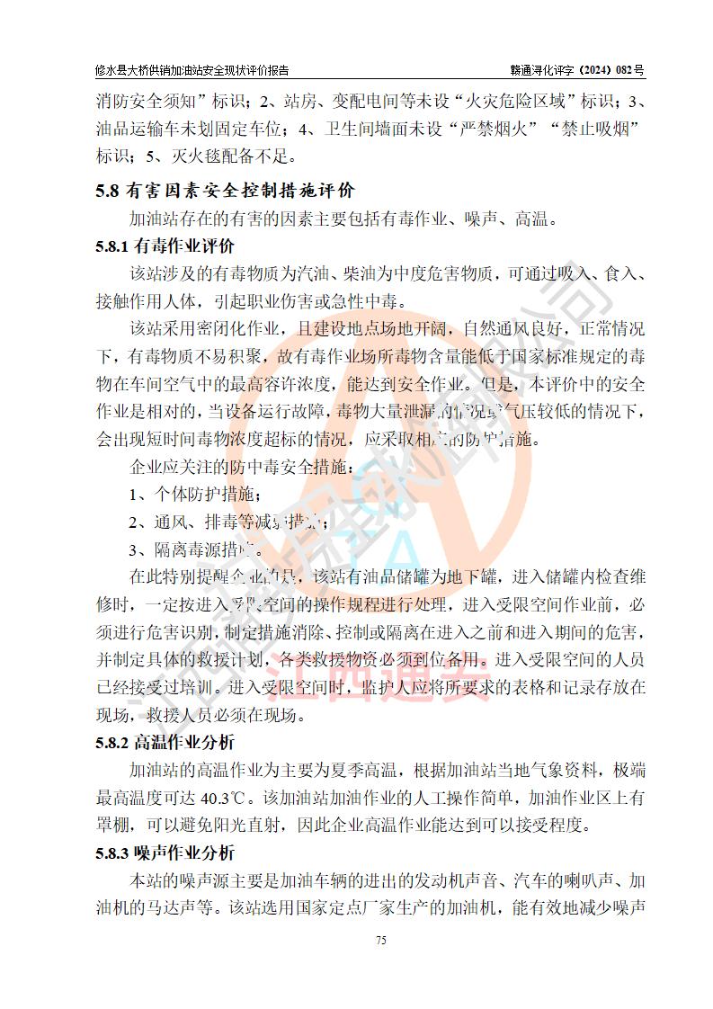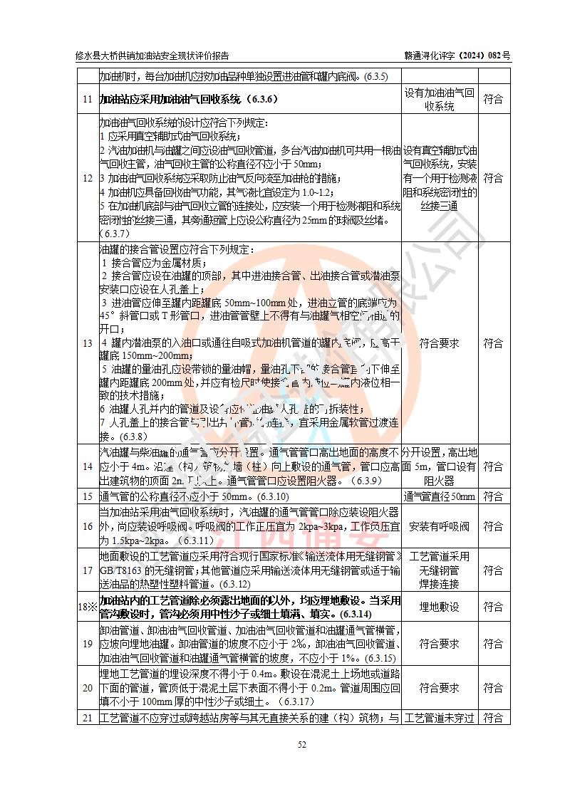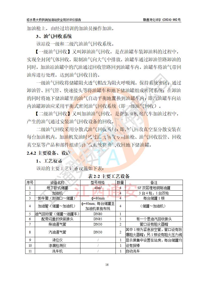 評價(jià)結(jié)論 | 修水縣大橋供銷加油站涉及的安全條件、安全經(jīng)營條件、安全生產(chǎn)管理符合《危險(xiǎn)化學(xué)品經(jīng)營許可證管理辦法》、《汽車加油加氣加氫站技術(shù)標(biāo)準(zhǔn)》等**有關(guān)法規(guī)、標(biāo)準(zhǔn)、規(guī)范要求,能滿足危險(xiǎn)化學(xué)品經(jīng)營安全條件。 | |||