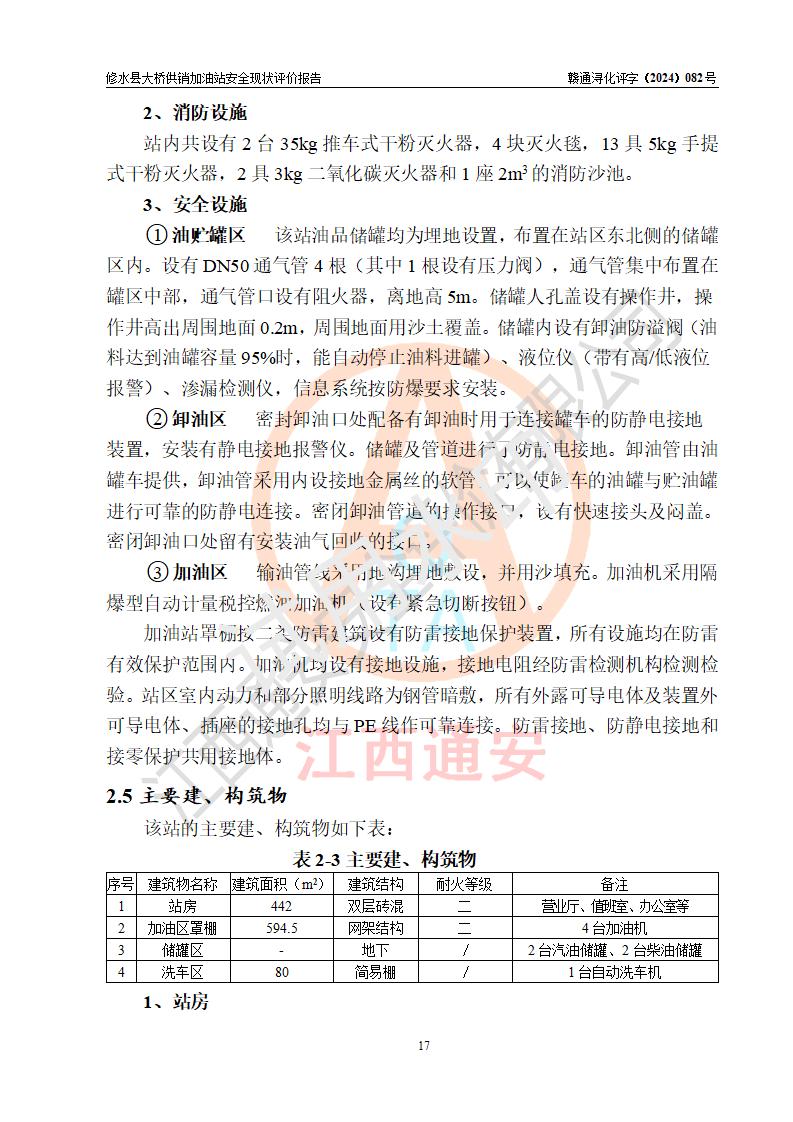 項(xiàng)目簡介 | 修水縣大橋供銷加油站是一家專門從事成品油零售經(jīng)營的個(gè)體工商戶,經(jīng)營場所位于江西省九江市修水縣柯龍省道修水縣大橋鎮(zhèn)朱溪村?,F(xiàn)有從業(yè)人員5名,其中安全管理人員1人,加油站負(fù)責(zé)人王華贊。 該加油站占地面積1833.4m2,站區(qū)內(nèi)設(shè)置有3臺四槍和1臺雙槍加油機(jī)及配套的工藝管線,設(shè)有SF雙層儲罐4臺,其中40m3的92#汽油儲罐1臺、40m3的95#汽油儲罐1臺、40m3的0#柴油儲罐2臺,油品儲罐總?cè)莘e為160m3(折算成汽油為120m3),按現(xiàn)行《汽車加油加氣加氫站技術(shù)標(biāo)準(zhǔn)》對加油站的等級劃分原則,屬二級加油站。 該站由九江市行政審批局換發(fā)《危險(xiǎn)化學(xué)品經(jīng)營許可證》(證號:贛九行審經(jīng)(甲)字[2021]000086號),**期限2021年11月26日至2024年11月25日。 | |||