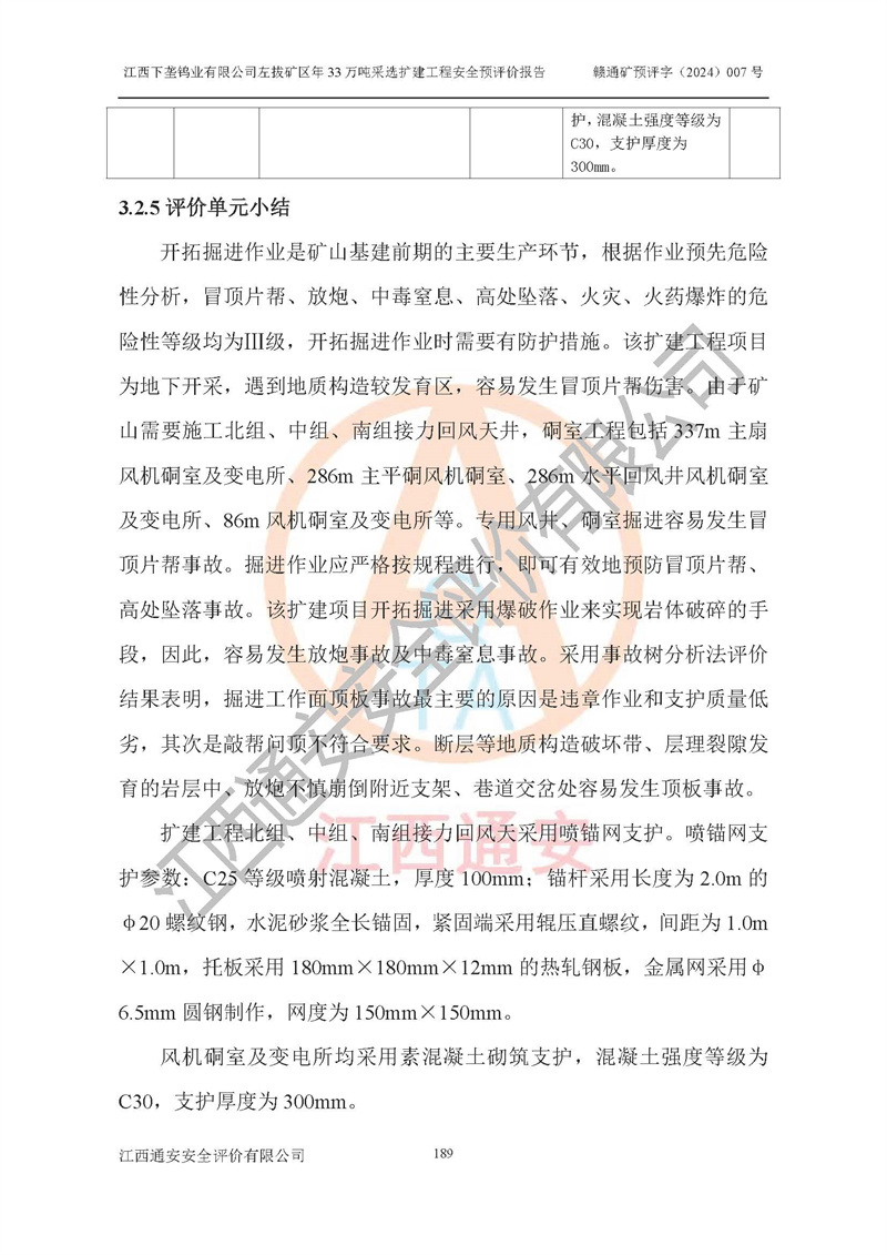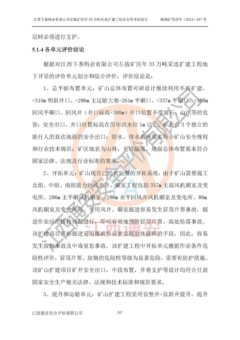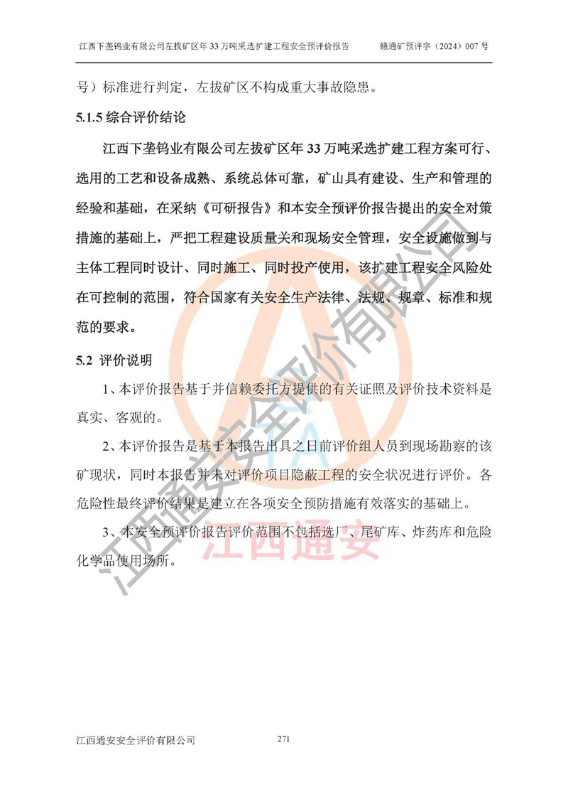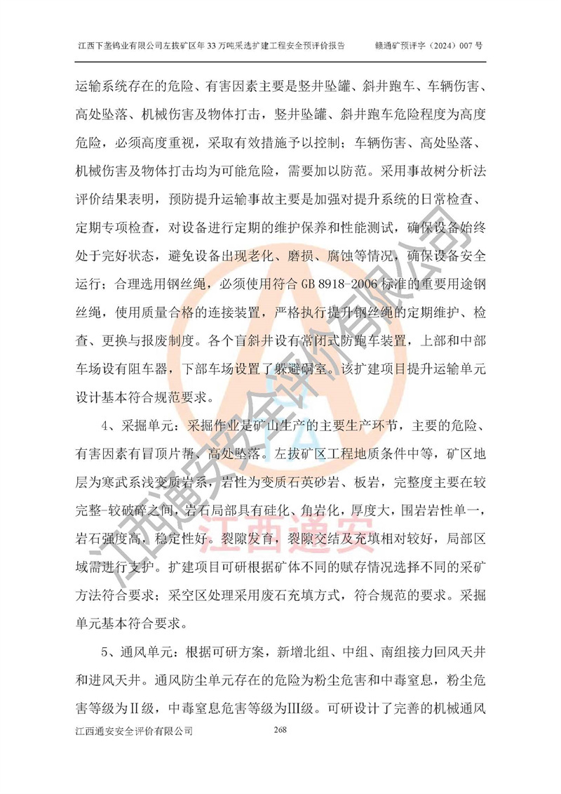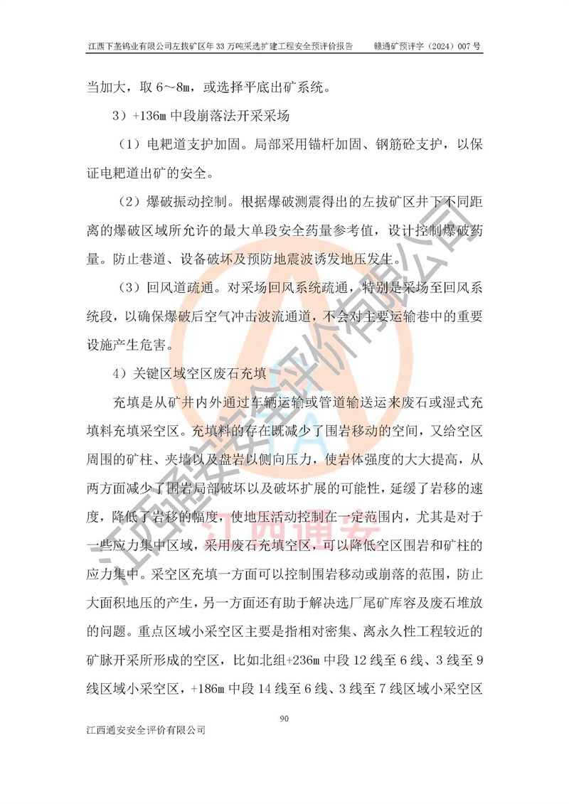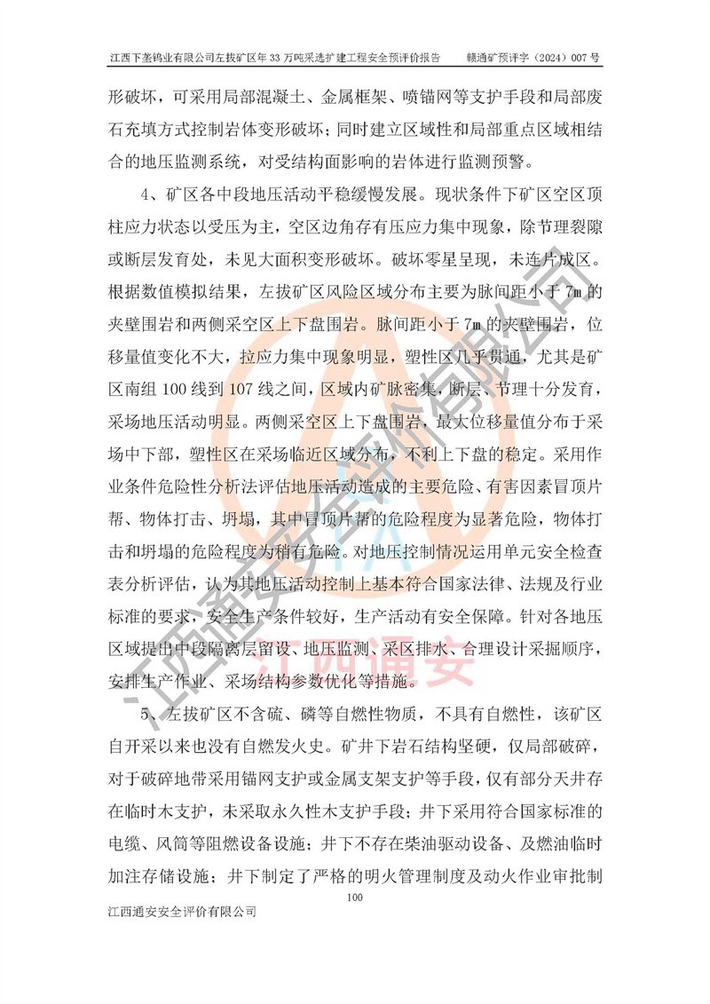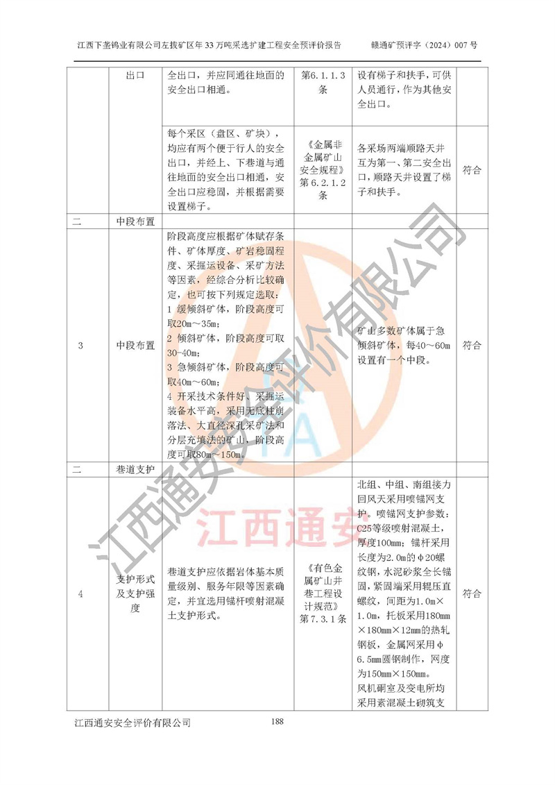 其它 | 江西下壟鎢業(yè)有限公司左拔礦區(qū)年33萬噸采選擴(kuò)建工程方案可行、選用的工藝和設(shè)備成熟、系統(tǒng)總體可靠,礦山具有建設(shè)、生產(chǎn)和管理的經(jīng)驗(yàn)和基礎(chǔ),在采納《可研報(bào)告》和本安全預(yù)評(píng)價(jià)報(bào)告提出的安全對(duì)策措施的基礎(chǔ)上,嚴(yán)把工程建設(shè)質(zhì)量關(guān)和現(xiàn)場(chǎng)安全管理,安全設(shè)施做到與主體工程同時(shí)設(shè)計(jì)、同時(shí)施工、同時(shí)投產(chǎn)使用,該擴(kuò)建工程安全風(fēng)險(xiǎn)處在可控制的范圍,符合**有關(guān)安全生產(chǎn)法律、法規(guī)、規(guī)章、標(biāo)準(zhǔn)和規(guī)范的要求。 | ||||