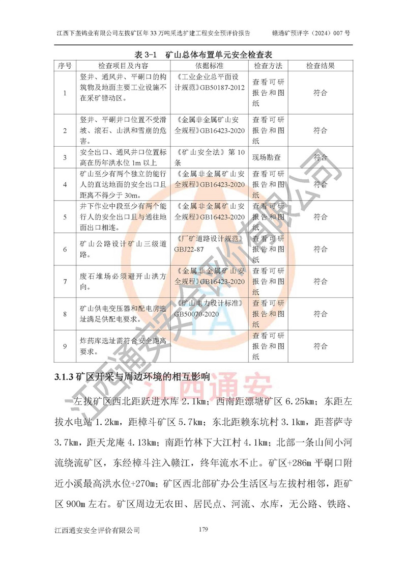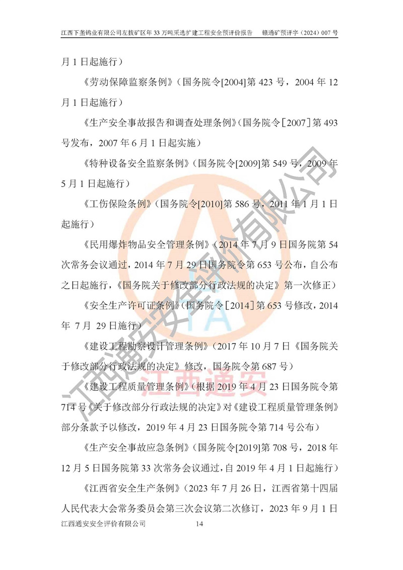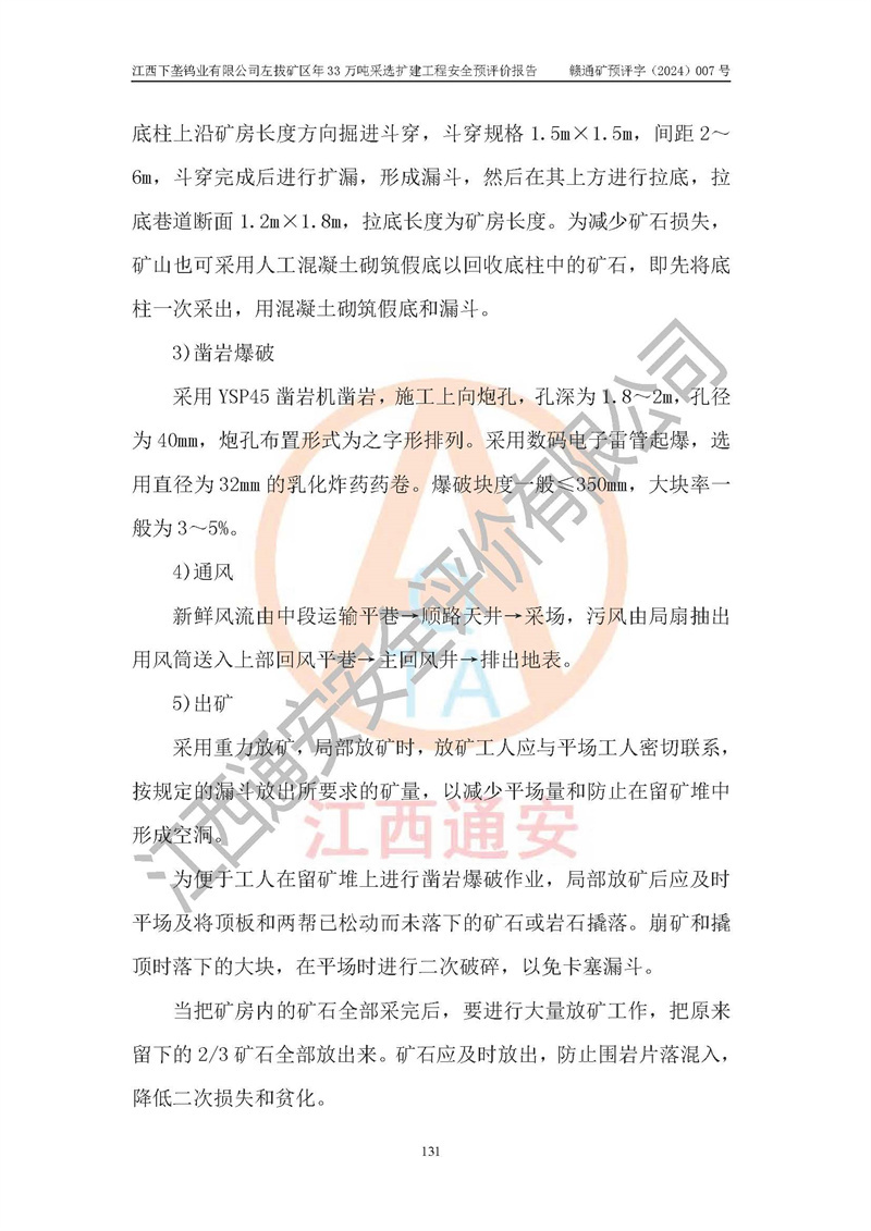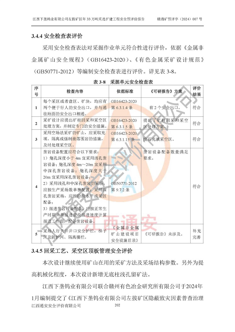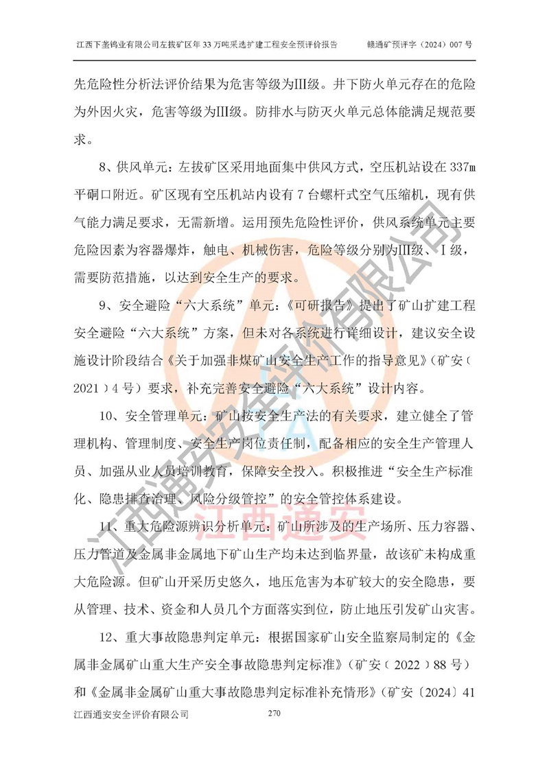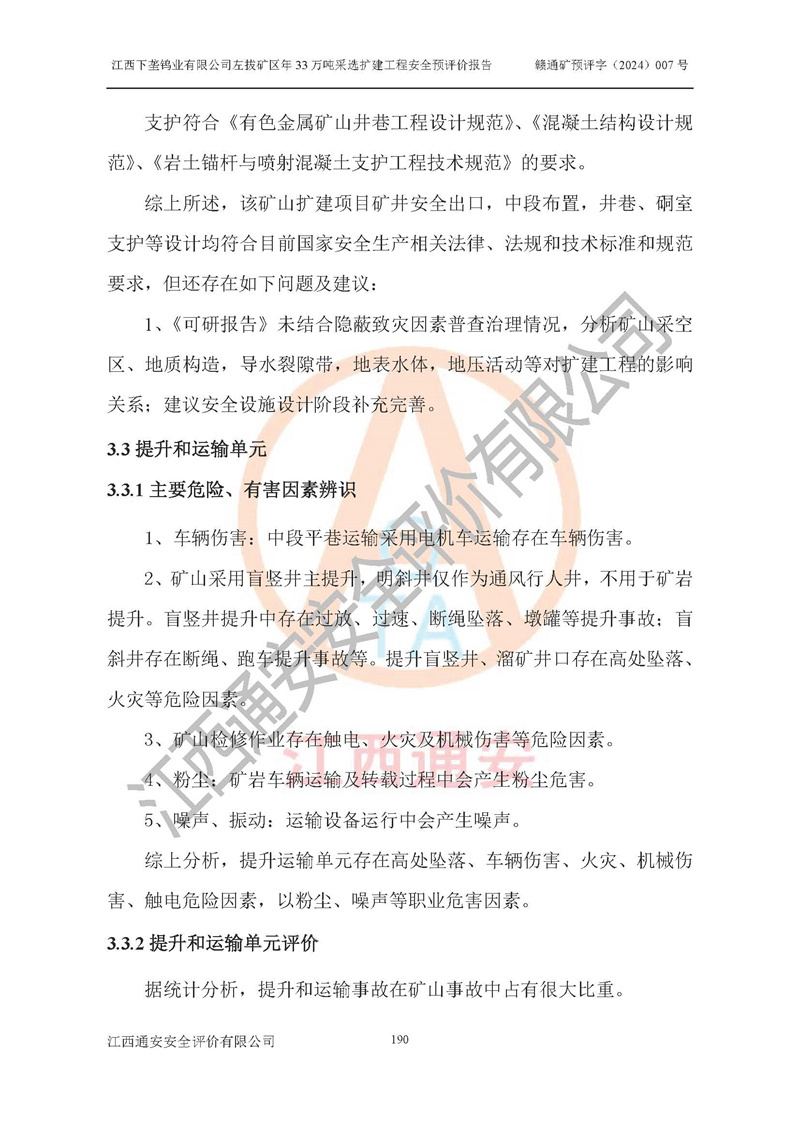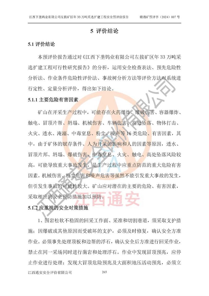 其它 | 江西下壟鎢業(yè)有限公司左拔礦區(qū)年33萬噸采選擴(kuò)建工程方案可行、選用的工藝和設(shè)備成熟、系統(tǒng)總體可靠,礦山具有建設(shè)、生產(chǎn)和管理的經(jīng)驗(yàn)和基礎(chǔ),在采納《可研報(bào)告》和本安全預(yù)評(píng)價(jià)報(bào)告提出的安全對(duì)策措施的基礎(chǔ)上,嚴(yán)把工程建設(shè)質(zhì)量關(guān)和現(xiàn)場(chǎng)安全管理,安全設(shè)施做到與主體工程同時(shí)設(shè)計(jì)、同時(shí)施工、同時(shí)投產(chǎn)使用,該擴(kuò)建工程安全風(fēng)險(xiǎn)處在可控制的范圍,符合**有關(guān)安全生產(chǎn)法律、法規(guī)、規(guī)章、標(biāo)準(zhǔn)和規(guī)范的要求。 | ||||