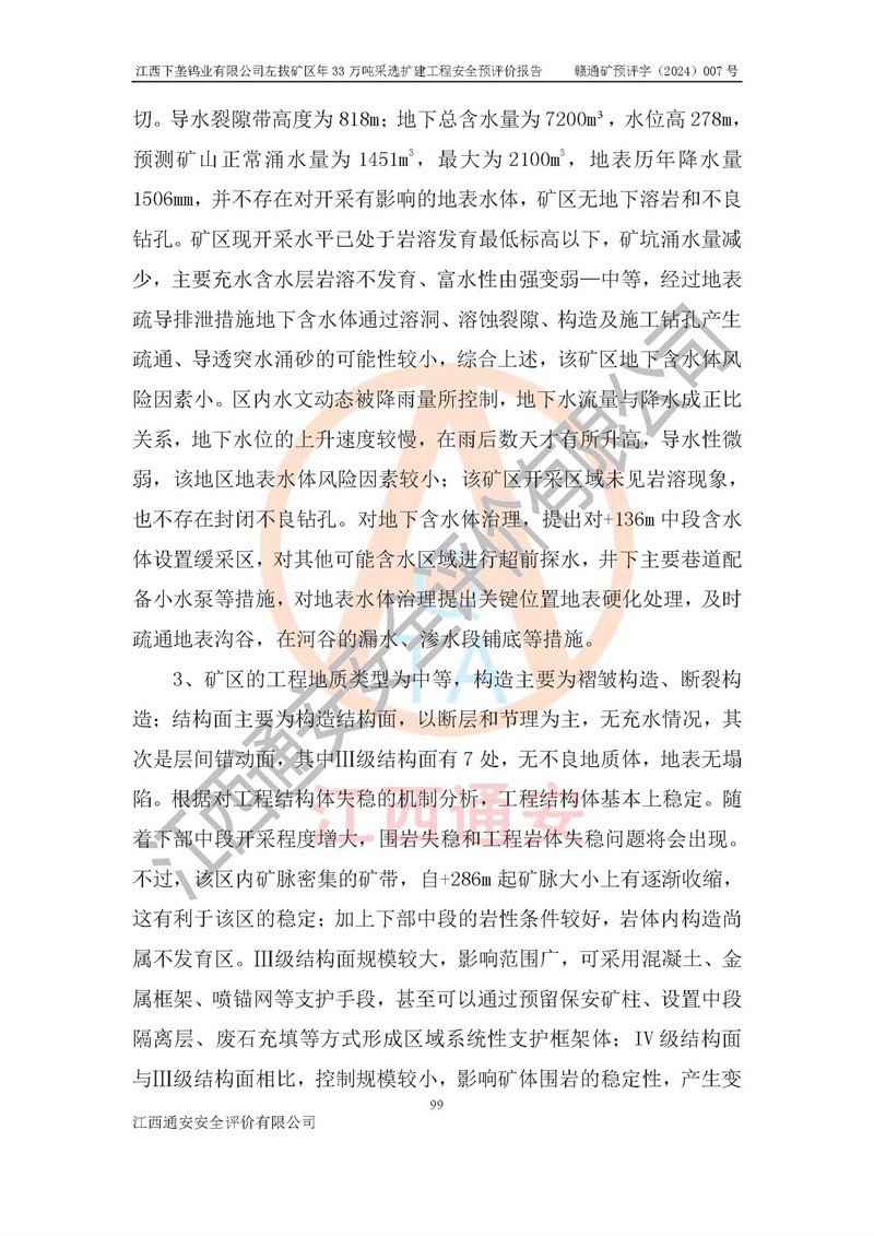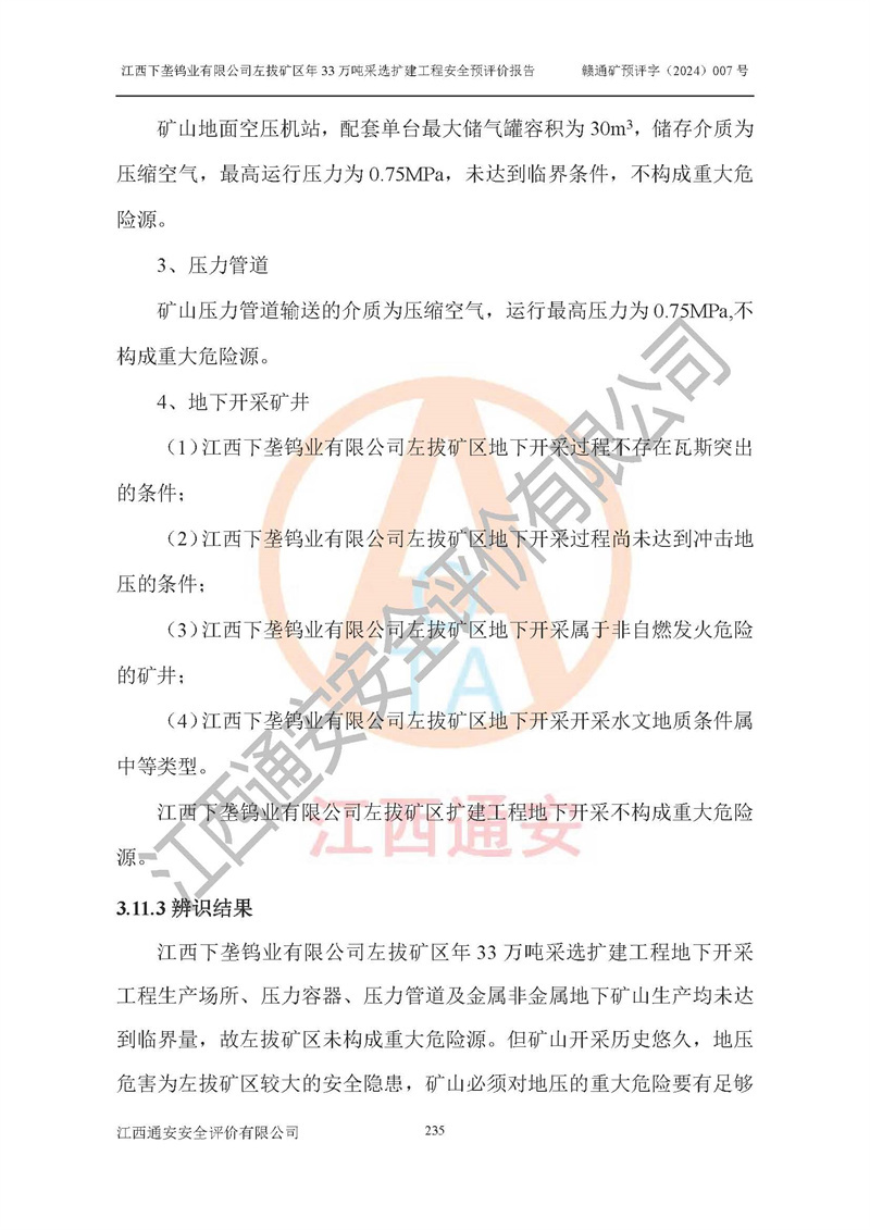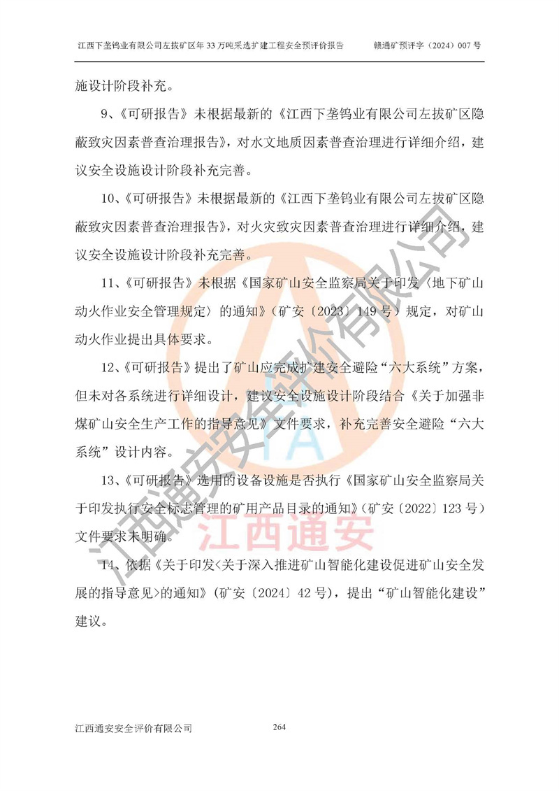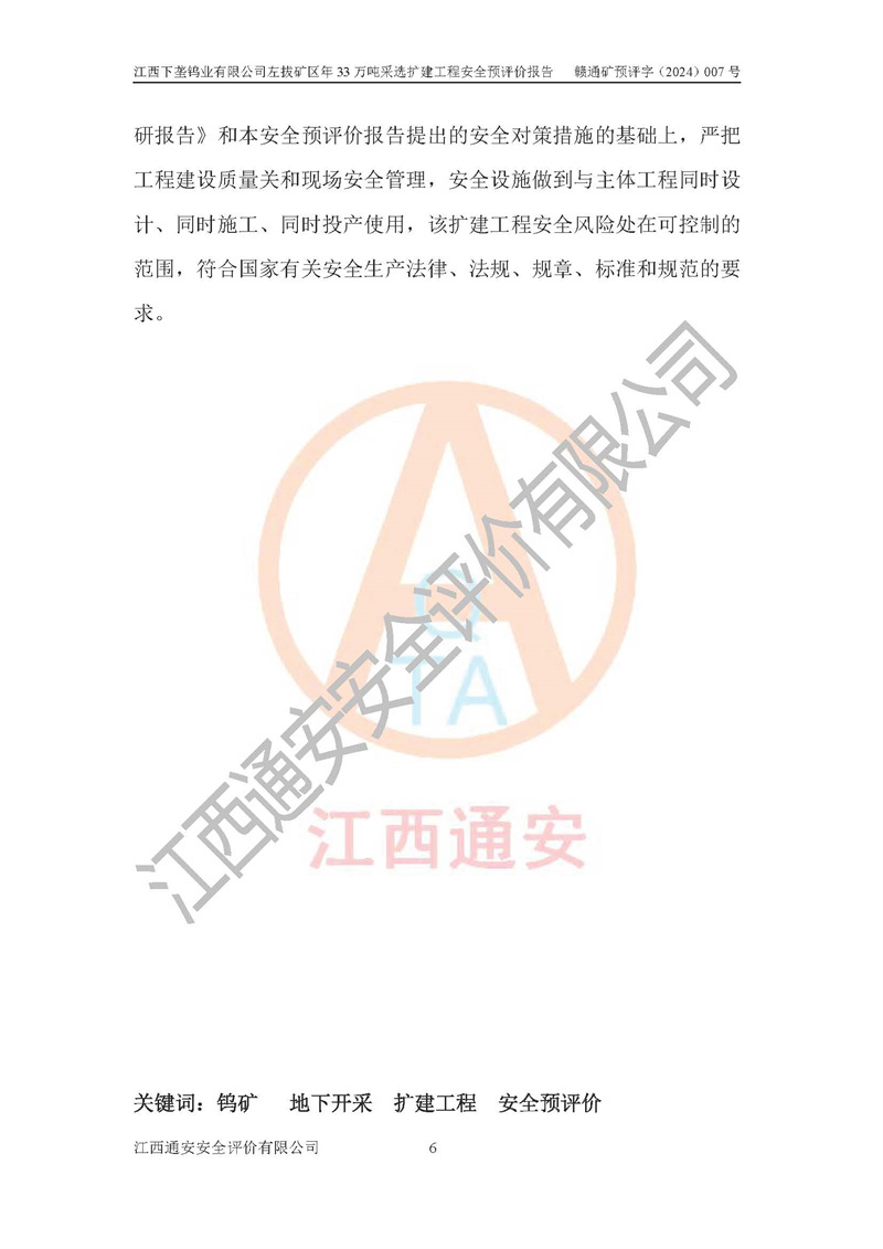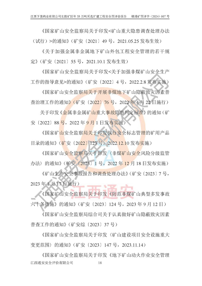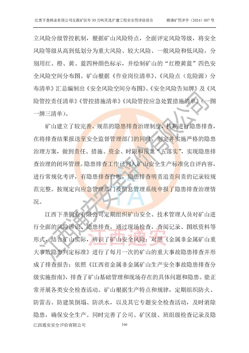 其它 | 江西下壟鎢業(yè)有限公司左拔礦區(qū)年33萬噸采選擴(kuò)建工程方案可行、選用的工藝和設(shè)備成熟、系統(tǒng)總體可靠,礦山具有建設(shè)、生產(chǎn)和管理的經(jīng)驗(yàn)和基礎(chǔ),在采納《可研報(bào)告》和本安全預(yù)評(píng)價(jià)報(bào)告提出的安全對(duì)策措施的基礎(chǔ)上,嚴(yán)把工程建設(shè)質(zhì)量關(guān)和現(xiàn)場(chǎng)安全管理,安全設(shè)施做到與主體工程同時(shí)設(shè)計(jì)、同時(shí)施工、同時(shí)投產(chǎn)使用,該擴(kuò)建工程安全風(fēng)險(xiǎn)處在可控制的范圍,符合**有關(guān)安全生產(chǎn)法律、法規(guī)、規(guī)章、標(biāo)準(zhǔn)和規(guī)范的要求。 | ||||