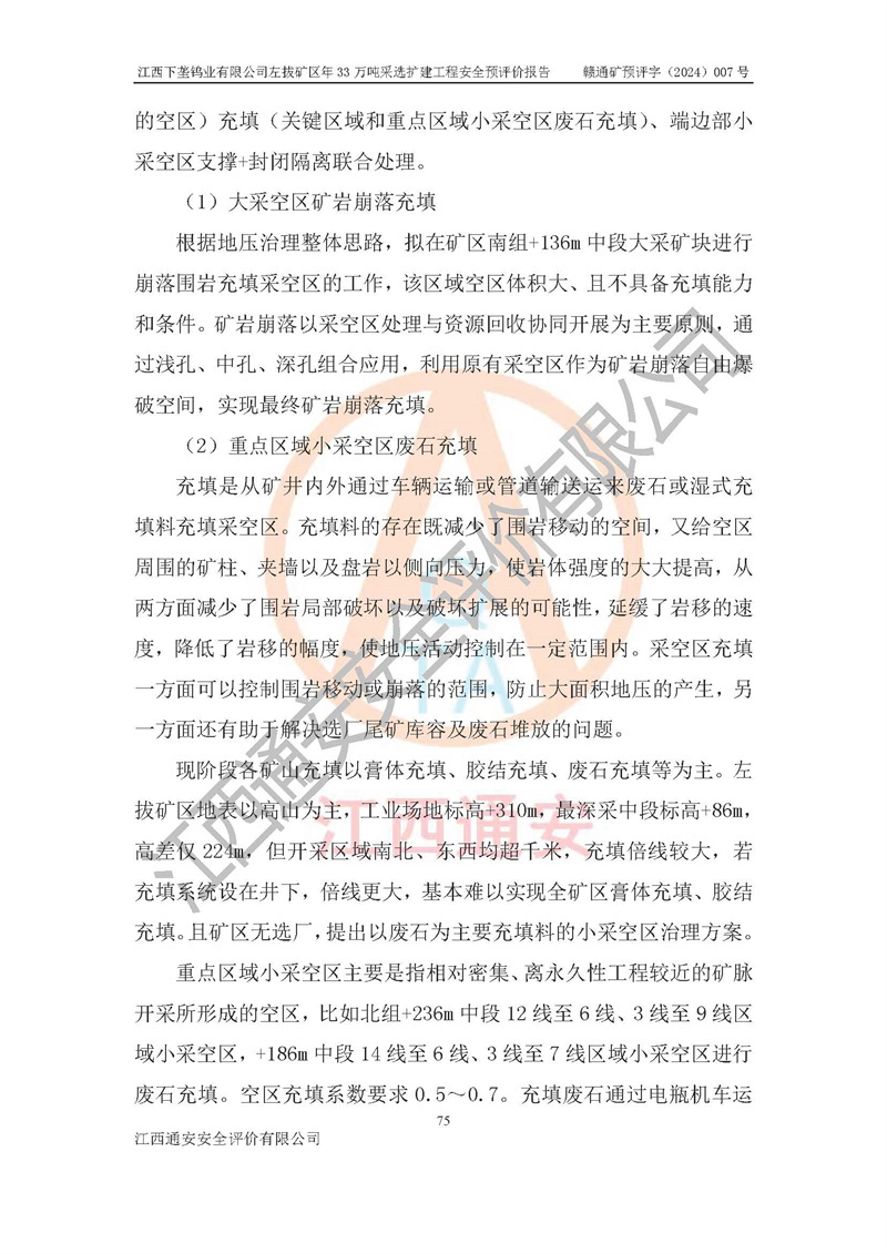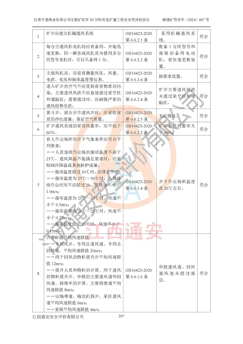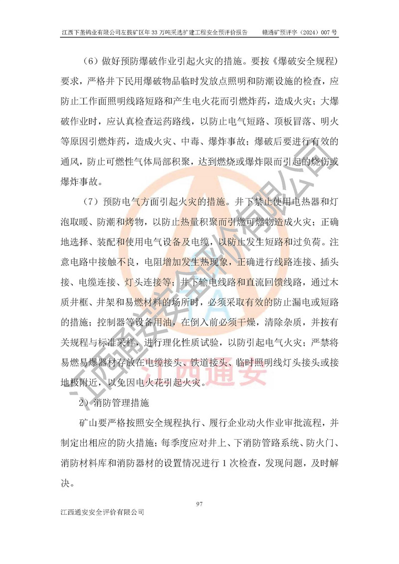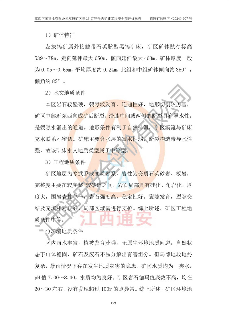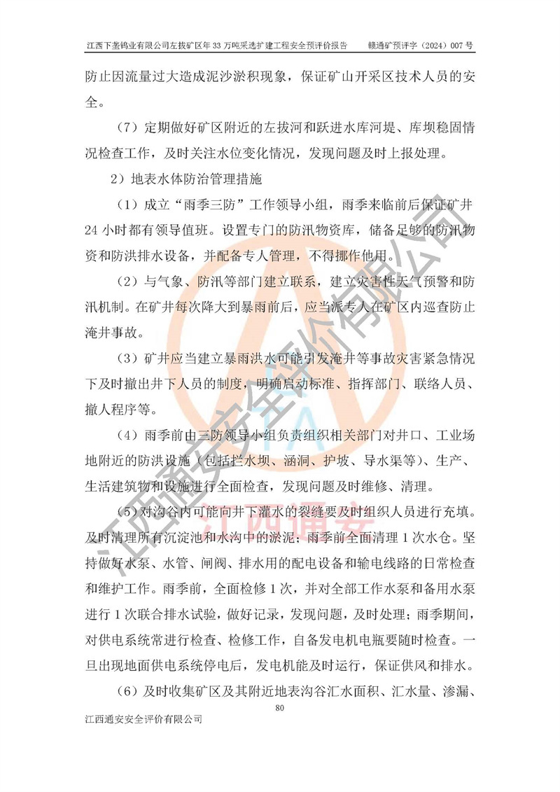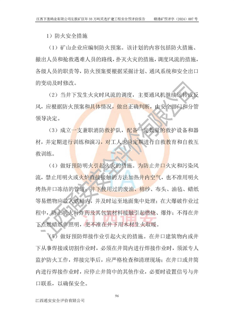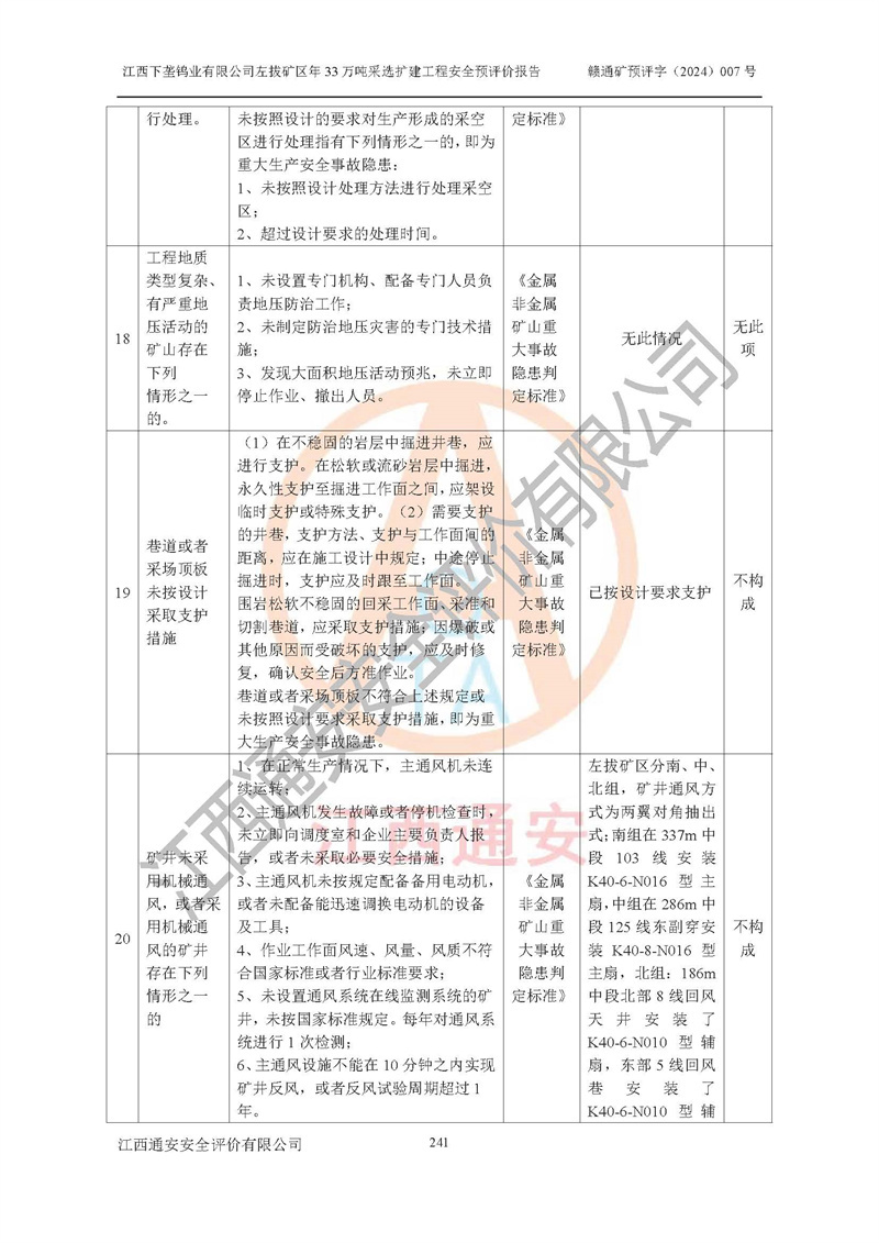 其它 | 江西下壟鎢業(yè)有限公司左拔礦區(qū)年33萬噸采選擴(kuò)建工程方案可行、選用的工藝和設(shè)備成熟、系統(tǒng)總體可靠,礦山具有建設(shè)、生產(chǎn)和管理的經(jīng)驗(yàn)和基礎(chǔ),在采納《可研報(bào)告》和本安全預(yù)評(píng)價(jià)報(bào)告提出的安全對(duì)策措施的基礎(chǔ)上,嚴(yán)把工程建設(shè)質(zhì)量關(guān)和現(xiàn)場(chǎng)安全管理,安全設(shè)施做到與主體工程同時(shí)設(shè)計(jì)、同時(shí)施工、同時(shí)投產(chǎn)使用,該擴(kuò)建工程安全風(fēng)險(xiǎn)處在可控制的范圍,符合**有關(guān)安全生產(chǎn)法律、法規(guī)、規(guī)章、標(biāo)準(zhǔn)和規(guī)范的要求。 | ||||