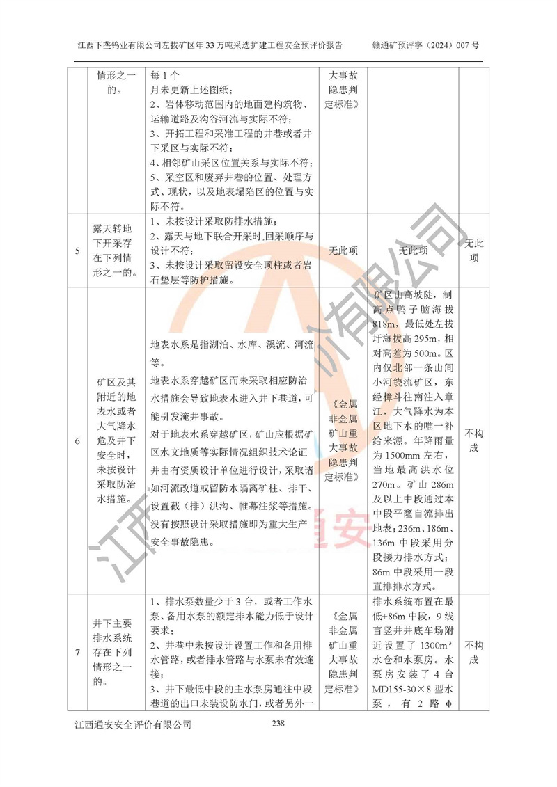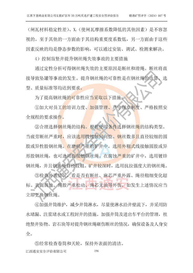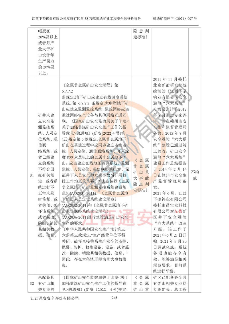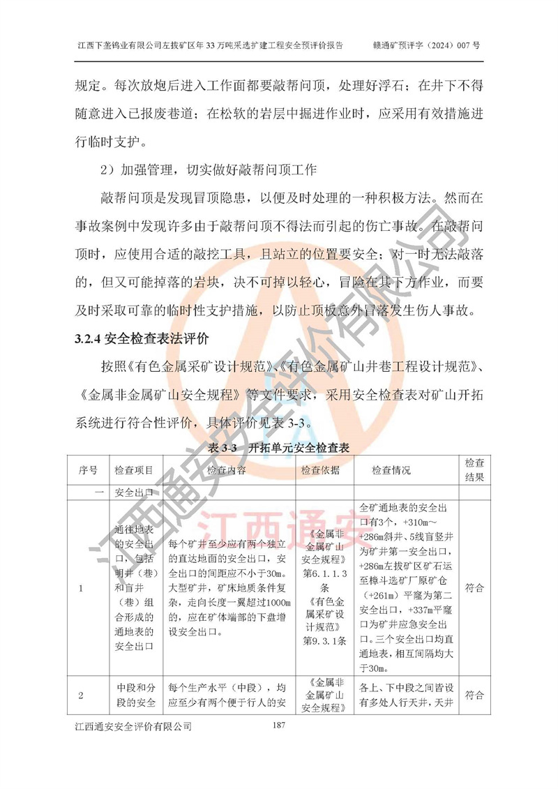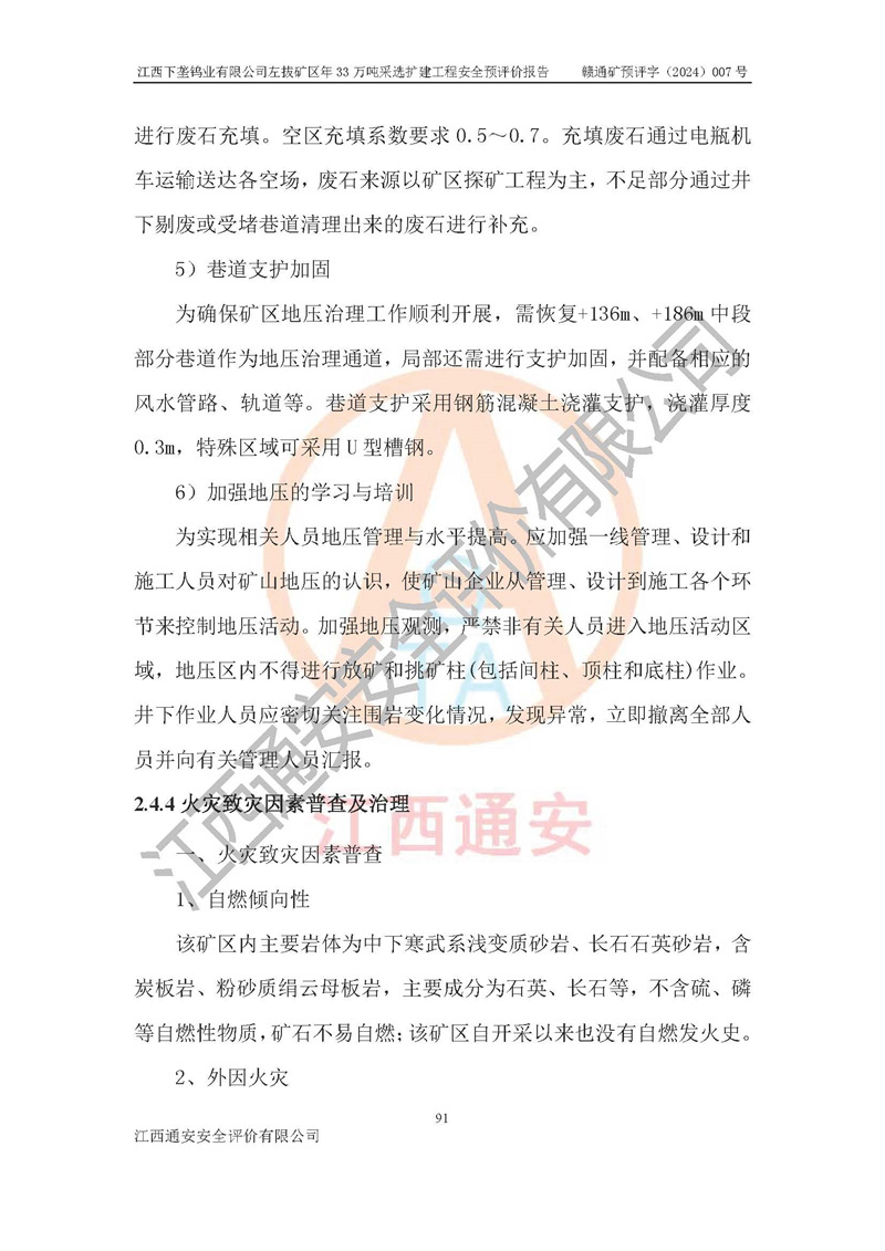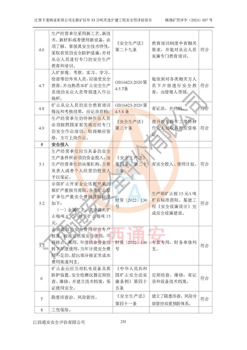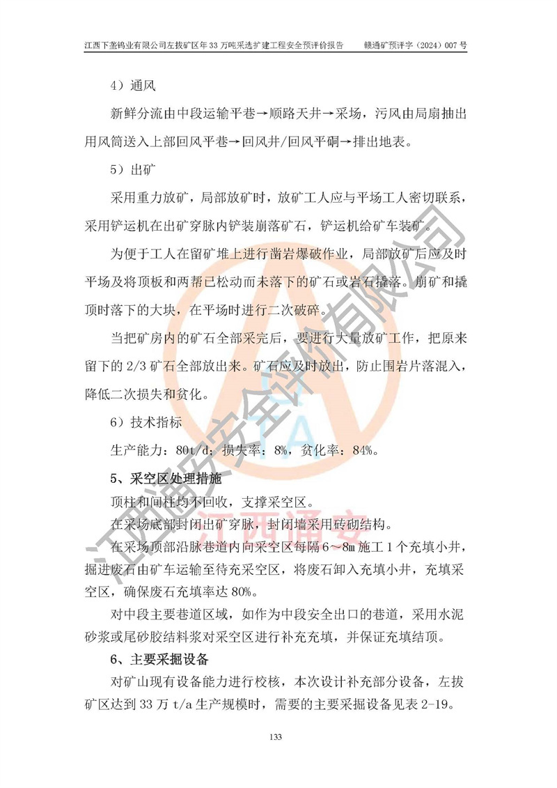 其它 | 江西下壟鎢業(yè)有限公司左拔礦區(qū)年33萬噸采選擴(kuò)建工程方案可行、選用的工藝和設(shè)備成熟、系統(tǒng)總體可靠,礦山具有建設(shè)、生產(chǎn)和管理的經(jīng)驗(yàn)和基礎(chǔ),在采納《可研報(bào)告》和本安全預(yù)評(píng)價(jià)報(bào)告提出的安全對(duì)策措施的基礎(chǔ)上,嚴(yán)把工程建設(shè)質(zhì)量關(guān)和現(xiàn)場(chǎng)安全管理,安全設(shè)施做到與主體工程同時(shí)設(shè)計(jì)、同時(shí)施工、同時(shí)投產(chǎn)使用,該擴(kuò)建工程安全風(fēng)險(xiǎn)處在可控制的范圍,符合**有關(guān)安全生產(chǎn)法律、法規(guī)、規(guī)章、標(biāo)準(zhǔn)和規(guī)范的要求。 | ||||