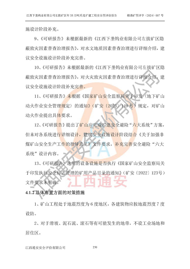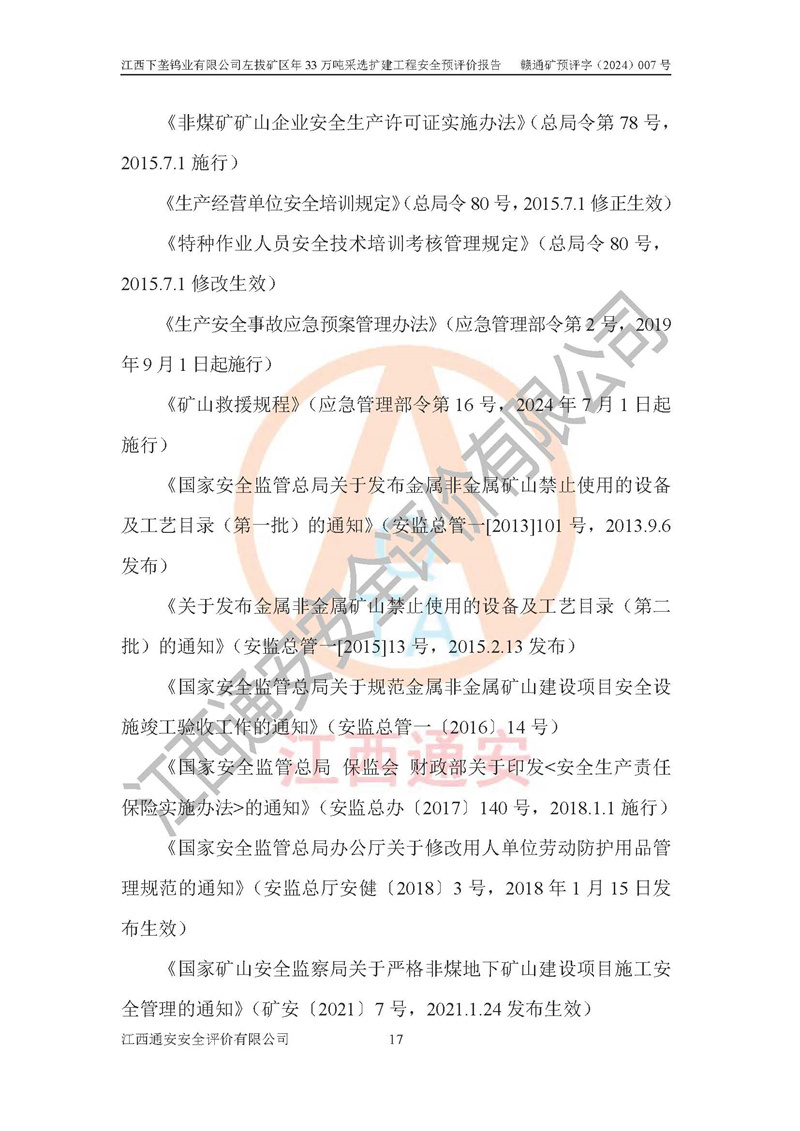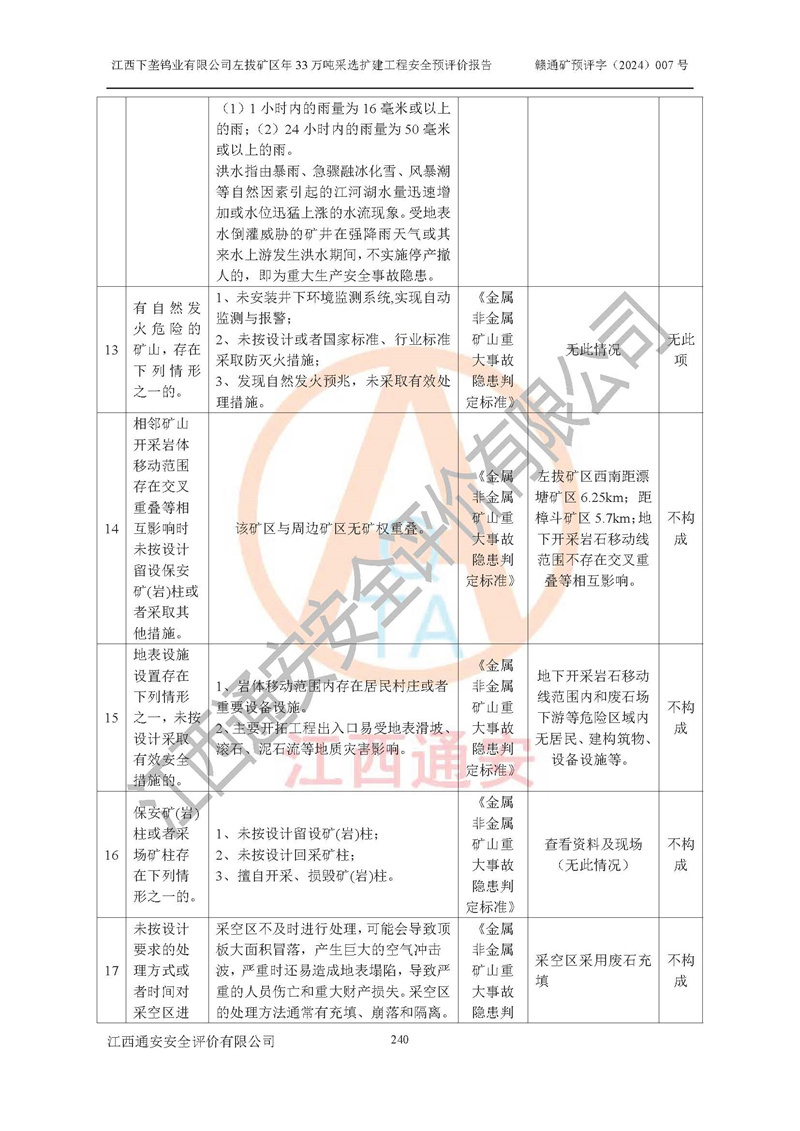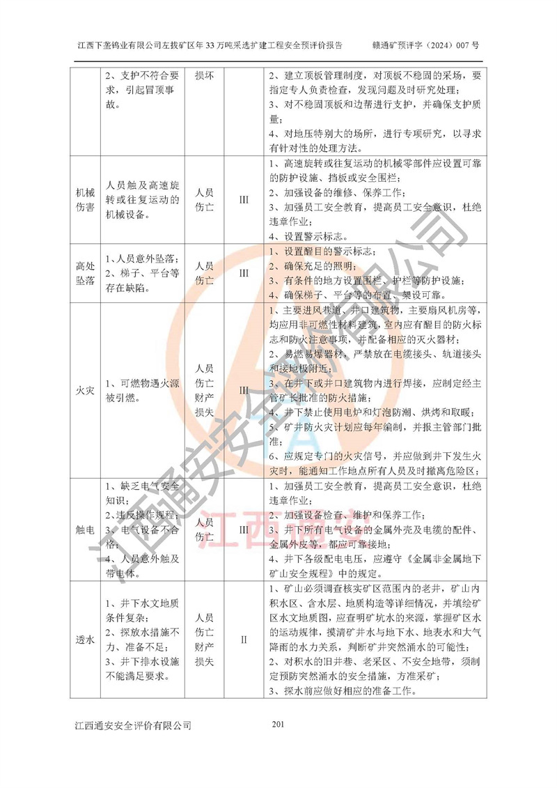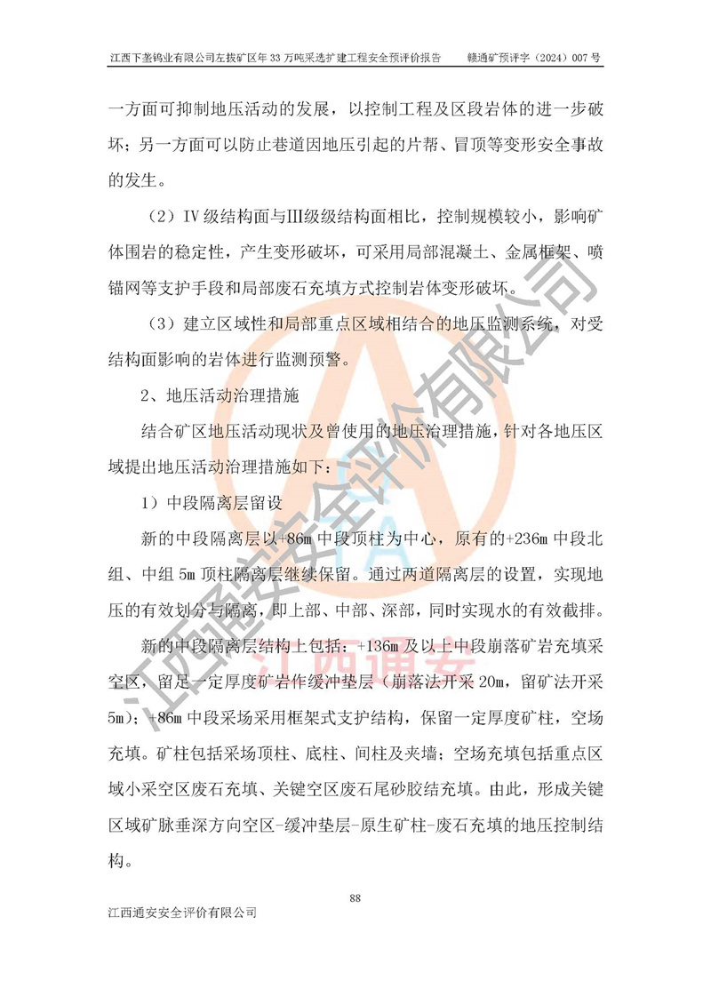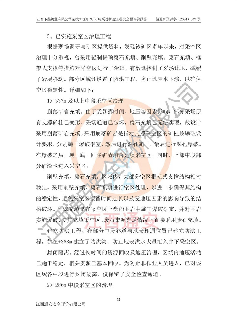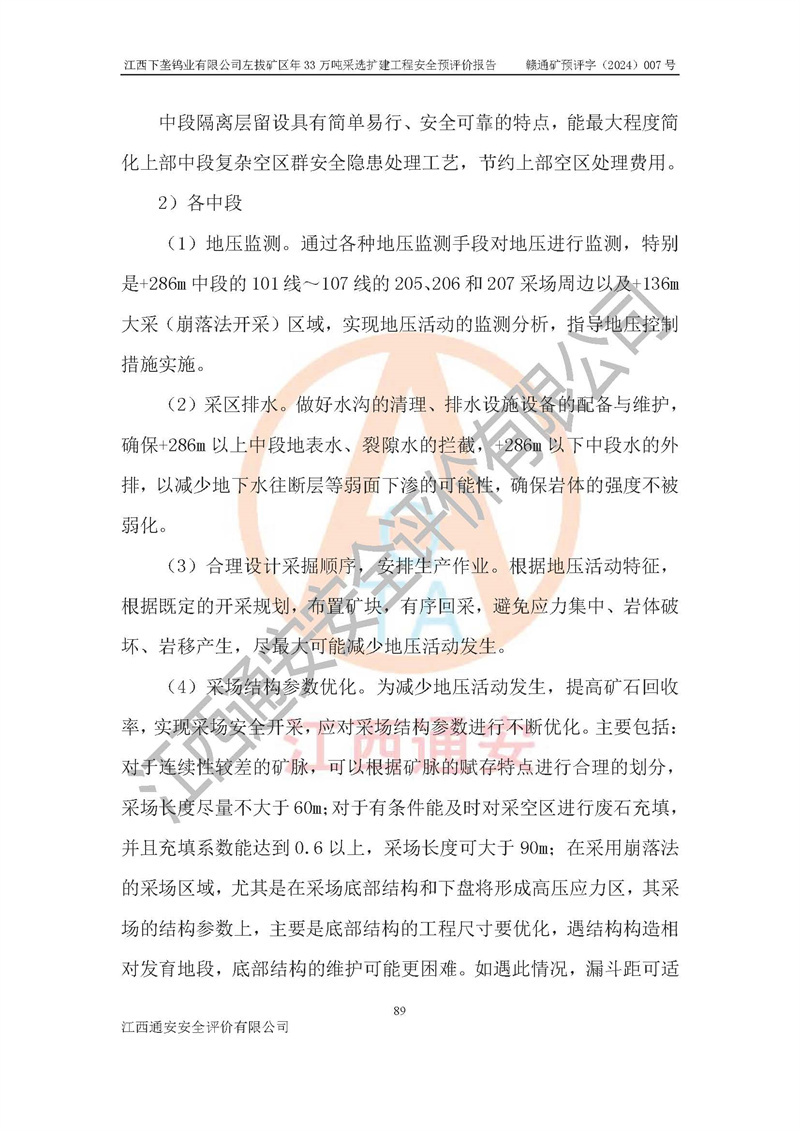 其它 | 江西下壟鎢業(yè)有限公司左拔礦區(qū)年33萬噸采選擴(kuò)建工程方案可行、選用的工藝和設(shè)備成熟、系統(tǒng)總體可靠,礦山具有建設(shè)、生產(chǎn)和管理的經(jīng)驗(yàn)和基礎(chǔ),在采納《可研報(bào)告》和本安全預(yù)評(píng)價(jià)報(bào)告提出的安全對(duì)策措施的基礎(chǔ)上,嚴(yán)把工程建設(shè)質(zhì)量關(guān)和現(xiàn)場(chǎng)安全管理,安全設(shè)施做到與主體工程同時(shí)設(shè)計(jì)、同時(shí)施工、同時(shí)投產(chǎn)使用,該擴(kuò)建工程安全風(fēng)險(xiǎn)處在可控制的范圍,符合**有關(guān)安全生產(chǎn)法律、法規(guī)、規(guī)章、標(biāo)準(zhǔn)和規(guī)范的要求。 | ||||