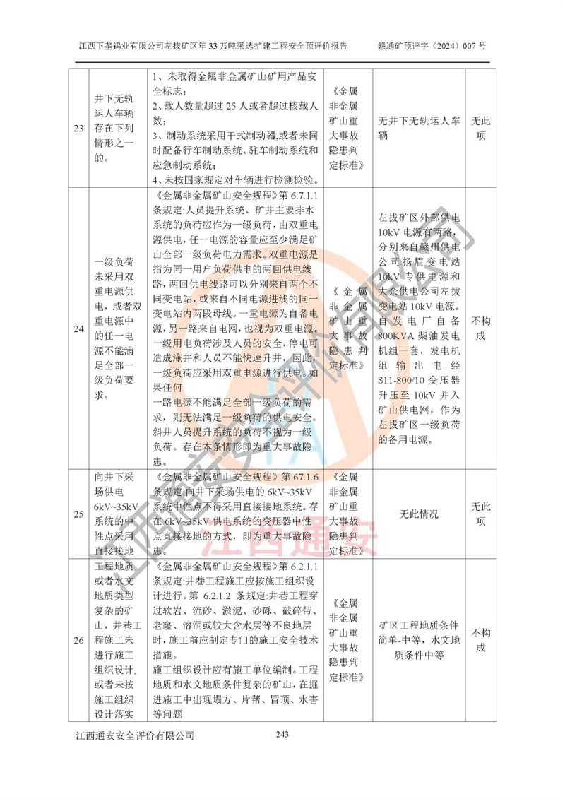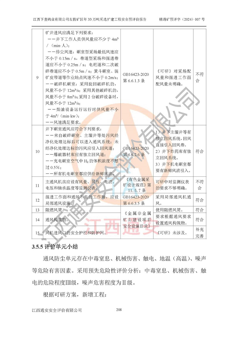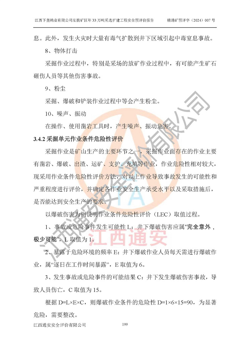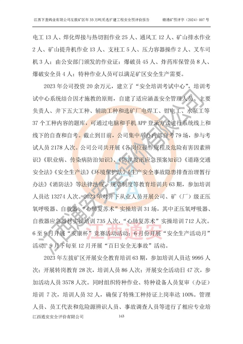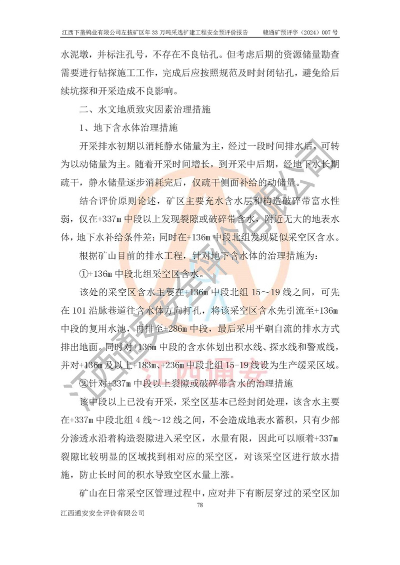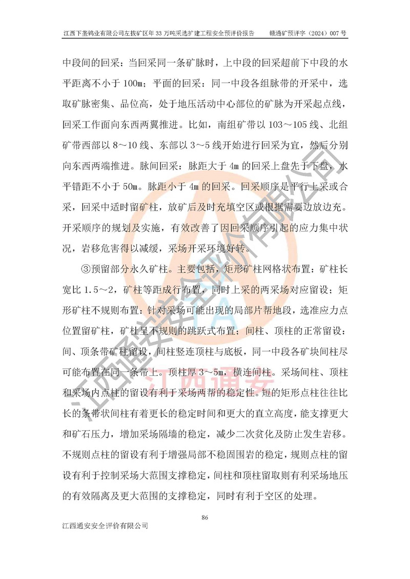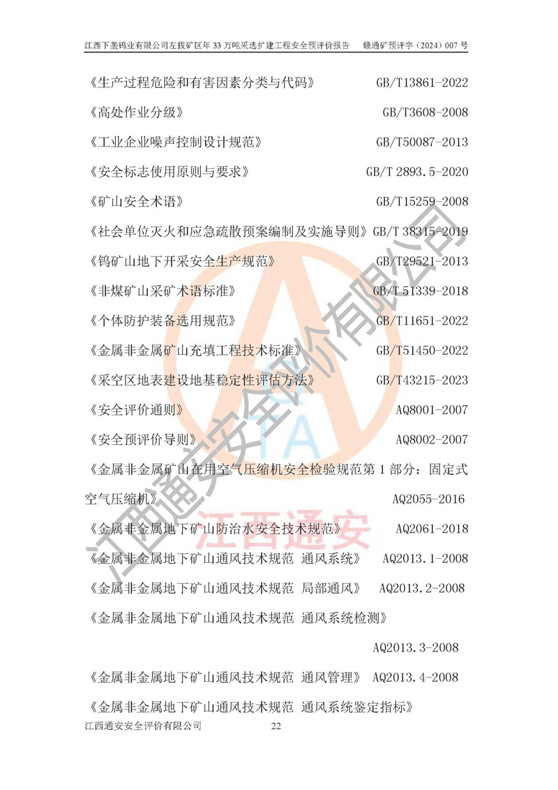 其它 | 江西下壟鎢業(yè)有限公司左拔礦區(qū)年33萬噸采選擴(kuò)建工程方案可行、選用的工藝和設(shè)備成熟、系統(tǒng)總體可靠,礦山具有建設(shè)、生產(chǎn)和管理的經(jīng)驗(yàn)和基礎(chǔ),在采納《可研報(bào)告》和本安全預(yù)評(píng)價(jià)報(bào)告提出的安全對(duì)策措施的基礎(chǔ)上,嚴(yán)把工程建設(shè)質(zhì)量關(guān)和現(xiàn)場(chǎng)安全管理,安全設(shè)施做到與主體工程同時(shí)設(shè)計(jì)、同時(shí)施工、同時(shí)投產(chǎn)使用,該擴(kuò)建工程安全風(fēng)險(xiǎn)處在可控制的范圍,符合**有關(guān)安全生產(chǎn)法律、法規(guī)、規(guī)章、標(biāo)準(zhǔn)和規(guī)范的要求。 | ||||