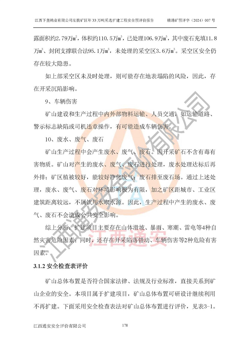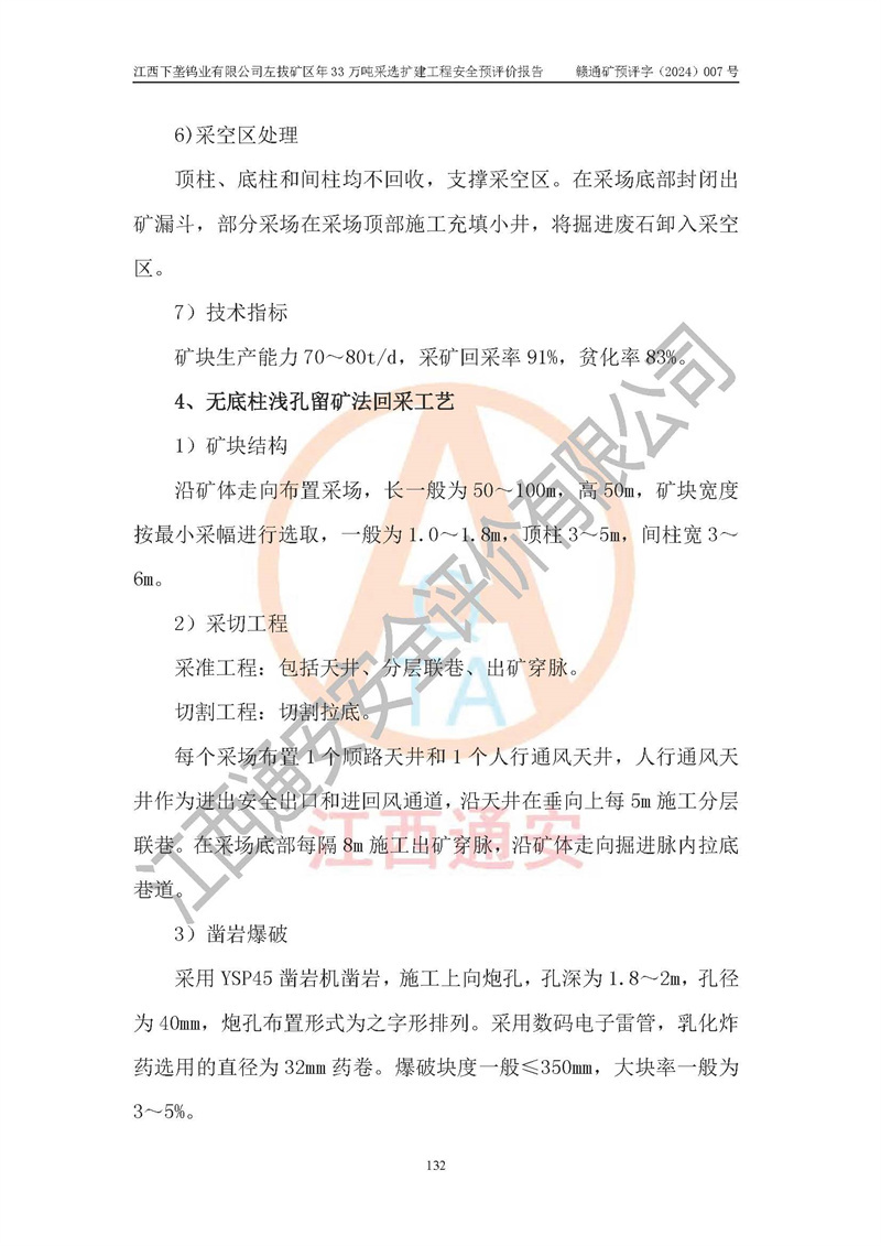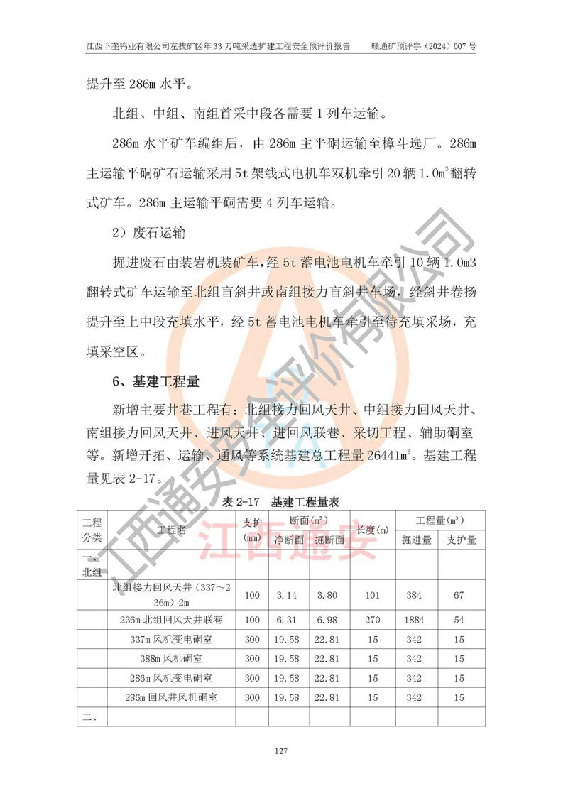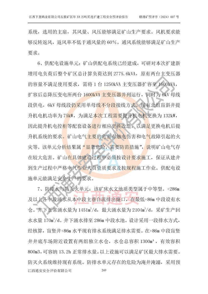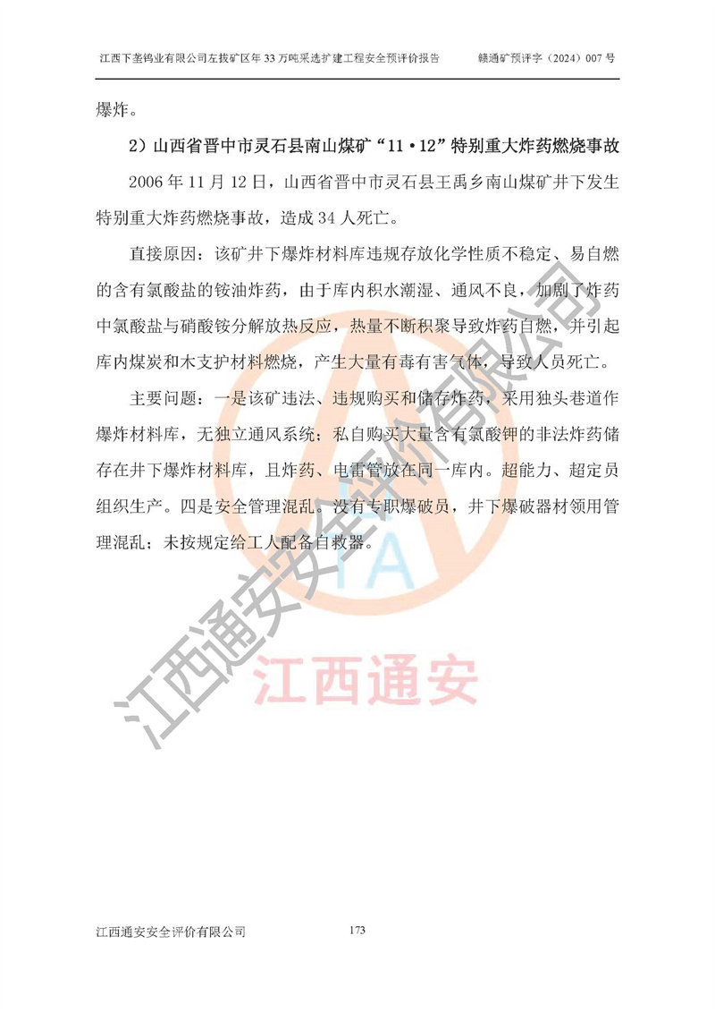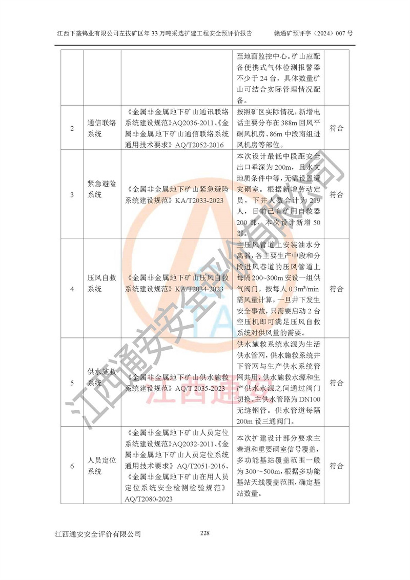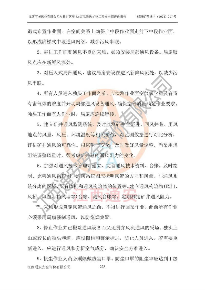 其它 | 江西下壟鎢業(yè)有限公司左拔礦區(qū)年33萬噸采選擴(kuò)建工程方案可行、選用的工藝和設(shè)備成熟、系統(tǒng)總體可靠,礦山具有建設(shè)、生產(chǎn)和管理的經(jīng)驗(yàn)和基礎(chǔ),在采納《可研報(bào)告》和本安全預(yù)評(píng)價(jià)報(bào)告提出的安全對(duì)策措施的基礎(chǔ)上,嚴(yán)把工程建設(shè)質(zhì)量關(guān)和現(xiàn)場(chǎng)安全管理,安全設(shè)施做到與主體工程同時(shí)設(shè)計(jì)、同時(shí)施工、同時(shí)投產(chǎn)使用,該擴(kuò)建工程安全風(fēng)險(xiǎn)處在可控制的范圍,符合**有關(guān)安全生產(chǎn)法律、法規(guī)、規(guī)章、標(biāo)準(zhǔn)和規(guī)范的要求。 | ||||