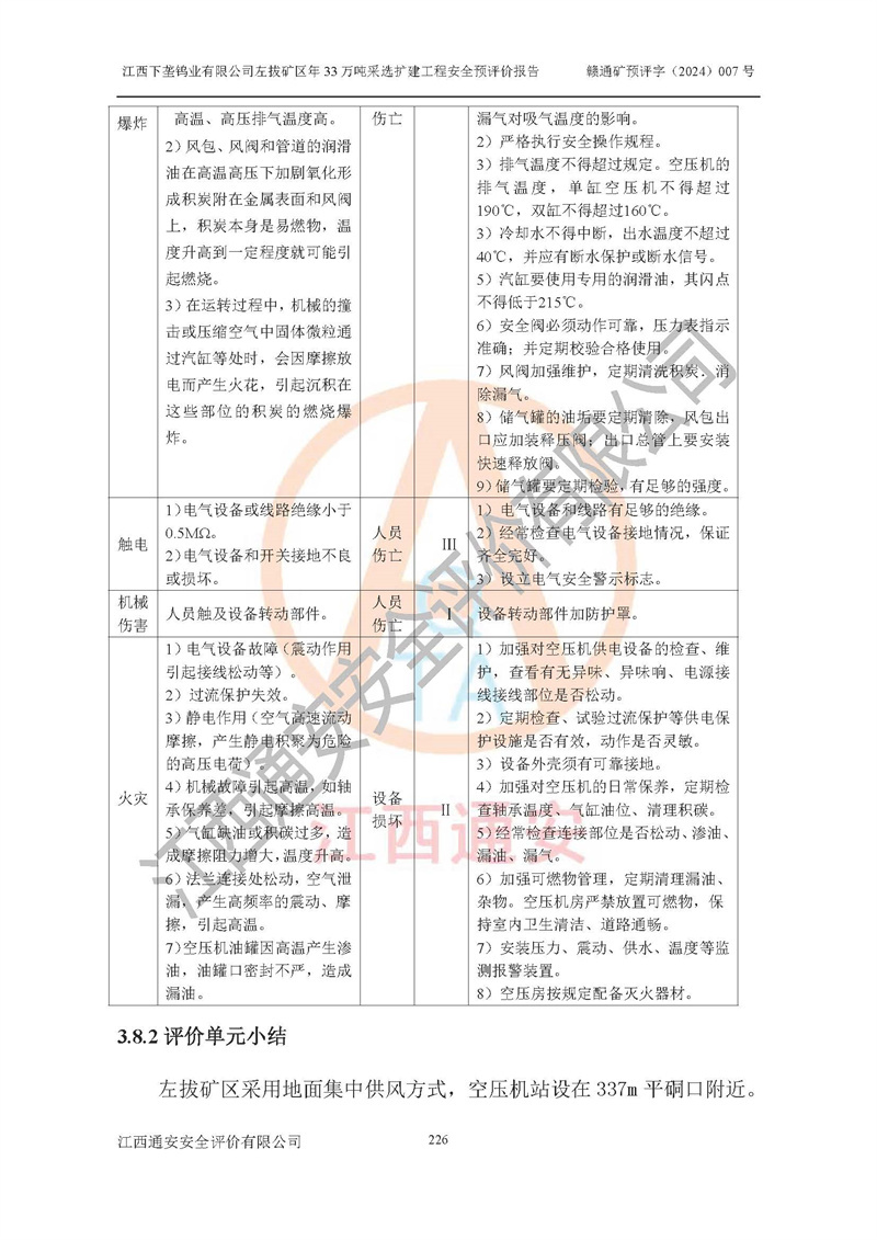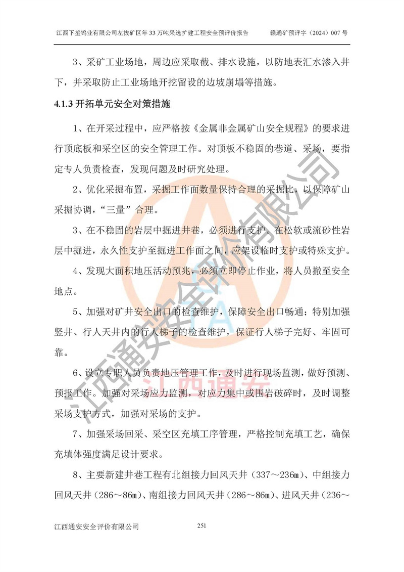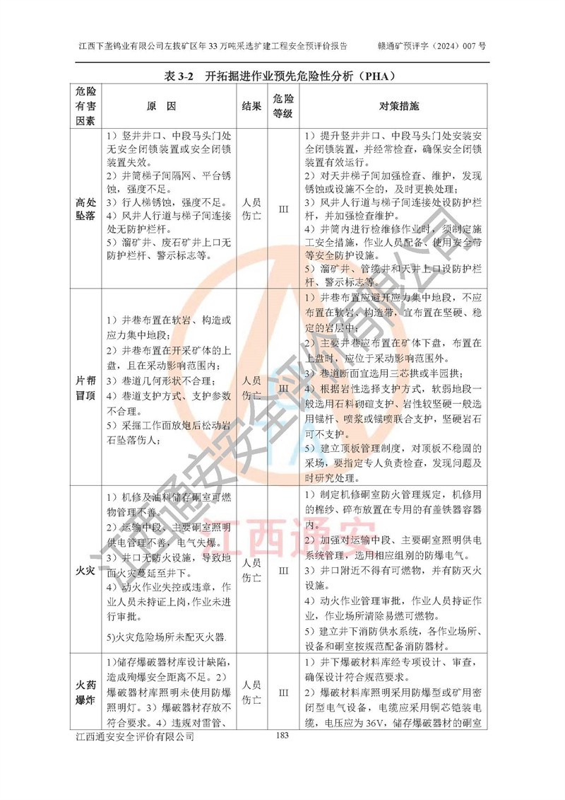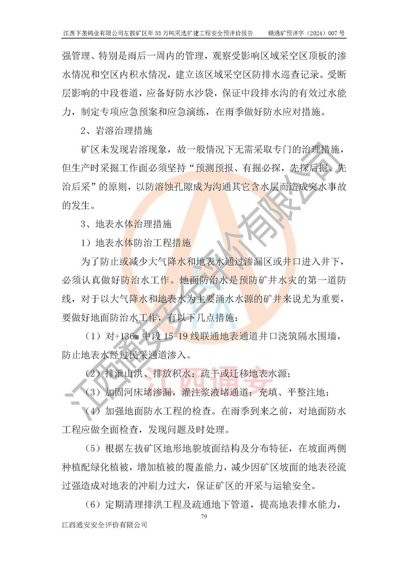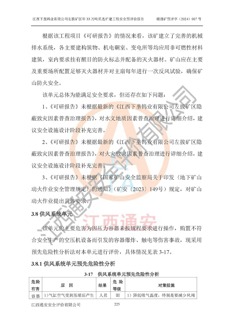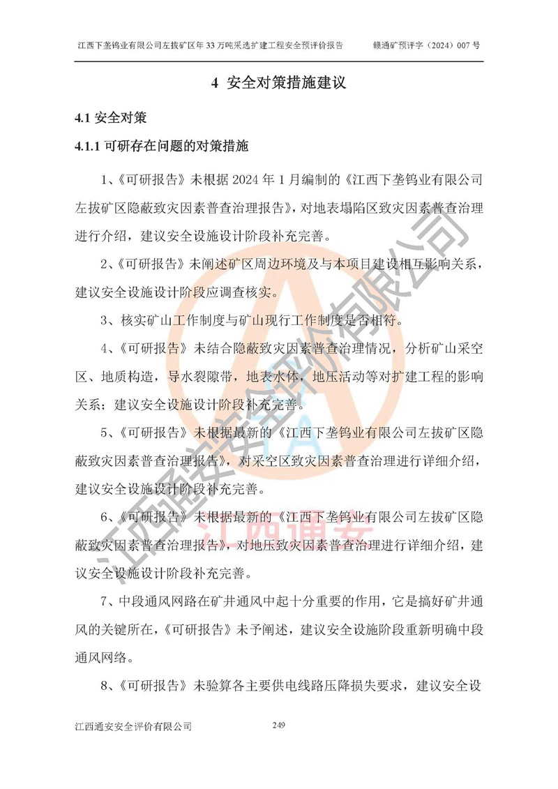 其它 | 江西下壟鎢業(yè)有限公司左拔礦區(qū)年33萬噸采選擴(kuò)建工程方案可行、選用的工藝和設(shè)備成熟、系統(tǒng)總體可靠,礦山具有建設(shè)、生產(chǎn)和管理的經(jīng)驗(yàn)和基礎(chǔ),在采納《可研報(bào)告》和本安全預(yù)評(píng)價(jià)報(bào)告提出的安全對(duì)策措施的基礎(chǔ)上,嚴(yán)把工程建設(shè)質(zhì)量關(guān)和現(xiàn)場(chǎng)安全管理,安全設(shè)施做到與主體工程同時(shí)設(shè)計(jì)、同時(shí)施工、同時(shí)投產(chǎn)使用,該擴(kuò)建工程安全風(fēng)險(xiǎn)處在可控制的范圍,符合**有關(guān)安全生產(chǎn)法律、法規(guī)、規(guī)章、標(biāo)準(zhǔn)和規(guī)范的要求。 | ||||