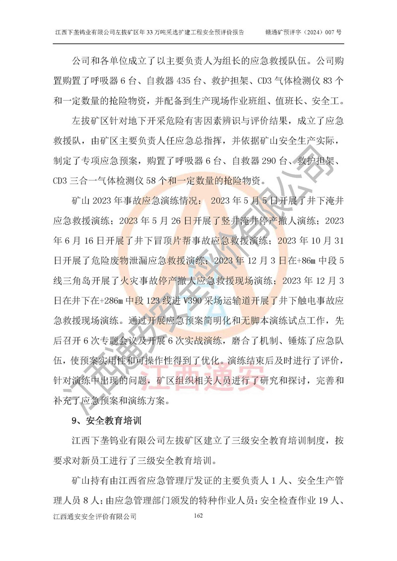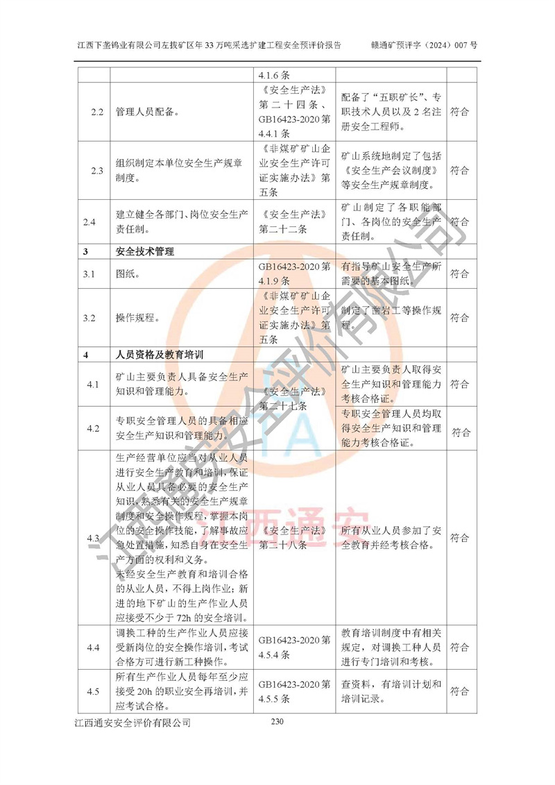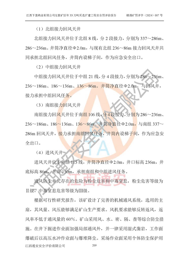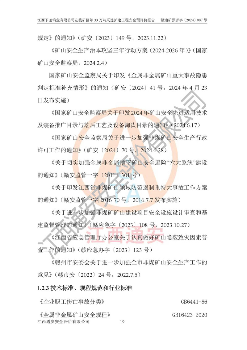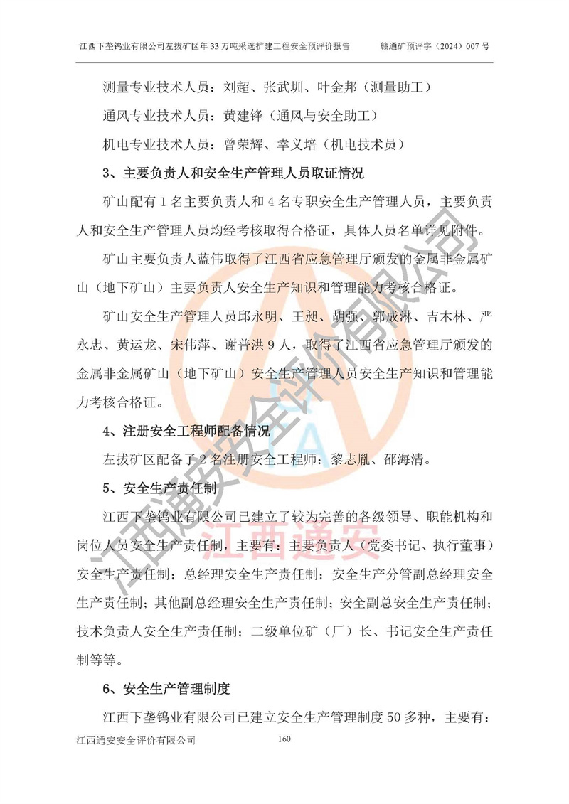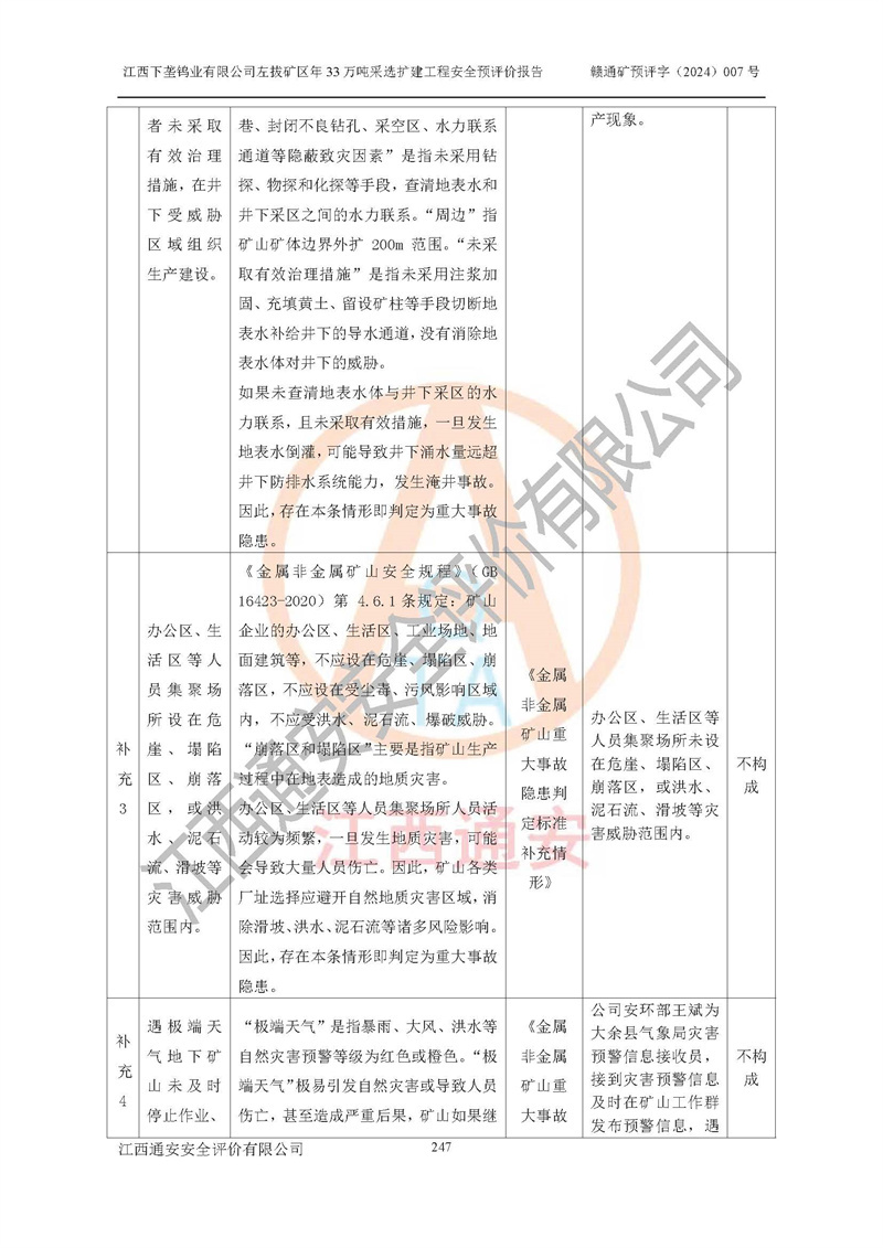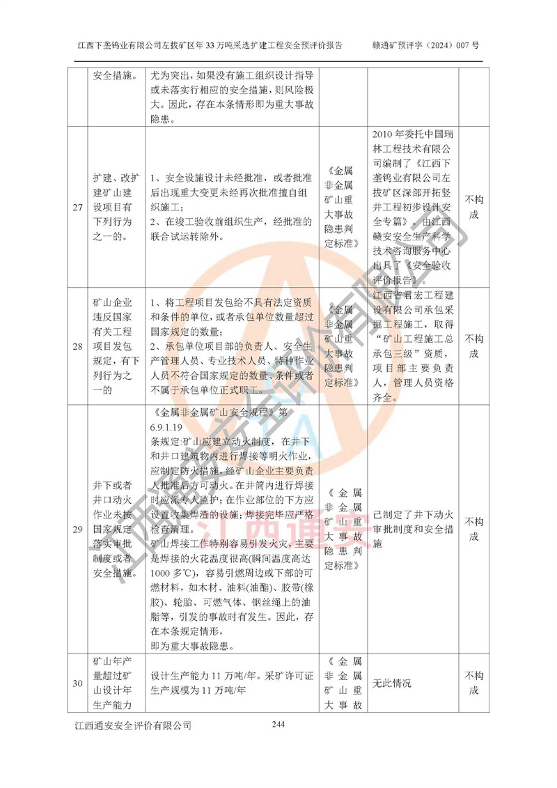 其它 | 江西下壟鎢業(yè)有限公司左拔礦區(qū)年33萬噸采選擴(kuò)建工程方案可行、選用的工藝和設(shè)備成熟、系統(tǒng)總體可靠,礦山具有建設(shè)、生產(chǎn)和管理的經(jīng)驗(yàn)和基礎(chǔ),在采納《可研報(bào)告》和本安全預(yù)評(píng)價(jià)報(bào)告提出的安全對(duì)策措施的基礎(chǔ)上,嚴(yán)把工程建設(shè)質(zhì)量關(guān)和現(xiàn)場(chǎng)安全管理,安全設(shè)施做到與主體工程同時(shí)設(shè)計(jì)、同時(shí)施工、同時(shí)投產(chǎn)使用,該擴(kuò)建工程安全風(fēng)險(xiǎn)處在可控制的范圍,符合**有關(guān)安全生產(chǎn)法律、法規(guī)、規(guī)章、標(biāo)準(zhǔn)和規(guī)范的要求。 | ||||