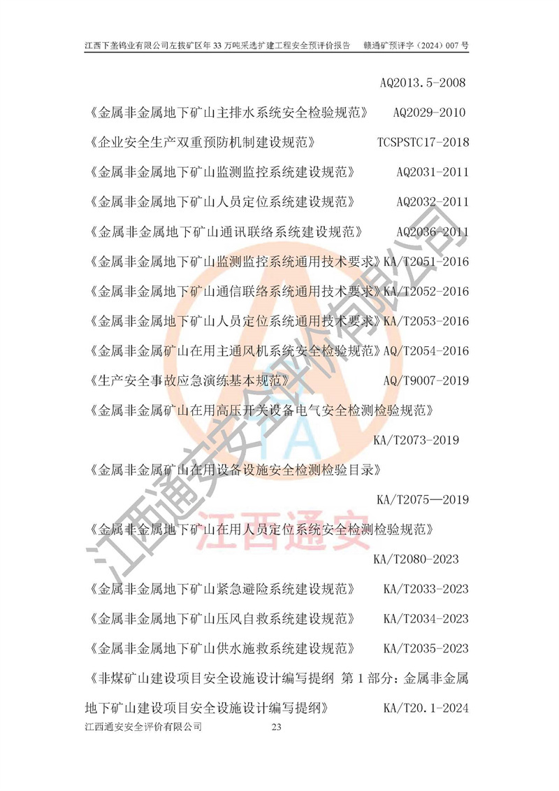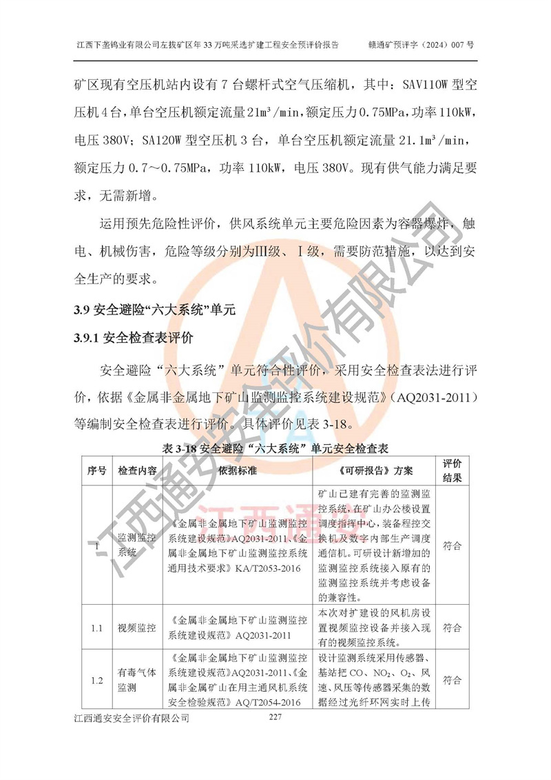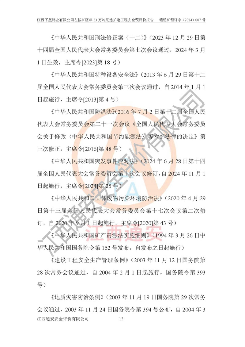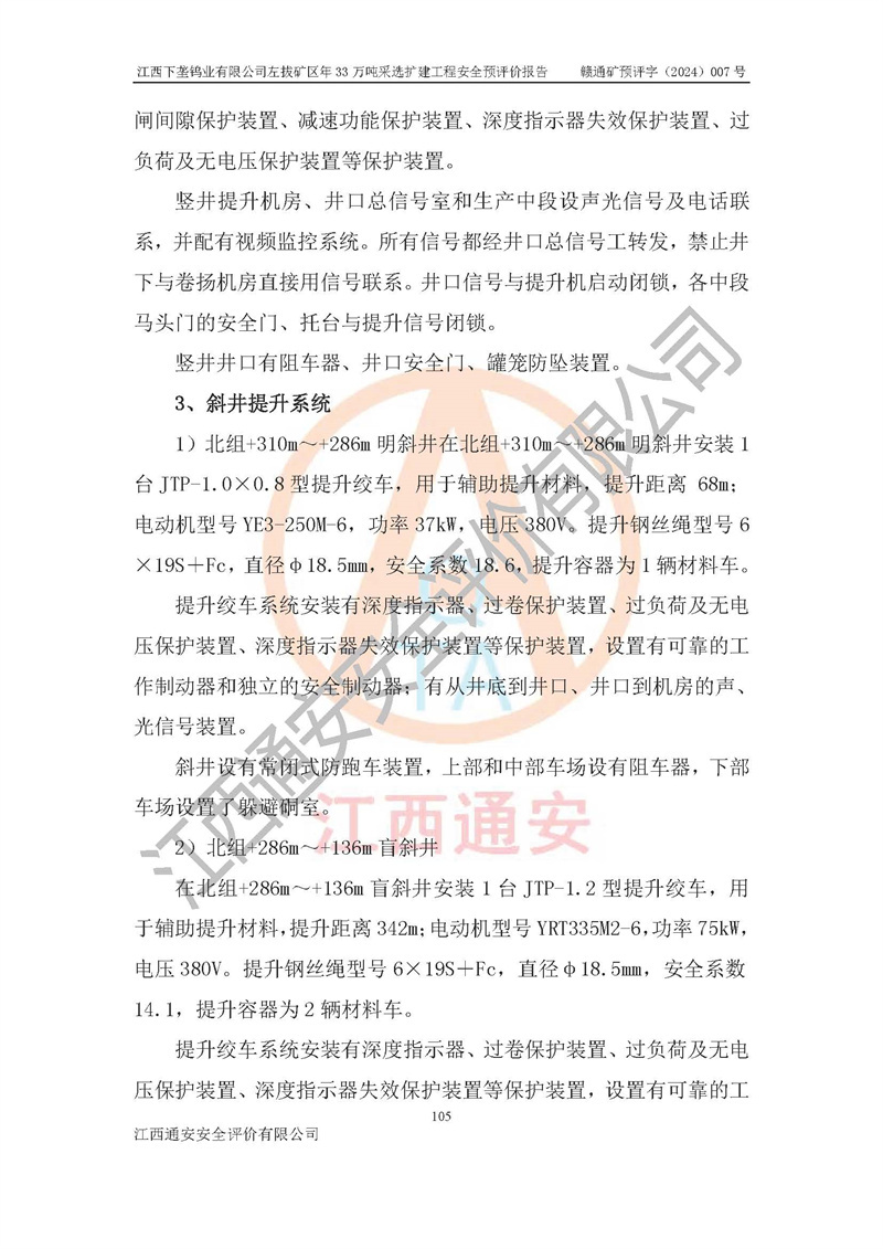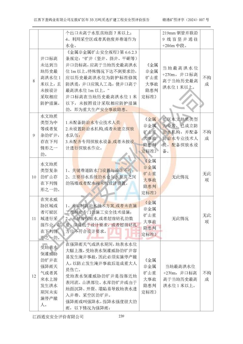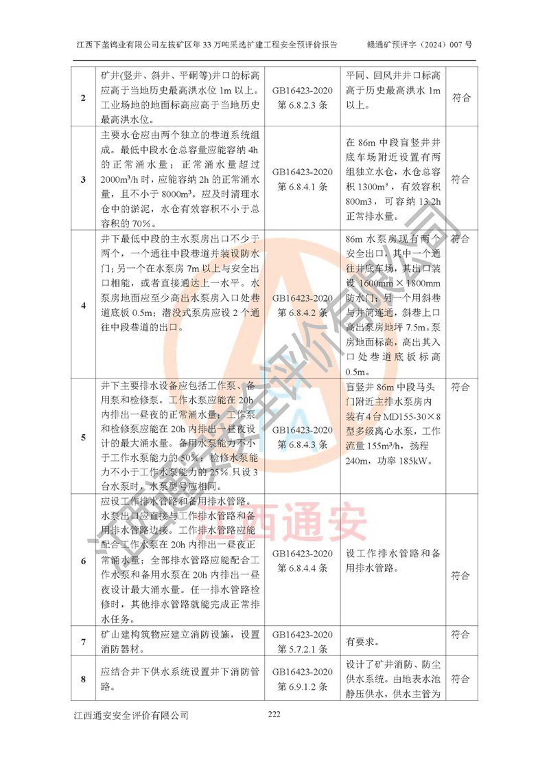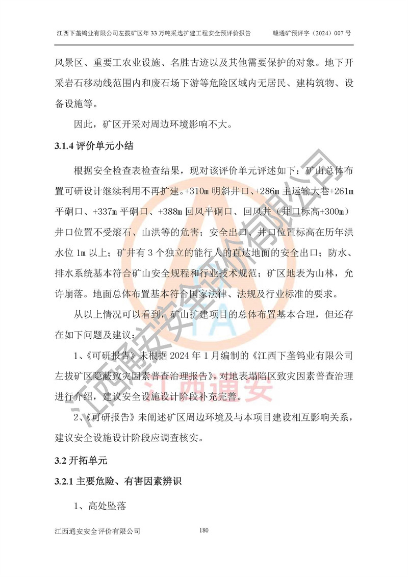 其它 | 江西下壟鎢業(yè)有限公司左拔礦區(qū)年33萬噸采選擴(kuò)建工程方案可行、選用的工藝和設(shè)備成熟、系統(tǒng)總體可靠,礦山具有建設(shè)、生產(chǎn)和管理的經(jīng)驗(yàn)和基礎(chǔ),在采納《可研報(bào)告》和本安全預(yù)評(píng)價(jià)報(bào)告提出的安全對(duì)策措施的基礎(chǔ)上,嚴(yán)把工程建設(shè)質(zhì)量關(guān)和現(xiàn)場(chǎng)安全管理,安全設(shè)施做到與主體工程同時(shí)設(shè)計(jì)、同時(shí)施工、同時(shí)投產(chǎn)使用,該擴(kuò)建工程安全風(fēng)險(xiǎn)處在可控制的范圍,符合**有關(guān)安全生產(chǎn)法律、法規(guī)、規(guī)章、標(biāo)準(zhǔn)和規(guī)范的要求。 | ||||
