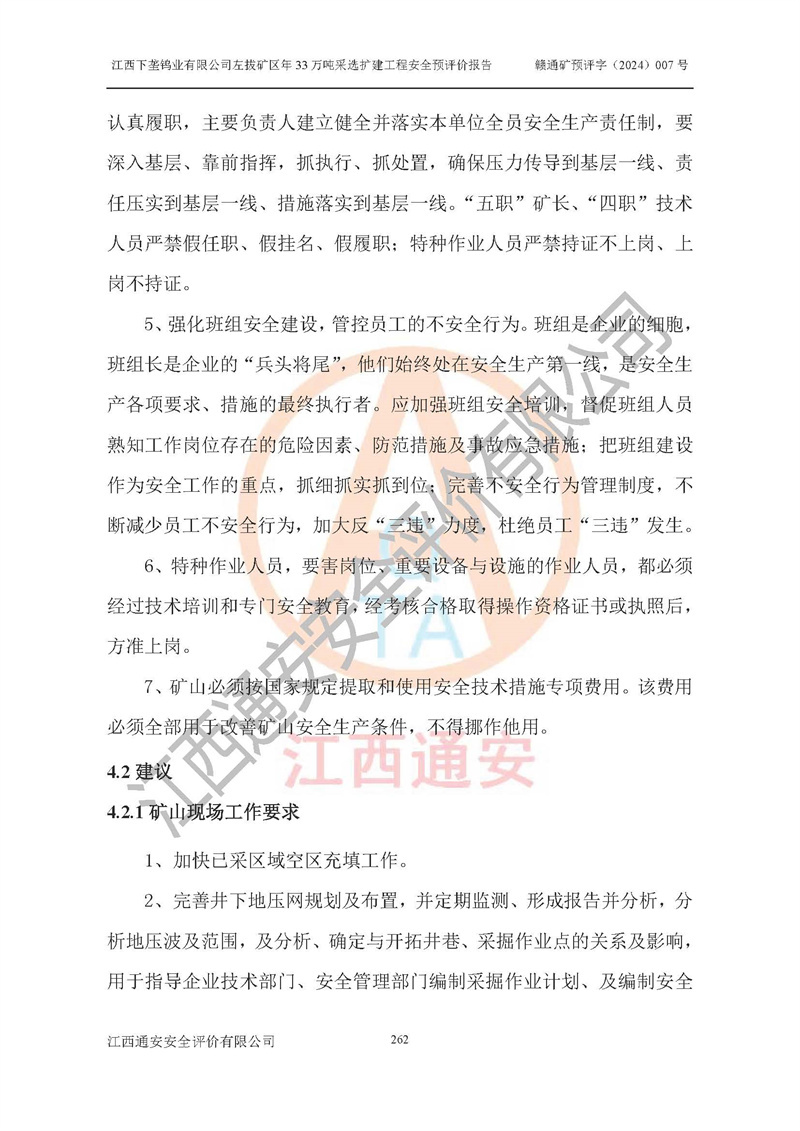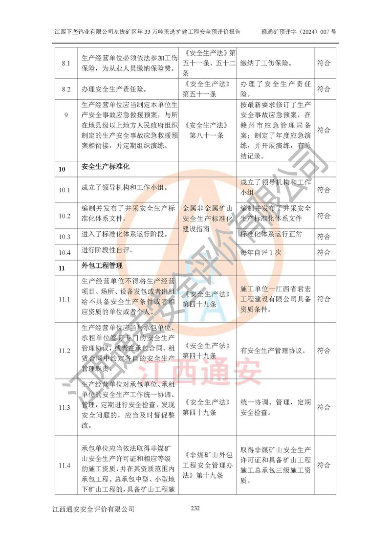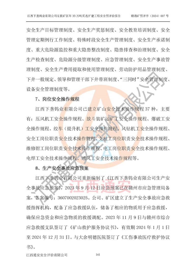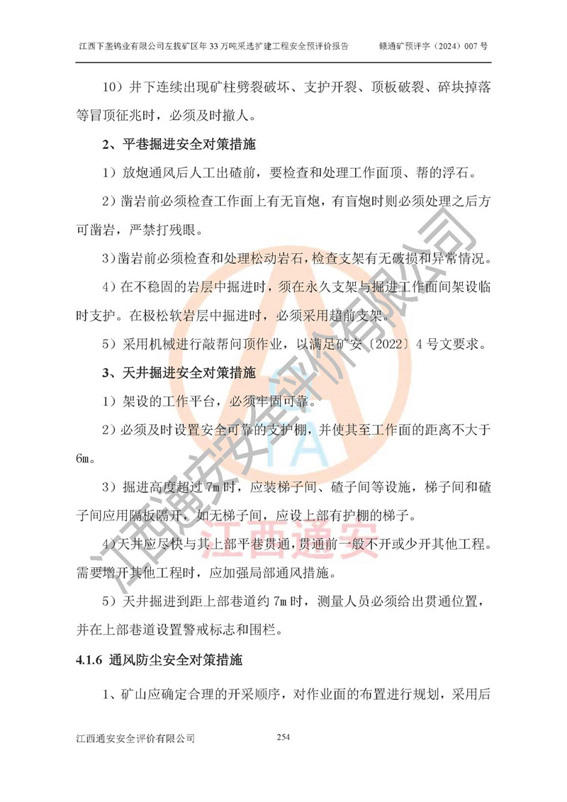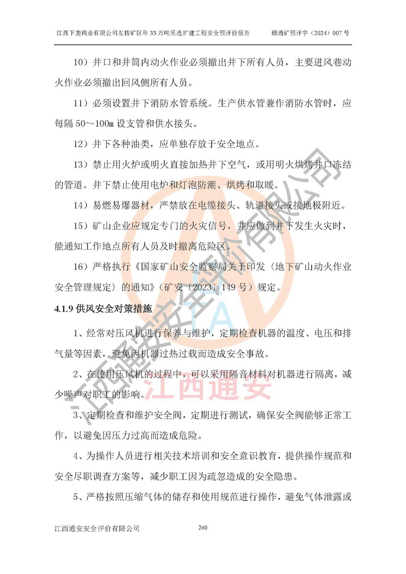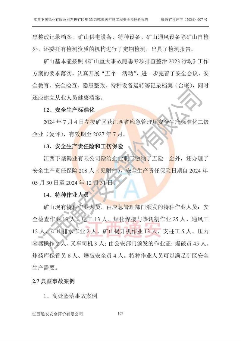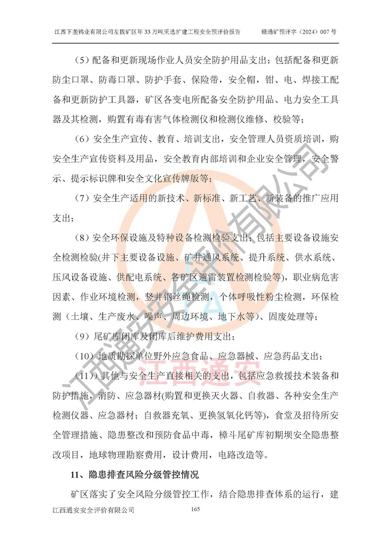 其它 | 江西下壟鎢業(yè)有限公司左拔礦區(qū)年33萬噸采選擴(kuò)建工程方案可行、選用的工藝和設(shè)備成熟、系統(tǒng)總體可靠,礦山具有建設(shè)、生產(chǎn)和管理的經(jīng)驗(yàn)和基礎(chǔ),在采納《可研報(bào)告》和本安全預(yù)評(píng)價(jià)報(bào)告提出的安全對(duì)策措施的基礎(chǔ)上,嚴(yán)把工程建設(shè)質(zhì)量關(guān)和現(xiàn)場(chǎng)安全管理,安全設(shè)施做到與主體工程同時(shí)設(shè)計(jì)、同時(shí)施工、同時(shí)投產(chǎn)使用,該擴(kuò)建工程安全風(fēng)險(xiǎn)處在可控制的范圍,符合**有關(guān)安全生產(chǎn)法律、法規(guī)、規(guī)章、標(biāo)準(zhǔn)和規(guī)范的要求。 | ||||