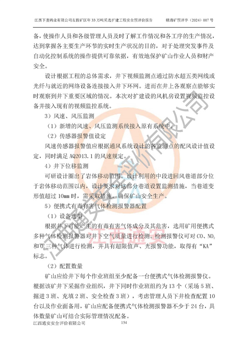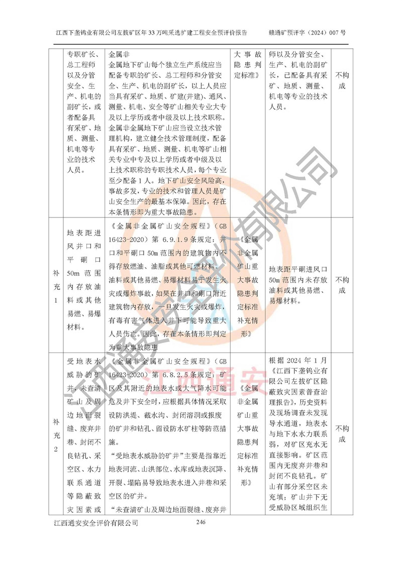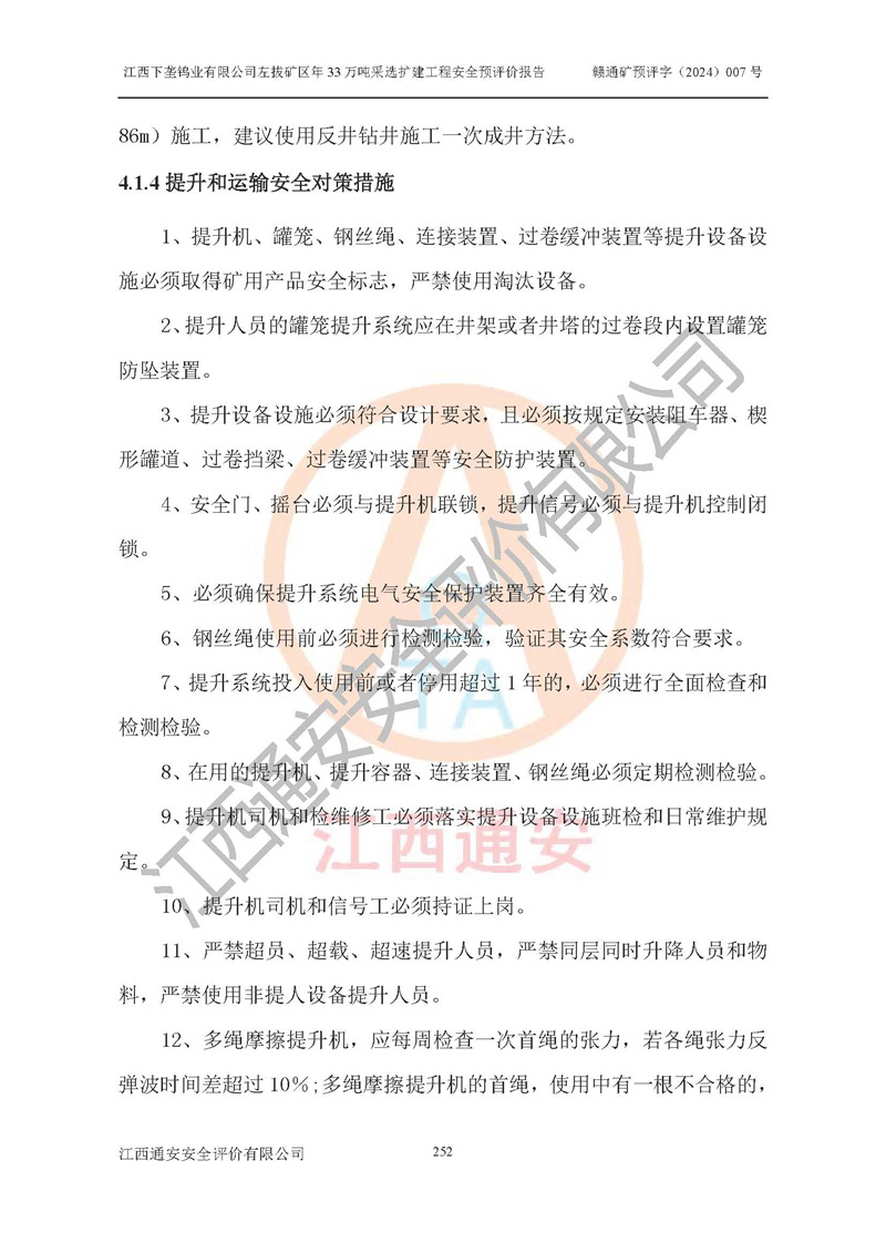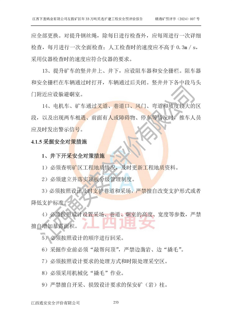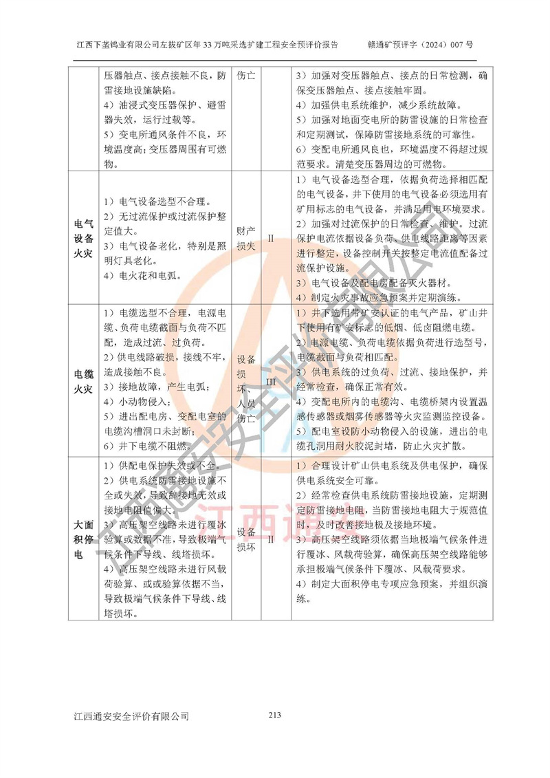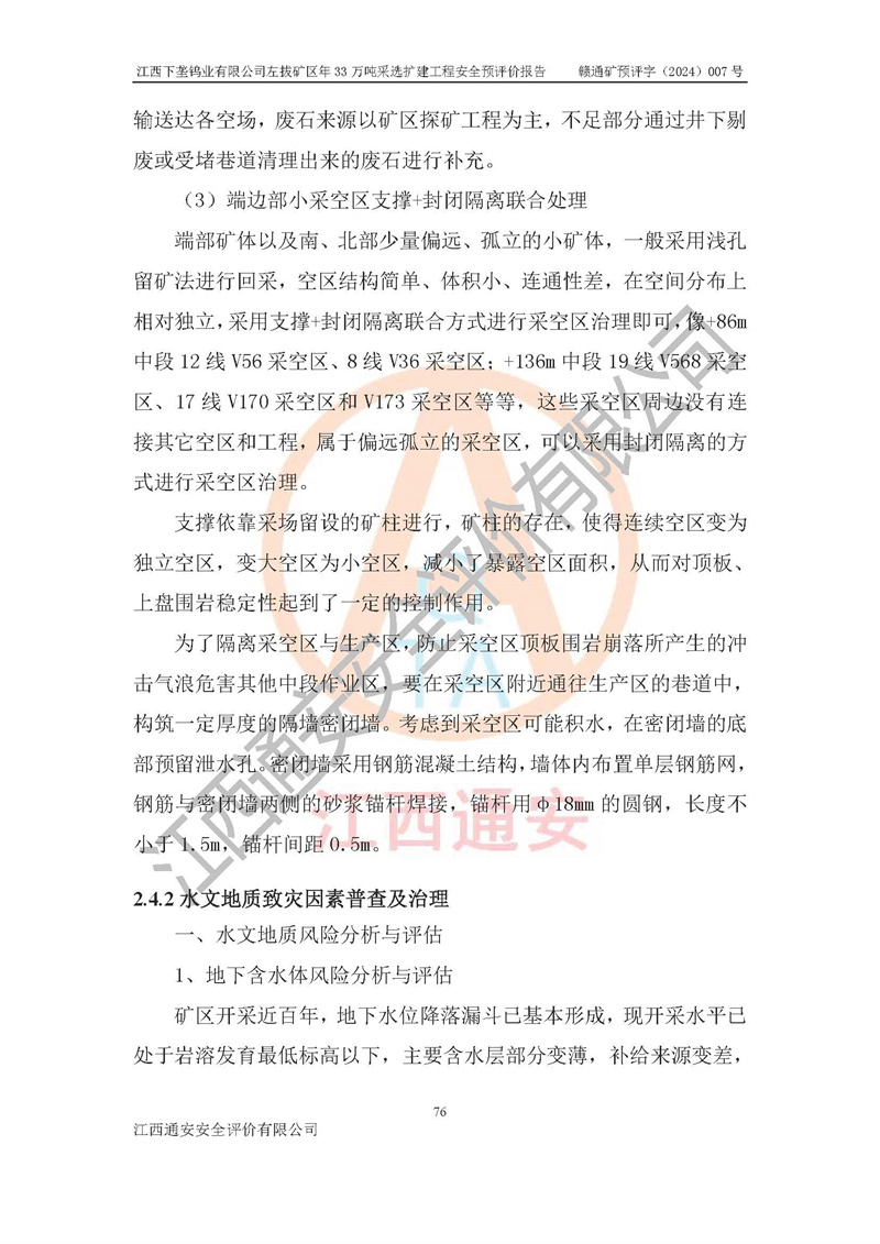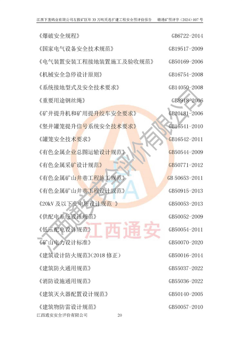 其它 | 江西下壟鎢業(yè)有限公司左拔礦區(qū)年33萬噸采選擴(kuò)建工程方案可行、選用的工藝和設(shè)備成熟、系統(tǒng)總體可靠,礦山具有建設(shè)、生產(chǎn)和管理的經(jīng)驗(yàn)和基礎(chǔ),在采納《可研報(bào)告》和本安全預(yù)評(píng)價(jià)報(bào)告提出的安全對(duì)策措施的基礎(chǔ)上,嚴(yán)把工程建設(shè)質(zhì)量關(guān)和現(xiàn)場(chǎng)安全管理,安全設(shè)施做到與主體工程同時(shí)設(shè)計(jì)、同時(shí)施工、同時(shí)投產(chǎn)使用,該擴(kuò)建工程安全風(fēng)險(xiǎn)處在可控制的范圍,符合**有關(guān)安全生產(chǎn)法律、法規(guī)、規(guī)章、標(biāo)準(zhǔn)和規(guī)范的要求。 | ||||