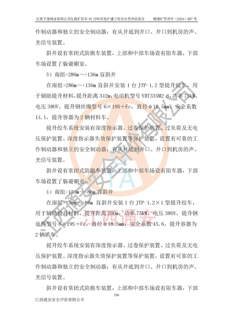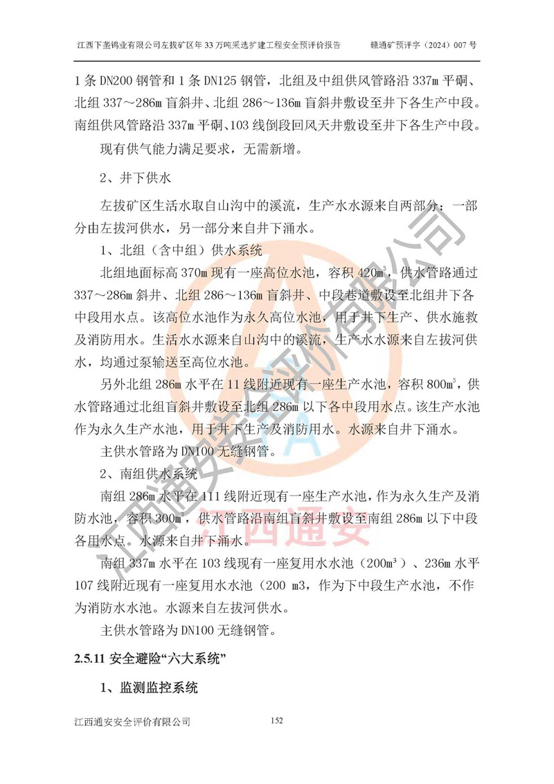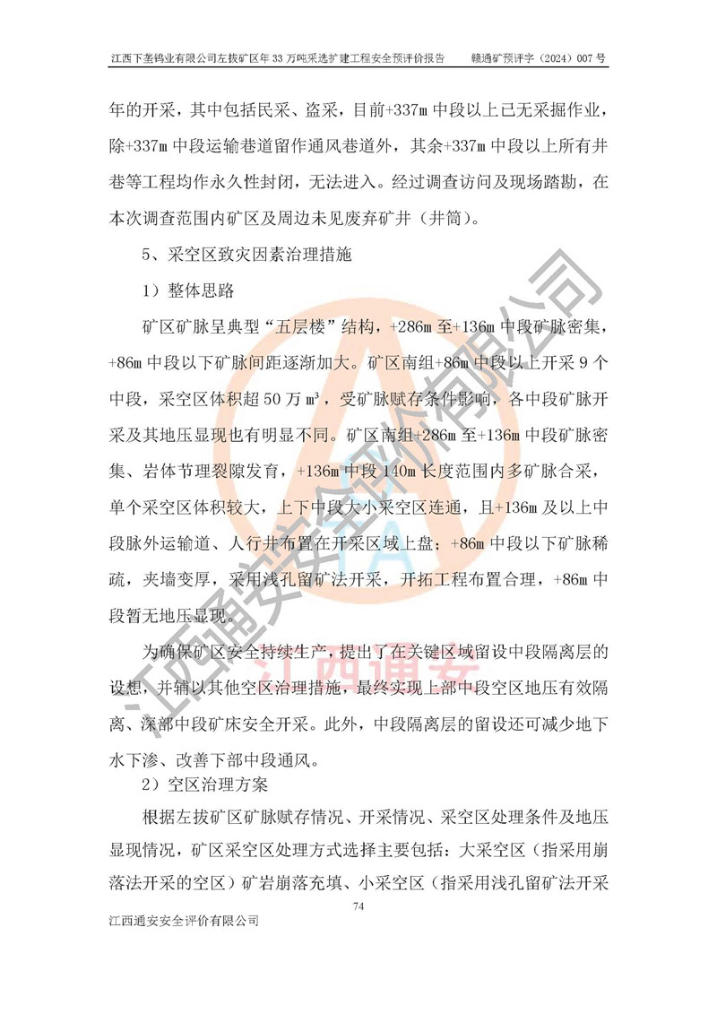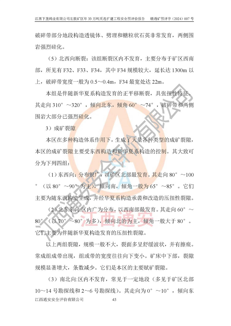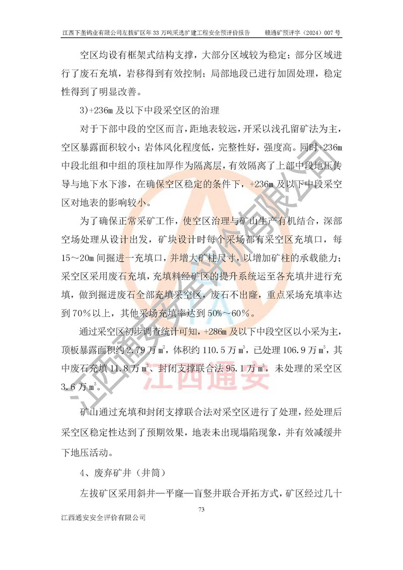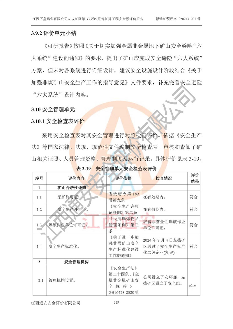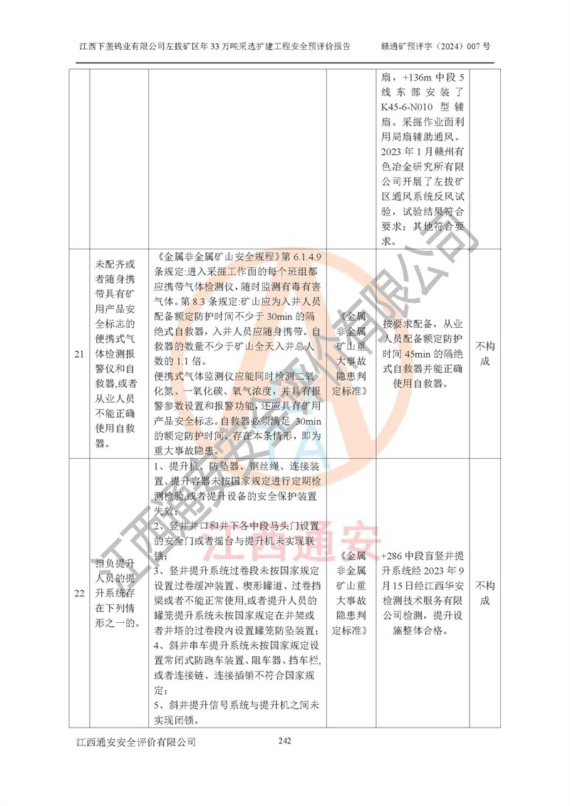 其它 | 江西下壟鎢業(yè)有限公司左拔礦區(qū)年33萬噸采選擴(kuò)建工程方案可行、選用的工藝和設(shè)備成熟、系統(tǒng)總體可靠,礦山具有建設(shè)、生產(chǎn)和管理的經(jīng)驗(yàn)和基礎(chǔ),在采納《可研報(bào)告》和本安全預(yù)評(píng)價(jià)報(bào)告提出的安全對(duì)策措施的基礎(chǔ)上,嚴(yán)把工程建設(shè)質(zhì)量關(guān)和現(xiàn)場(chǎng)安全管理,安全設(shè)施做到與主體工程同時(shí)設(shè)計(jì)、同時(shí)施工、同時(shí)投產(chǎn)使用,該擴(kuò)建工程安全風(fēng)險(xiǎn)處在可控制的范圍,符合**有關(guān)安全生產(chǎn)法律、法規(guī)、規(guī)章、標(biāo)準(zhǔn)和規(guī)范的要求。 | ||||