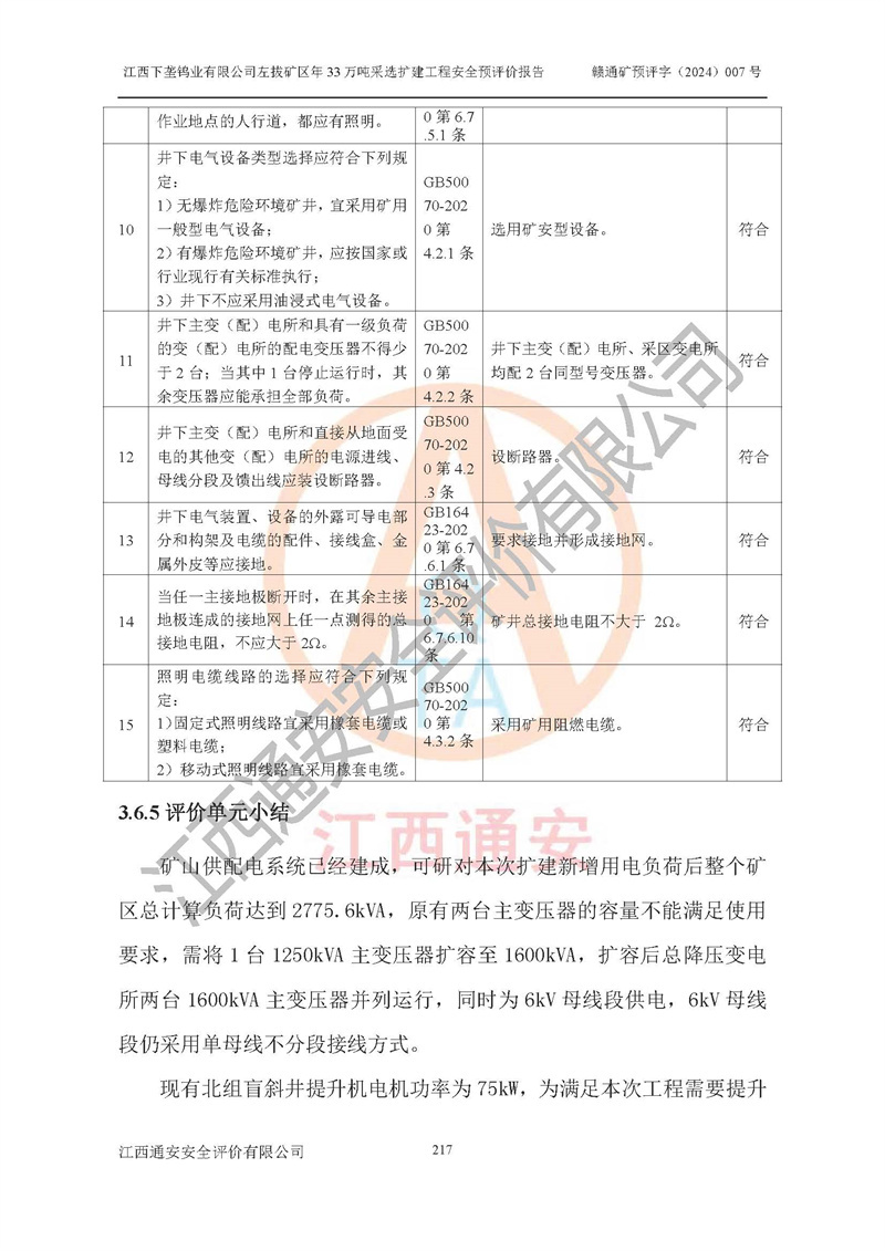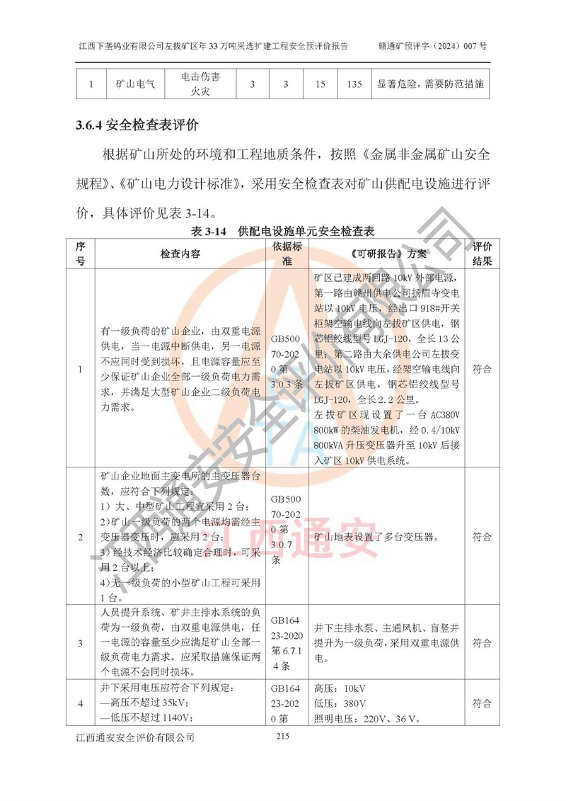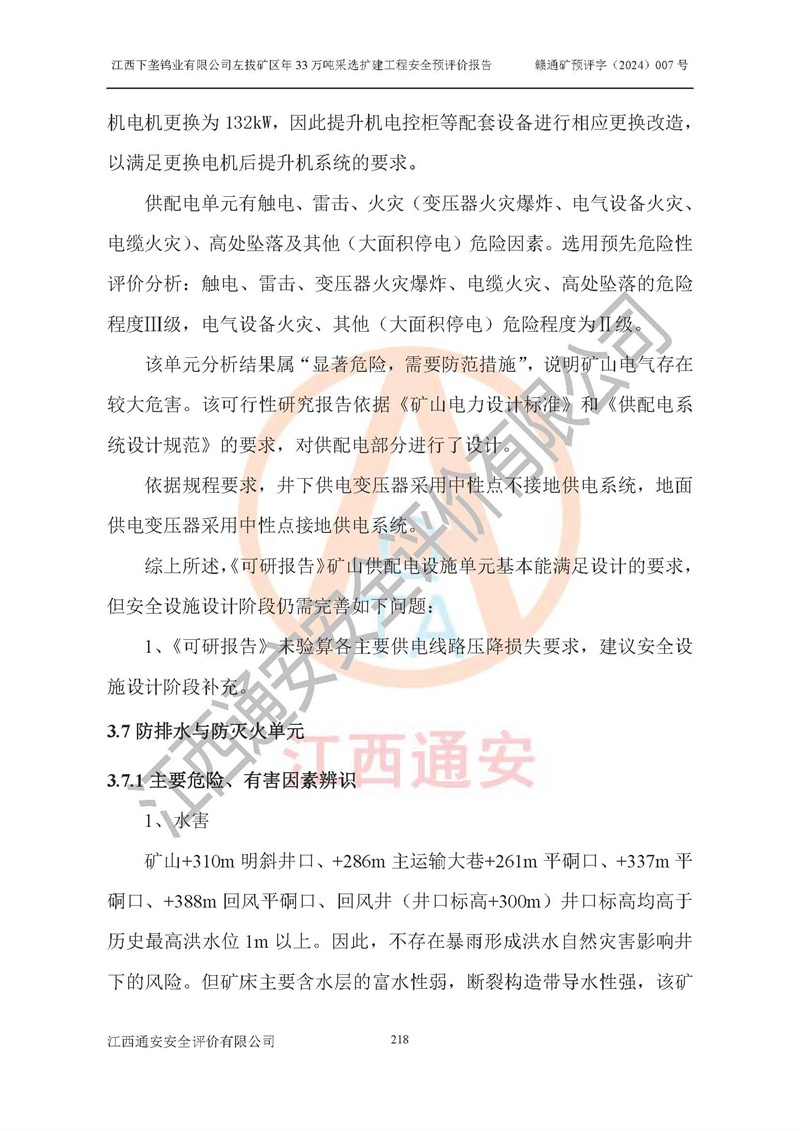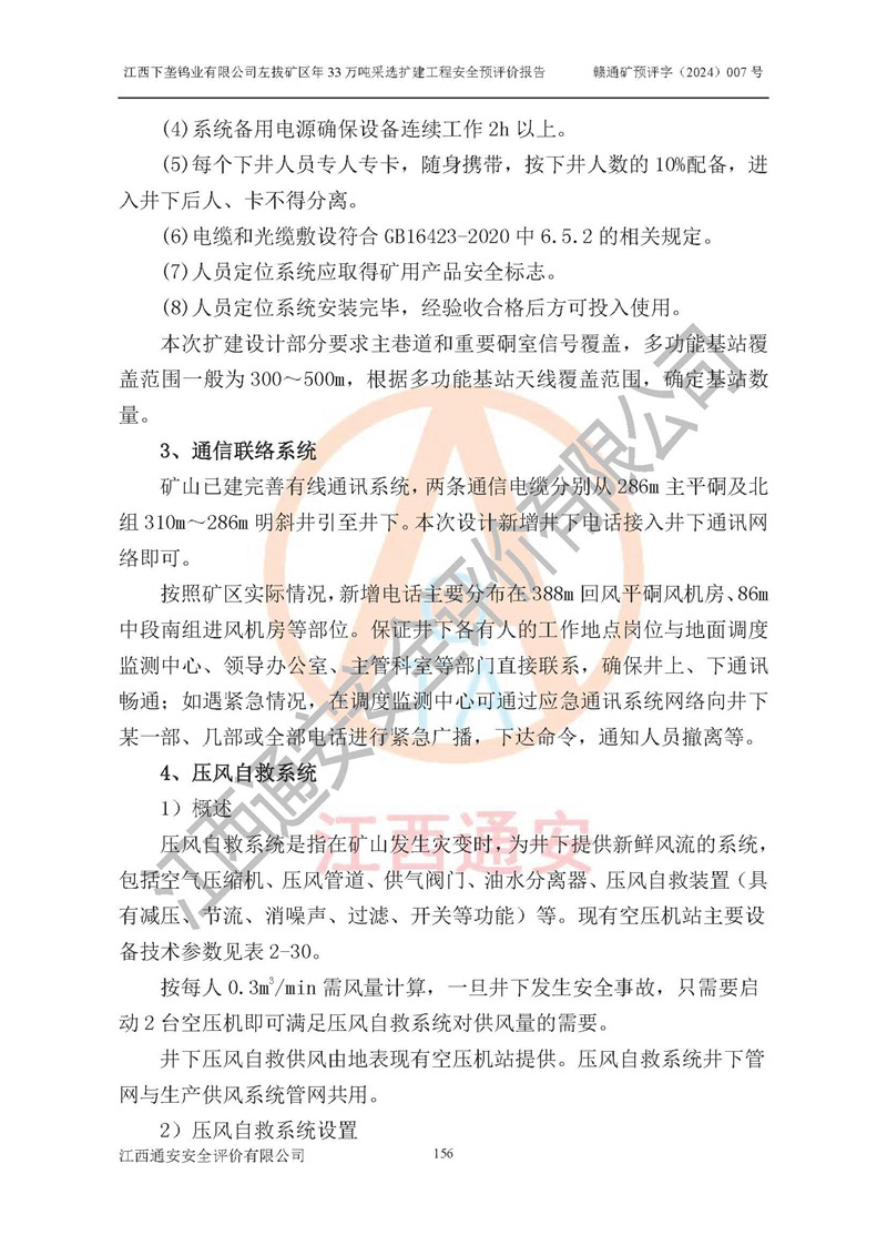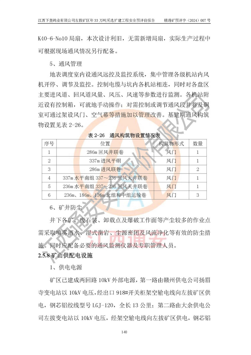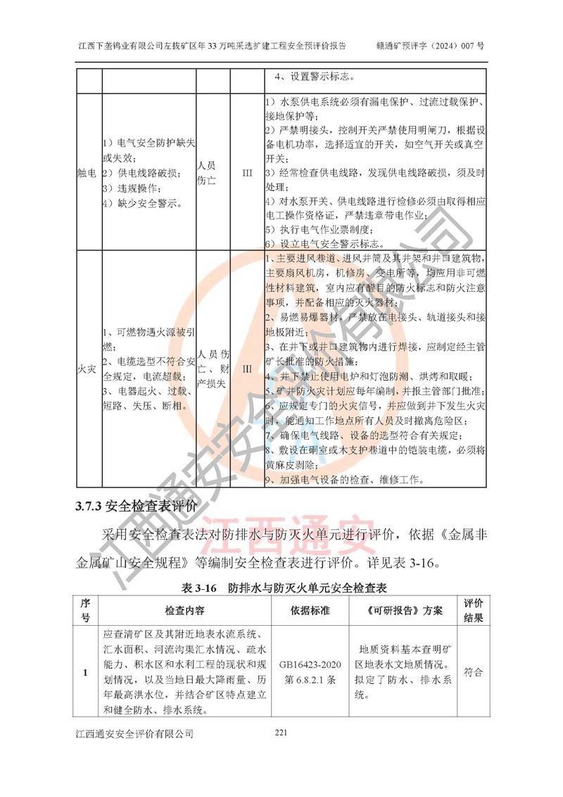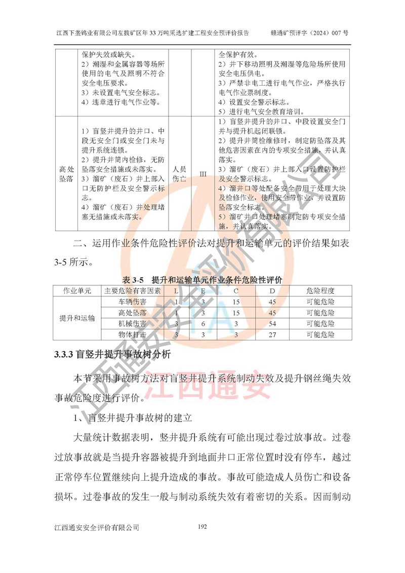 其它 | 江西下壟鎢業(yè)有限公司左拔礦區(qū)年33萬噸采選擴(kuò)建工程方案可行、選用的工藝和設(shè)備成熟、系統(tǒng)總體可靠,礦山具有建設(shè)、生產(chǎn)和管理的經(jīng)驗(yàn)和基礎(chǔ),在采納《可研報(bào)告》和本安全預(yù)評(píng)價(jià)報(bào)告提出的安全對(duì)策措施的基礎(chǔ)上,嚴(yán)把工程建設(shè)質(zhì)量關(guān)和現(xiàn)場(chǎng)安全管理,安全設(shè)施做到與主體工程同時(shí)設(shè)計(jì)、同時(shí)施工、同時(shí)投產(chǎn)使用,該擴(kuò)建工程安全風(fēng)險(xiǎn)處在可控制的范圍,符合**有關(guān)安全生產(chǎn)法律、法規(guī)、規(guī)章、標(biāo)準(zhǔn)和規(guī)范的要求。 | ||||