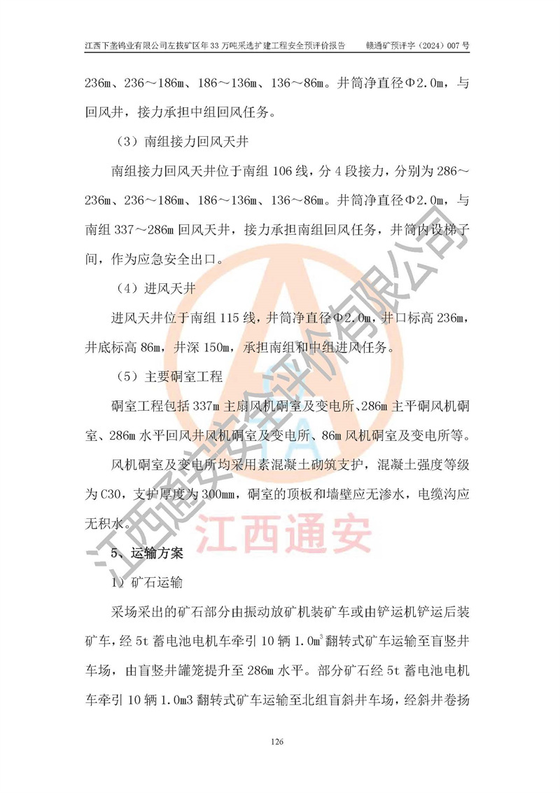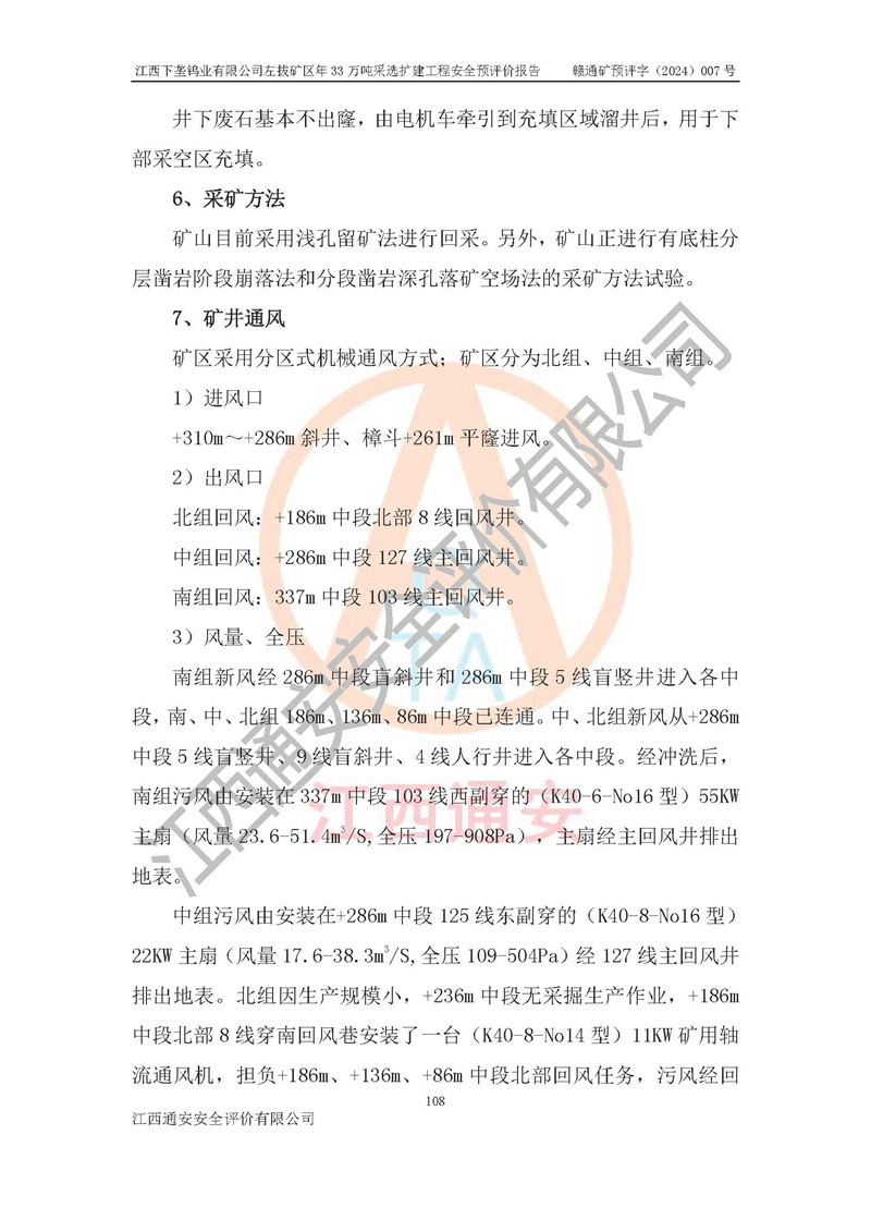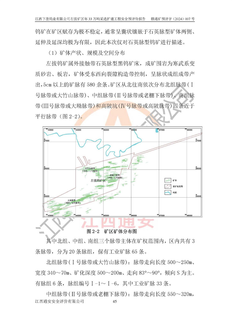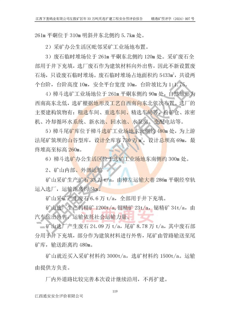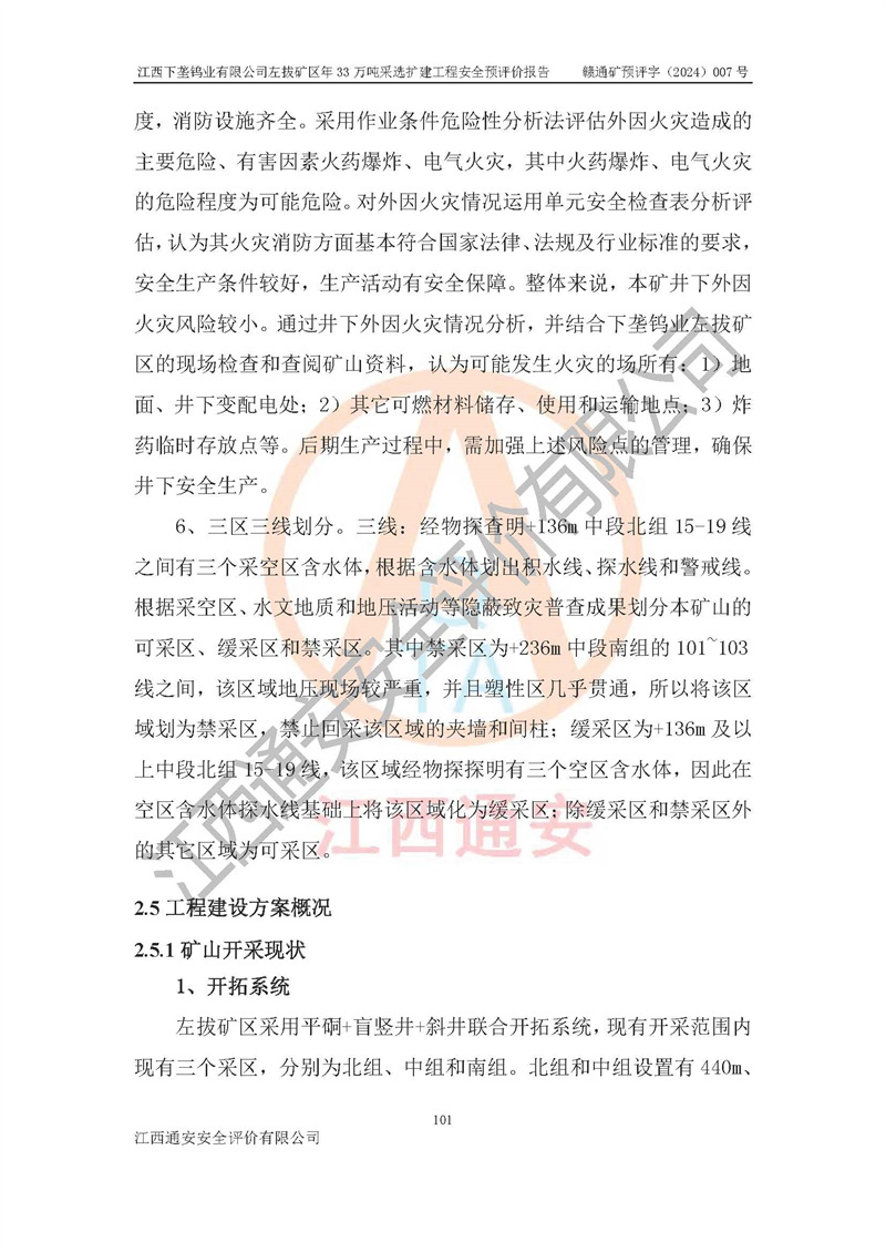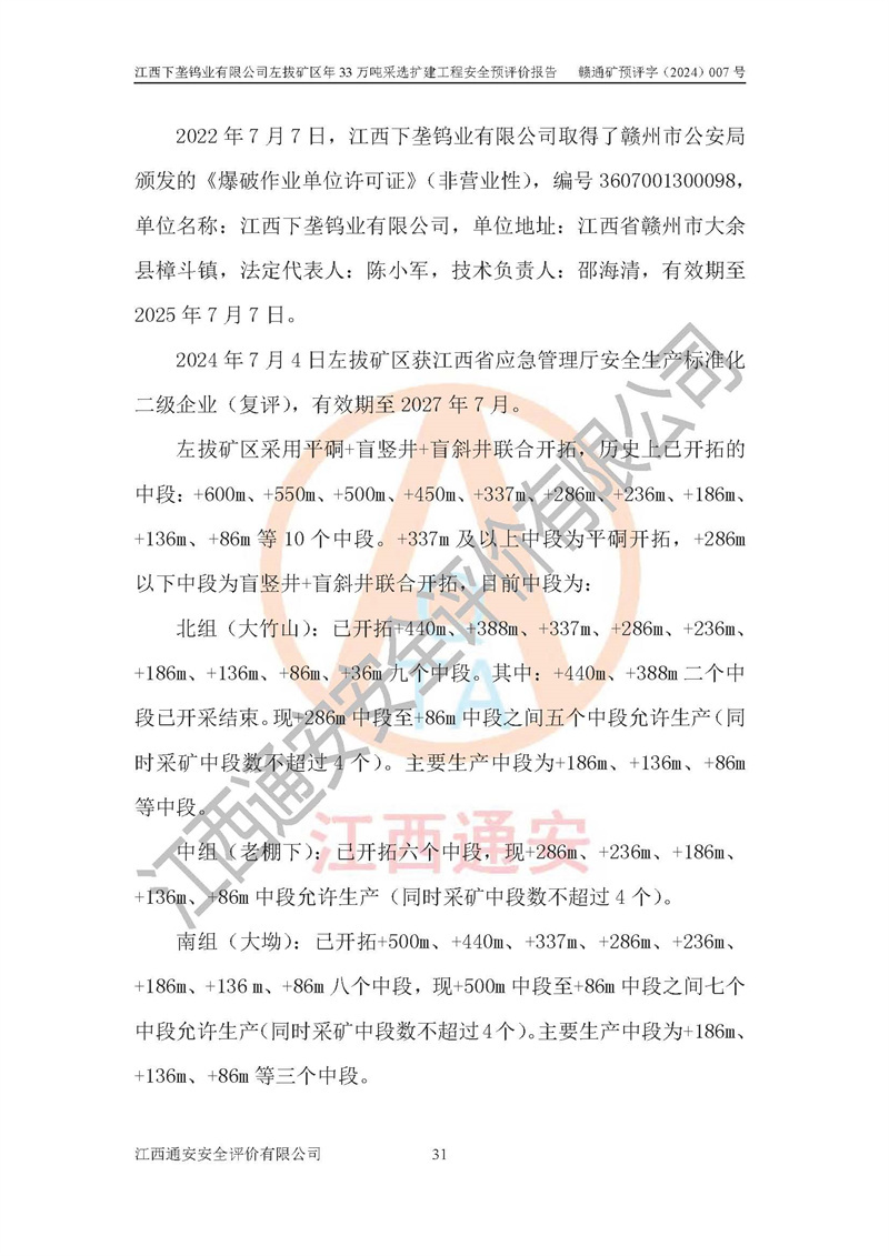 項(xiàng)目簡介 | 江西下壟鎢業(yè)有限公司左拔礦區(qū)是一個(gè)歷經(jīng)80多年開采歷史的老礦山。左拔礦區(qū)位于江西省大余縣左拔鎮(zhèn)境內(nèi),礦區(qū)中心地理坐標(biāo):東經(jīng)114°26′15″,北緯25°32′05″,礦區(qū)位于大余縣城26°方位,直距18**。左拔礦區(qū)往南22**到達(dá)323國道(大余縣黃龍鎮(zhèn))及柏油公路省道。323國道西行約24**到達(dá)大余縣城、西行97**到達(dá)廣東省韶關(guān)市;東行53**到達(dá)105國道、東行71**到達(dá)贛州市。附近有贛韶鐵路、南韶高速,交通較便利。 江西下壟鎢業(yè)有限公司目前在產(chǎn)礦區(qū)為左拔礦區(qū)和樟斗礦區(qū),左拔礦區(qū)證載生產(chǎn)規(guī)模為11萬t/a,樟斗礦區(qū)證載生產(chǎn)規(guī)模為19萬t/a。兩礦區(qū)共同供礦到樟斗選廠。目前,樟斗礦區(qū)資源儲(chǔ)備較少,逐步進(jìn)入減產(chǎn)階段,礦山主要生產(chǎn)重心已轉(zhuǎn)至左拔礦區(qū)。為保障下壟鎢業(yè)生產(chǎn)的可持續(xù)性,樟斗礦區(qū)逐步減產(chǎn),左拔礦區(qū)原礦生產(chǎn)規(guī)模需由現(xiàn)有的11萬t/a擴(kuò)大至33萬t/a。 2006年7月南昌有色冶金設(shè)計(jì)院編制了《江西下壟鎢業(yè)有限公司左拔礦區(qū)初步設(shè)計(jì)說明書》。2011年通過江西省安全生產(chǎn)監(jiān)督管理局組織的竣工驗(yàn)收。礦山在前期設(shè)計(jì)中考慮了以后擴(kuò)建的可能,原設(shè)計(jì)已經(jīng)對(duì)控制工程進(jìn)行了預(yù)留,現(xiàn)有部分系統(tǒng)仍滿足本次擴(kuò)建的需要,但需對(duì)不足部分進(jìn)行補(bǔ)充完善。因此,江西下壟鎢業(yè)有限公司委托金建工程設(shè)計(jì)有限公司在左拔礦區(qū)現(xiàn)有礦權(quán)范圍內(nèi),開展左拔礦區(qū)年33萬噸采選擴(kuò)建工程的設(shè)計(jì)工作。2023年10月金建工程設(shè)計(jì)有限公司編制完成了《江西下壟鎢業(yè)有限公司左拔礦區(qū)年33萬噸采選擴(kuò)建工程可行性研究報(bào)告》(以下簡稱《可研報(bào)告》),為整體設(shè)計(jì)的前期技術(shù)工作,作為礦山立項(xiàng)、采礦證變更等工作的依據(jù)。江西下壟鎢業(yè)有限公司已向江西省工業(yè)和信息化廳申請(qǐng)江西下壟鎢業(yè)有限公司左拔礦區(qū)年33萬噸采選擴(kuò)建工程項(xiàng)目核準(zhǔn)備案手續(xù)。 根據(jù)《可研報(bào)告》,可研設(shè)計(jì)范圍為采礦許可證礦區(qū)范圍內(nèi)整個(gè)左拔礦區(qū)。江西下壟鎢業(yè)有限公司左拔礦區(qū)年33萬噸采選擴(kuò)建工程項(xiàng)目性質(zhì):擴(kuò)建,生產(chǎn)規(guī)模由11萬t/a擴(kuò)大至33萬t/a。選礦及尾礦經(jīng)校核可利舊,無需改造。本次設(shè)計(jì)僅涉及采礦部分,新增部分采礦工程及配套輔助設(shè)施,并對(duì)現(xiàn)有工程及設(shè)施進(jìn)行校核,對(duì)不足部分予以補(bǔ)充完善。新增主要井巷工程有:北組回風(fēng)天井、中組回風(fēng)天井、南組回風(fēng)天井、進(jìn)風(fēng)天井、進(jìn)回風(fēng)聯(lián)巷、采切工程、輔助硐室等。 本項(xiàng)目已經(jīng)符合編制安全預(yù)評(píng)價(jià)的前置條件,根據(jù)《中華人民共和國安全生產(chǎn)法》、《建設(shè)項(xiàng)目安全設(shè)施“三同時(shí)”監(jiān)督管理辦法》(**安全生產(chǎn)監(jiān)督管理局令第36號(hào))和《金屬非金屬礦山建設(shè)項(xiàng)目安全設(shè)施目錄》(**安全生產(chǎn)監(jiān)督管理總局令第75號(hào))的規(guī)定,江西下壟鎢業(yè)有限公司2024年7月1日委托我公司(江西通安安全評(píng)價(jià)有限公司)對(duì)其左拔礦區(qū)年33萬噸選擴(kuò)建工程項(xiàng)目進(jìn)行安全預(yù)評(píng)價(jià)。 | ||||