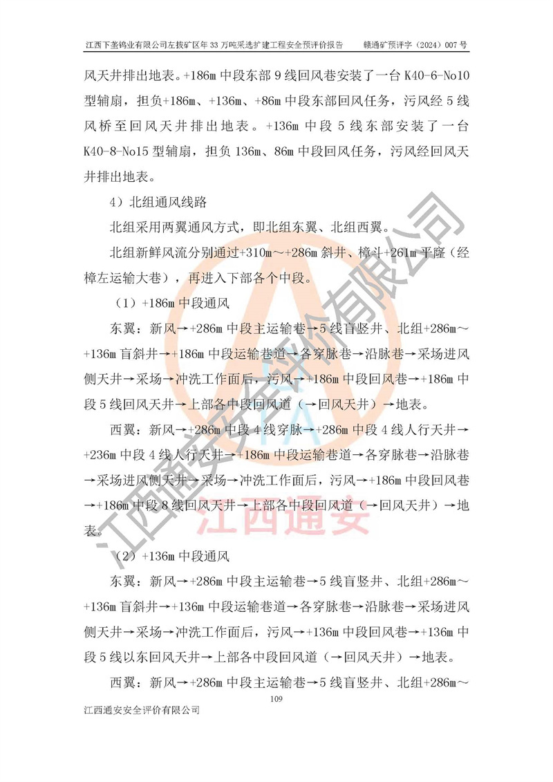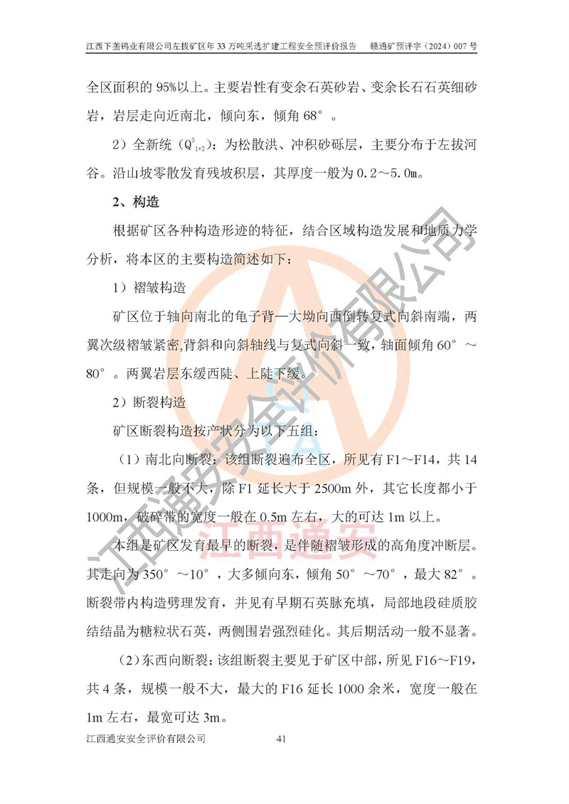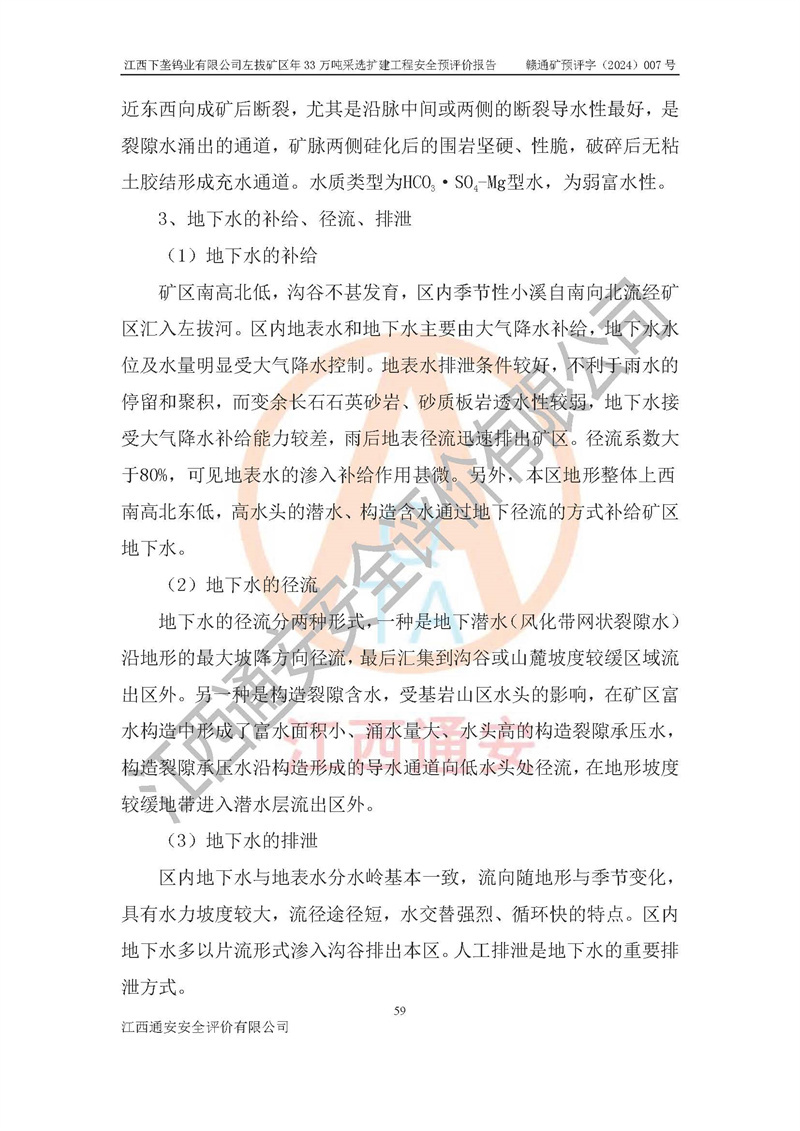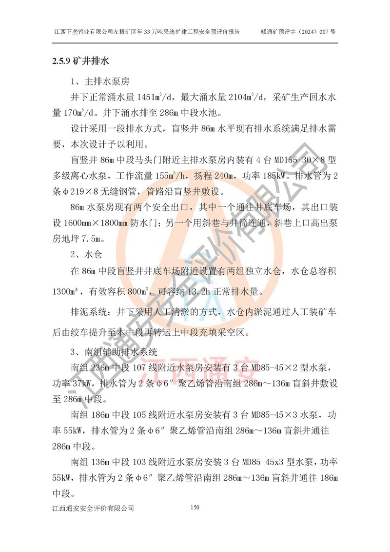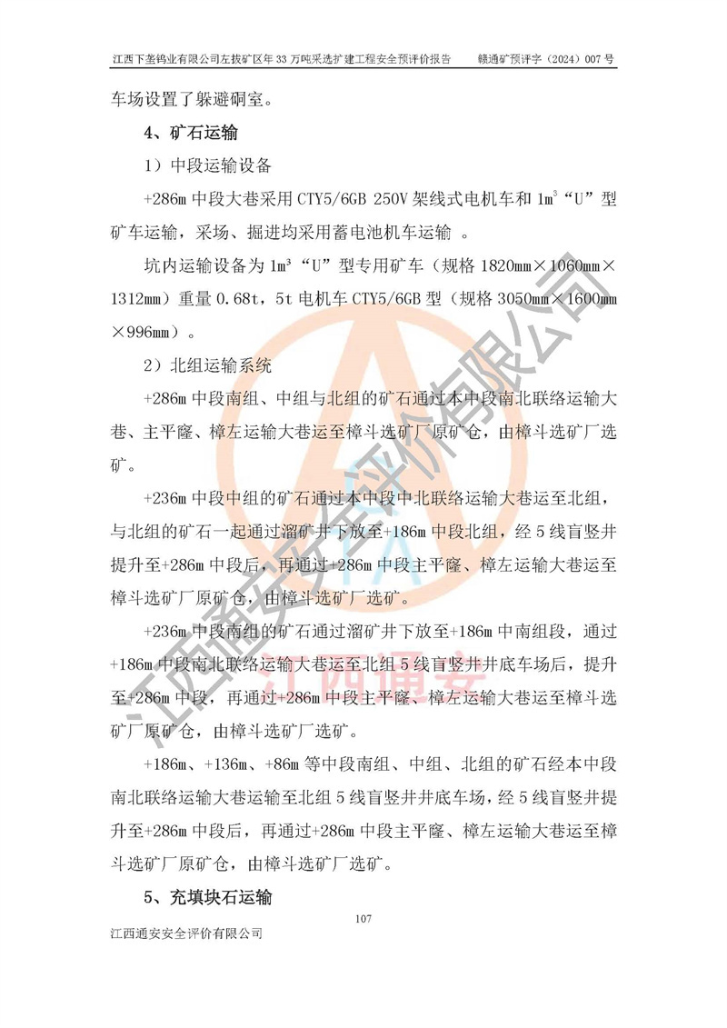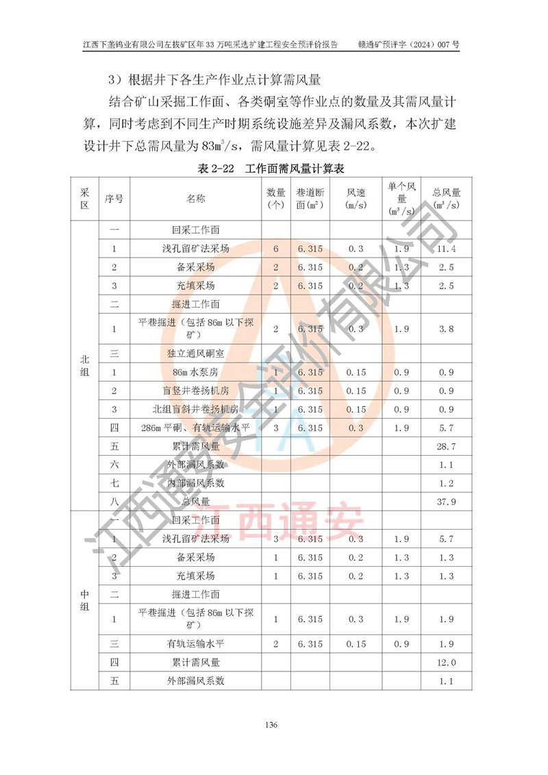 項(xiàng)目簡介 | 江西下壟鎢業(yè)有限公司左拔礦區(qū)是一個(gè)歷經(jīng)80多年開采歷史的老礦山。左拔礦區(qū)位于江西省大余縣左拔鎮(zhèn)境內(nèi),礦區(qū)中心地理坐標(biāo):東經(jīng)114°26′15″,北緯25°32′05″,礦區(qū)位于大余縣城26°方位,直距18**。左拔礦區(qū)往南22**到達(dá)323國道(大余縣黃龍鎮(zhèn))及柏油公路省道。323國道西行約24**到達(dá)大余縣城、西行97**到達(dá)廣東省韶關(guān)市;東行53**到達(dá)105國道、東行71**到達(dá)贛州市。附近有贛韶鐵路、南韶高速,交通較便利。 江西下壟鎢業(yè)有限公司目前在產(chǎn)礦區(qū)為左拔礦區(qū)和樟斗礦區(qū),左拔礦區(qū)證載生產(chǎn)規(guī)模為11萬t/a,樟斗礦區(qū)證載生產(chǎn)規(guī)模為19萬t/a。兩礦區(qū)共同供礦到樟斗選廠。目前,樟斗礦區(qū)資源儲(chǔ)備較少,逐步進(jìn)入減產(chǎn)階段,礦山主要生產(chǎn)重心已轉(zhuǎn)至左拔礦區(qū)。為保障下壟鎢業(yè)生產(chǎn)的可持續(xù)性,樟斗礦區(qū)逐步減產(chǎn),左拔礦區(qū)原礦生產(chǎn)規(guī)模需由現(xiàn)有的11萬t/a擴(kuò)大至33萬t/a。 2006年7月南昌有色冶金設(shè)計(jì)院編制了《江西下壟鎢業(yè)有限公司左拔礦區(qū)初步設(shè)計(jì)說明書》。2011年通過江西省安全生產(chǎn)監(jiān)督管理局組織的竣工驗(yàn)收。礦山在前期設(shè)計(jì)中考慮了以后擴(kuò)建的可能,原設(shè)計(jì)已經(jīng)對(duì)控制工程進(jìn)行了預(yù)留,現(xiàn)有部分系統(tǒng)仍滿足本次擴(kuò)建的需要,但需對(duì)不足部分進(jìn)行補(bǔ)充完善。因此,江西下壟鎢業(yè)有限公司委托金建工程設(shè)計(jì)有限公司在左拔礦區(qū)現(xiàn)有礦權(quán)范圍內(nèi),開展左拔礦區(qū)年33萬噸采選擴(kuò)建工程的設(shè)計(jì)工作。2023年10月金建工程設(shè)計(jì)有限公司編制完成了《江西下壟鎢業(yè)有限公司左拔礦區(qū)年33萬噸采選擴(kuò)建工程可行性研究報(bào)告》(以下簡稱《可研報(bào)告》),為整體設(shè)計(jì)的前期技術(shù)工作,作為礦山立項(xiàng)、采礦證變更等工作的依據(jù)。江西下壟鎢業(yè)有限公司已向江西省工業(yè)和信息化廳申請(qǐng)江西下壟鎢業(yè)有限公司左拔礦區(qū)年33萬噸采選擴(kuò)建工程項(xiàng)目核準(zhǔn)備案手續(xù)。 根據(jù)《可研報(bào)告》,可研設(shè)計(jì)范圍為采礦許可證礦區(qū)范圍內(nèi)整個(gè)左拔礦區(qū)。江西下壟鎢業(yè)有限公司左拔礦區(qū)年33萬噸采選擴(kuò)建工程項(xiàng)目性質(zhì):擴(kuò)建,生產(chǎn)規(guī)模由11萬t/a擴(kuò)大至33萬t/a。選礦及尾礦經(jīng)校核可利舊,無需改造。本次設(shè)計(jì)僅涉及采礦部分,新增部分采礦工程及配套輔助設(shè)施,并對(duì)現(xiàn)有工程及設(shè)施進(jìn)行校核,對(duì)不足部分予以補(bǔ)充完善。新增主要井巷工程有:北組回風(fēng)天井、中組回風(fēng)天井、南組回風(fēng)天井、進(jìn)風(fēng)天井、進(jìn)回風(fēng)聯(lián)巷、采切工程、輔助硐室等。 本項(xiàng)目已經(jīng)符合編制安全預(yù)評(píng)價(jià)的前置條件,根據(jù)《中華人民共和國安全生產(chǎn)法》、《建設(shè)項(xiàng)目安全設(shè)施“三同時(shí)”監(jiān)督管理辦法》(**安全生產(chǎn)監(jiān)督管理局令第36號(hào))和《金屬非金屬礦山建設(shè)項(xiàng)目安全設(shè)施目錄》(**安全生產(chǎn)監(jiān)督管理總局令第75號(hào))的規(guī)定,江西下壟鎢業(yè)有限公司2024年7月1日委托我公司(江西通安安全評(píng)價(jià)有限公司)對(duì)其左拔礦區(qū)年33萬噸選擴(kuò)建工程項(xiàng)目進(jìn)行安全預(yù)評(píng)價(jià)。 | ||||