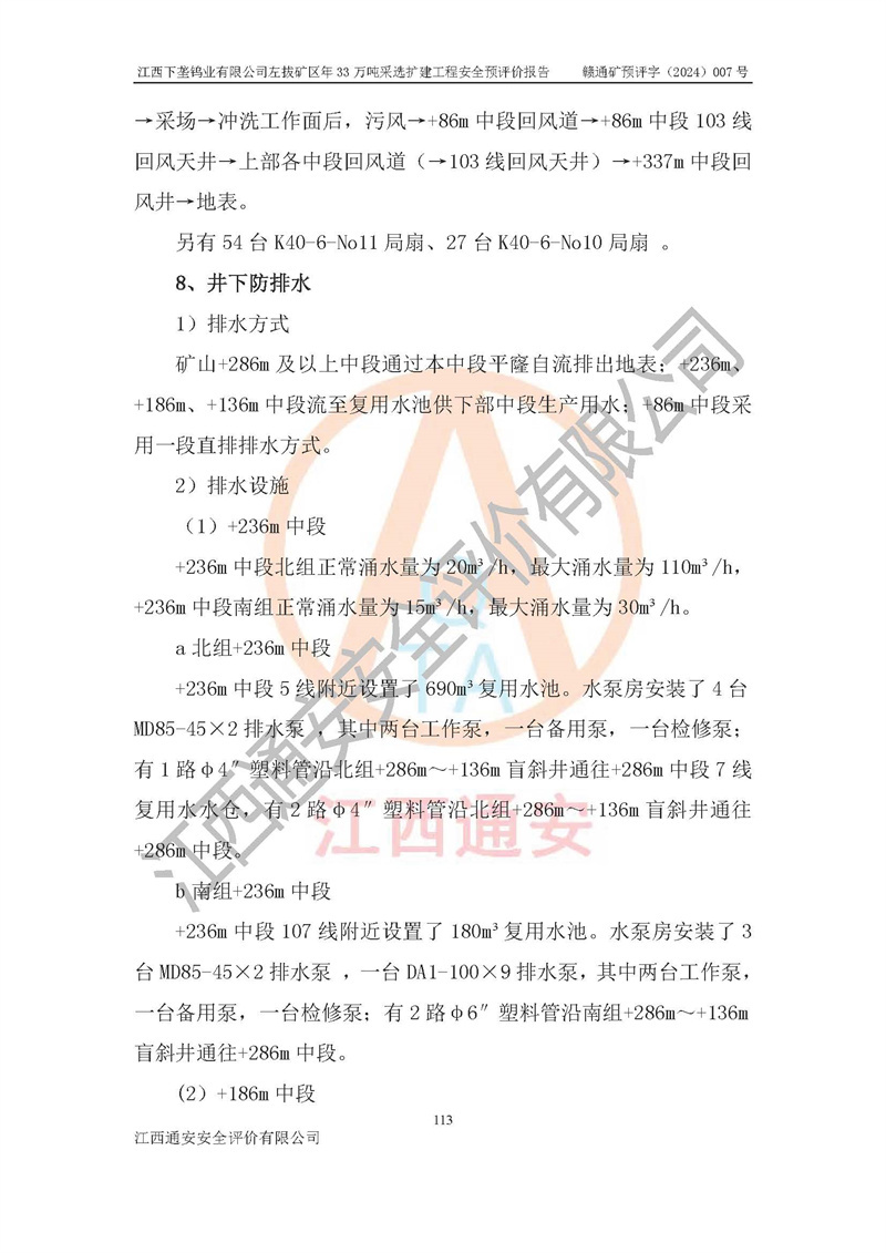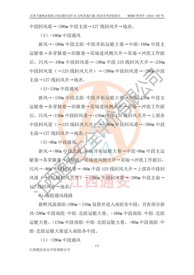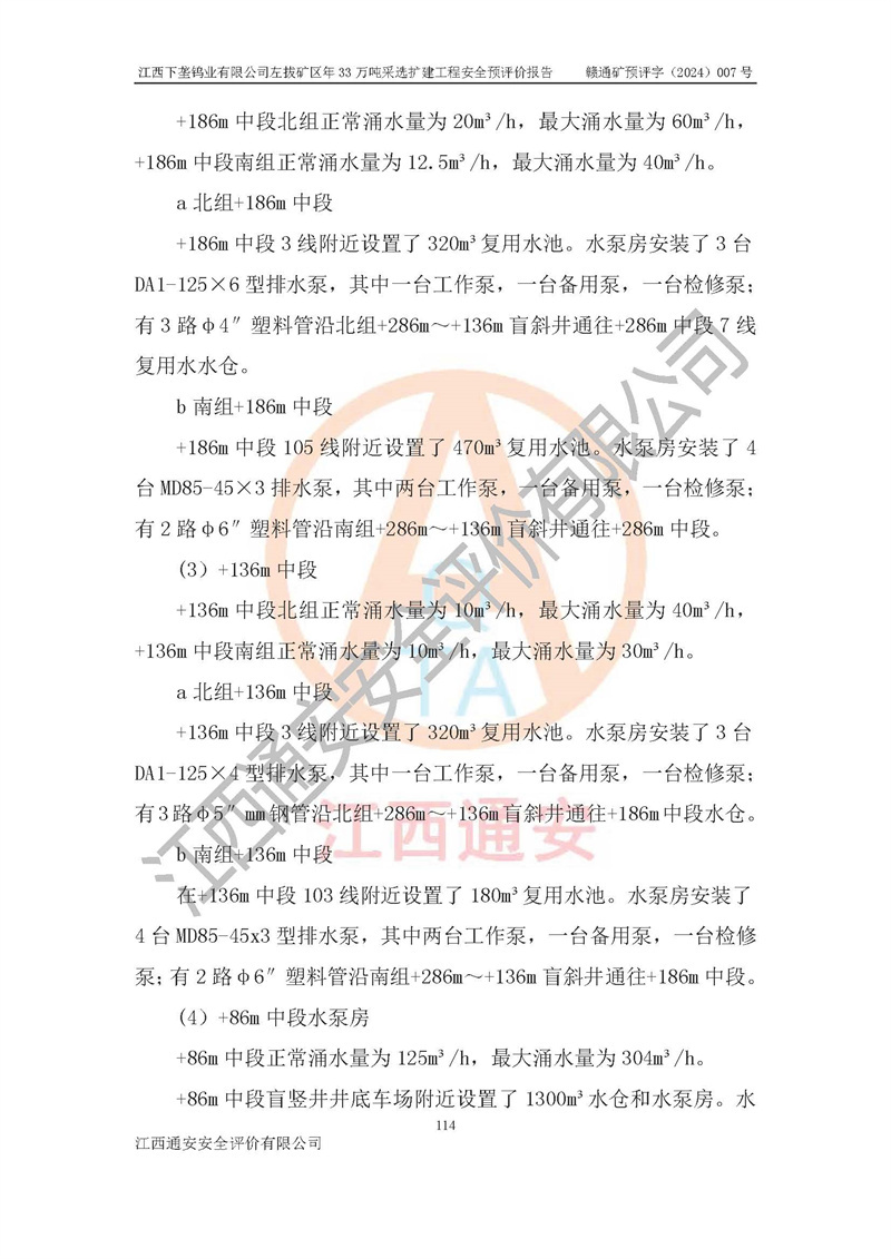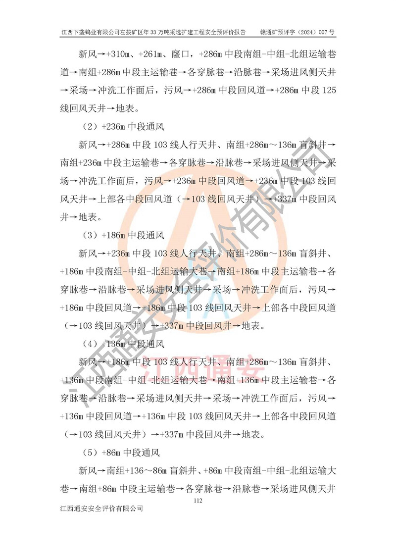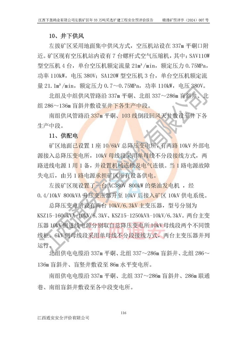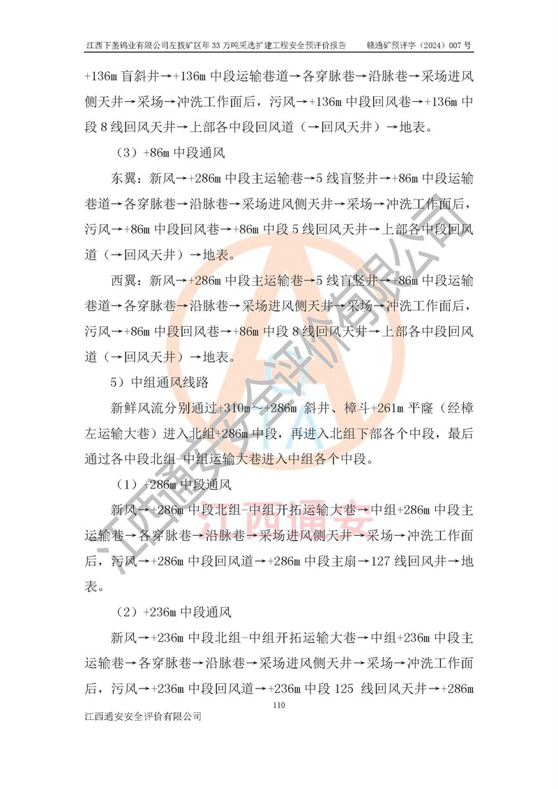 項(xiàng)目簡介 | 江西下壟鎢業(yè)有限公司左拔礦區(qū)是一個(gè)歷經(jīng)80多年開采歷史的老礦山。左拔礦區(qū)位于江西省大余縣左拔鎮(zhèn)境內(nèi),礦區(qū)中心地理坐標(biāo):東經(jīng)114°26′15″,北緯25°32′05″,礦區(qū)位于大余縣城26°方位,直距18**。左拔礦區(qū)往南22**到達(dá)323國道(大余縣黃龍鎮(zhèn))及柏油公路省道。323國道西行約24**到達(dá)大余縣城、西行97**到達(dá)廣東省韶關(guān)市;東行53**到達(dá)105國道、東行71**到達(dá)贛州市。附近有贛韶鐵路、南韶高速,交通較便利。 江西下壟鎢業(yè)有限公司目前在產(chǎn)礦區(qū)為左拔礦區(qū)和樟斗礦區(qū),左拔礦區(qū)證載生產(chǎn)規(guī)模為11萬t/a,樟斗礦區(qū)證載生產(chǎn)規(guī)模為19萬t/a。兩礦區(qū)共同供礦到樟斗選廠。目前,樟斗礦區(qū)資源儲(chǔ)備較少,逐步進(jìn)入減產(chǎn)階段,礦山主要生產(chǎn)重心已轉(zhuǎn)至左拔礦區(qū)。為保障下壟鎢業(yè)生產(chǎn)的可持續(xù)性,樟斗礦區(qū)逐步減產(chǎn),左拔礦區(qū)原礦生產(chǎn)規(guī)模需由現(xiàn)有的11萬t/a擴(kuò)大至33萬t/a。 2006年7月南昌有色冶金設(shè)計(jì)院編制了《江西下壟鎢業(yè)有限公司左拔礦區(qū)初步設(shè)計(jì)說明書》。2011年通過江西省安全生產(chǎn)監(jiān)督管理局組織的竣工驗(yàn)收。礦山在前期設(shè)計(jì)中考慮了以后擴(kuò)建的可能,原設(shè)計(jì)已經(jīng)對(duì)控制工程進(jìn)行了預(yù)留,現(xiàn)有部分系統(tǒng)仍滿足本次擴(kuò)建的需要,但需對(duì)不足部分進(jìn)行補(bǔ)充完善。因此,江西下壟鎢業(yè)有限公司委托金建工程設(shè)計(jì)有限公司在左拔礦區(qū)現(xiàn)有礦權(quán)范圍內(nèi),開展左拔礦區(qū)年33萬噸采選擴(kuò)建工程的設(shè)計(jì)工作。2023年10月金建工程設(shè)計(jì)有限公司編制完成了《江西下壟鎢業(yè)有限公司左拔礦區(qū)年33萬噸采選擴(kuò)建工程可行性研究報(bào)告》(以下簡稱《可研報(bào)告》),為整體設(shè)計(jì)的前期技術(shù)工作,作為礦山立項(xiàng)、采礦證變更等工作的依據(jù)。江西下壟鎢業(yè)有限公司已向江西省工業(yè)和信息化廳申請(qǐng)江西下壟鎢業(yè)有限公司左拔礦區(qū)年33萬噸采選擴(kuò)建工程項(xiàng)目核準(zhǔn)備案手續(xù)。 根據(jù)《可研報(bào)告》,可研設(shè)計(jì)范圍為采礦許可證礦區(qū)范圍內(nèi)整個(gè)左拔礦區(qū)。江西下壟鎢業(yè)有限公司左拔礦區(qū)年33萬噸采選擴(kuò)建工程項(xiàng)目性質(zhì):擴(kuò)建,生產(chǎn)規(guī)模由11萬t/a擴(kuò)大至33萬t/a。選礦及尾礦經(jīng)校核可利舊,無需改造。本次設(shè)計(jì)僅涉及采礦部分,新增部分采礦工程及配套輔助設(shè)施,并對(duì)現(xiàn)有工程及設(shè)施進(jìn)行校核,對(duì)不足部分予以補(bǔ)充完善。新增主要井巷工程有:北組回風(fēng)天井、中組回風(fēng)天井、南組回風(fēng)天井、進(jìn)風(fēng)天井、進(jìn)回風(fēng)聯(lián)巷、采切工程、輔助硐室等。 本項(xiàng)目已經(jīng)符合編制安全預(yù)評(píng)價(jià)的前置條件,根據(jù)《中華人民共和國安全生產(chǎn)法》、《建設(shè)項(xiàng)目安全設(shè)施“三同時(shí)”監(jiān)督管理辦法》(**安全生產(chǎn)監(jiān)督管理局令第36號(hào))和《金屬非金屬礦山建設(shè)項(xiàng)目安全設(shè)施目錄》(**安全生產(chǎn)監(jiān)督管理總局令第75號(hào))的規(guī)定,江西下壟鎢業(yè)有限公司2024年7月1日委托我公司(江西通安安全評(píng)價(jià)有限公司)對(duì)其左拔礦區(qū)年33萬噸選擴(kuò)建工程項(xiàng)目進(jìn)行安全預(yù)評(píng)價(jià)。 | ||||