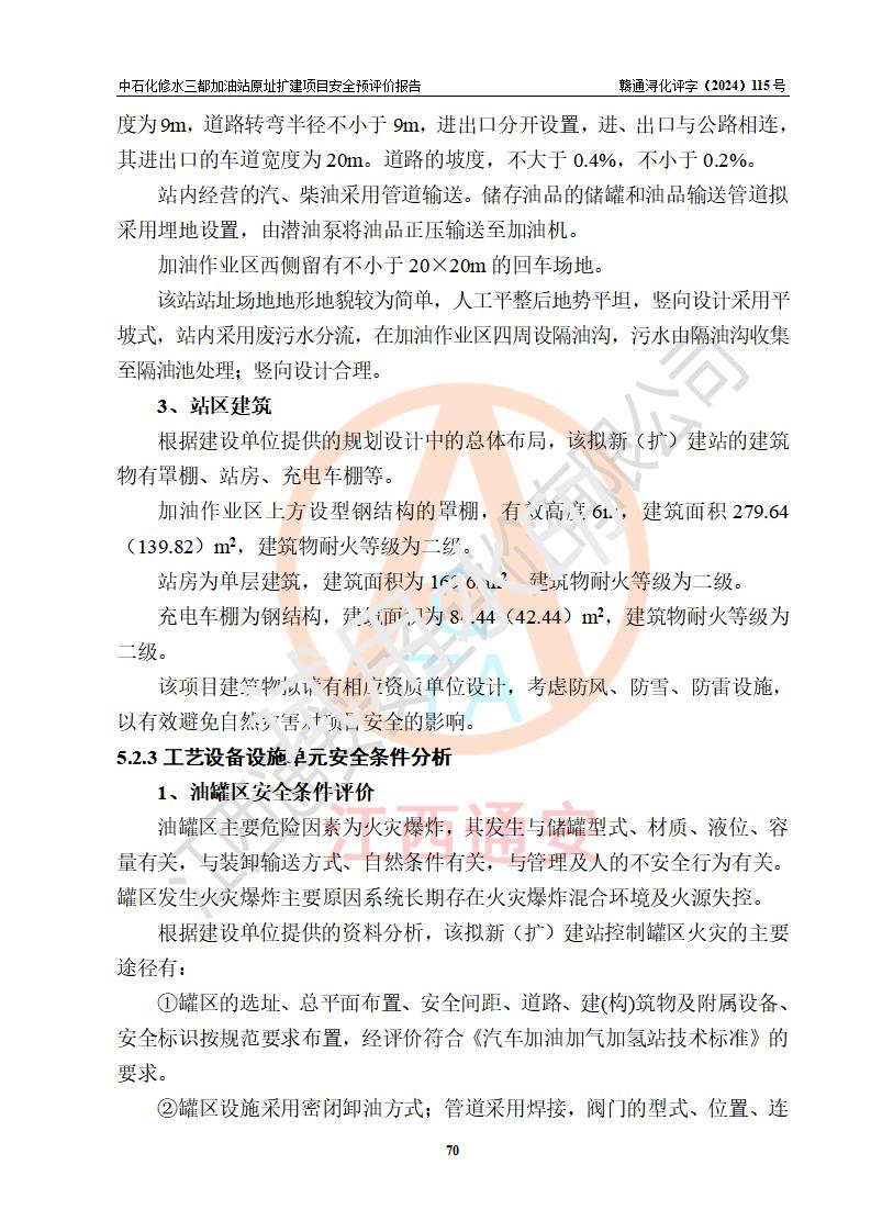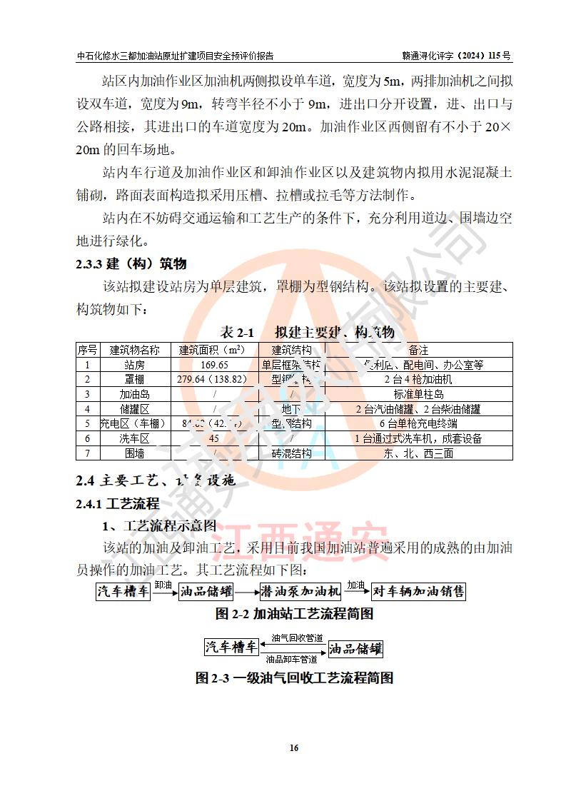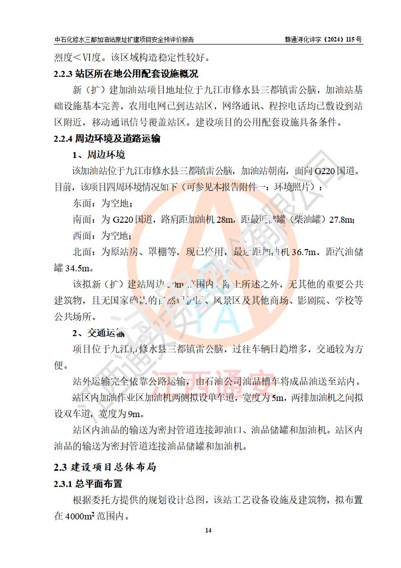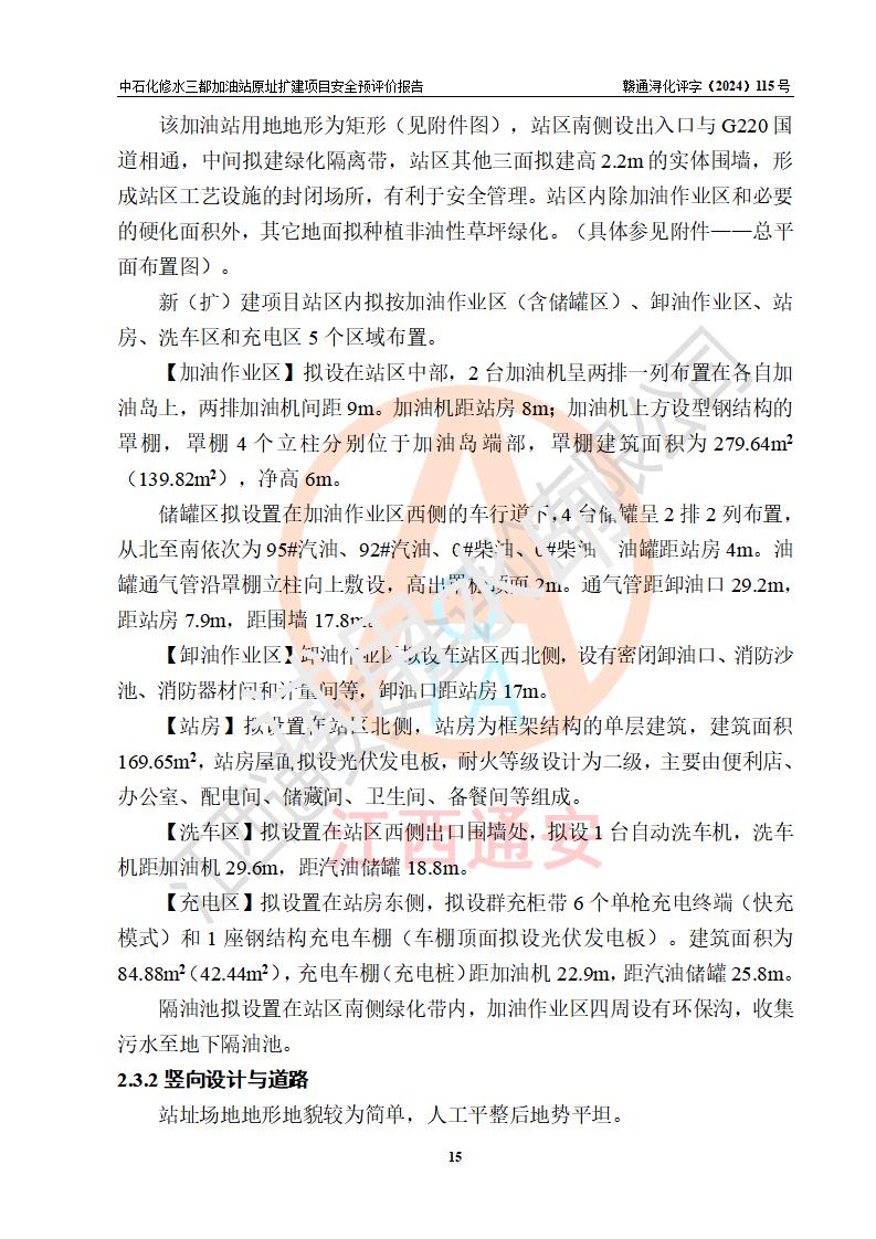 項目簡介 | 中國石化銷售股份有限公司江西九江修水石油分公司三都加油站是一家專門從事成品油零售經(jīng)營的有限公司分公司(外商投資企業(yè)分公司),經(jīng)營場所位于修水縣三都鎮(zhèn)雷公腦,現(xiàn)因道路改道,同時站內(nèi)建構(gòu)筑物老化嚴(yán)重,中國石化銷售股份有限公司江西九江修水石油分公司決定對該站進(jìn)行原址新建(擴(kuò)建)。新(擴(kuò))建項目已由修水縣商務(wù)局和九江市商務(wù)局核準(zhǔn)同意,同時已取得修水縣發(fā)改委簽發(fā)的《江西省企業(yè)投資項目備案通知書》,項目統(tǒng)一代碼為2308-360424-04-01-325427,該項目的建設(shè)用地已取得修水縣自然資源局頒發(fā)的不動產(chǎn)權(quán)證書:贛(2023)修水縣不動產(chǎn)權(quán)第0004759號。 加油站新(擴(kuò))建內(nèi)容為:原罐區(qū)、加油機(jī)和輔房拆除,原罩棚和站房停用,新建1棟站房、1座罩棚、罐區(qū)(4臺儲罐)、2臺四槍加油機(jī)、1座充電車棚(6個充電終端)、1座通過式洗車機(jī)等,站區(qū)整體朝向變更(原朝北,變更為朝南),總用地面積擴(kuò)大,儲油量增加。 擬新(擴(kuò))建加油站總用地面積為4000m2,站內(nèi)擬設(shè)2臺4槍潛油泵加油機(jī)及配套的工藝管線,擬設(shè)SF油品儲罐4臺,其中30m3的0#柴油儲罐2臺、30m3的92#汽油儲罐1臺、30m3的95#汽油儲罐1臺,油罐總?cè)莘e為120m3(折算成汽油容積為90m3),按現(xiàn)行的《汽車加油加氣加氫站技術(shù)標(biāo)準(zhǔn)》對加油站的等級劃分,屬三級加油站。 | |||