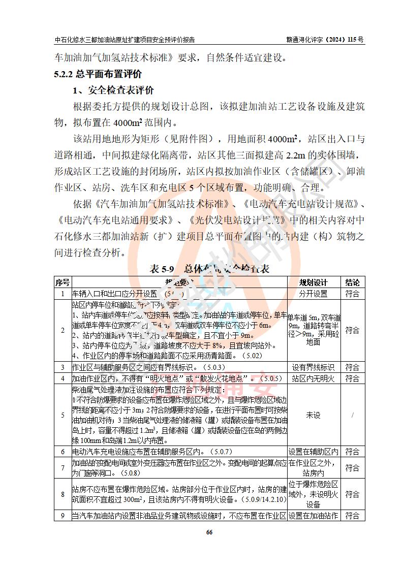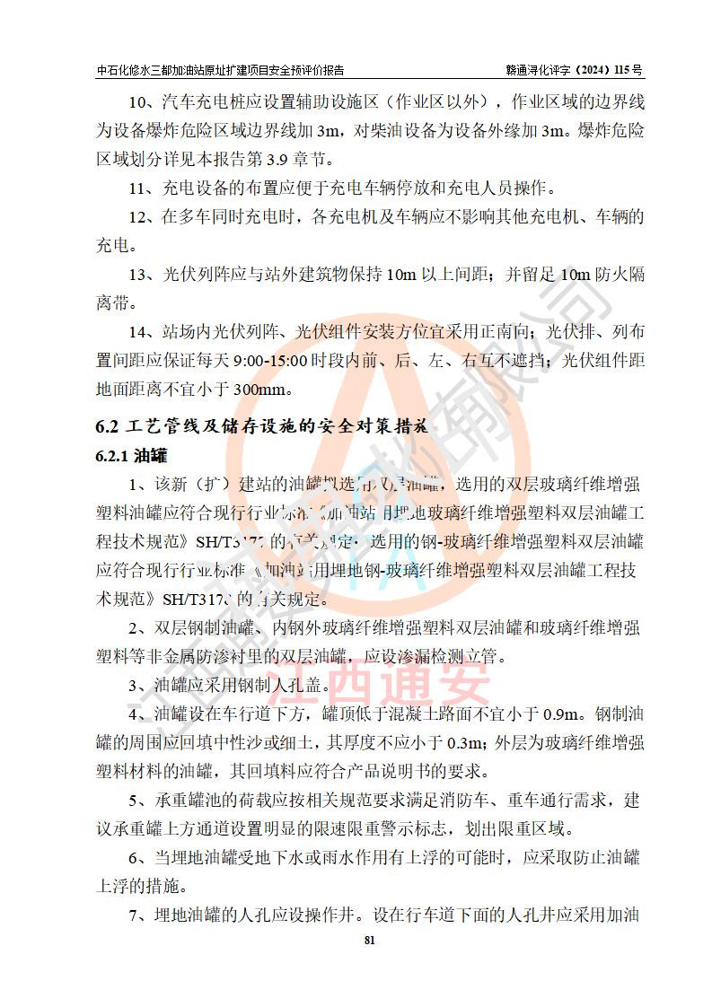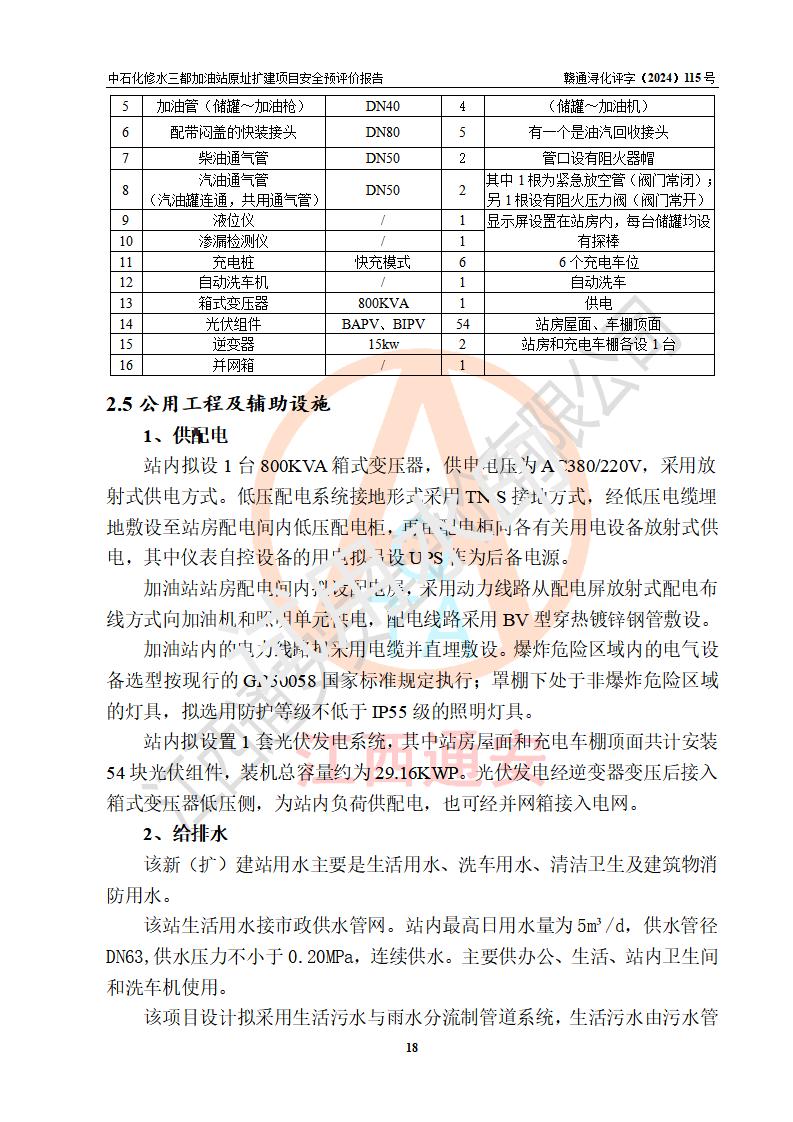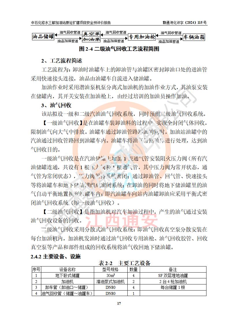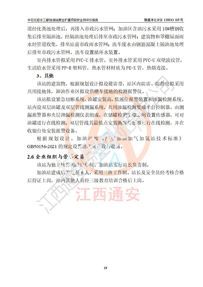 項目簡介 | 中國石化銷售股份有限公司江西九江修水石油分公司三都加油站是一家專門從事成品油零售經(jīng)營的有限公司分公司(外商投資企業(yè)分公司),經(jīng)營場所位于修水縣三都鎮(zhèn)雷公腦,現(xiàn)因道路改道,同時站內(nèi)建構(gòu)筑物老化嚴(yán)重,中國石化銷售股份有限公司江西九江修水石油分公司決定對該站進(jìn)行原址新建(擴(kuò)建)。新(擴(kuò))建項目已由修水縣商務(wù)局和九江市商務(wù)局核準(zhǔn)同意,同時已取得修水縣發(fā)改委簽發(fā)的《江西省企業(yè)投資項目備案通知書》,項目統(tǒng)一代碼為2308-360424-04-01-325427,該項目的建設(shè)用地已取得修水縣自然資源局頒發(fā)的不動產(chǎn)權(quán)證書:贛(2023)修水縣不動產(chǎn)權(quán)第0004759號。 加油站新(擴(kuò))建內(nèi)容為:原罐區(qū)、加油機(jī)和輔房拆除,原罩棚和站房停用,新建1棟站房、1座罩棚、罐區(qū)(4臺儲罐)、2臺四槍加油機(jī)、1座充電車棚(6個充電終端)、1座通過式洗車機(jī)等,站區(qū)整體朝向變更(原朝北,變更為朝南),總用地面積擴(kuò)大,儲油量增加。 擬新(擴(kuò))建加油站總用地面積為4000m2,站內(nèi)擬設(shè)2臺4槍潛油泵加油機(jī)及配套的工藝管線,擬設(shè)SF油品儲罐4臺,其中30m3的0#柴油儲罐2臺、30m3的92#汽油儲罐1臺、30m3的95#汽油儲罐1臺,油罐總?cè)莘e為120m3(折算成汽油容積為90m3),按現(xiàn)行的《汽車加油加氣加氫站技術(shù)標(biāo)準(zhǔn)》對加油站的等級劃分,屬三級加油站。 | |||