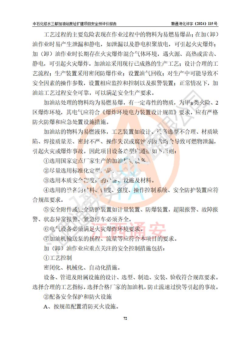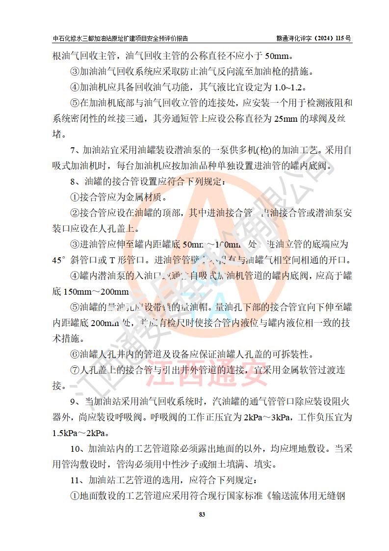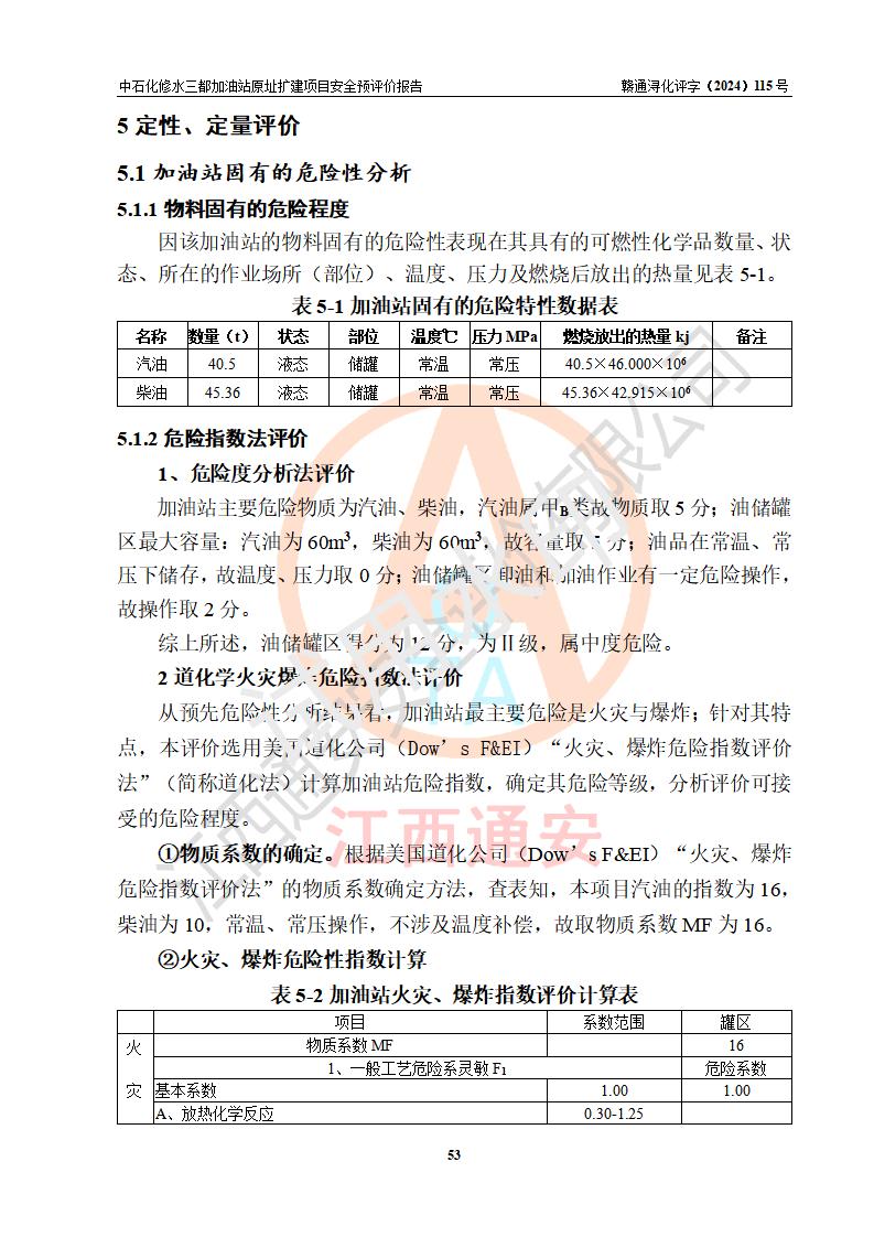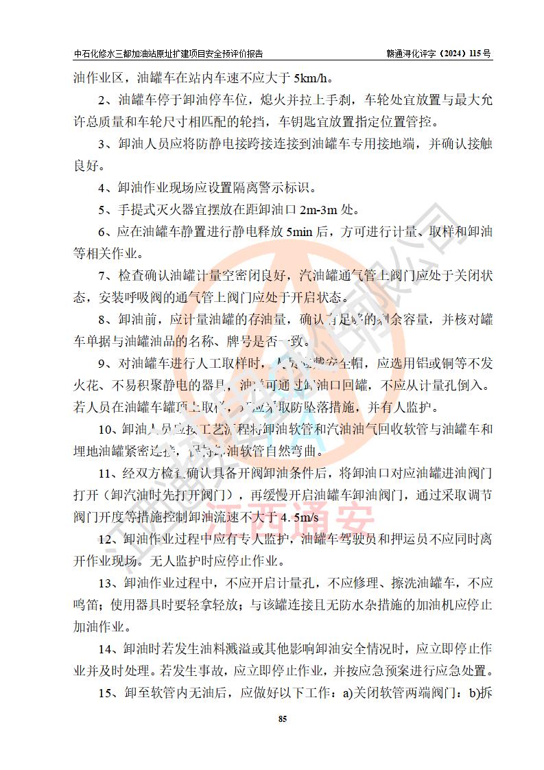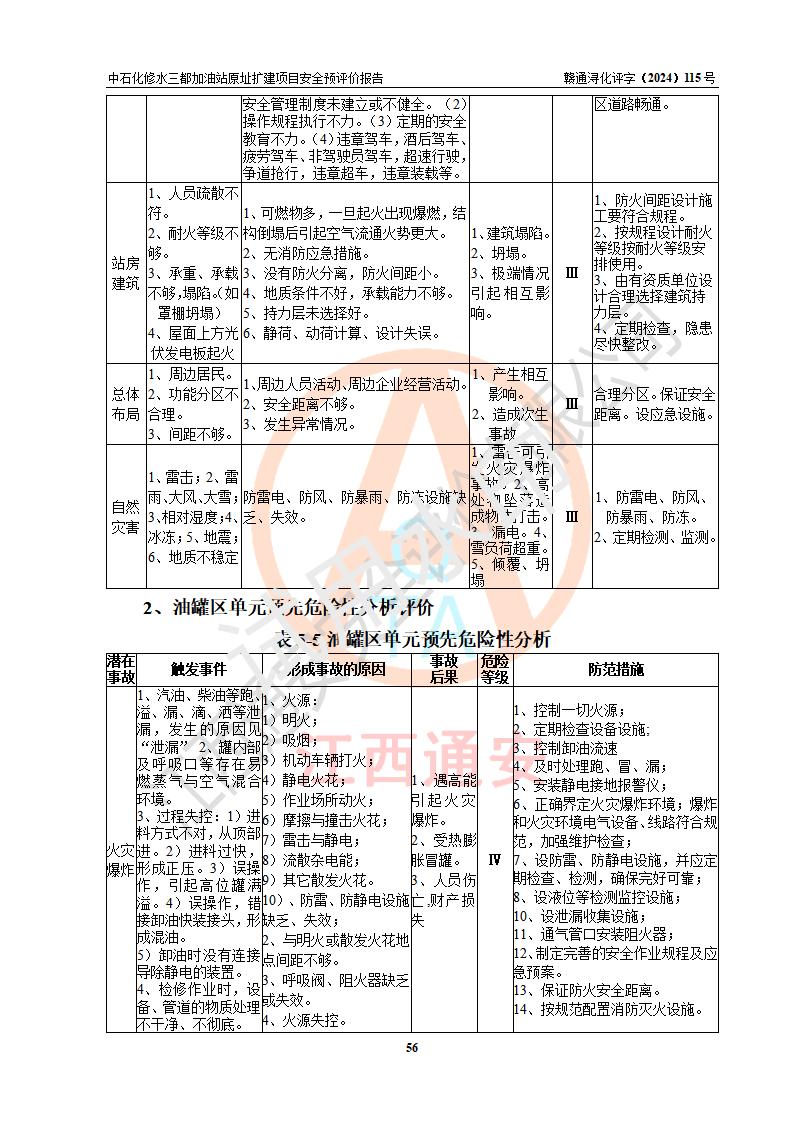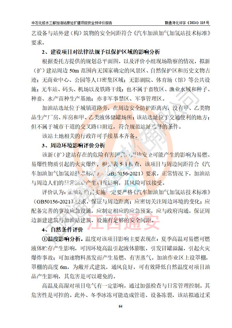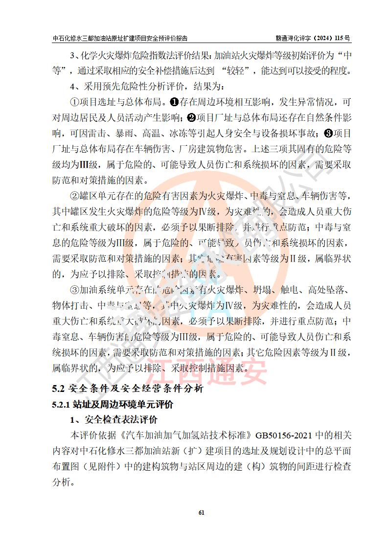 評價結(jié)論 | 中國石化銷售股份有限公司江西九江修水石油分公司三都加油站原址擴(kuò)建項目的選址、自然條件適宜該項目工程的建設(shè);項目規(guī)劃設(shè)計中的總體布局方案可行,符合有關(guān)法規(guī)、標(biāo)準(zhǔn)要求;項目選擇的工藝過程及設(shè)備設(shè)施的安全可靠性能達(dá)到**法規(guī)、標(biāo)準(zhǔn)規(guī)定要求;項目存在的危險有害因素可控,在落實項目建設(shè)方案及評價報告提出的有關(guān)安全對策措施后,其危險有害程度能達(dá)到可以接受的程度,項目建設(shè)能夠?qū)崿F(xiàn)安全運行的目標(biāo)。 | |||