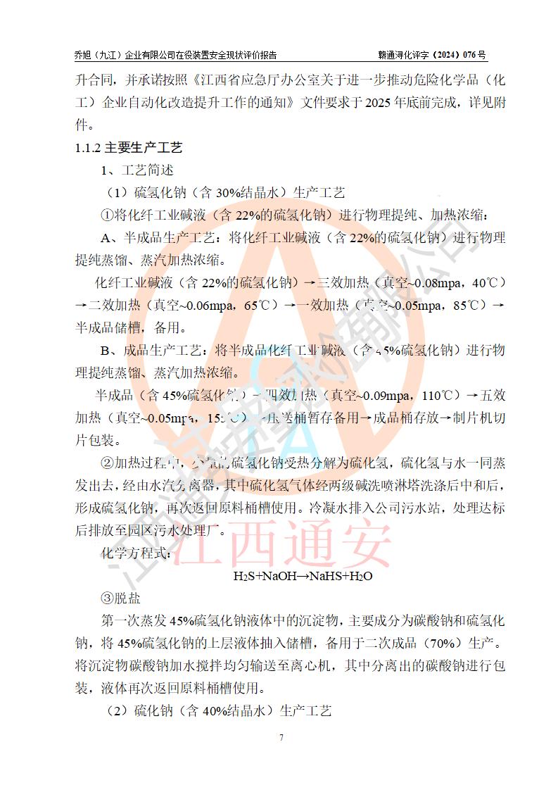 項(xiàng)目簡(jiǎn)介 | 喬旭(九江)企業(yè)有限公司是一家于2003年12月注冊(cè)成立的有限責(zé)任公司,注冊(cè)資金320萬(wàn)美元,位于江西省九江市湖口縣金砂灣工業(yè)園,主要從事化纖工業(yè)廢液的處理和綜合利用。 該企業(yè)年處理化纖工業(yè)廢液13600噸和綜合利用工程一期項(xiàng)目(生產(chǎn)硫氫化鈉)*早于2004年10月開(kāi)始生產(chǎn),于2006年3月取得危險(xiǎn)化學(xué)品安全生產(chǎn)許可證,許可范圍為硫氫化鈉(含30%結(jié)晶水),2009年辦理了生產(chǎn)許可證的延期。企業(yè)于2011年2月建成了年處理化纖工業(yè)廢液13600噸和綜合利用二期工程項(xiàng)目(生產(chǎn)硫氫化鈉、硫化鈉)。至此,總的生產(chǎn)能力為年生產(chǎn)5.9kt硫氫化鈉(含30%結(jié)晶水)、2kt硫化鈉(含40%結(jié)晶水)。 | |||||