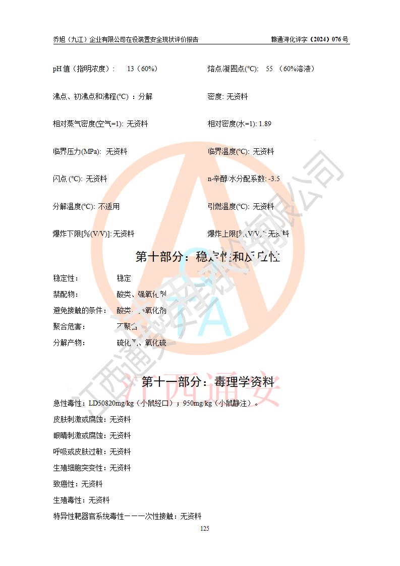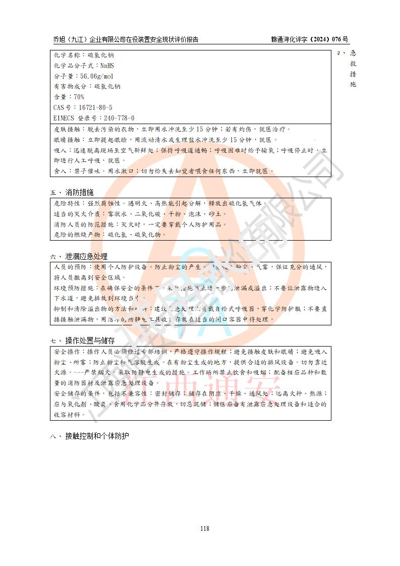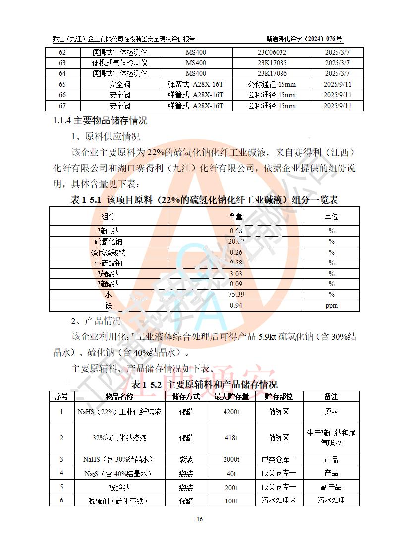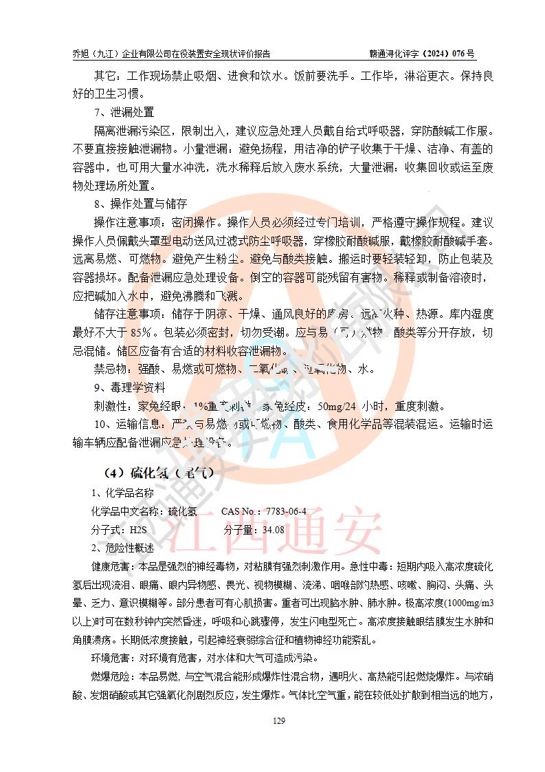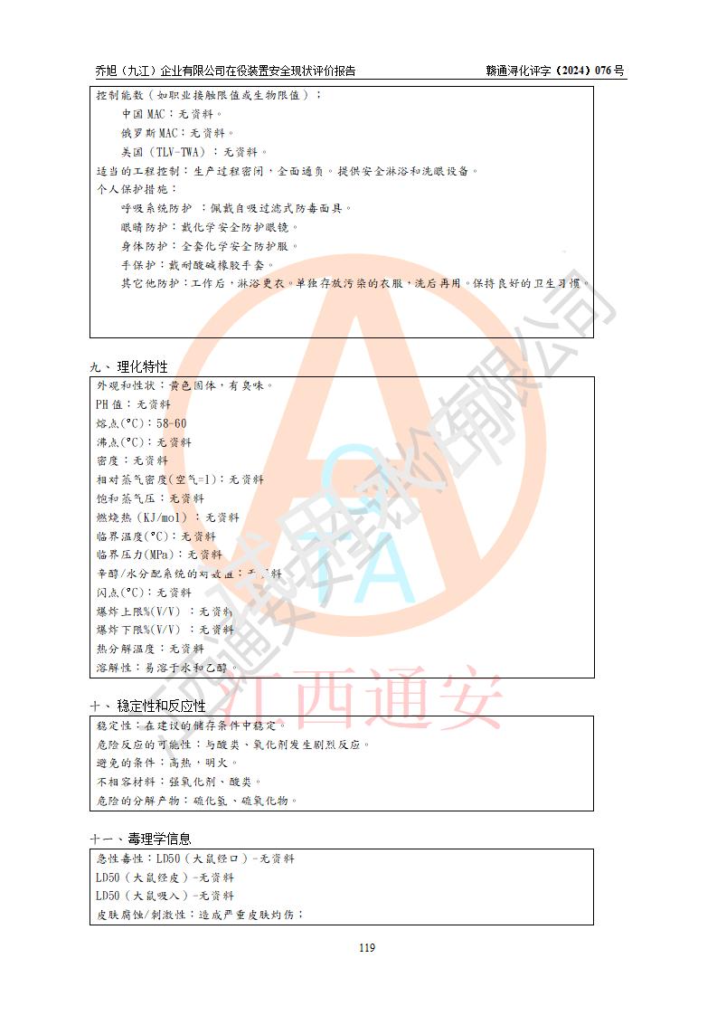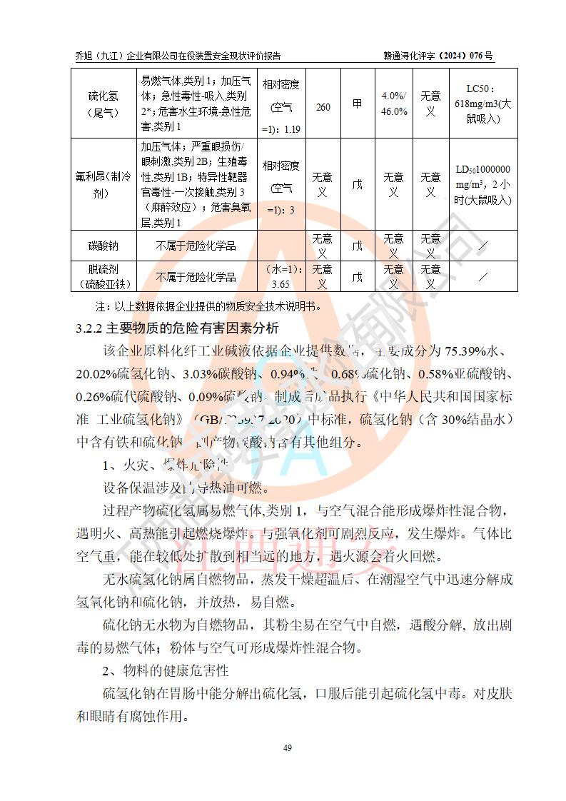 評(píng)價(jià)結(jié)論 | 評(píng)價(jià)結(jié)論:?jiǎn)绦瘢ň沤┢髽I(yè)有限公司現(xiàn)場(chǎng)總體布局、車間設(shè)備布置情況與安全設(shè)計(jì)圖紙一致(化工**資質(zhì));企業(yè)在役裝置不涉及危險(xiǎn)工藝、重大危險(xiǎn)源;儀表方面已按現(xiàn)有設(shè)計(jì)要求設(shè)置,且自動(dòng)化提升改造已**按文件要求期限內(nèi)完成;企業(yè)主要負(fù)責(zé)人、技術(shù)負(fù)責(zé)人有相關(guān)化學(xué)專業(yè)學(xué)歷,且有3年以上化工行業(yè)從業(yè)經(jīng)歷,企業(yè)主要負(fù)責(zé)人及安全管理人員已取得危險(xiǎn)化學(xué)品生產(chǎn)企業(yè)主要負(fù)責(zé)人及安全管理人員考核合格證。 喬旭(九江)企業(yè)有限公司在役5.9kt/a硫氫化鈉(含30%結(jié)晶水)、2kt/a硫化鈉(含40%結(jié)晶水)生產(chǎn)裝置配套安全裝置、防護(hù)設(shè)施以及采取的安全技術(shù)措施及安全管理措施符合**有關(guān)法規(guī)、標(biāo)準(zhǔn)、規(guī)范要求,符合《危險(xiǎn)化學(xué)品生產(chǎn)企業(yè)安全生產(chǎn)許可證實(shí)施辦法》規(guī)定的安全生產(chǎn)條件,在役裝置風(fēng)險(xiǎn)可控,可滿足安全生產(chǎn)條件。 | |||||