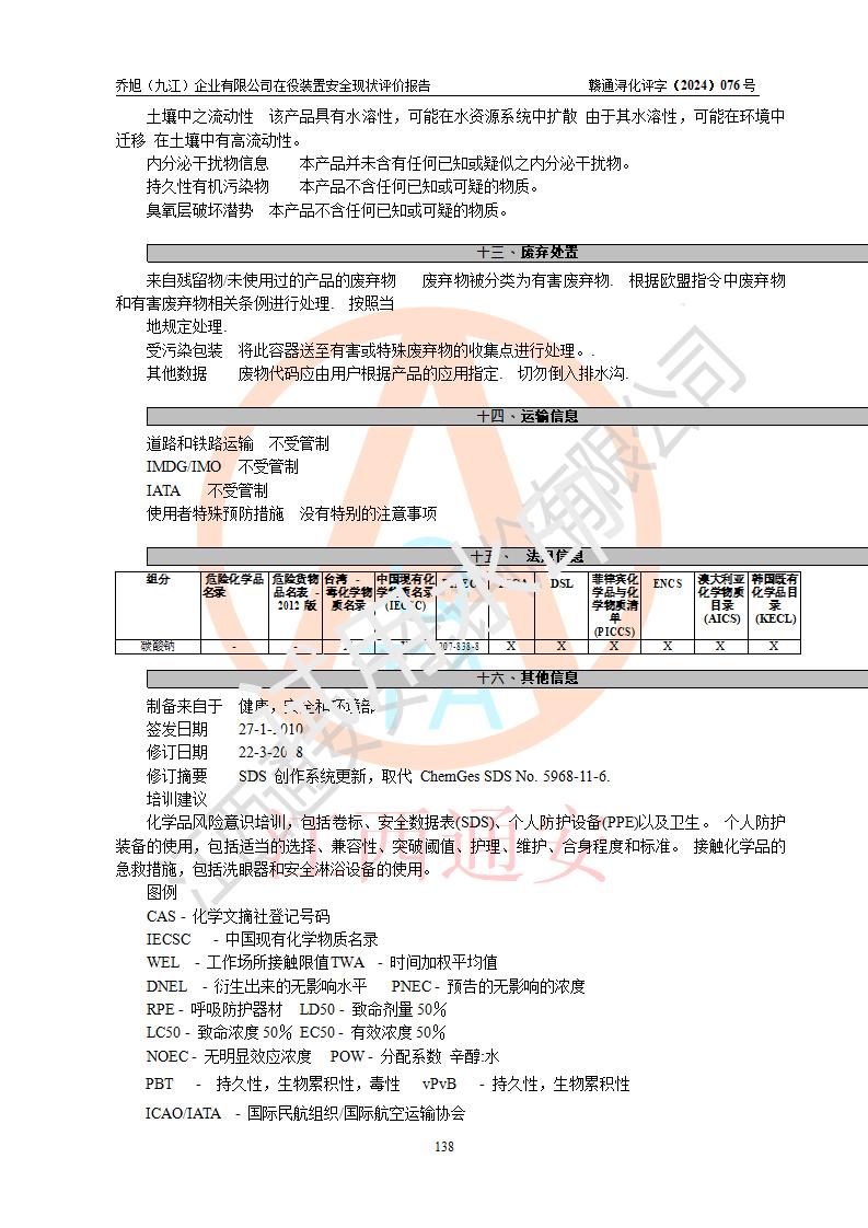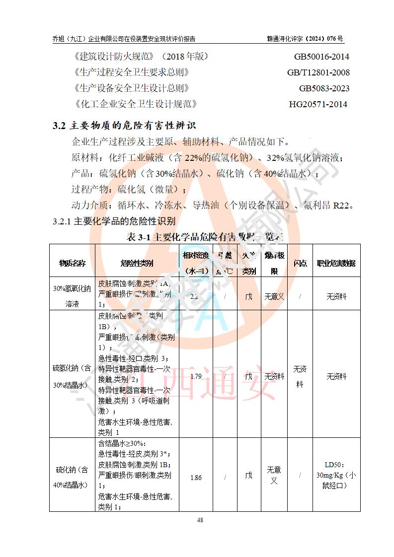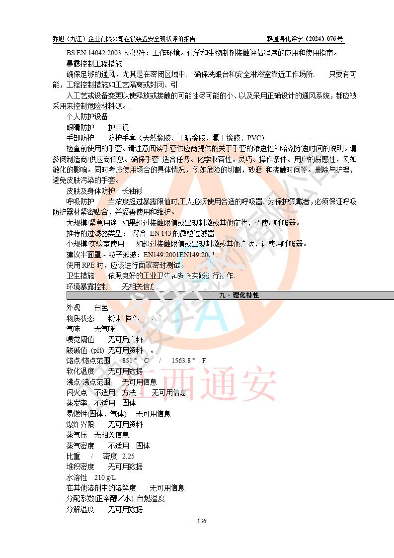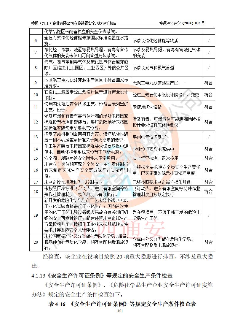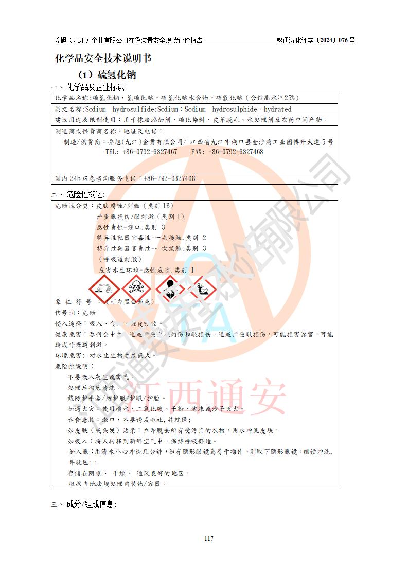 評(píng)價(jià)結(jié)論 | 評(píng)價(jià)結(jié)論:?jiǎn)绦瘢ň沤┢髽I(yè)有限公司現(xiàn)場(chǎng)總體布局、車間設(shè)備布置情況與安全設(shè)計(jì)圖紙一致(化工**資質(zhì));企業(yè)在役裝置不涉及危險(xiǎn)工藝、重大危險(xiǎn)源;儀表方面已按現(xiàn)有設(shè)計(jì)要求設(shè)置,且自動(dòng)化提升改造已**按文件要求期限內(nèi)完成;企業(yè)主要負(fù)責(zé)人、技術(shù)負(fù)責(zé)人有相關(guān)化學(xué)專業(yè)學(xué)歷,且有3年以上化工行業(yè)從業(yè)經(jīng)歷,企業(yè)主要負(fù)責(zé)人及安全管理人員已取得危險(xiǎn)化學(xué)品生產(chǎn)企業(yè)主要負(fù)責(zé)人及安全管理人員考核合格證。 喬旭(九江)企業(yè)有限公司在役5.9kt/a硫氫化鈉(含30%結(jié)晶水)、2kt/a硫化鈉(含40%結(jié)晶水)生產(chǎn)裝置配套安全裝置、防護(hù)設(shè)施以及采取的安全技術(shù)措施及安全管理措施符合**有關(guān)法規(guī)、標(biāo)準(zhǔn)、規(guī)范要求,符合《危險(xiǎn)化學(xué)品生產(chǎn)企業(yè)安全生產(chǎn)許可證實(shí)施辦法》規(guī)定的安全生產(chǎn)條件,在役裝置風(fēng)險(xiǎn)可控,可滿足安全生產(chǎn)條件。 | |||||