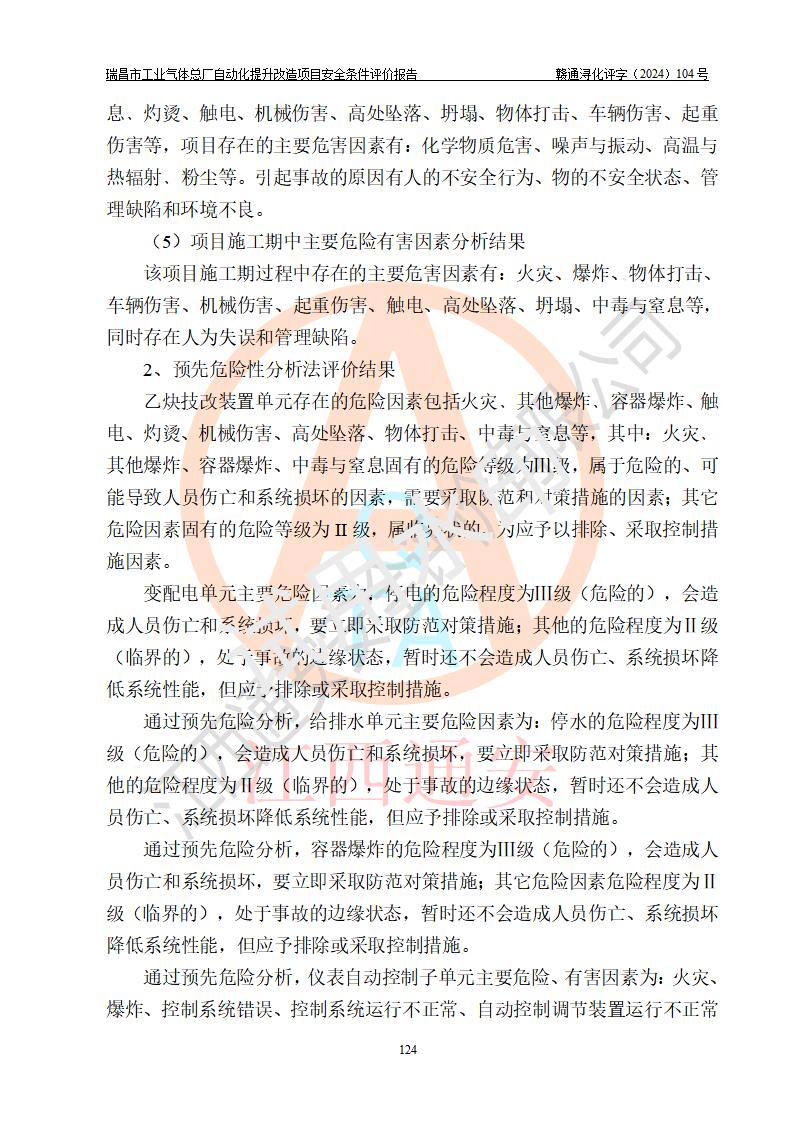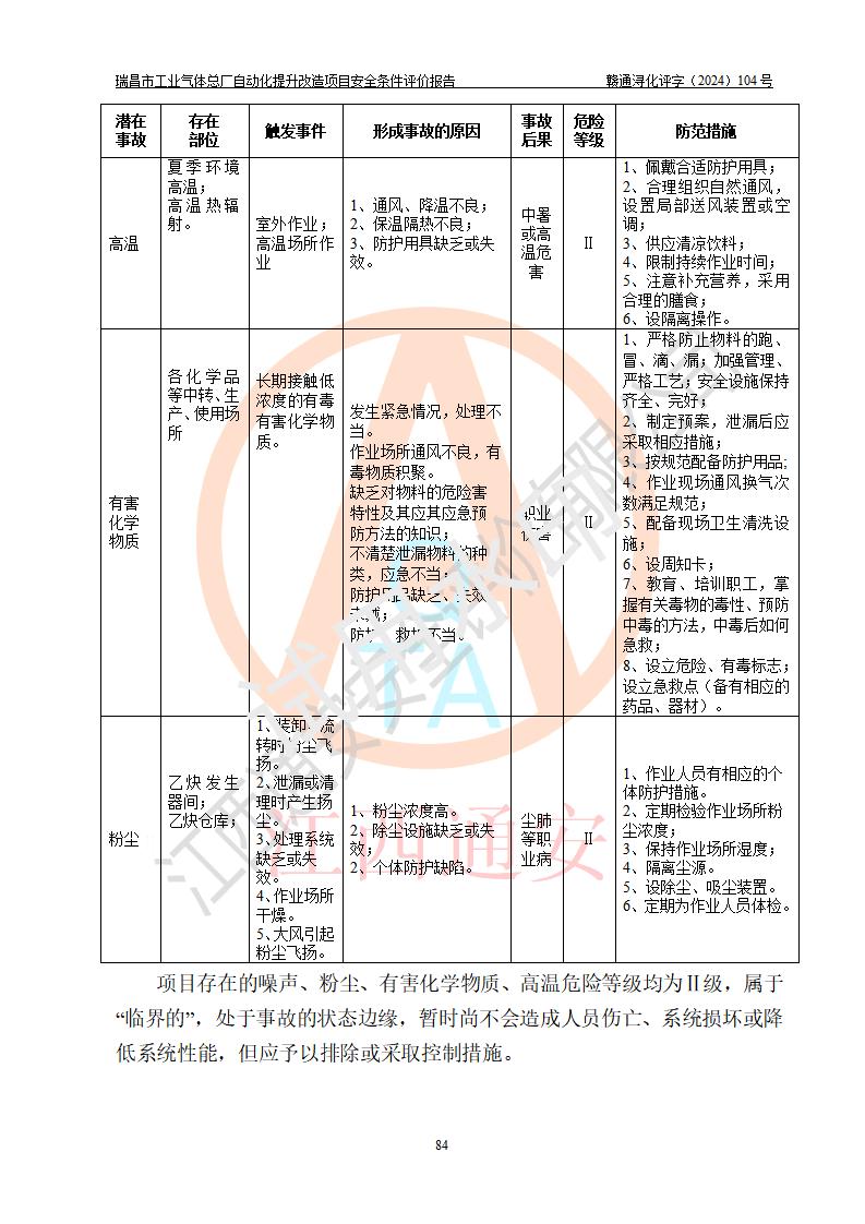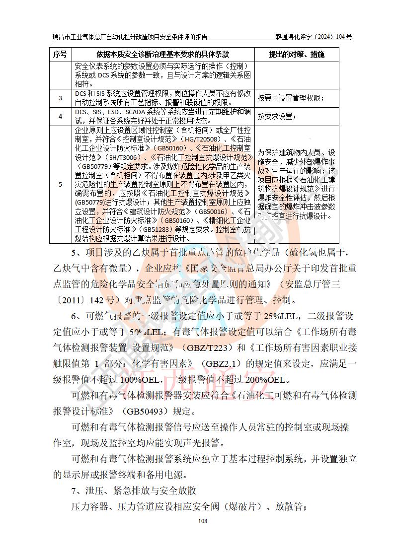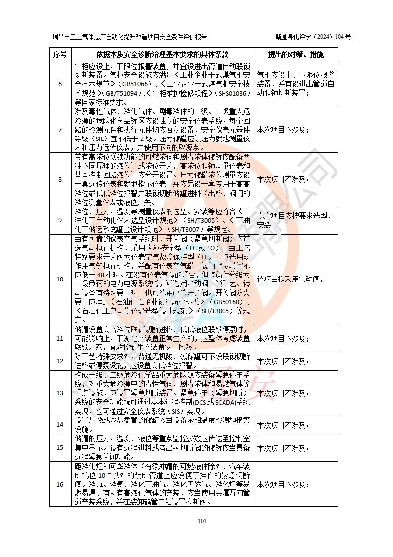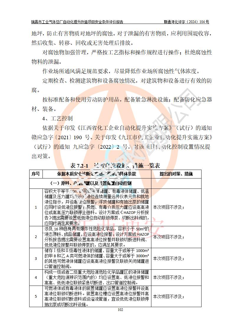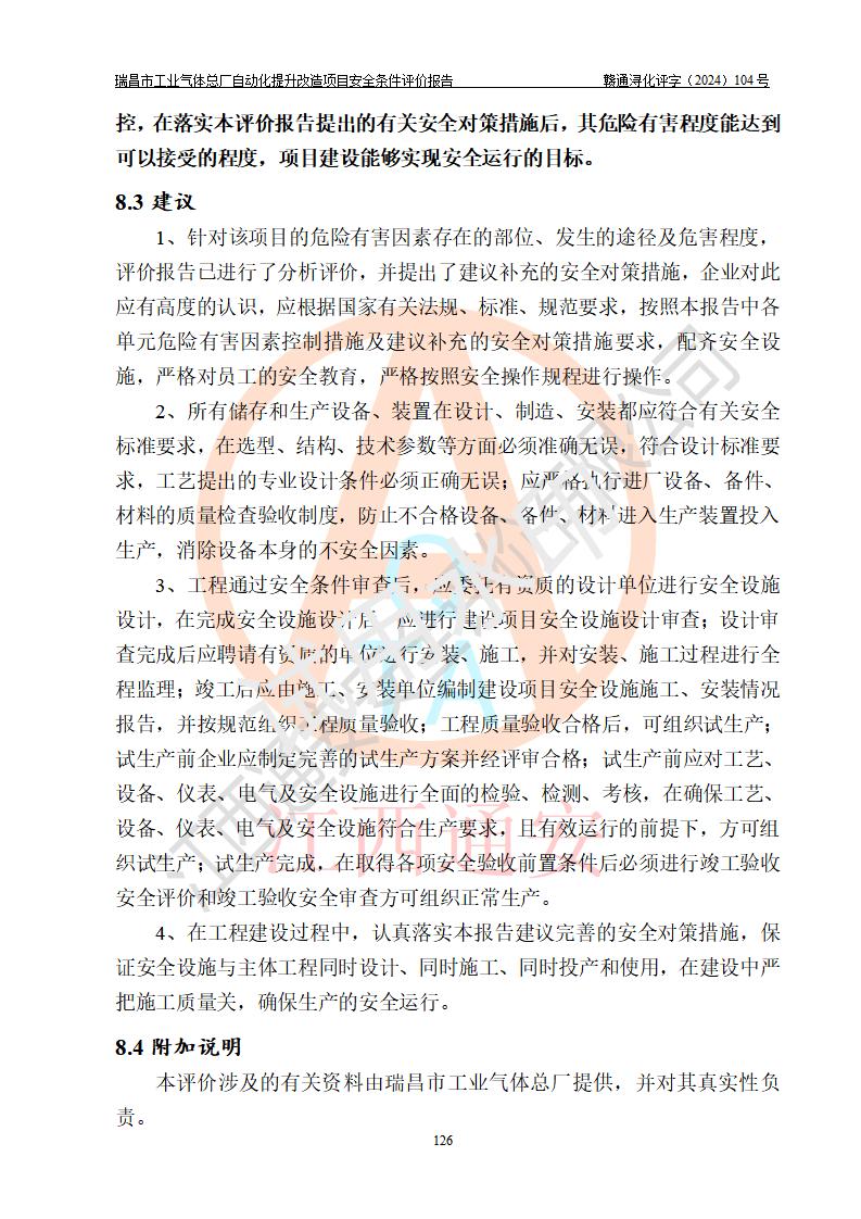 評價結論 | 瑞昌市工業(yè)氣體總廠自動化提升改造項目選擇的工藝過程及設備設施的安全可靠性能達到**法規(guī)、標準規(guī)定要求;項目存在的危險有害因素可控,在落實本評價報告提出的有關安全對策措施后,其危險有害程度能達到 可以接受的程度,項目建設能夠實現安全運行的目標。 | ||||