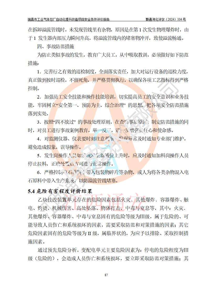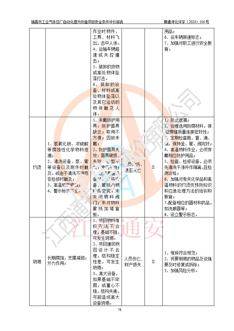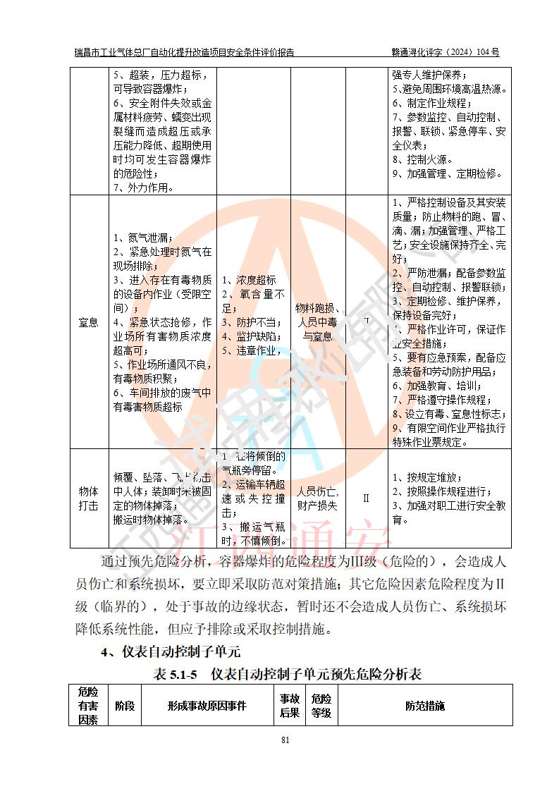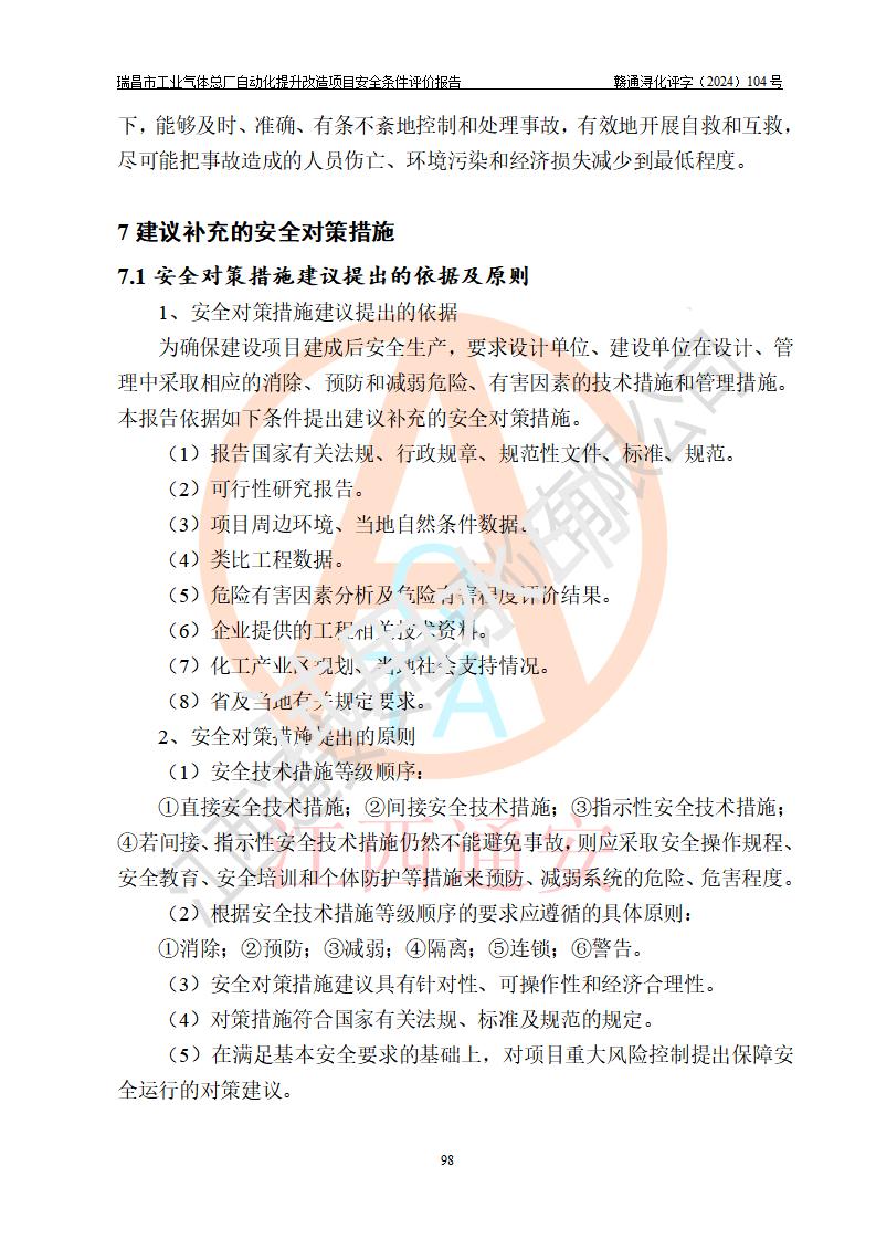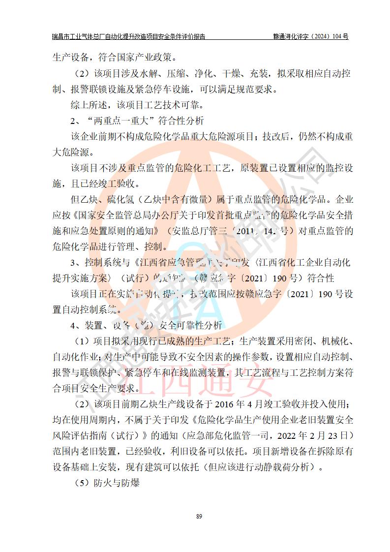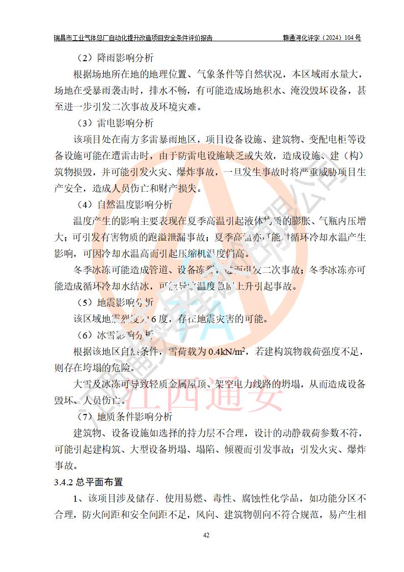 評價結論 | 瑞昌市工業(yè)氣體總廠自動化提升改造項目選擇的工藝過程及設備設施的安全可靠性能達到**法規(guī)、標準規(guī)定要求;項目存在的危險有害因素可控,在落實本評價報告提出的有關安全對策措施后,其危險有害程度能達到 可以接受的程度,項目建設能夠實現安全運行的目標。 | ||||