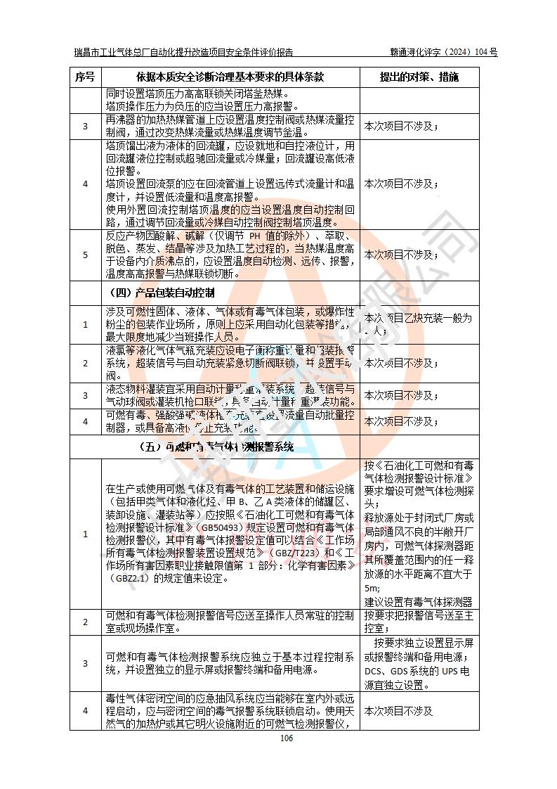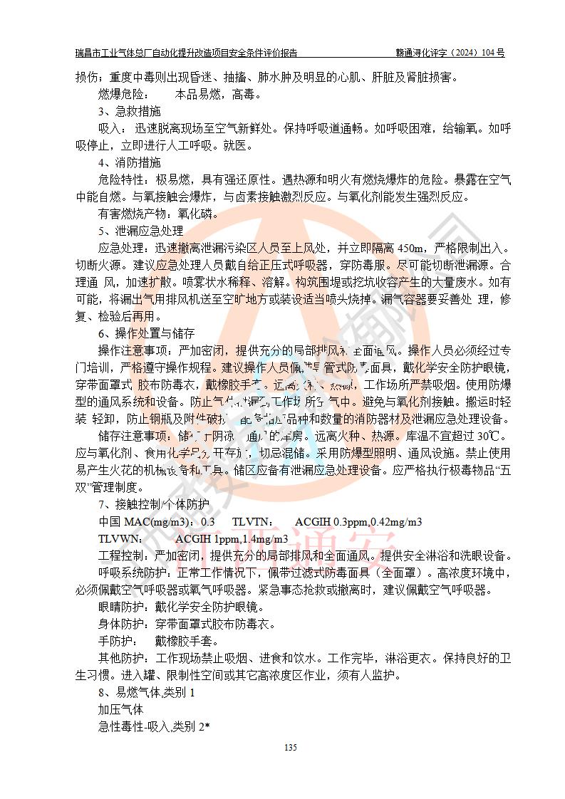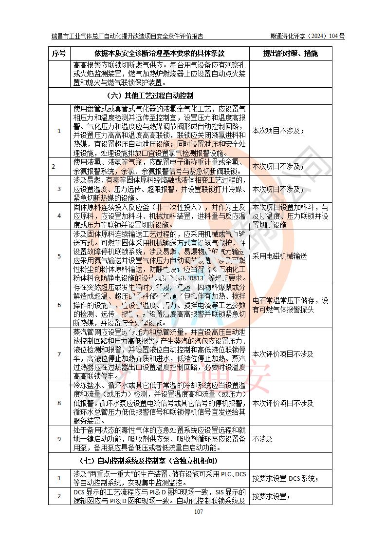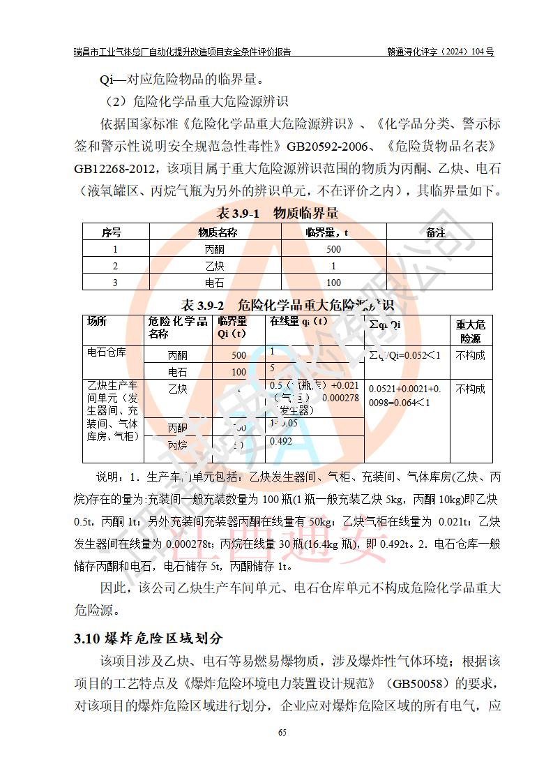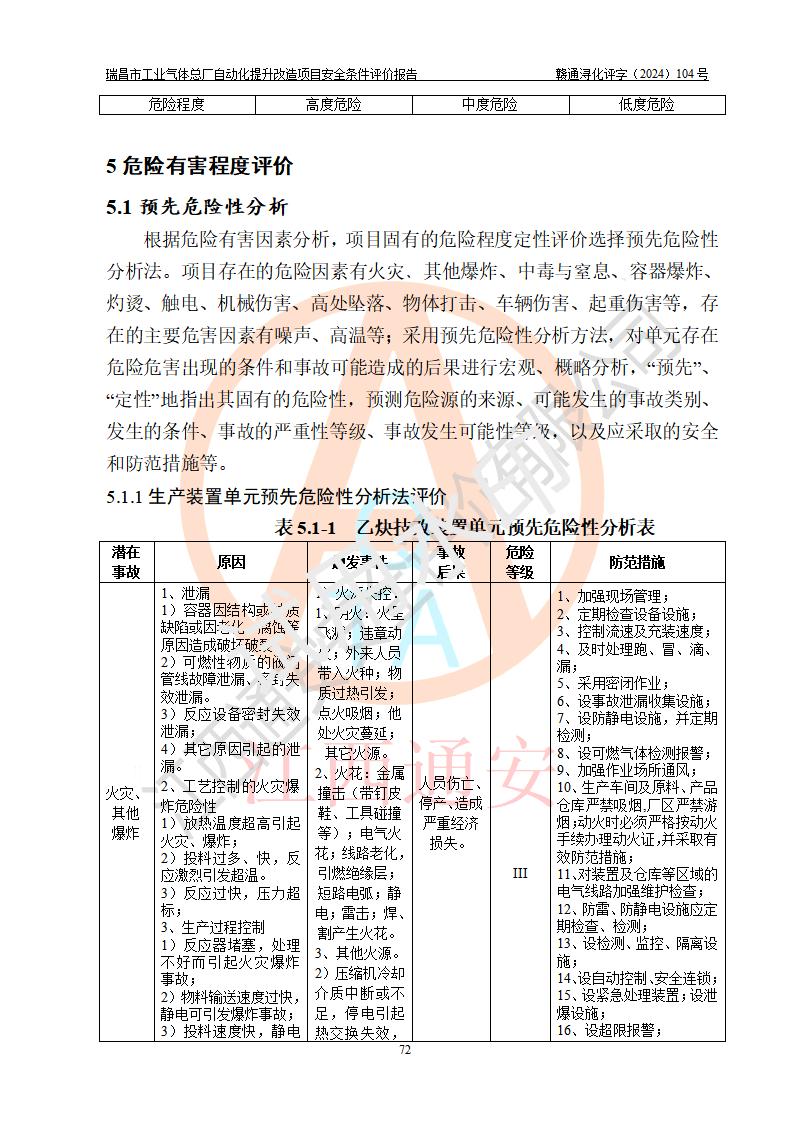 評價結論 | 瑞昌市工業(yè)氣體總廠自動化提升改造項目選擇的工藝過程及設備設施的安全可靠性能達到**法規(guī)、標準規(guī)定要求;項目存在的危險有害因素可控,在落實本評價報告提出的有關安全對策措施后,其危險有害程度能達到 可以接受的程度,項目建設能夠實現安全運行的目標。 | ||||