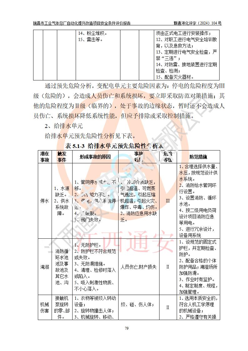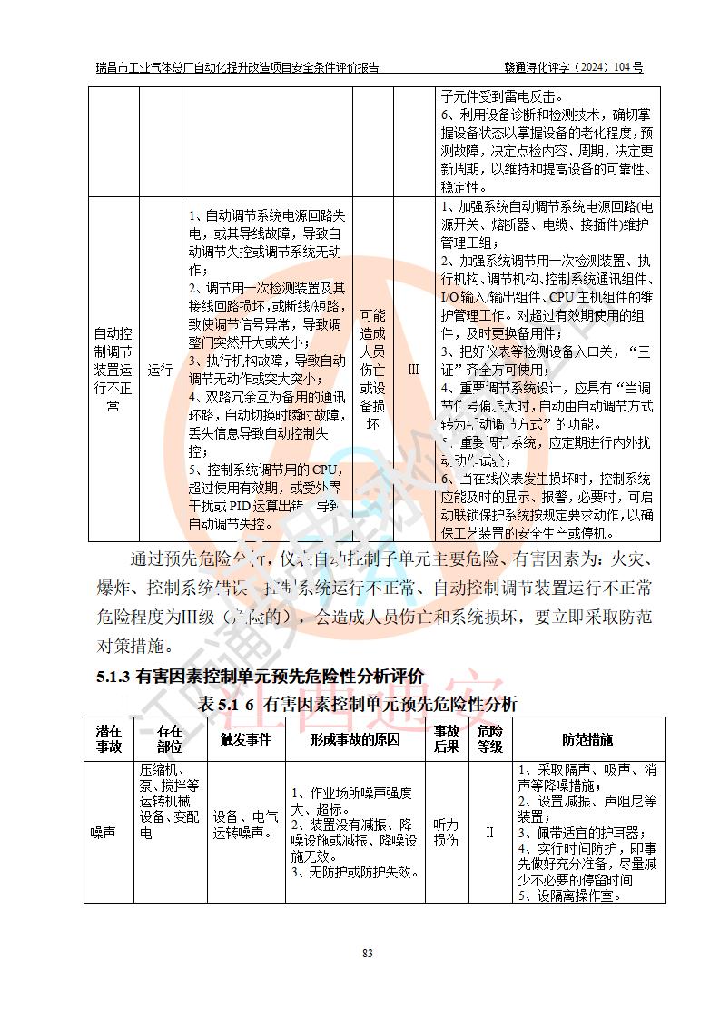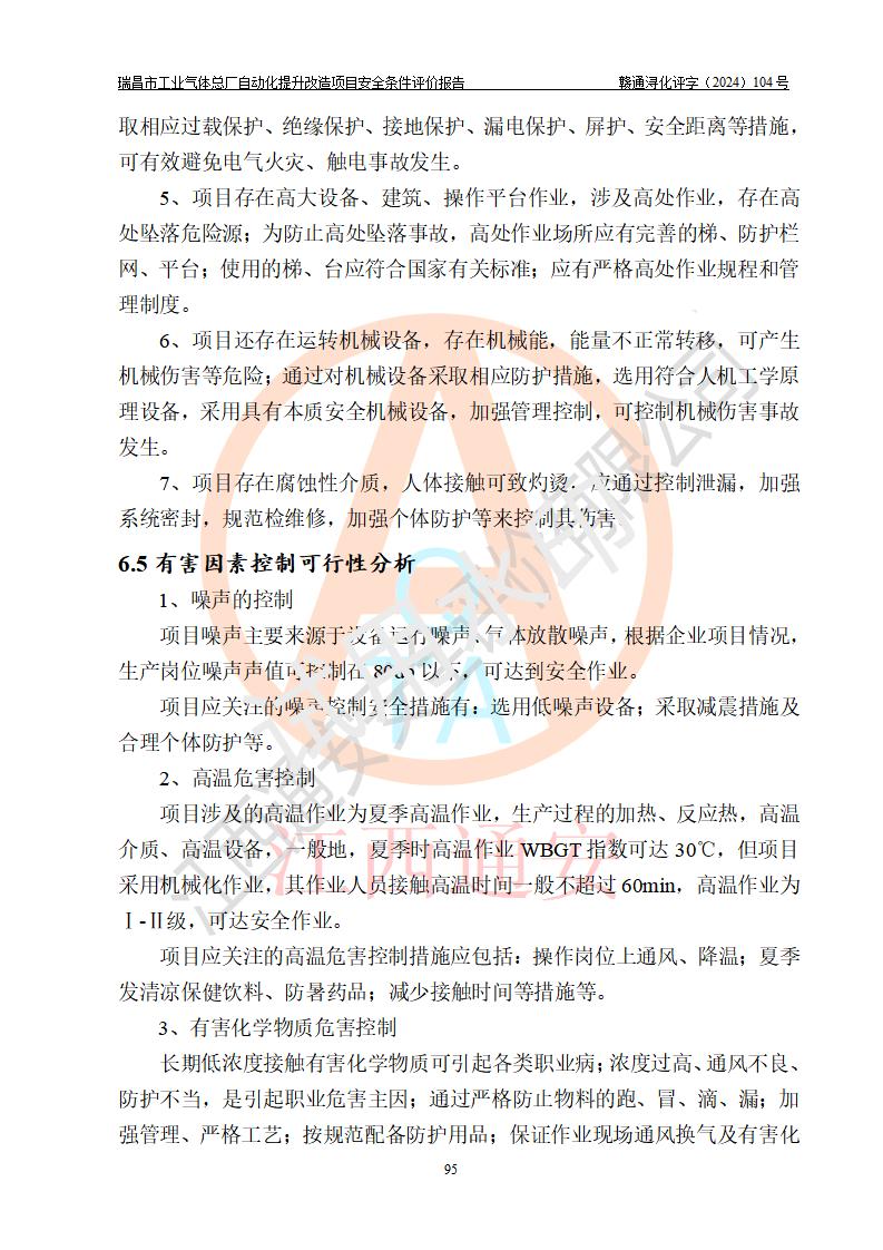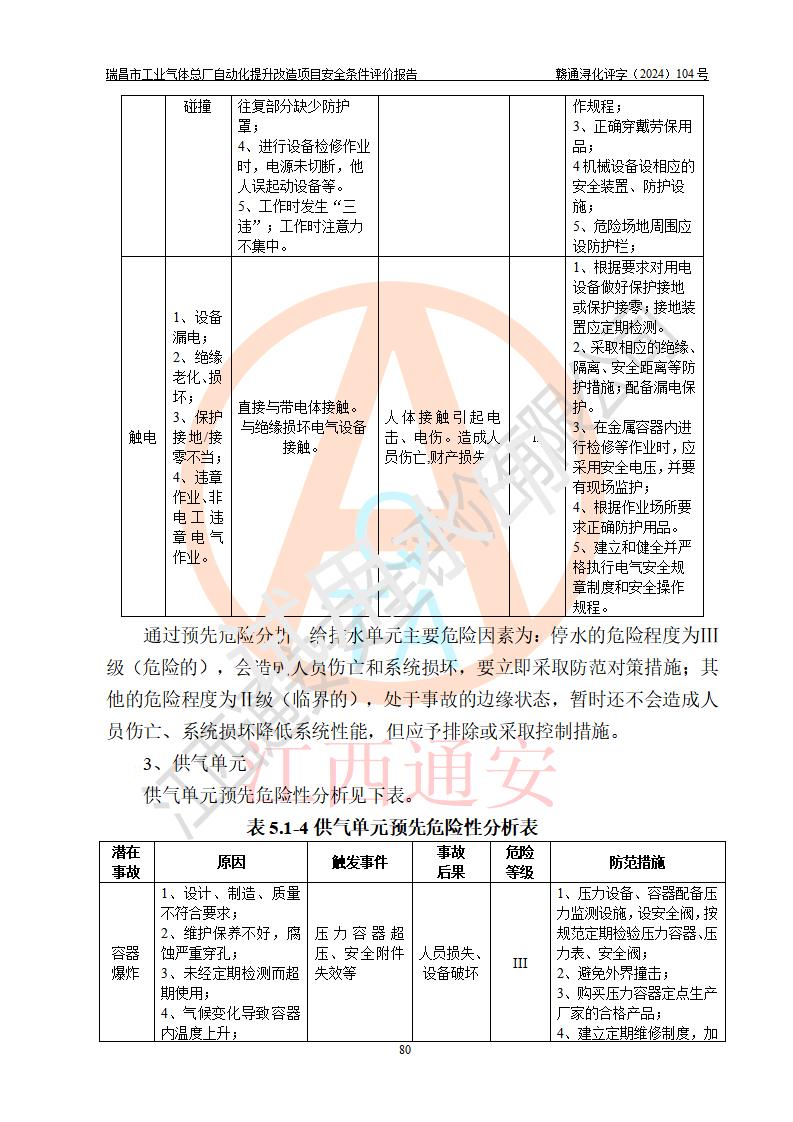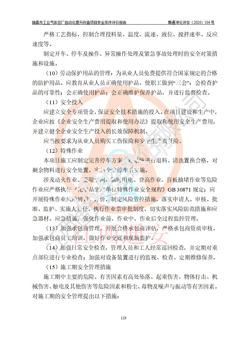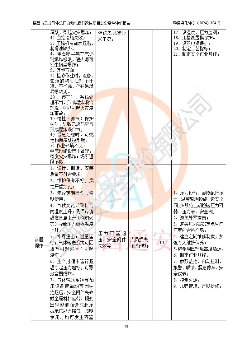 評價結論 | 瑞昌市工業(yè)氣體總廠自動化提升改造項目選擇的工藝過程及設備設施的安全可靠性能達到**法規(guī)、標準規(guī)定要求;項目存在的危險有害因素可控,在落實本評價報告提出的有關安全對策措施后,其危險有害程度能達到 可以接受的程度,項目建設能夠實現安全運行的目標。 | ||||